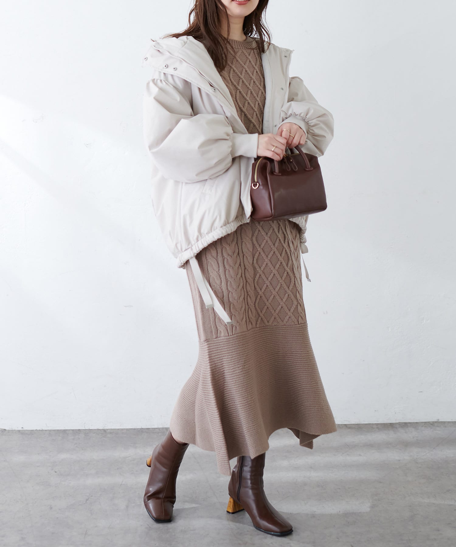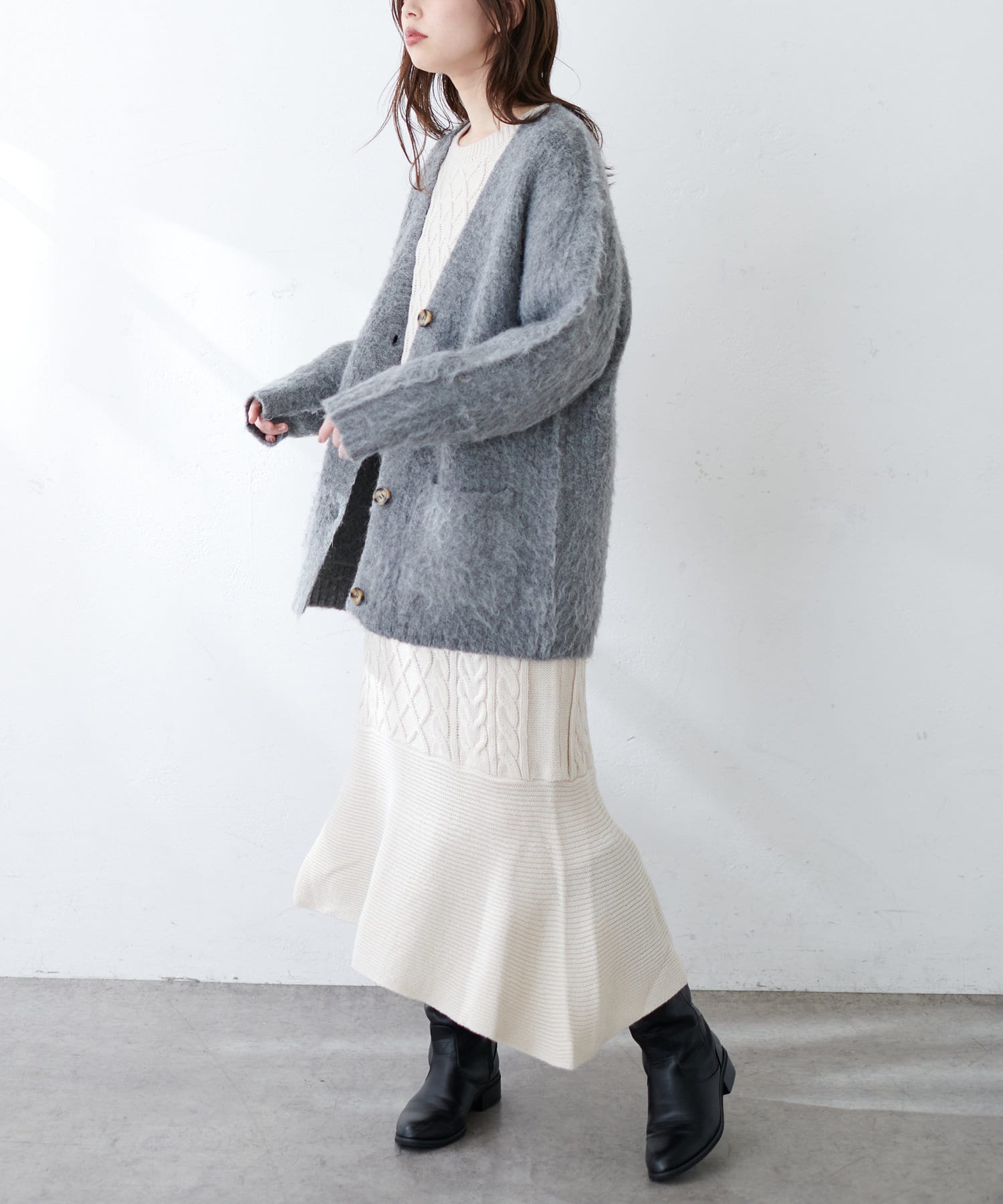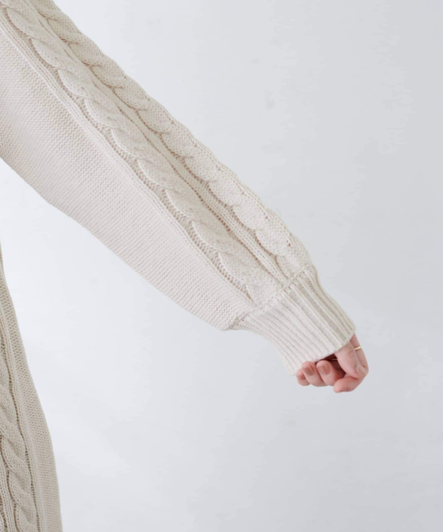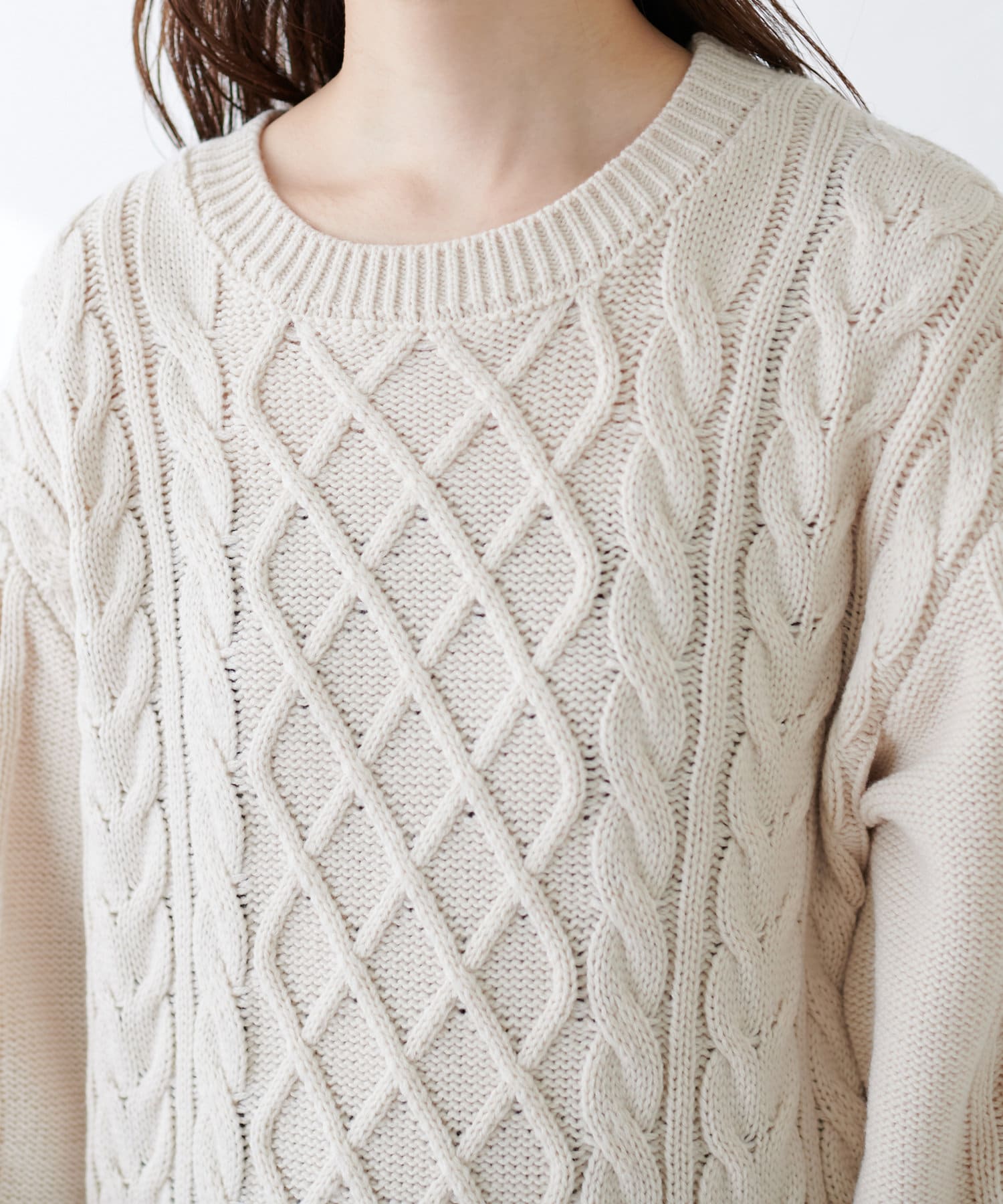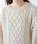身頃と袖部分を暖かみのあるケーブル編みで仕立てた、