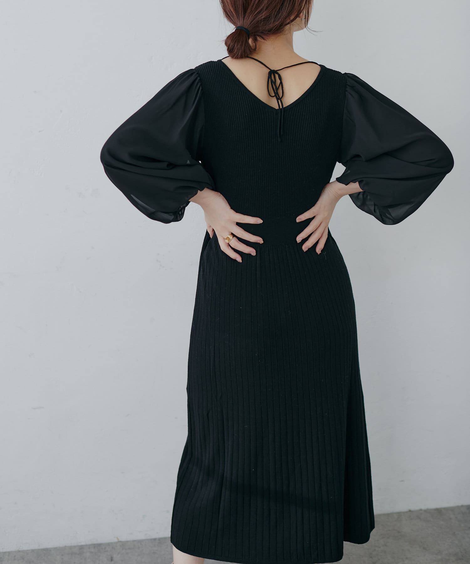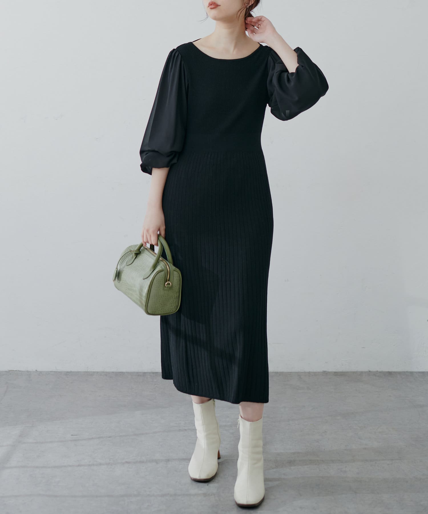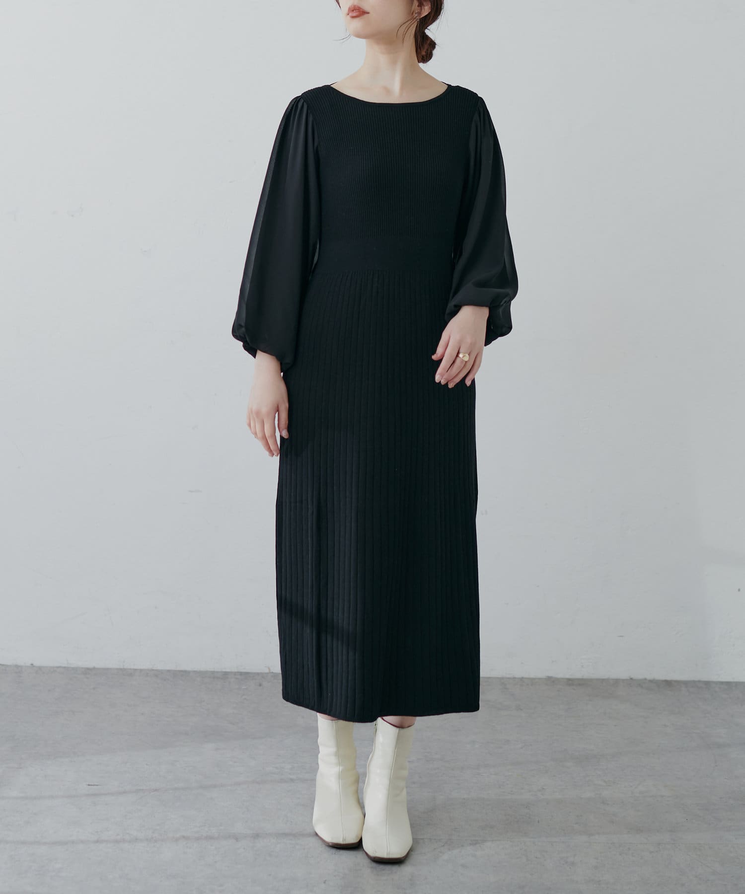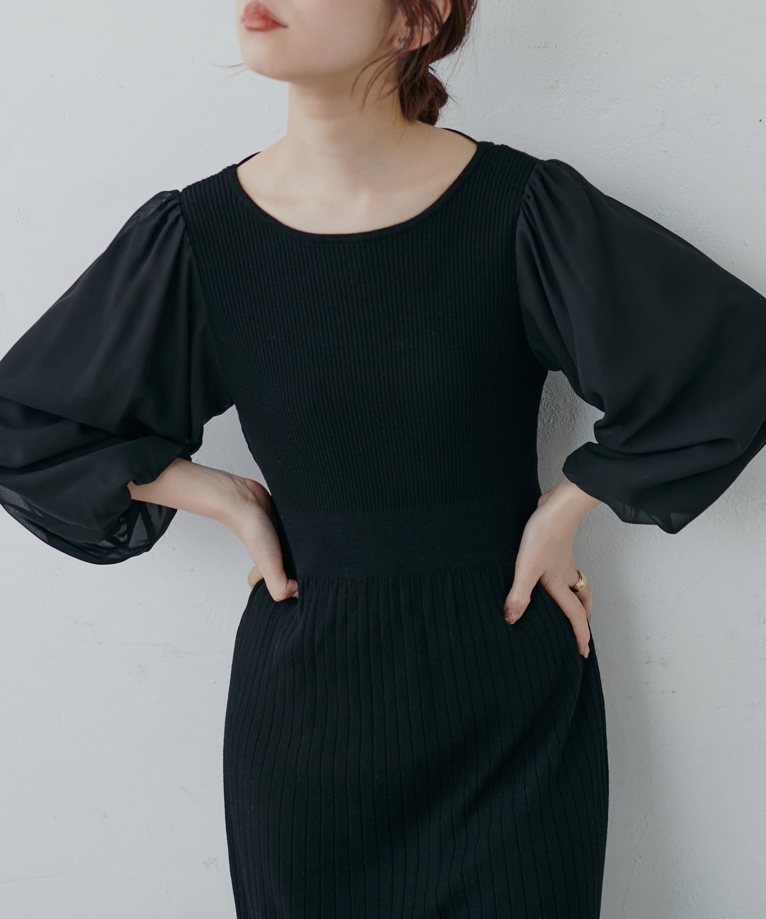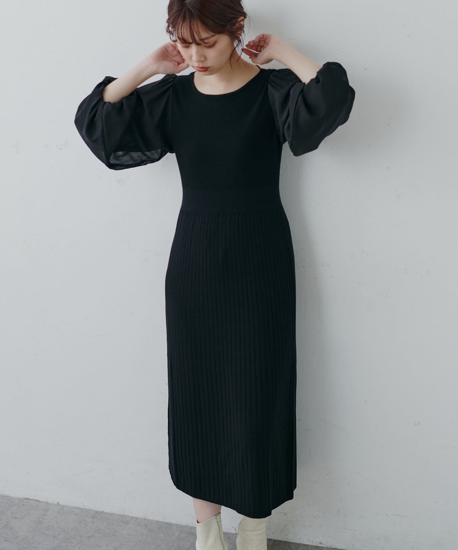 【WEB限定】ほんわりシアー!ボリュームシアー袖リブニットワンピース