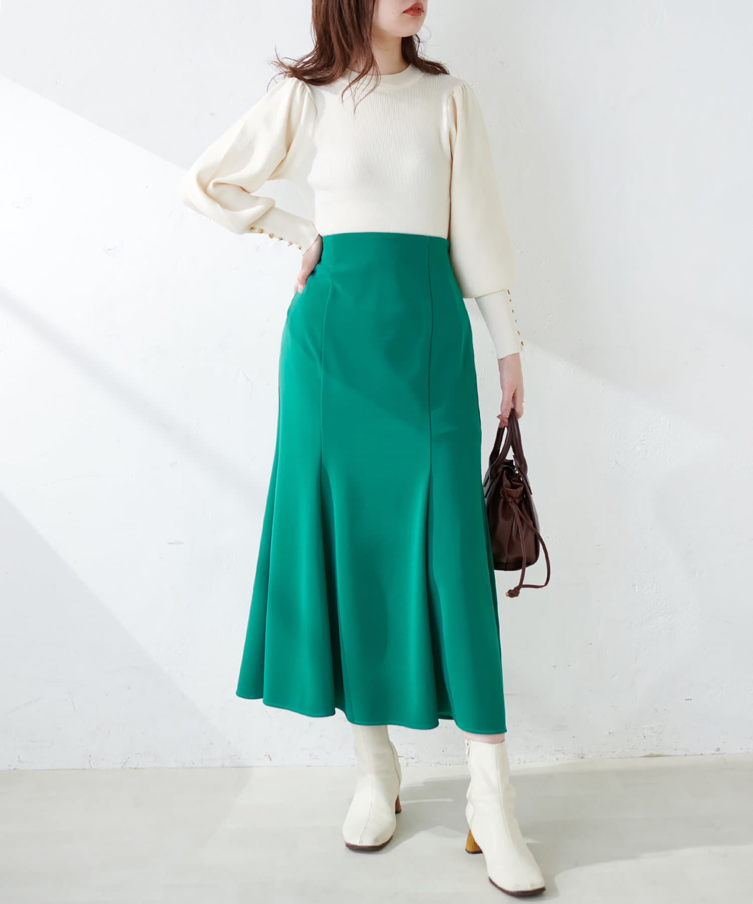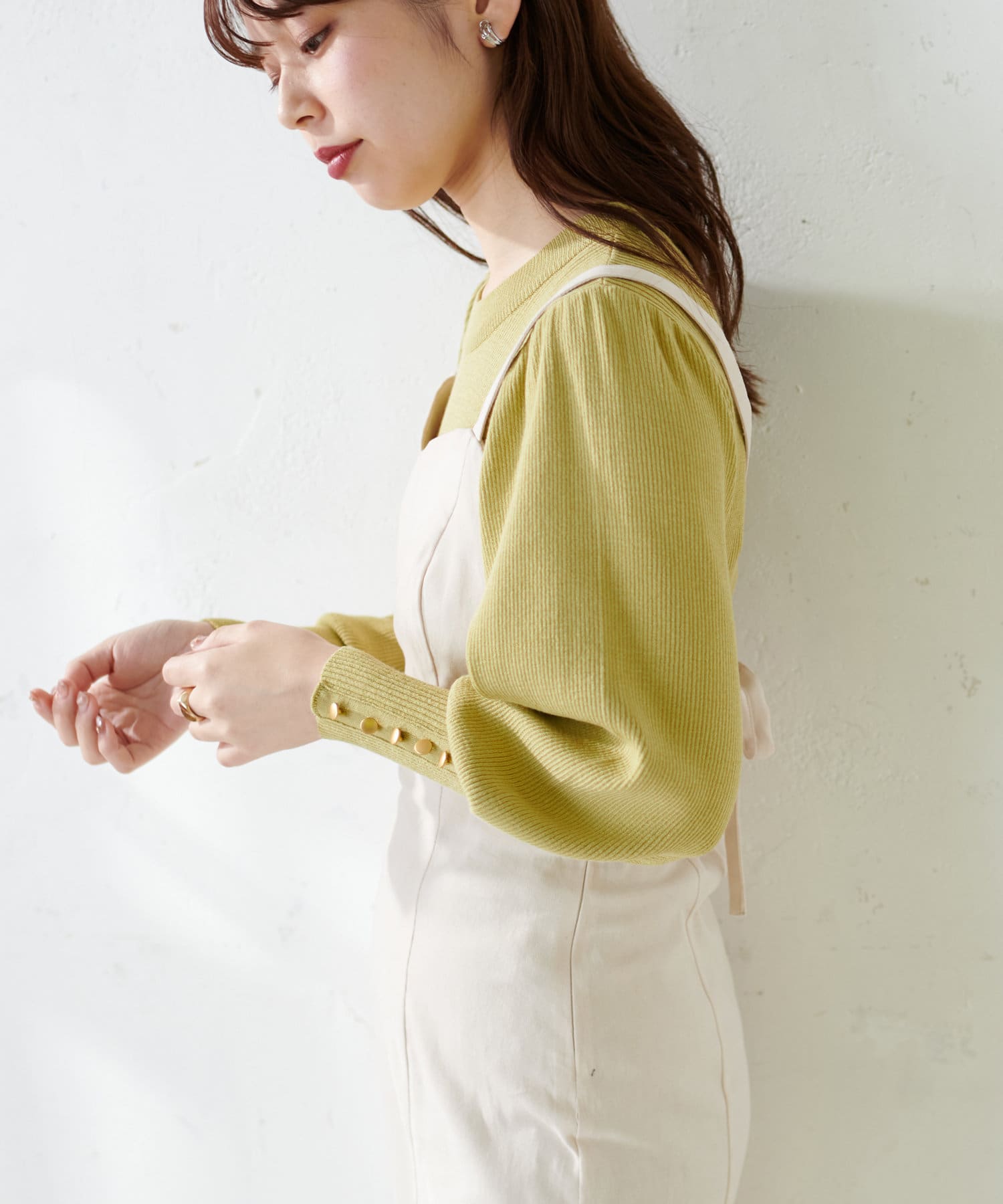 袖にはゴールドのボタンをあしらい、甘くなりすぎないカジュアル感を引き出しています。