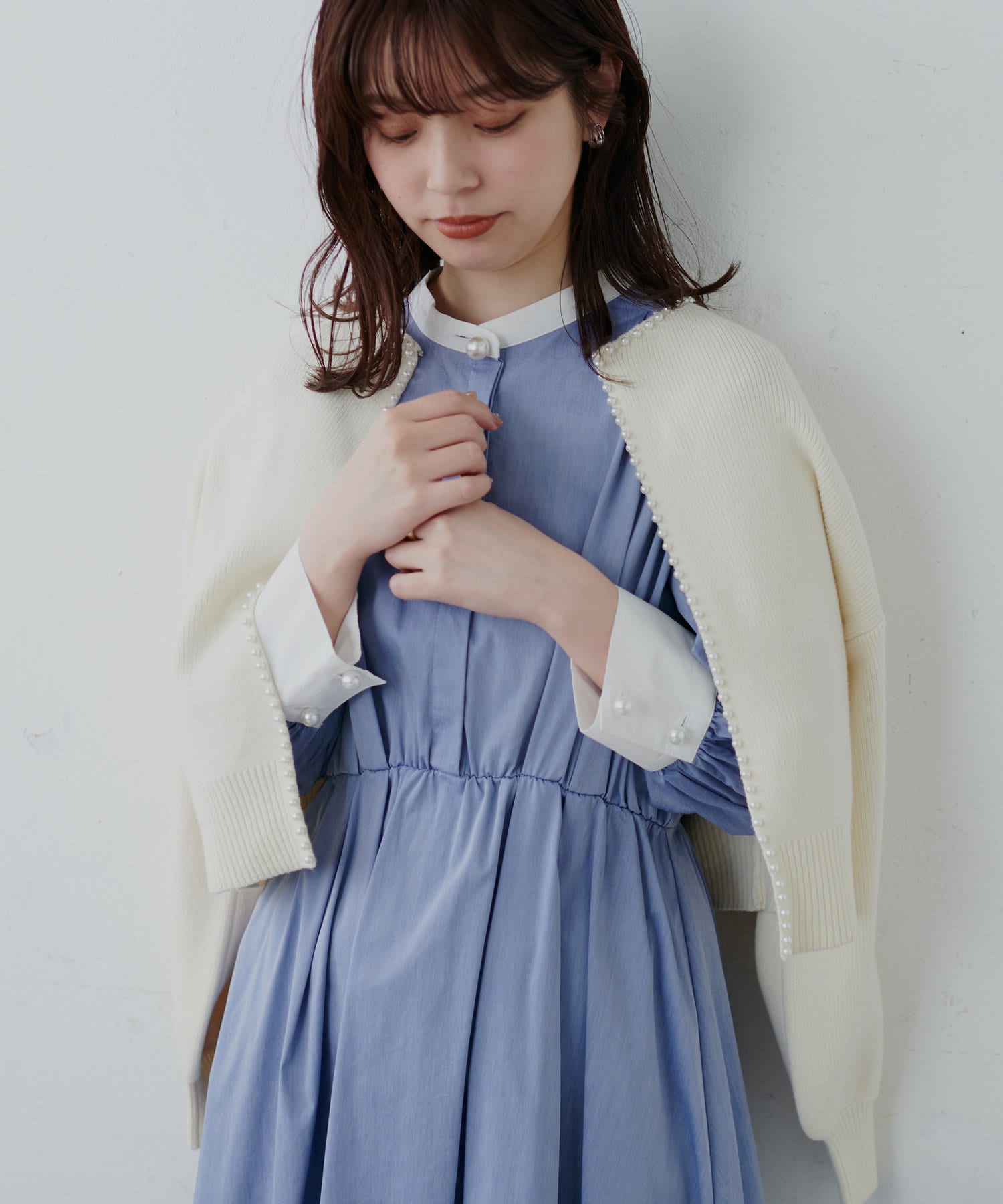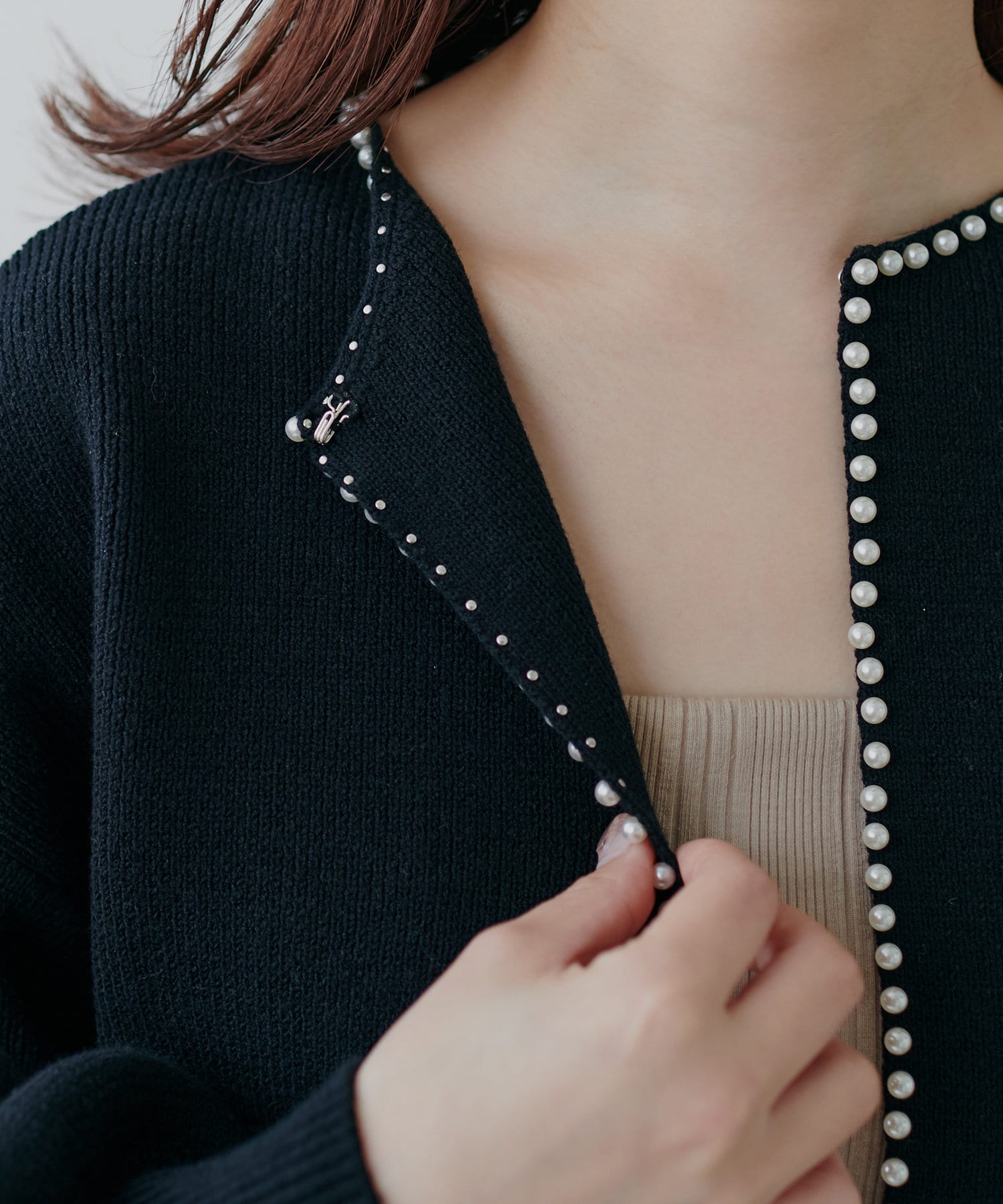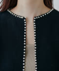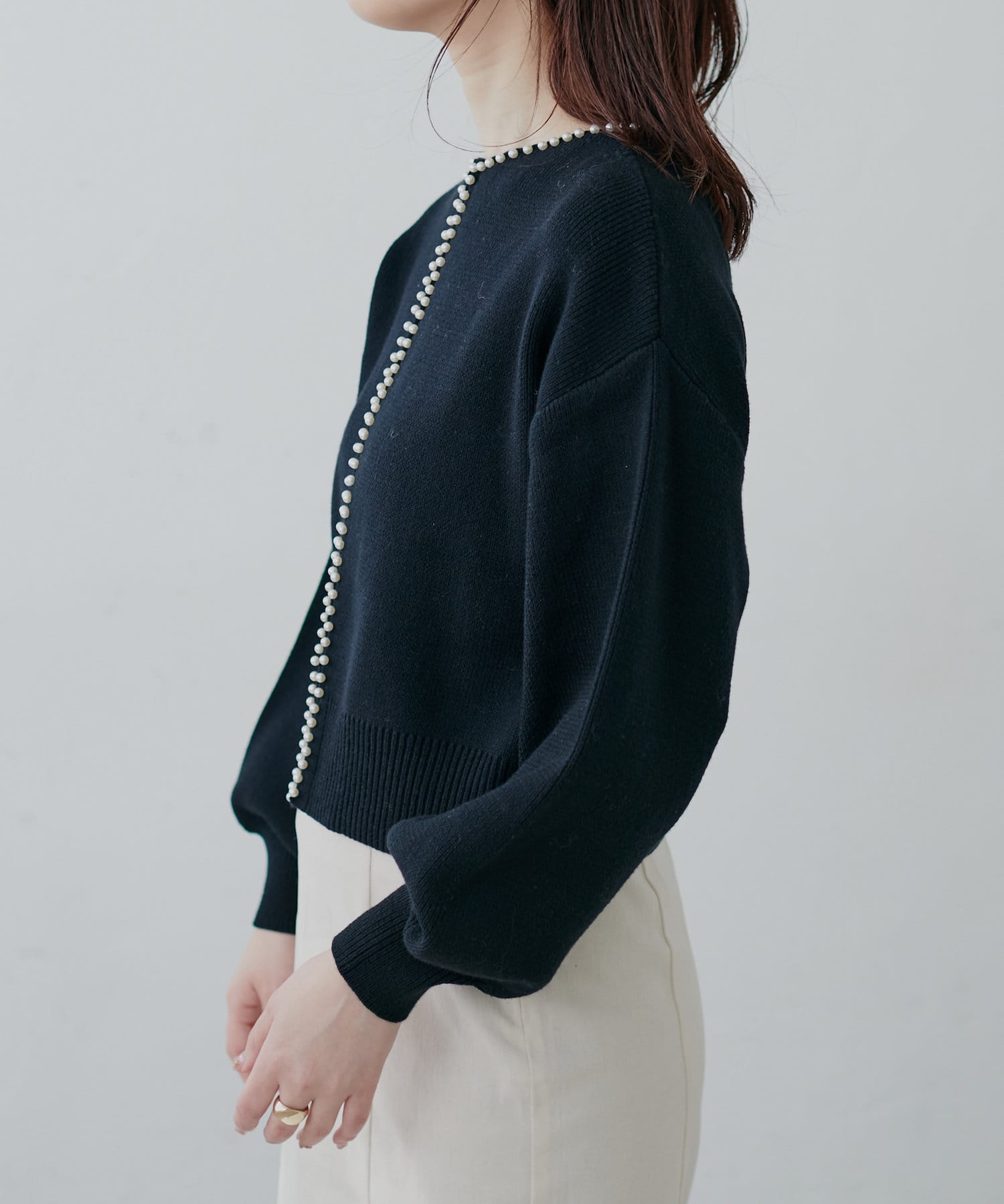 上品なパール使いが目を惹くパールトリムクルーネックカーディガン