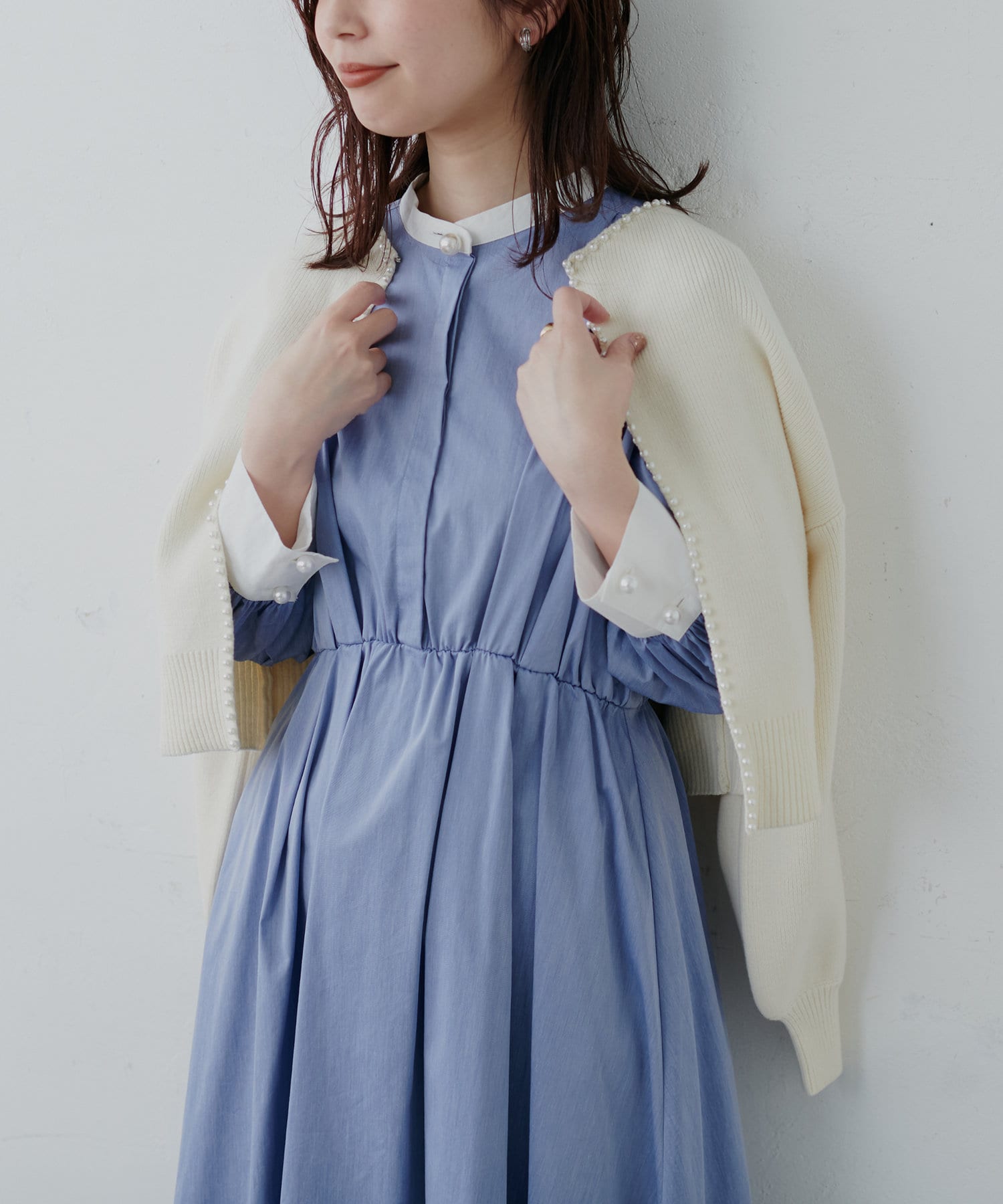 ネックラインからフロントにかけて、贅沢に施したパールが大人上品な印象を与えてくれる1着。