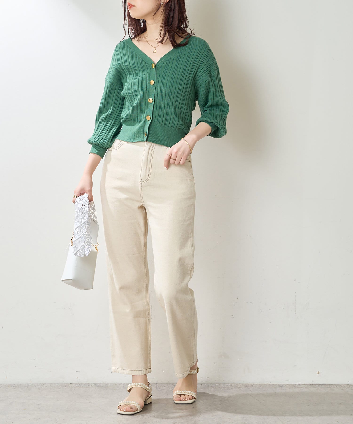 • natural couture(ナチュラルクチュール) ゴールドの釦使いが大人レディな装いに◎プチプラランダムリブカーディガン
