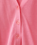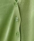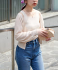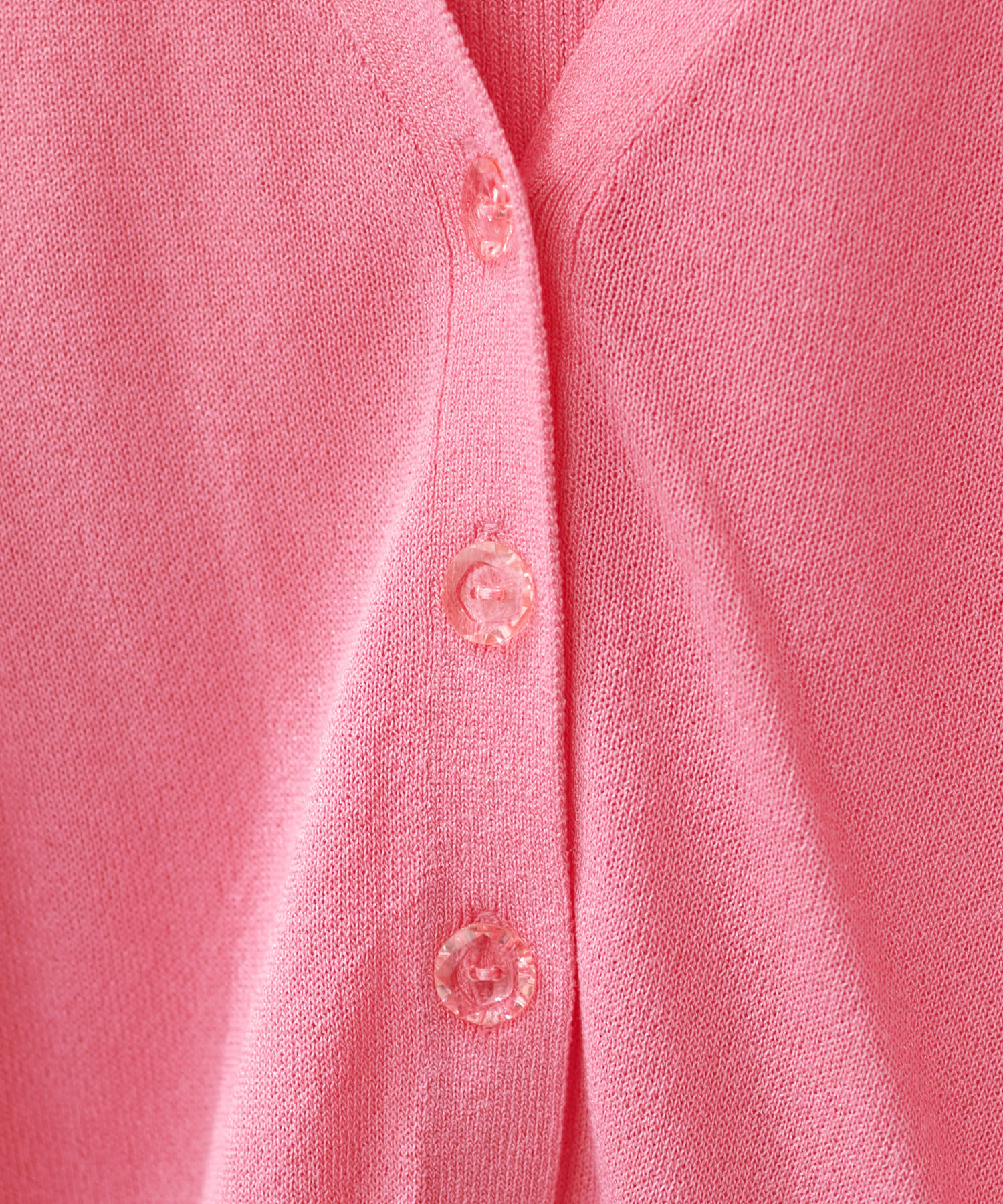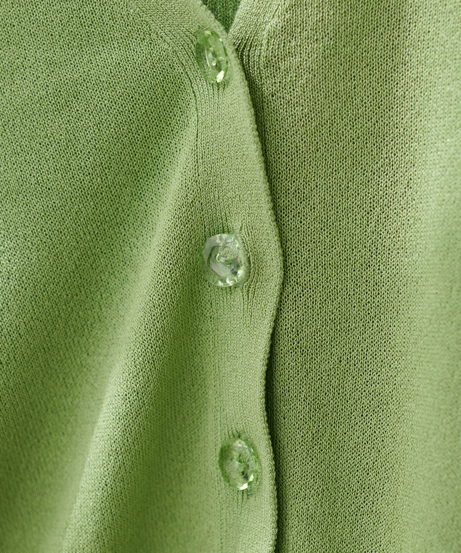 カーディガンは、ワンピースやボトムスとバランス良く合わせて頂けるよう、ややショート丈に仕上げました。生地と同色のクリア釦が爽やかな印象を与えてくれます。