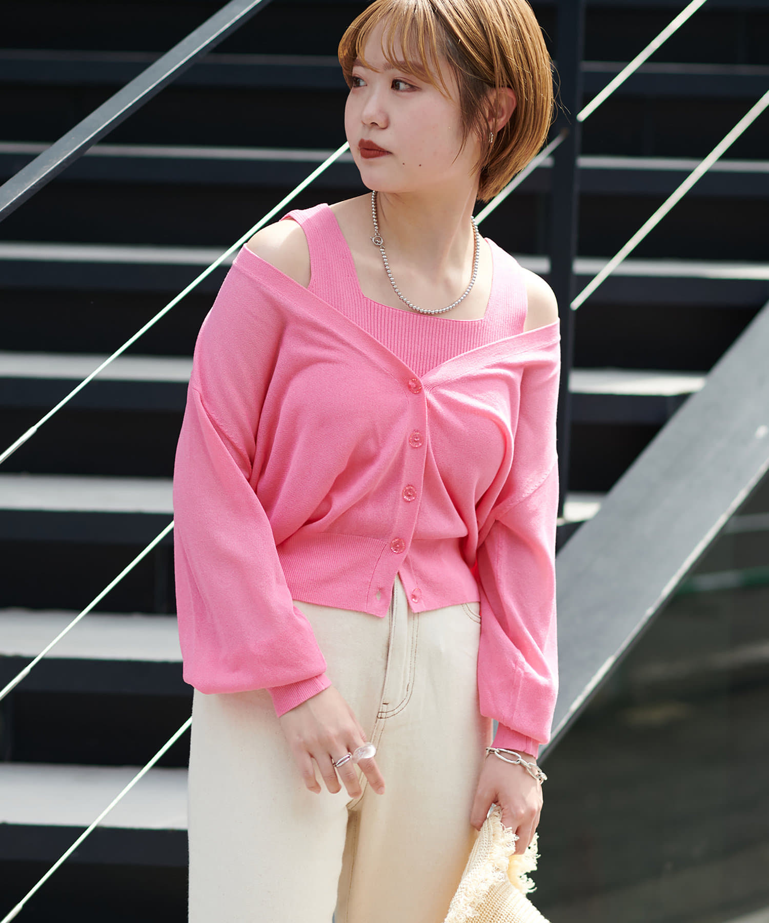 今季注目のシアーニットのカーディガンとタンクトップがSETになった、着回しの幅が広がるアイテム。