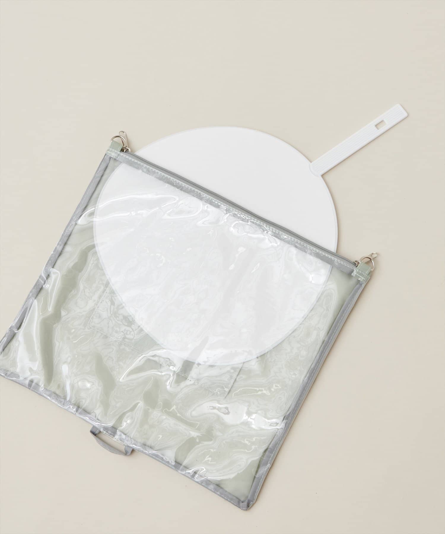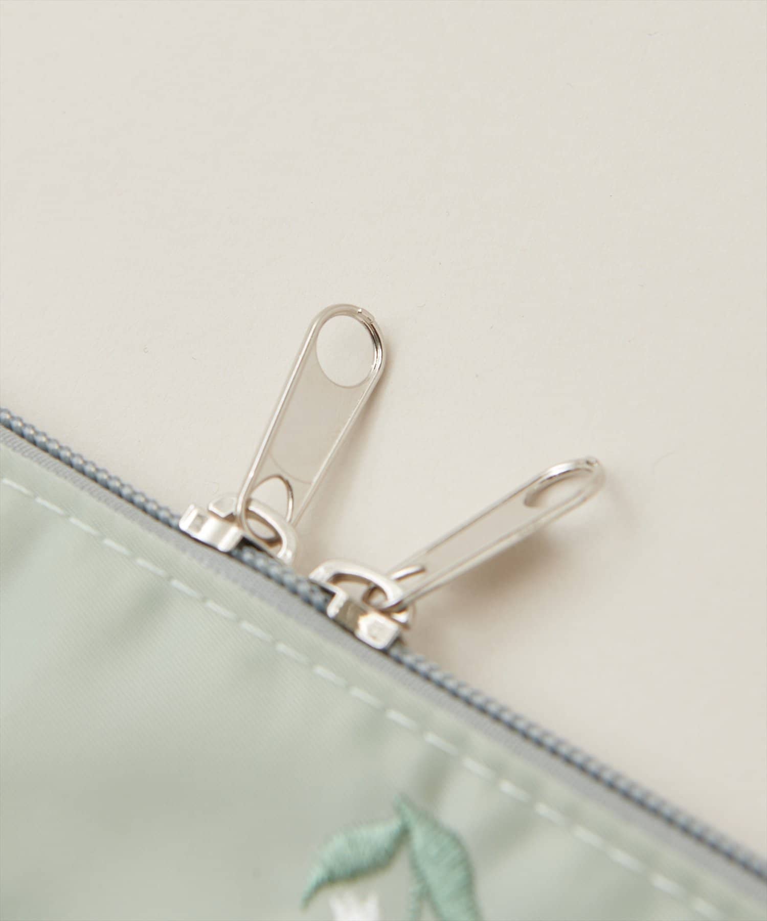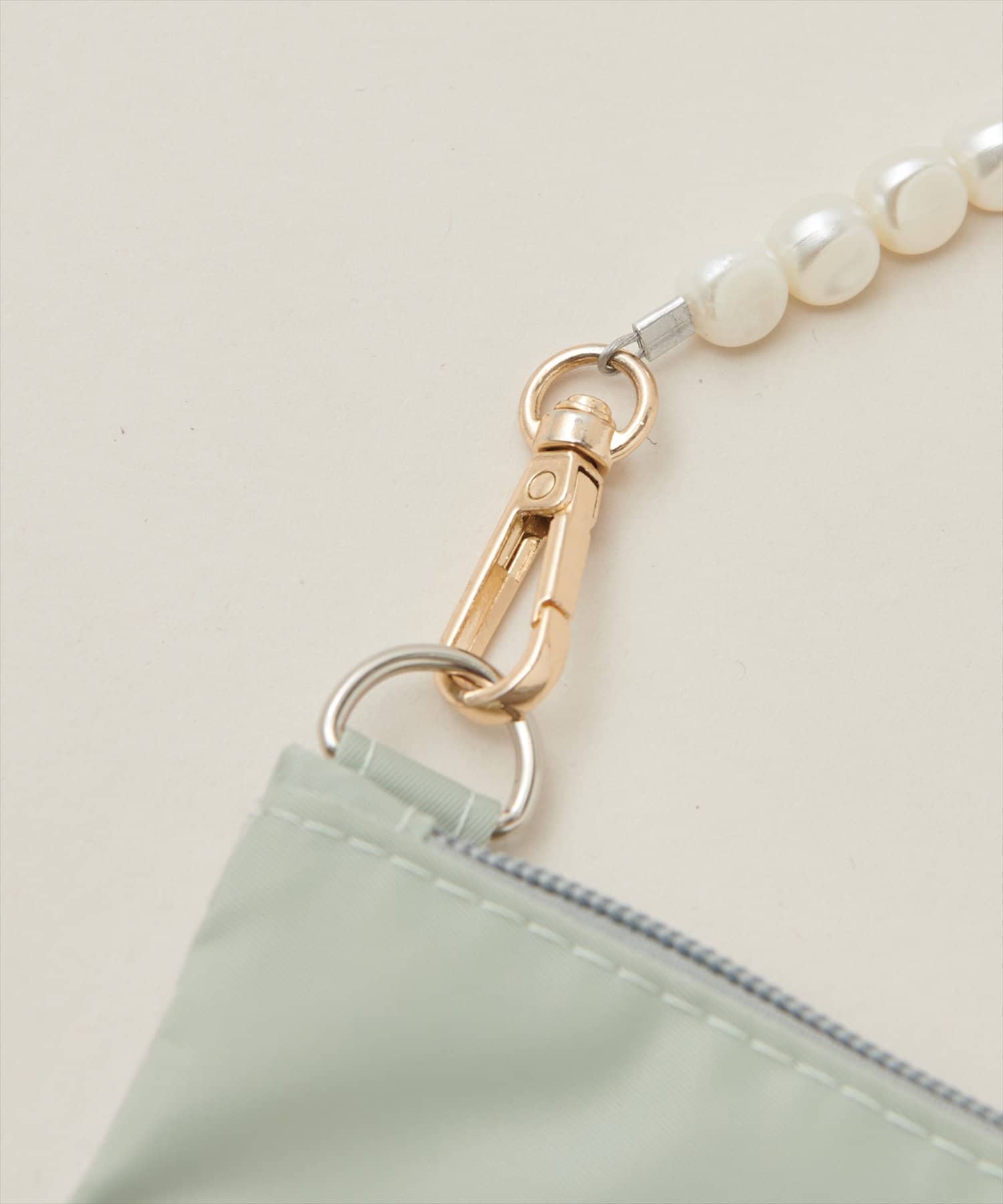 ジッパーの2つ使いで出し入れしやすく、別売りのビーズ紐を付ければ