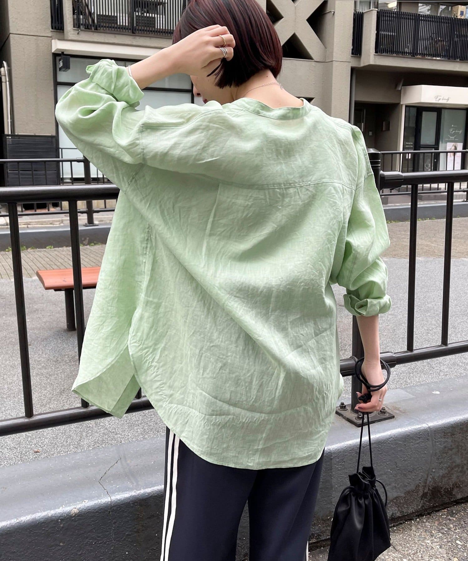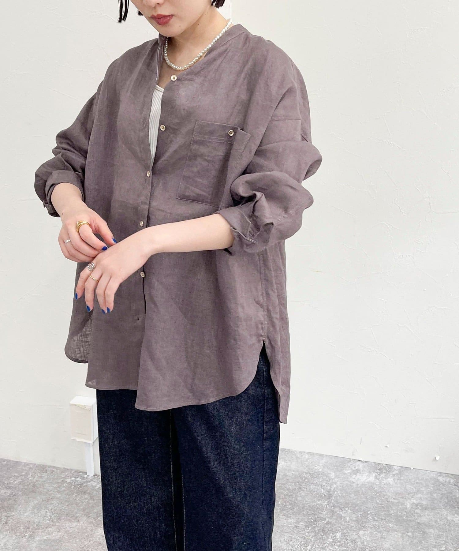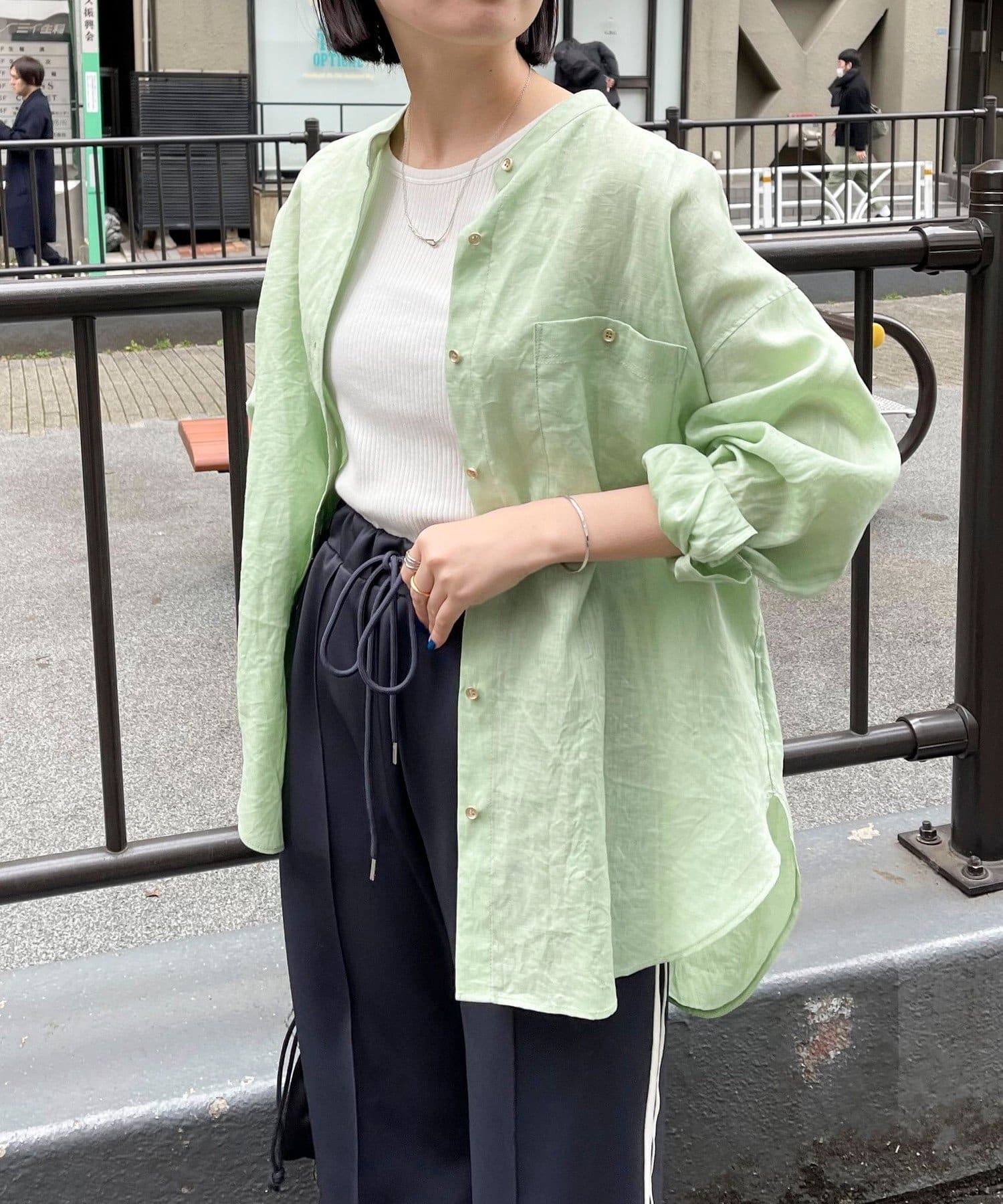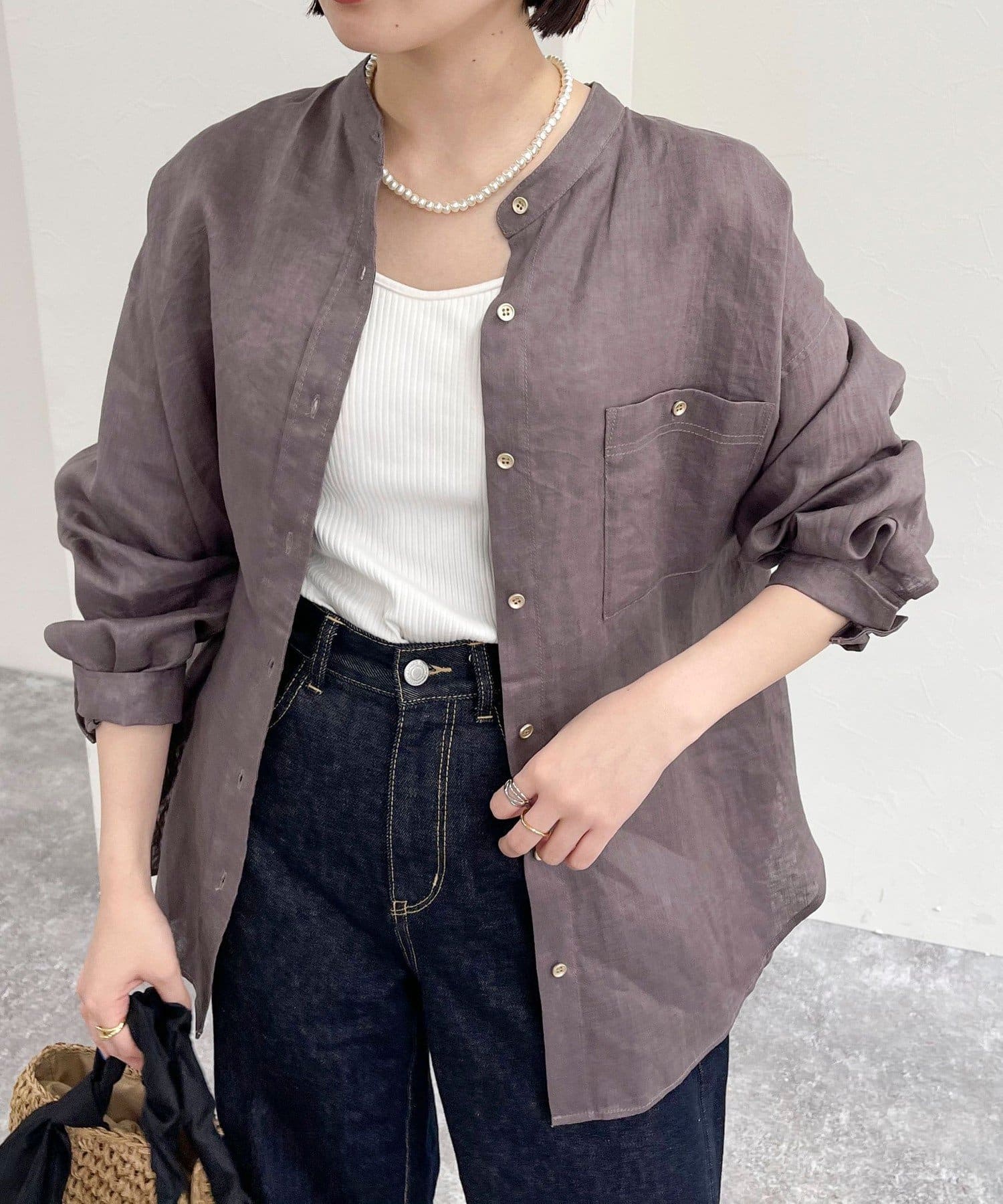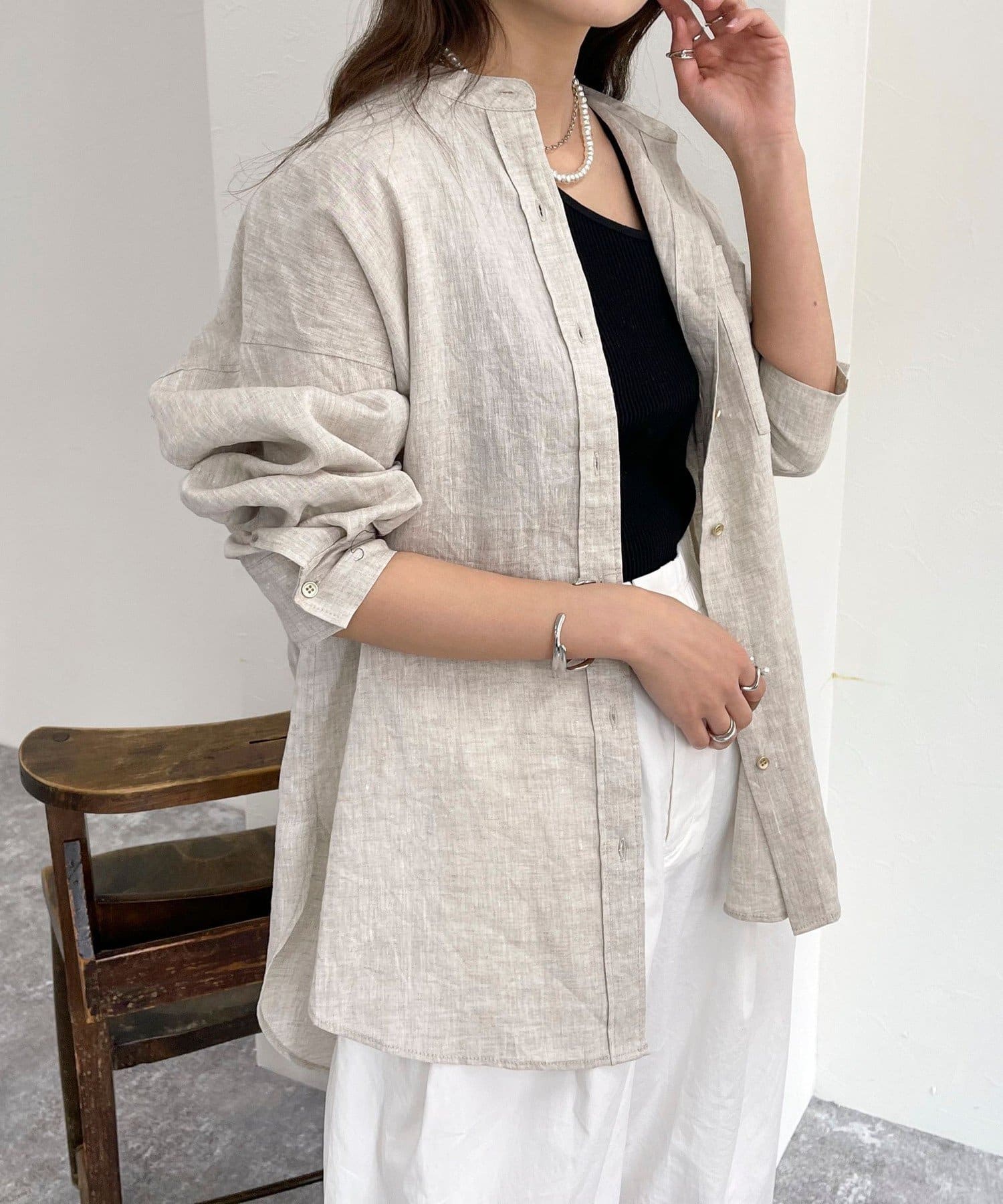 今っぽい着こなしになる、ラフな印象に見せてくれるリネンバンドカラーシャツ