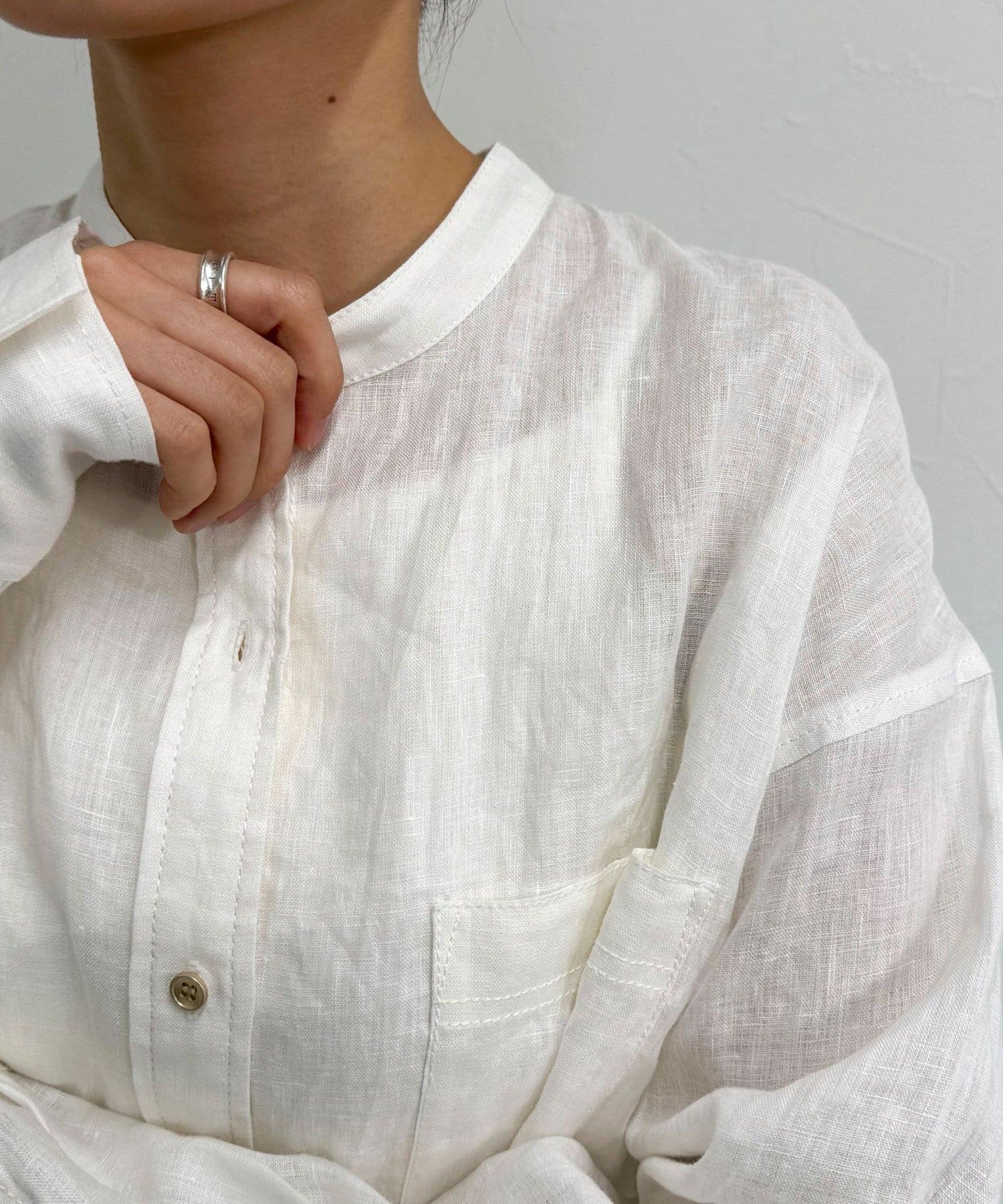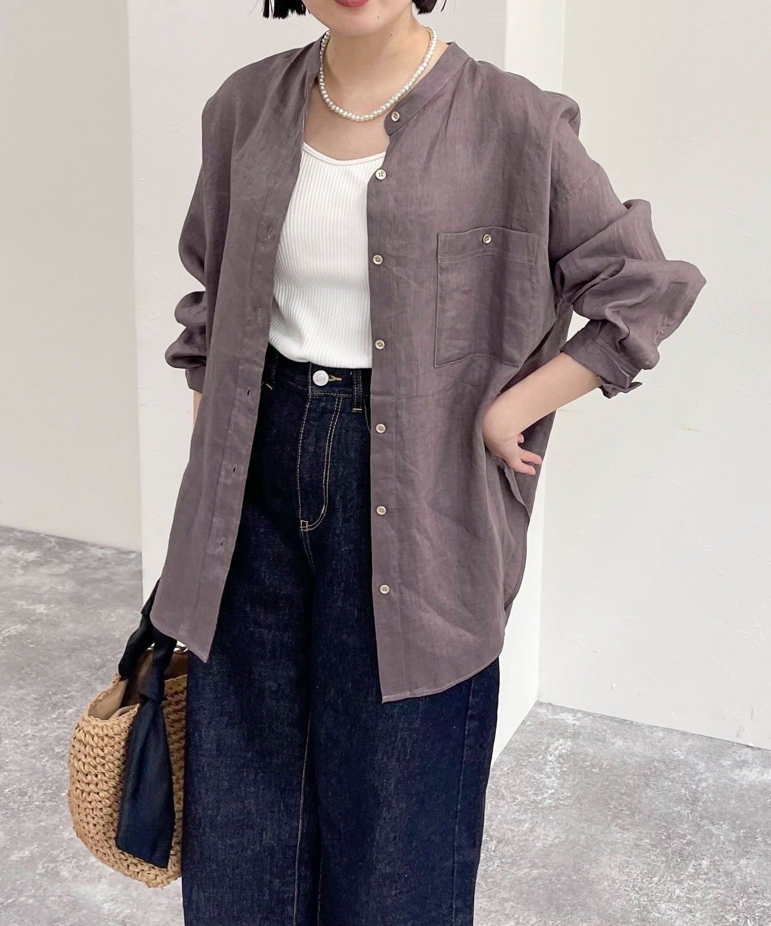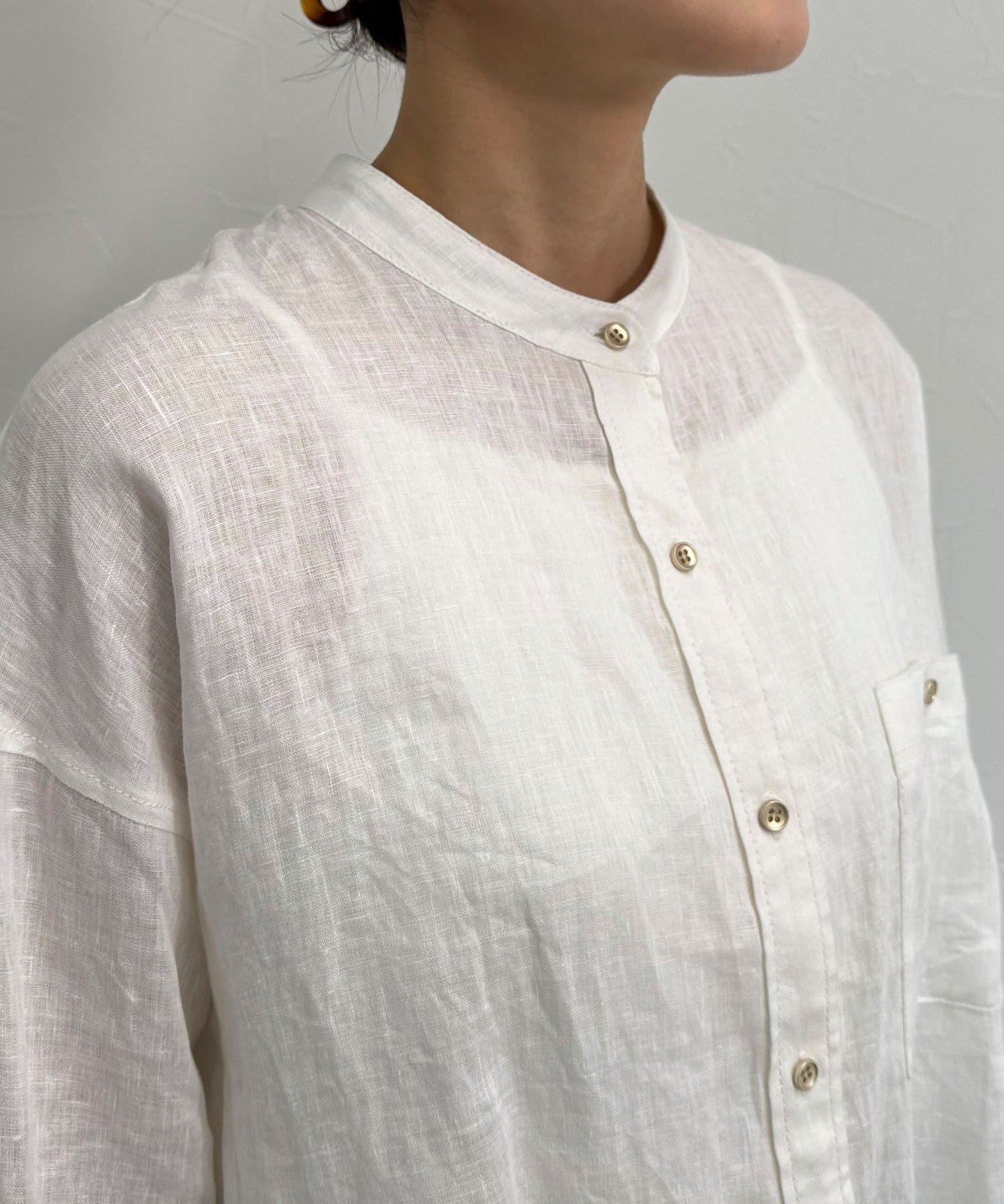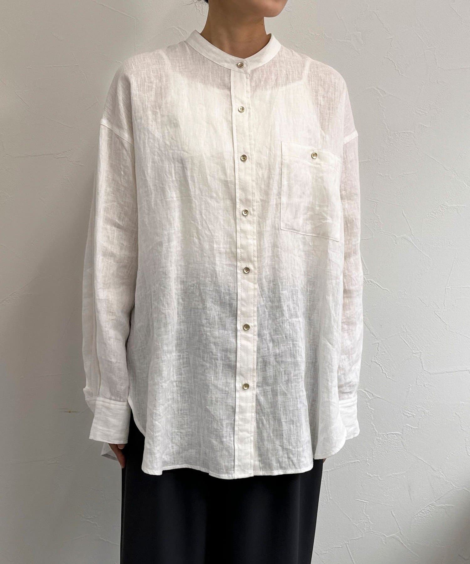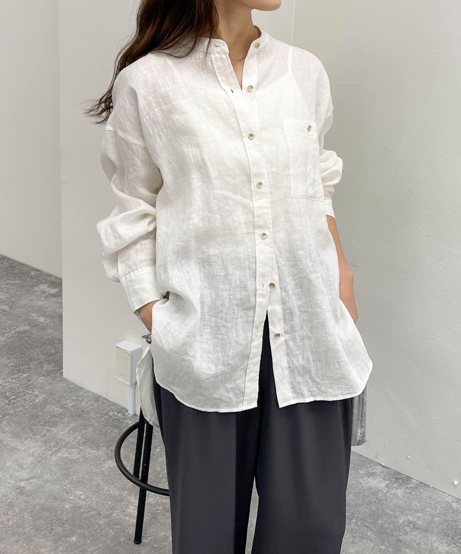 今っぽい着こなしになる、ラフな印象に見せてくれるリネンバンドカラーシャツ