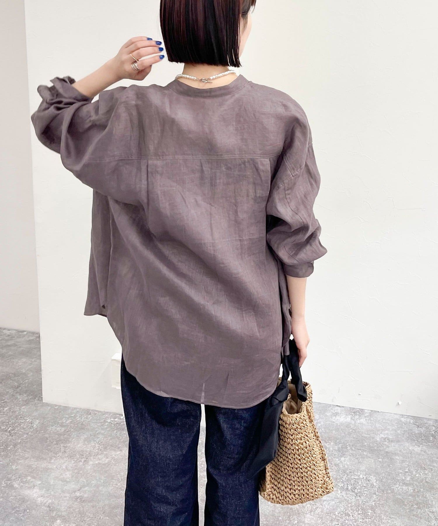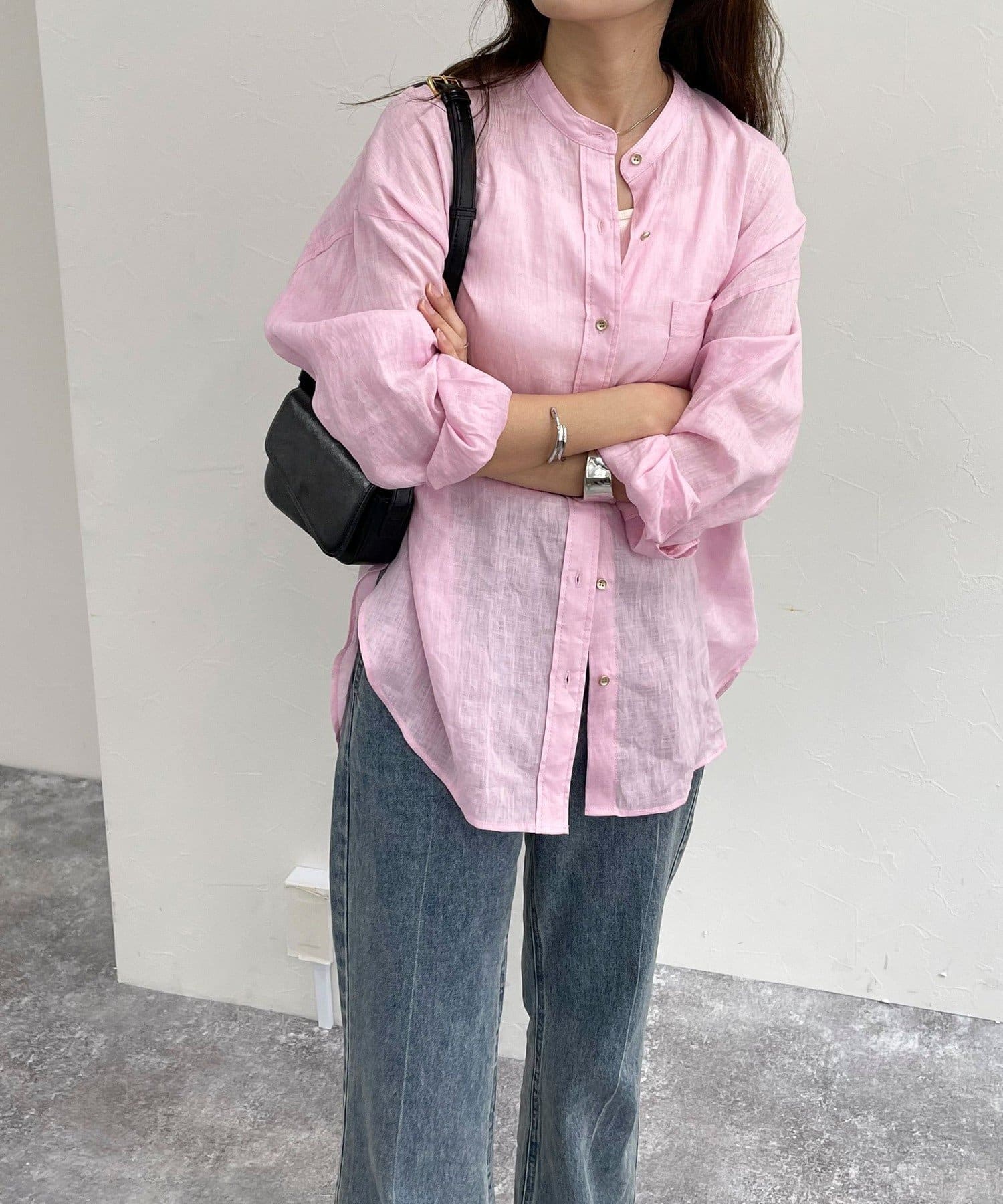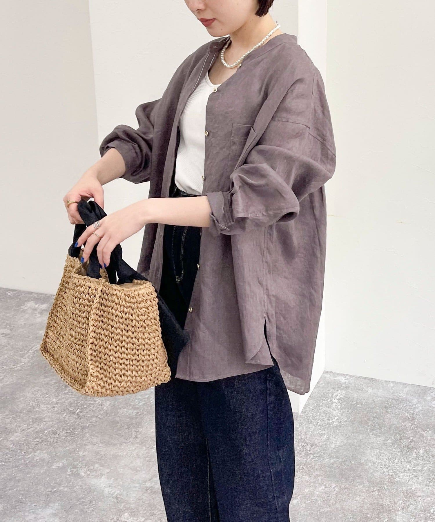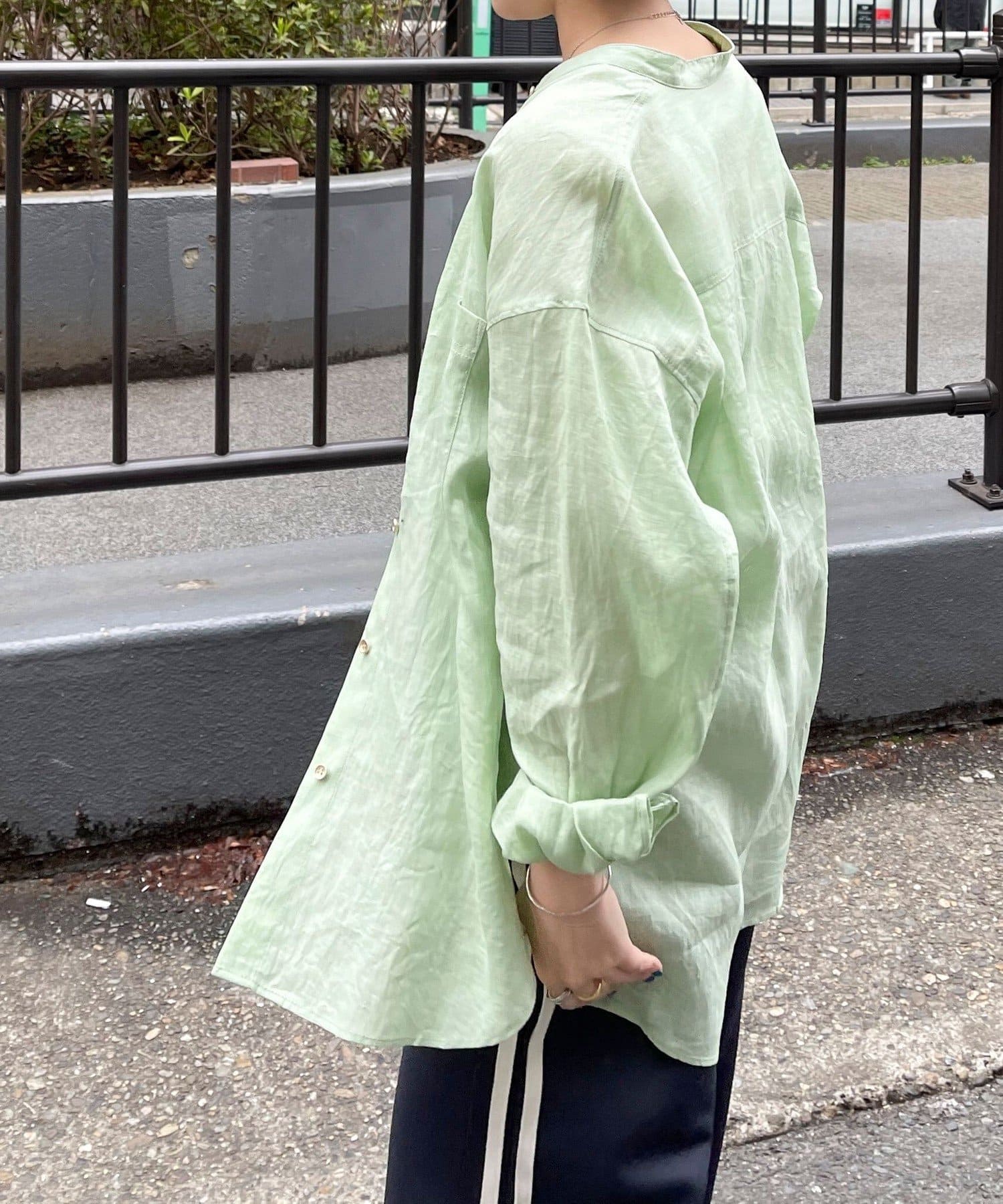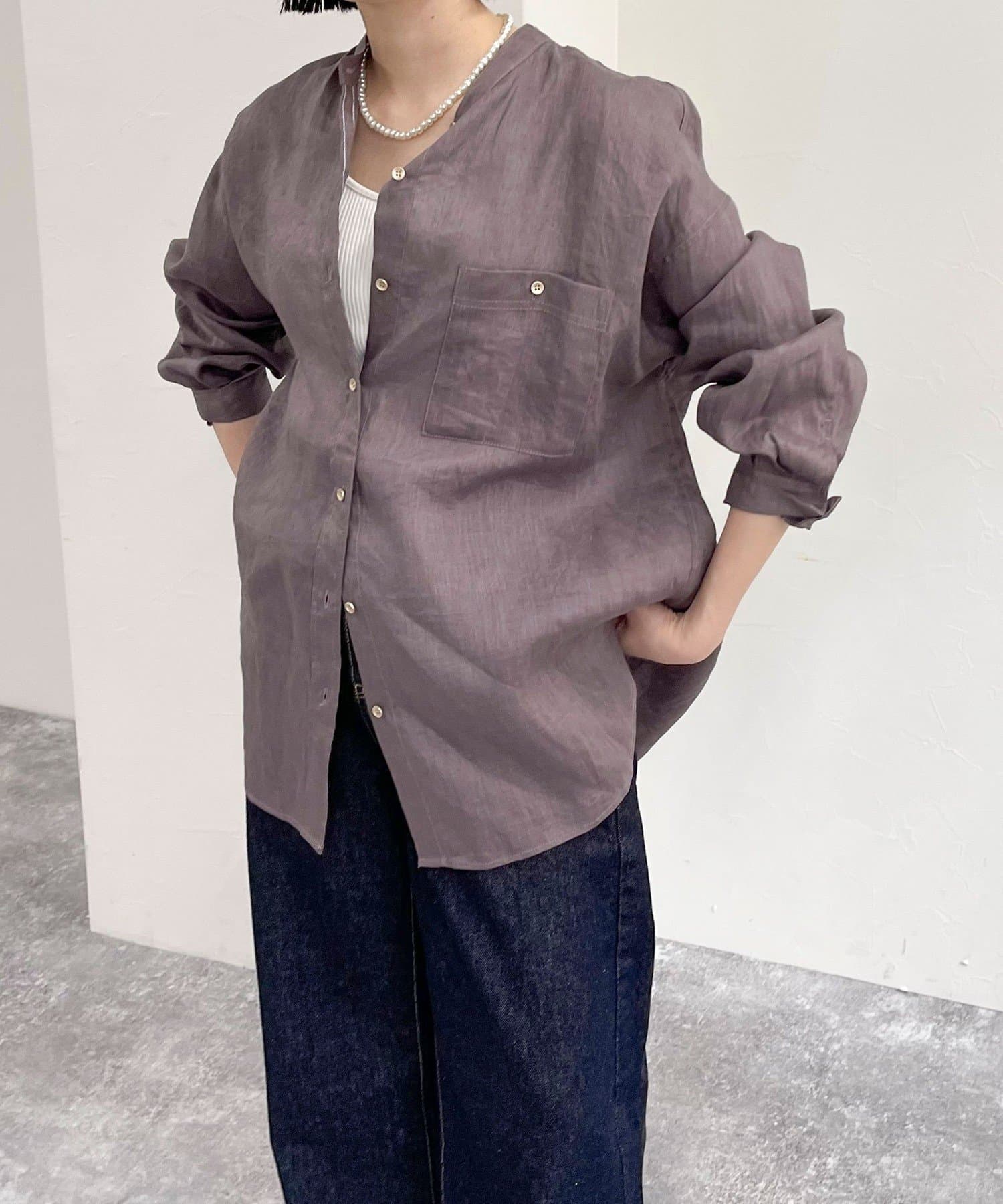 今っぽい着こなしになる、ラフな印象に見せてくれるリネンバンドカラーシャツ