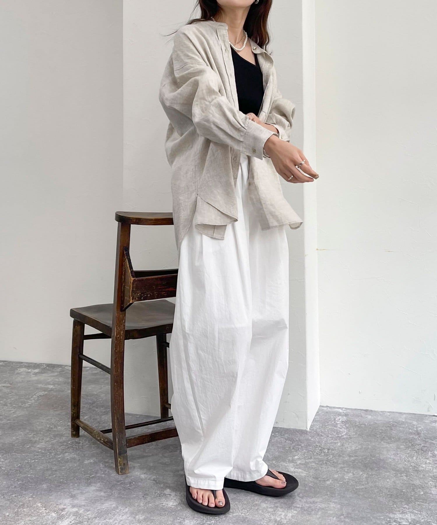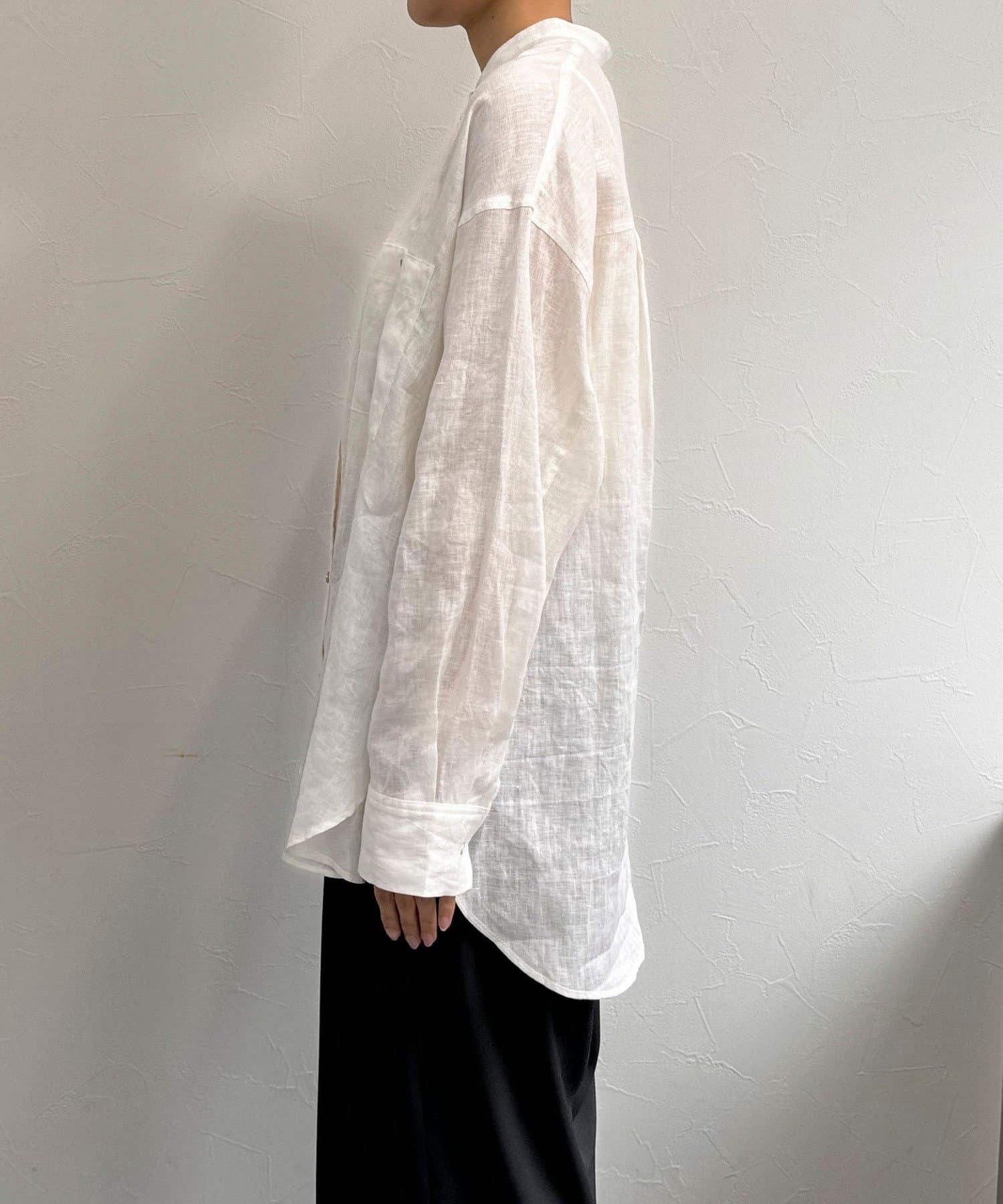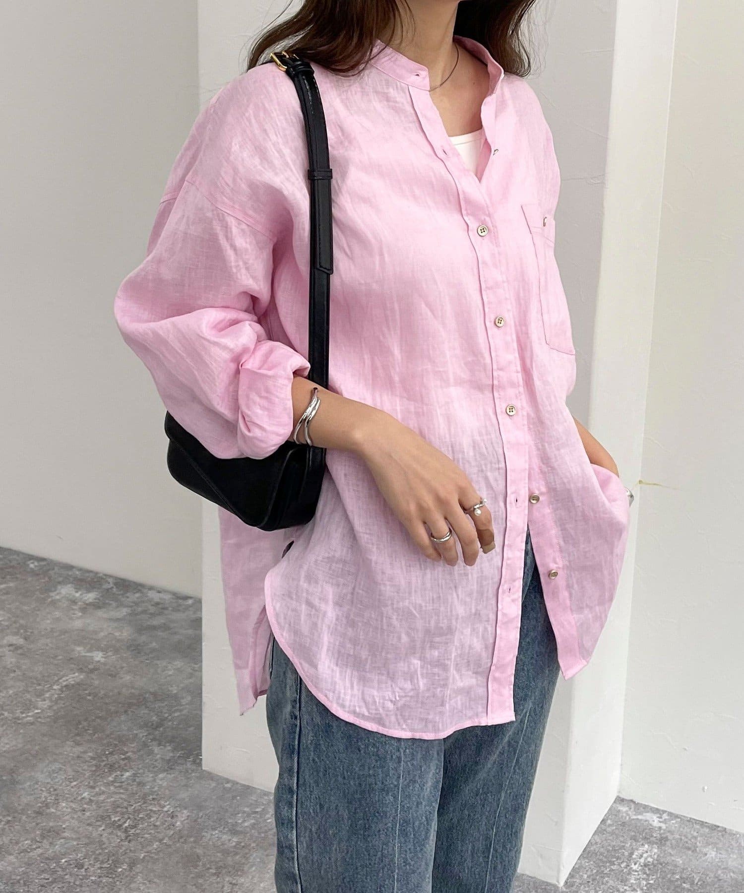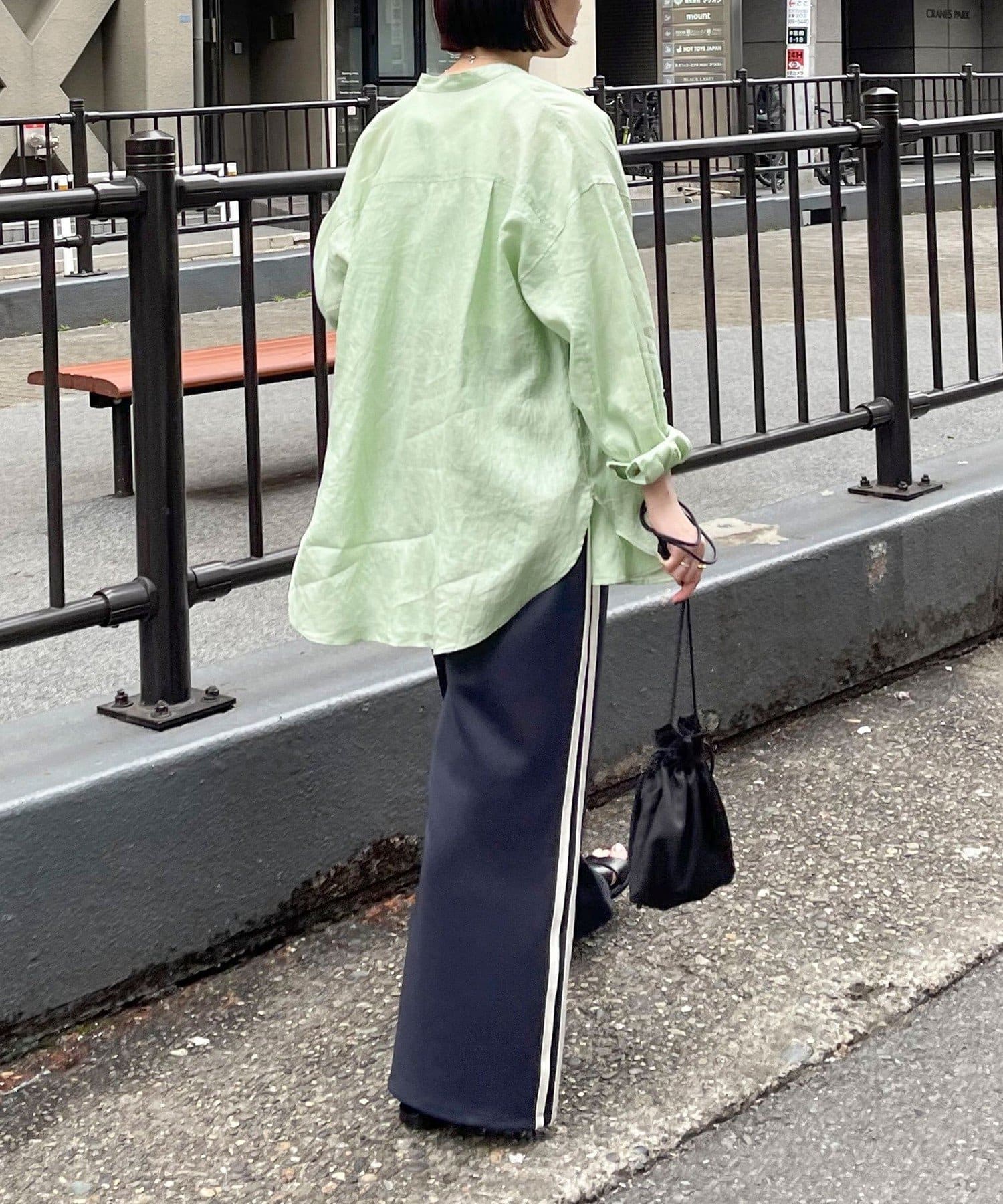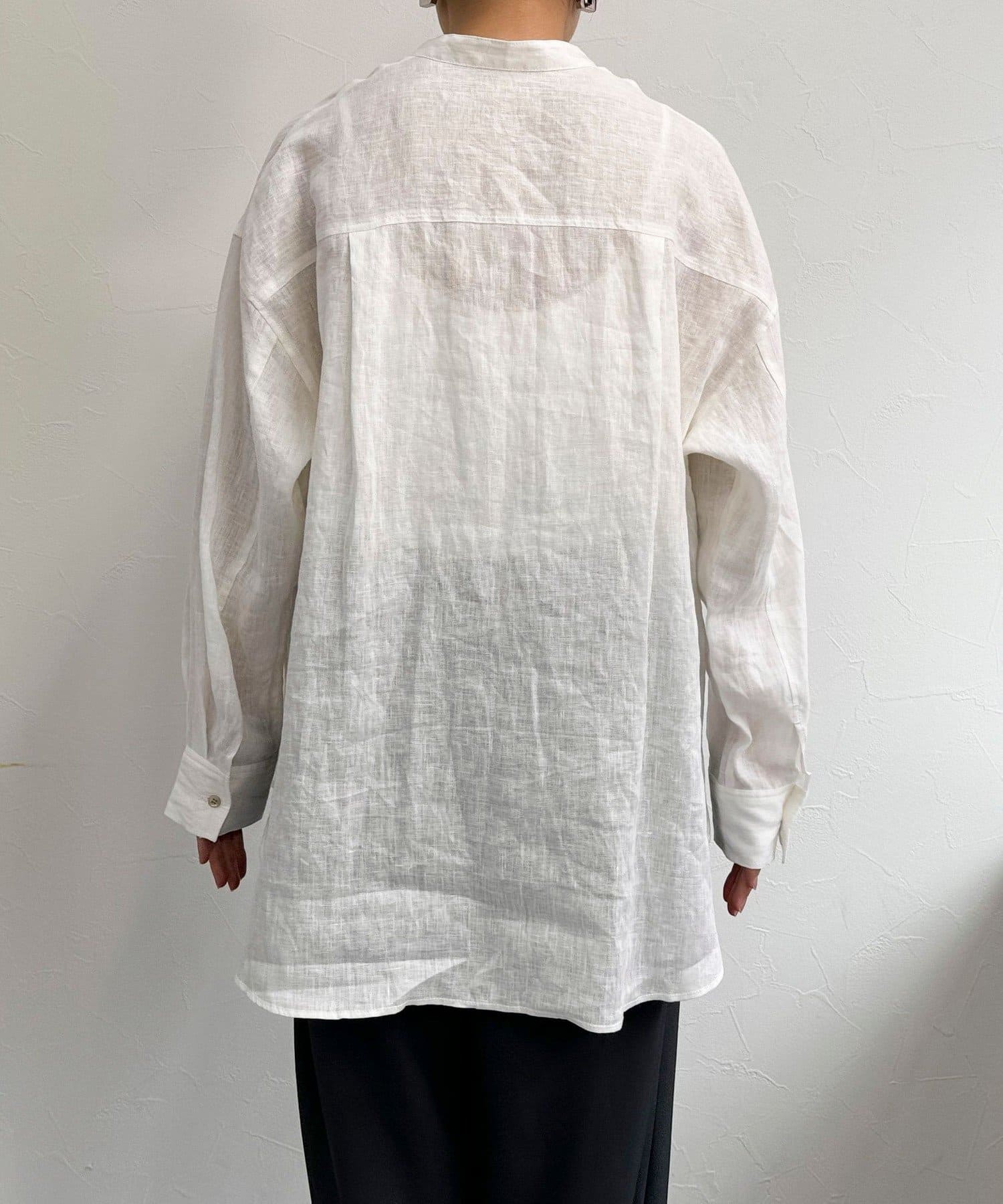 今っぽい着こなしになる、ラフな印象に見せてくれるリネンバンドカラーシャツ