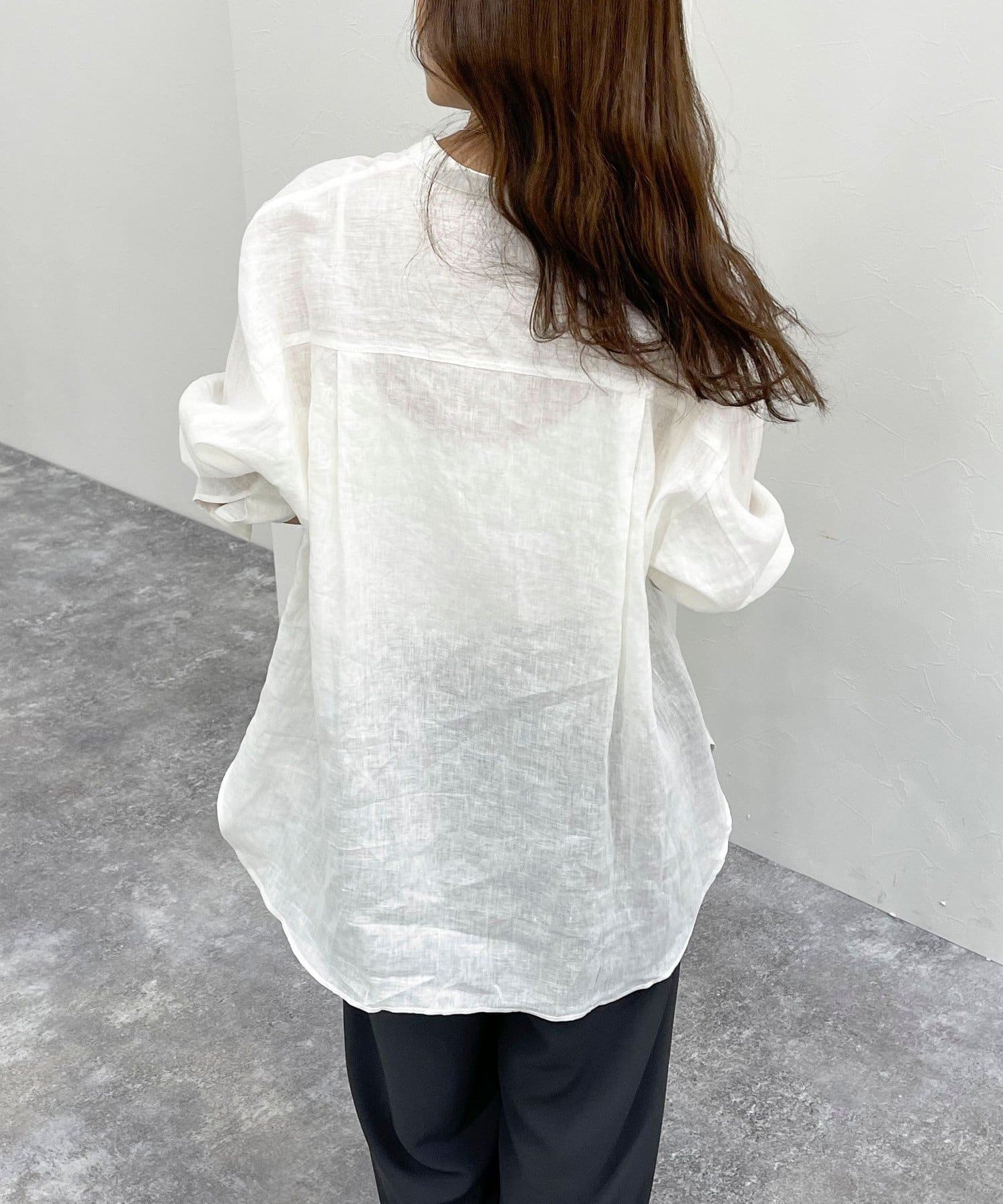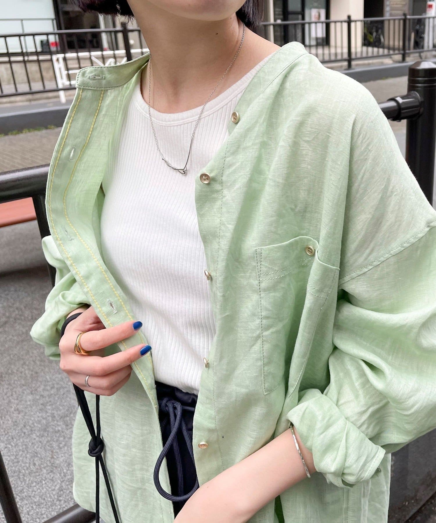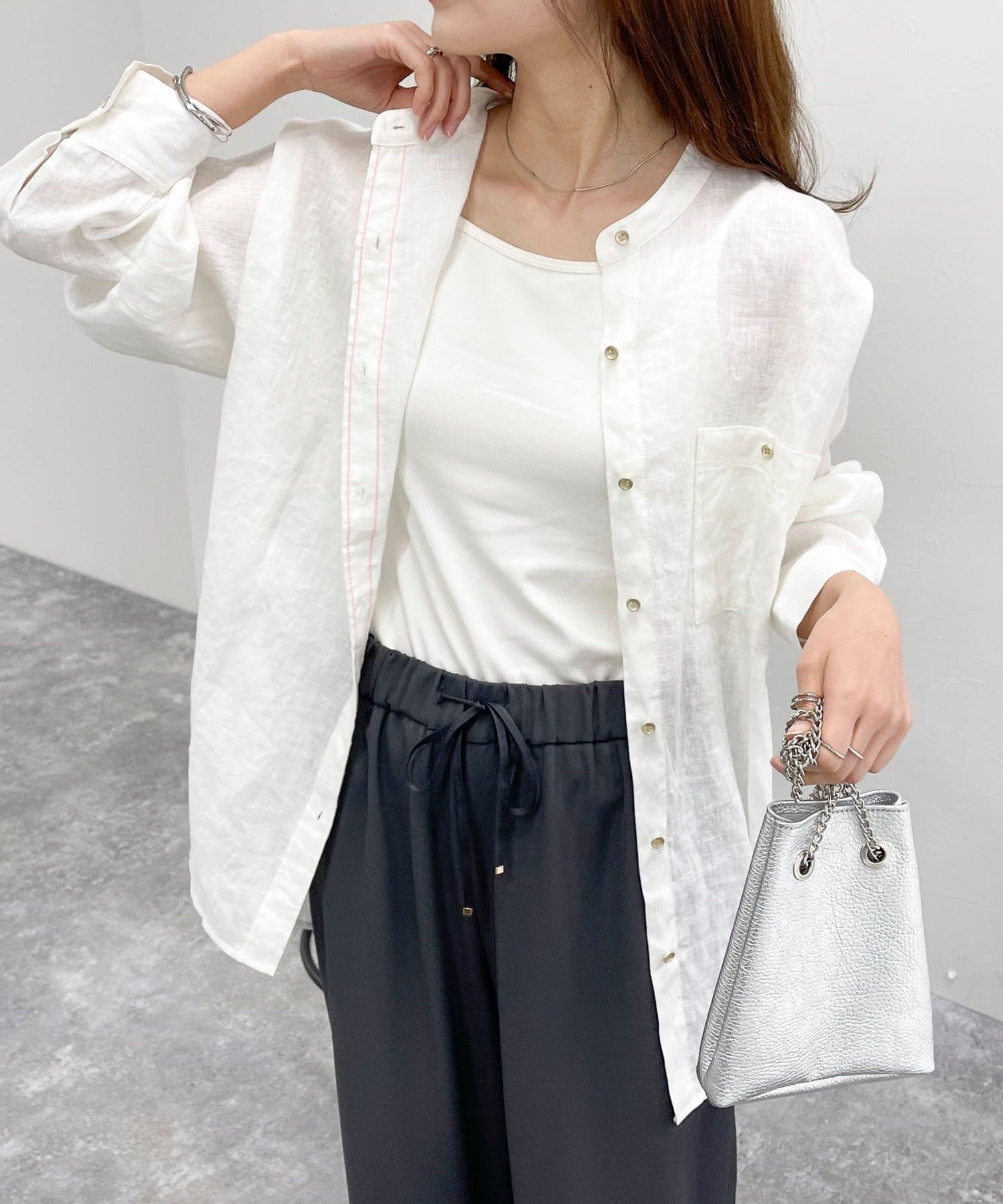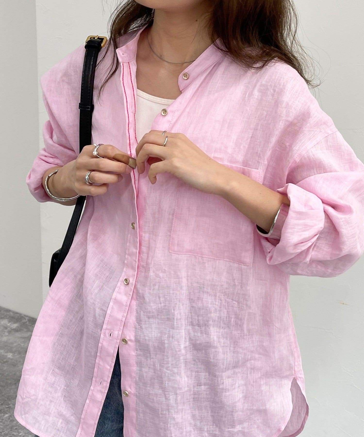 今っぽい着こなしになる、ラフな印象に見せてくれるリネンバンドカラーシャツ