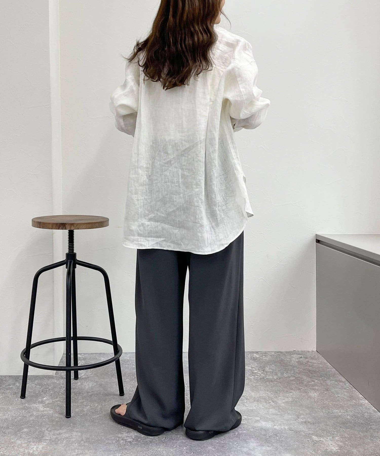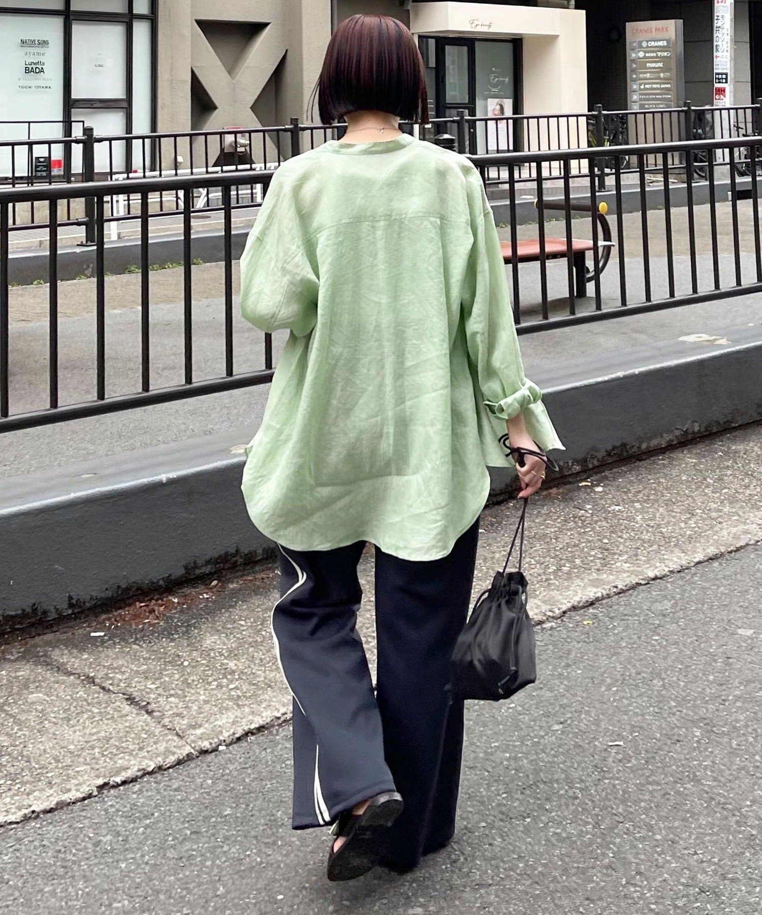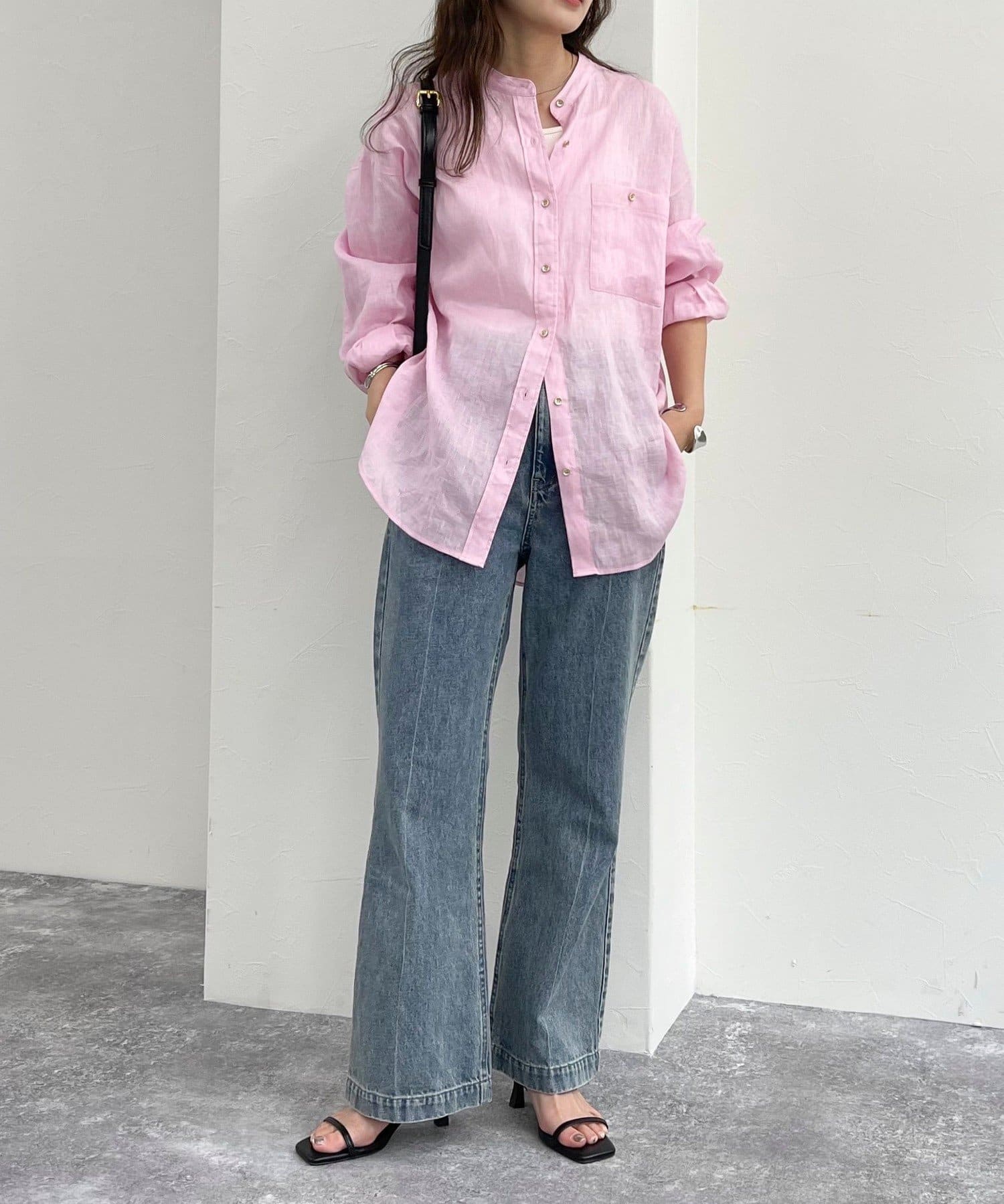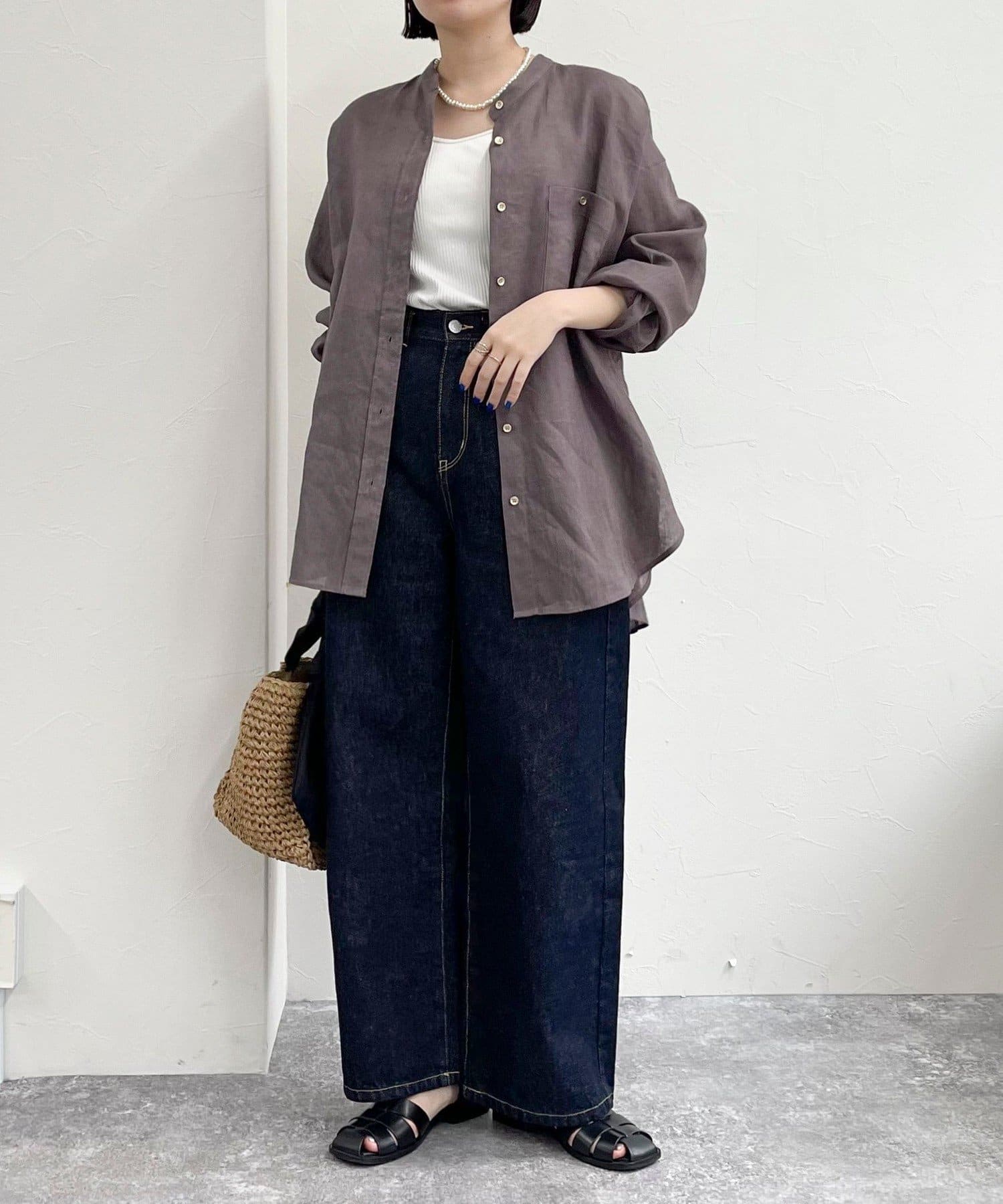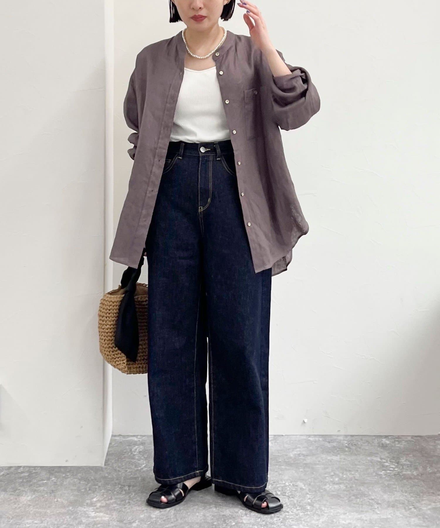 今っぽい着こなしになる、ラフな印象に見せてくれるリネンバンドカラーシャツ