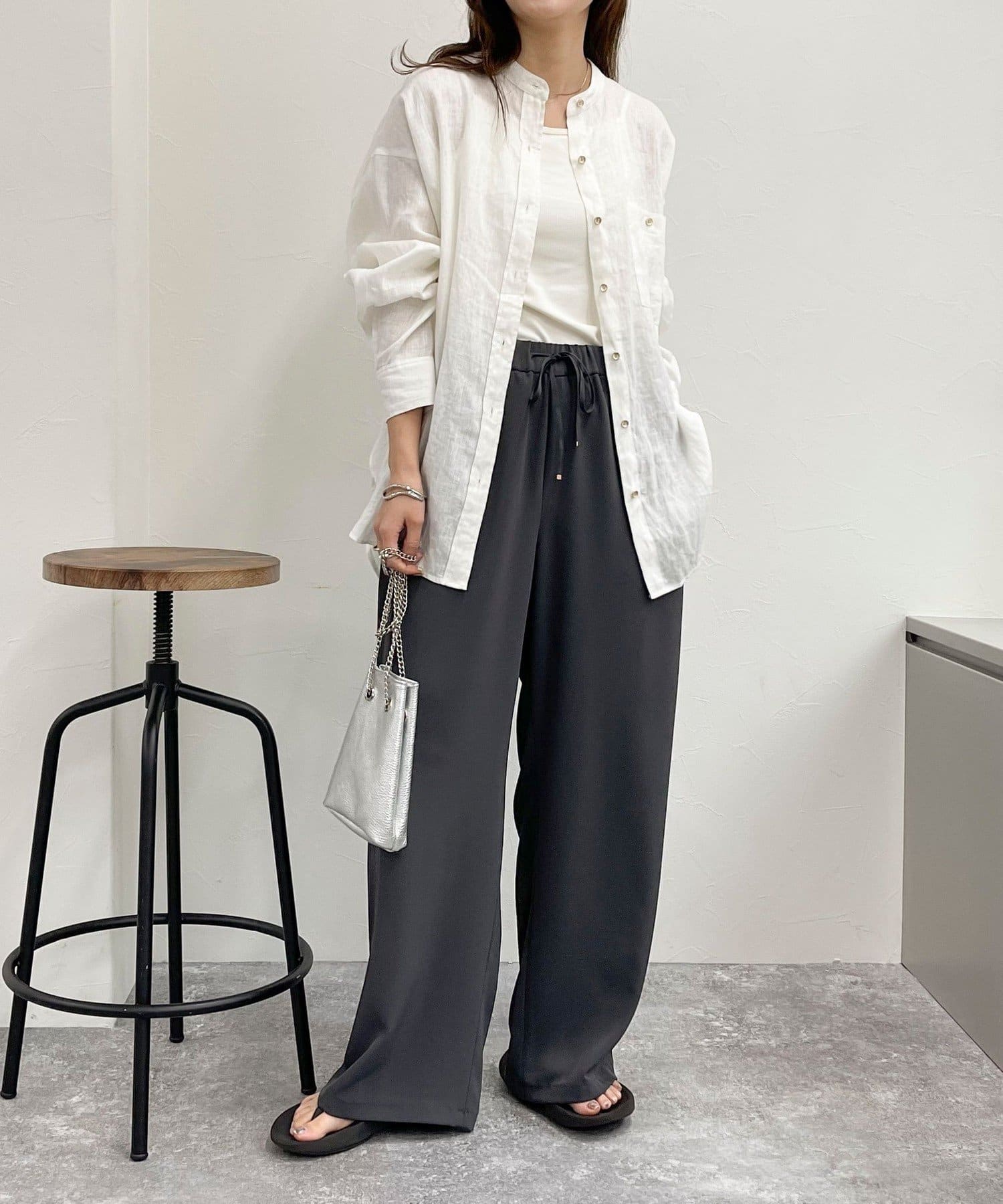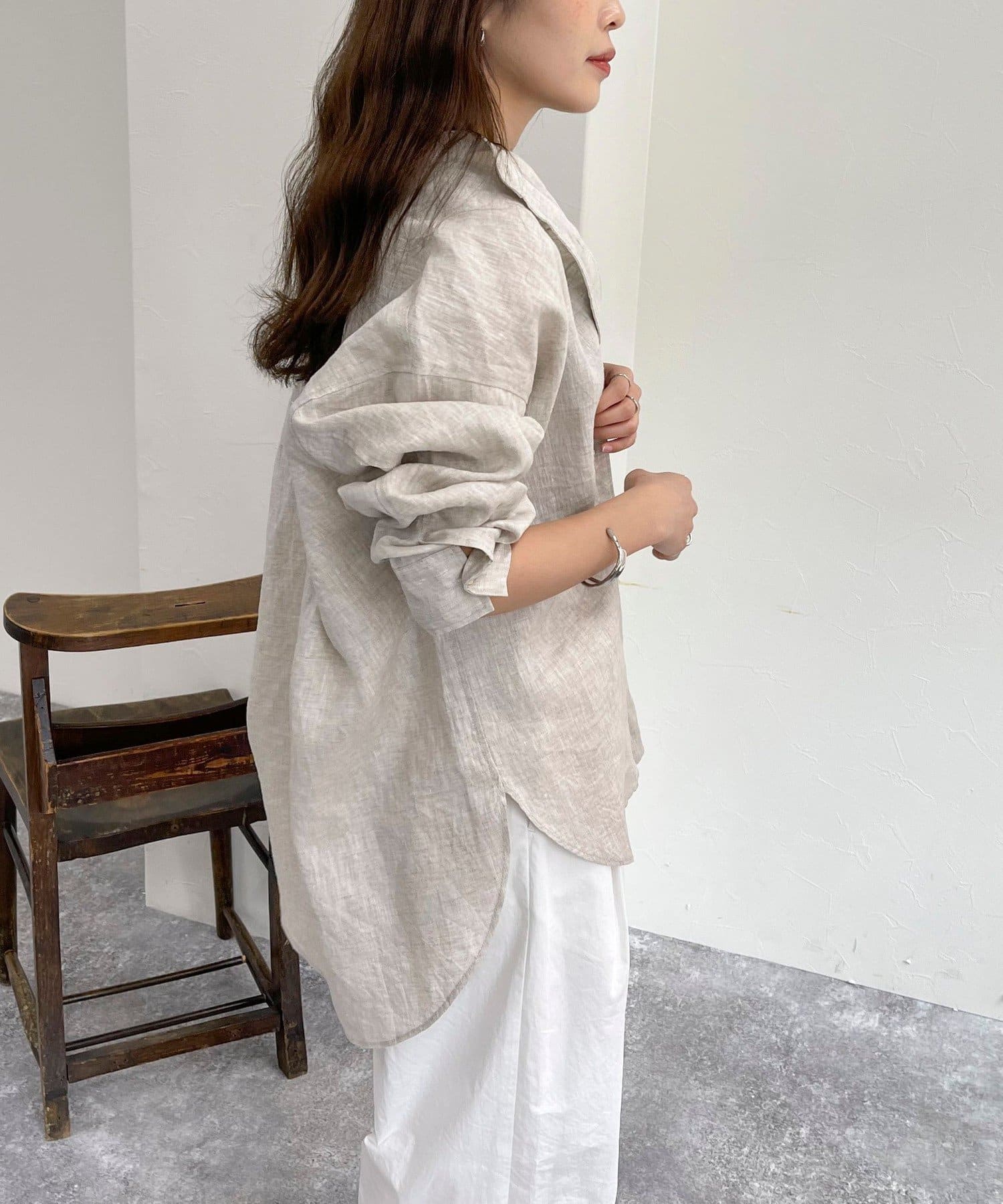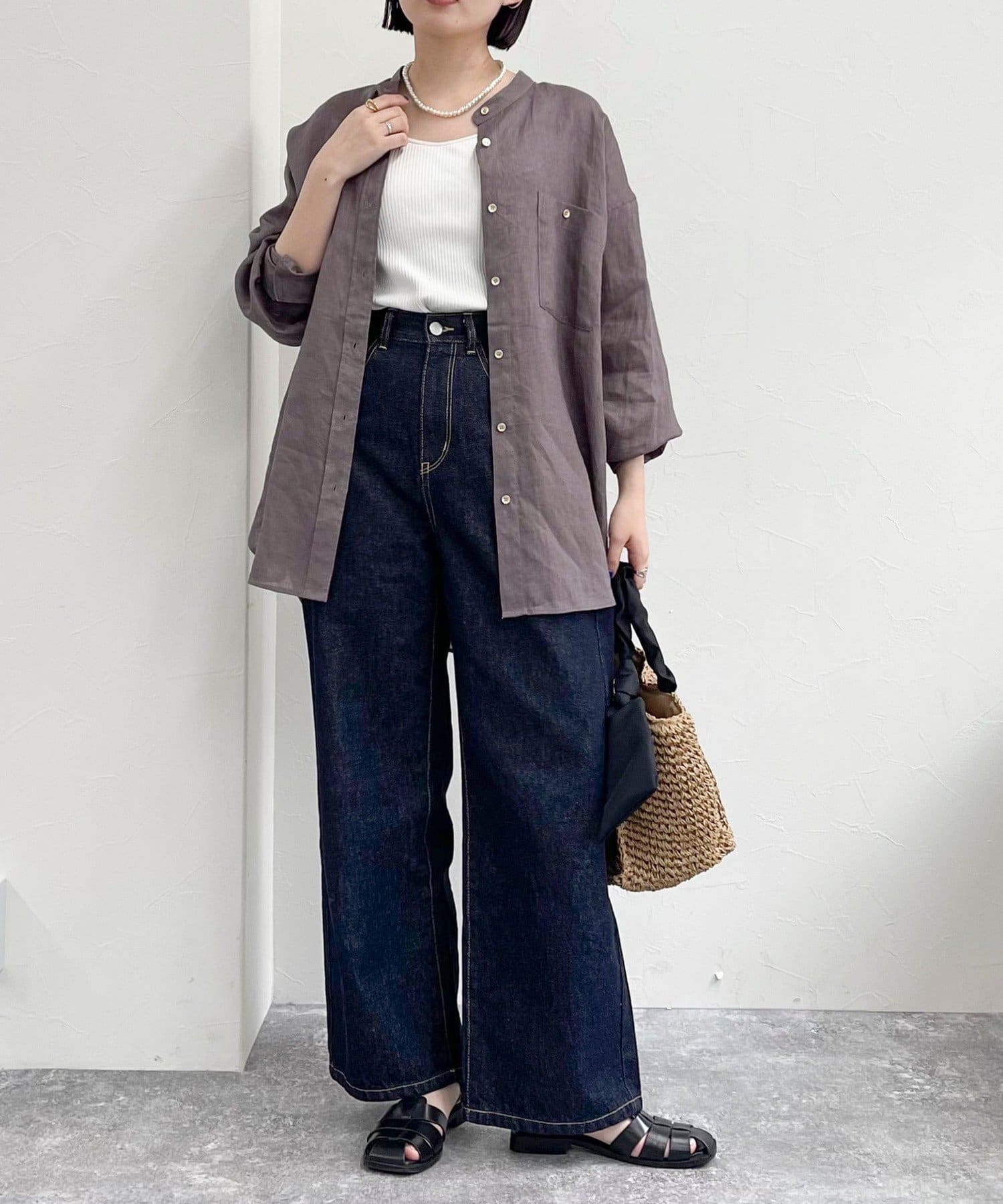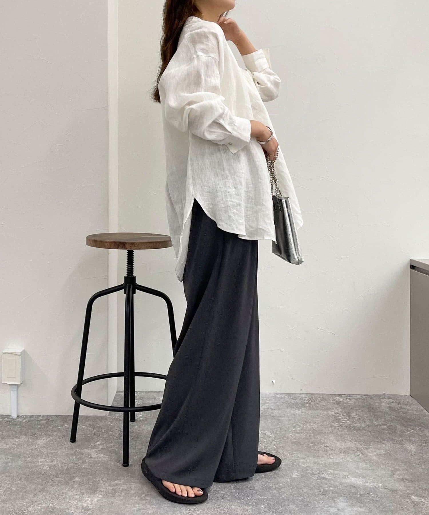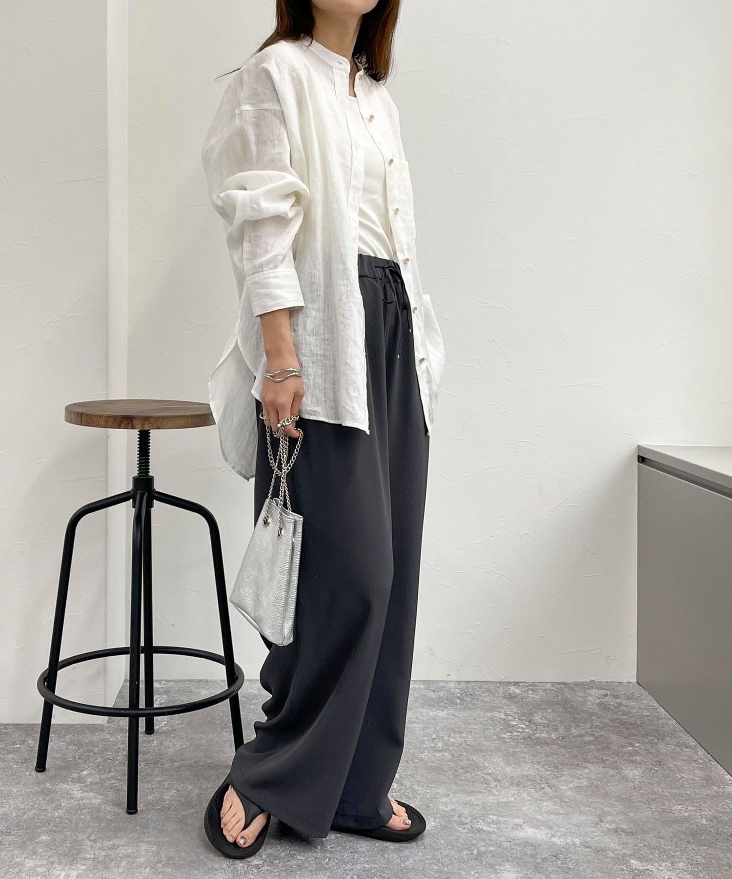 今っぽい着こなしになる、ラフな印象に見せてくれるリネンバンドカラーシャツ