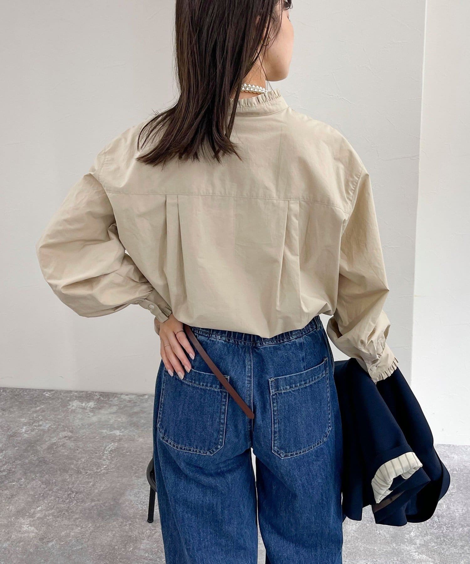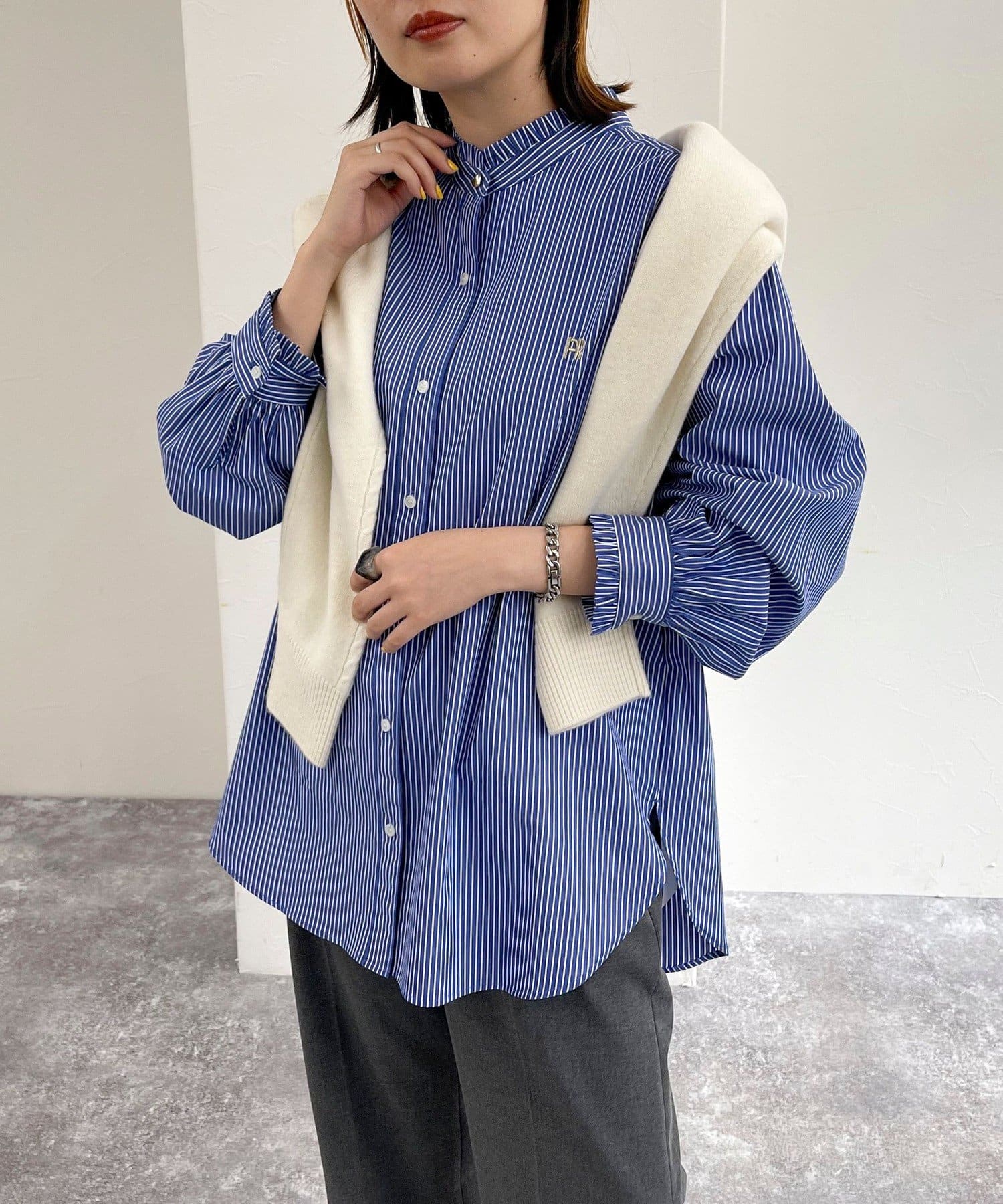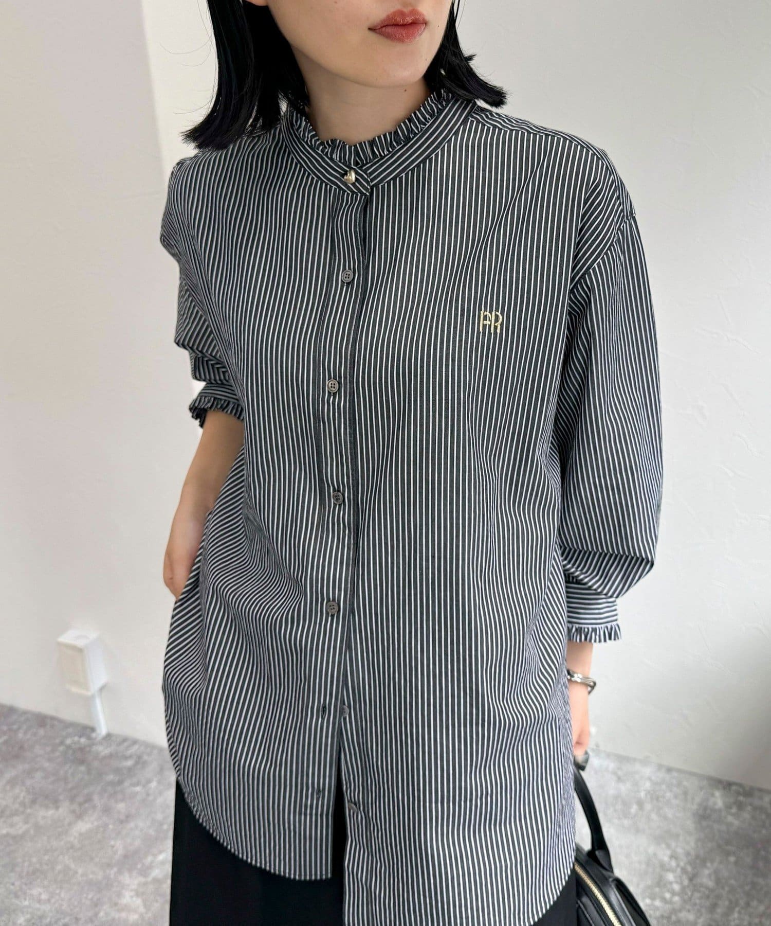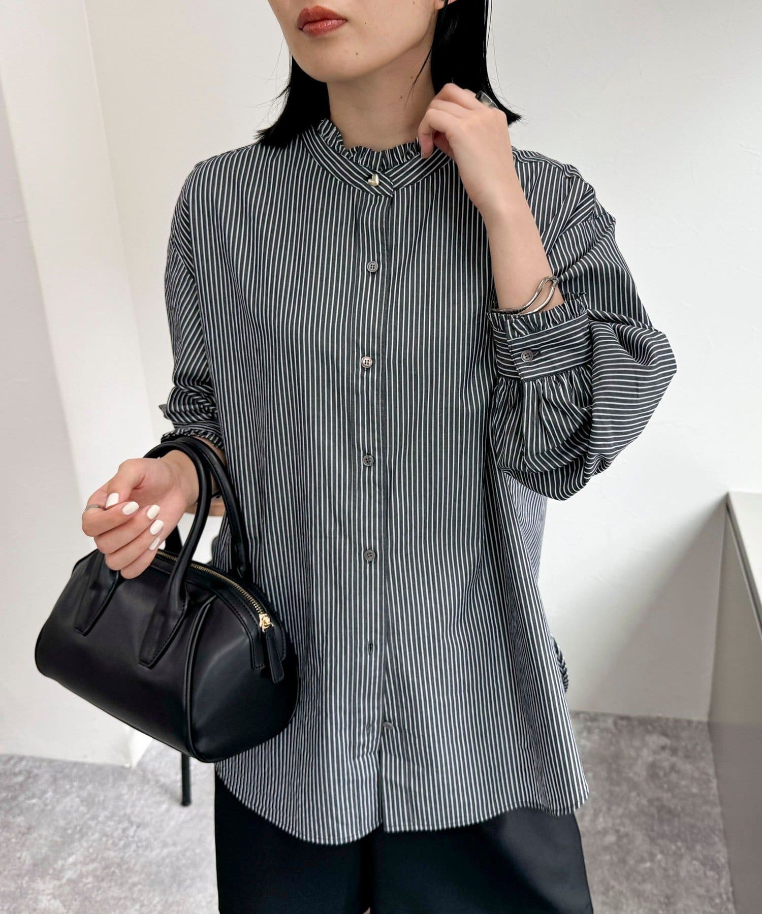 ・女性らしさ溢れるバンドカラーフリルシャツです