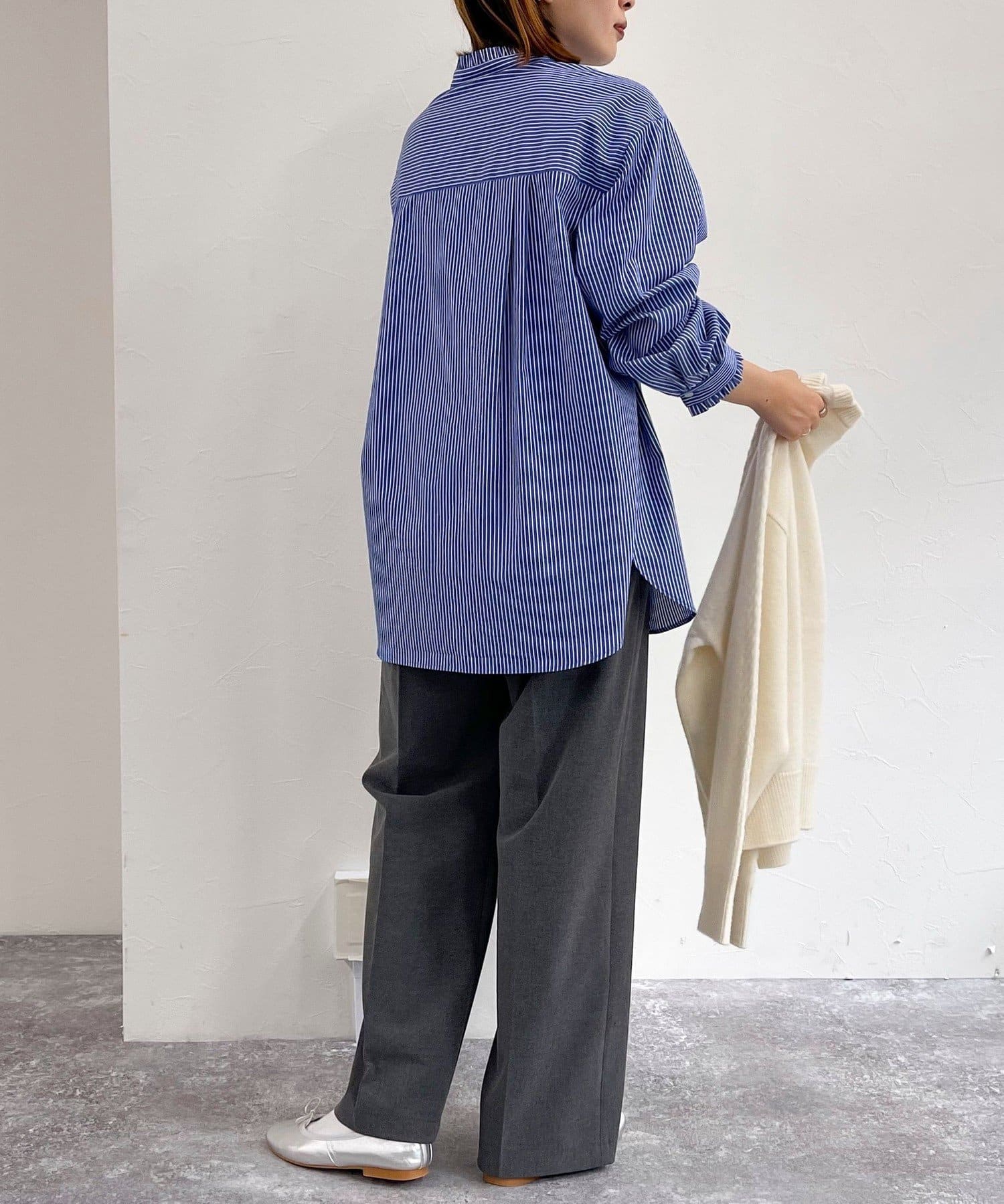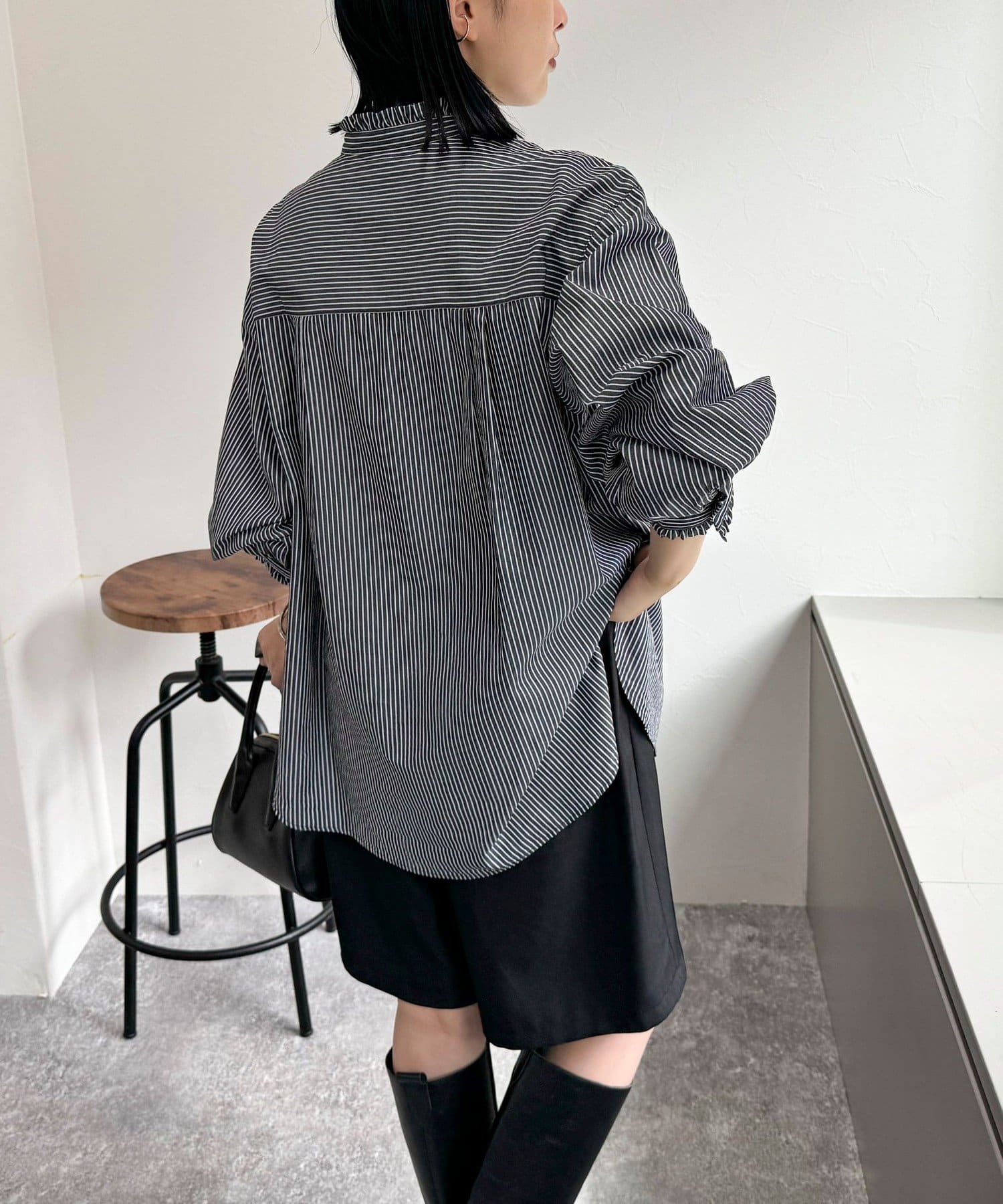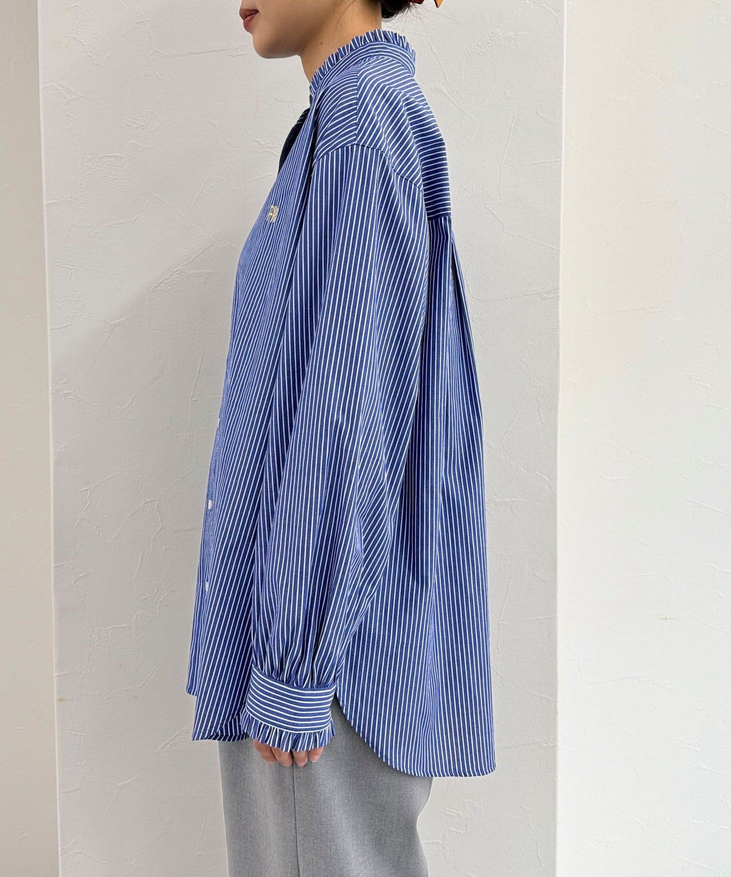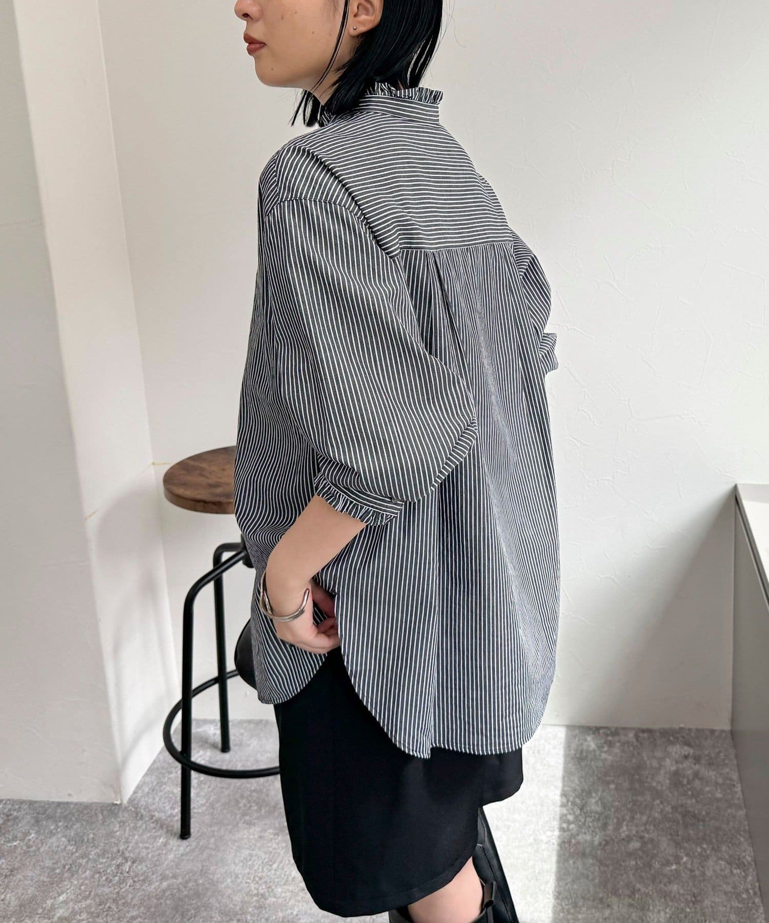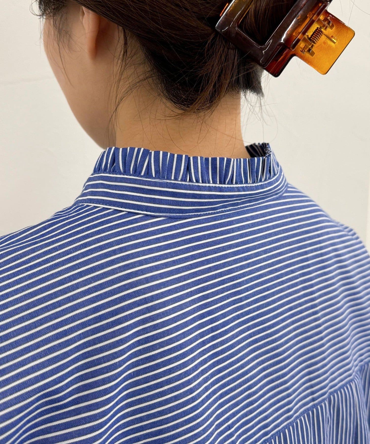 ・女性らしさ溢れるバンドカラーフリルシャツです