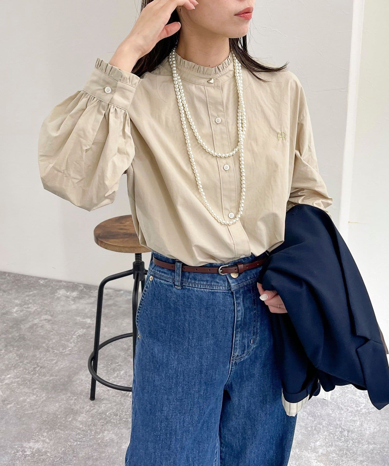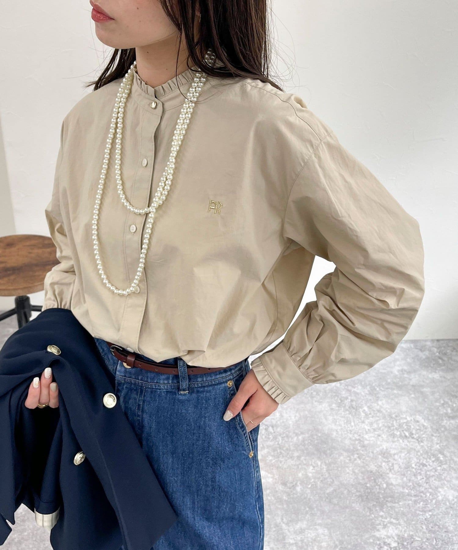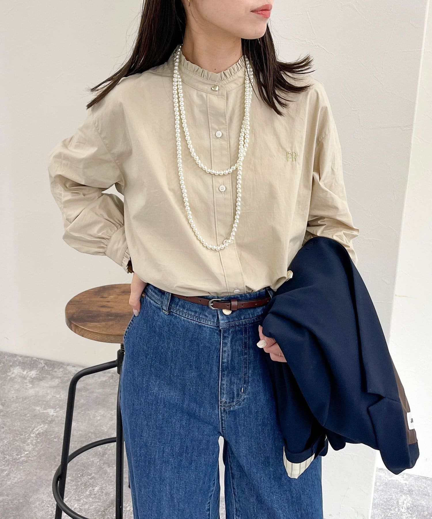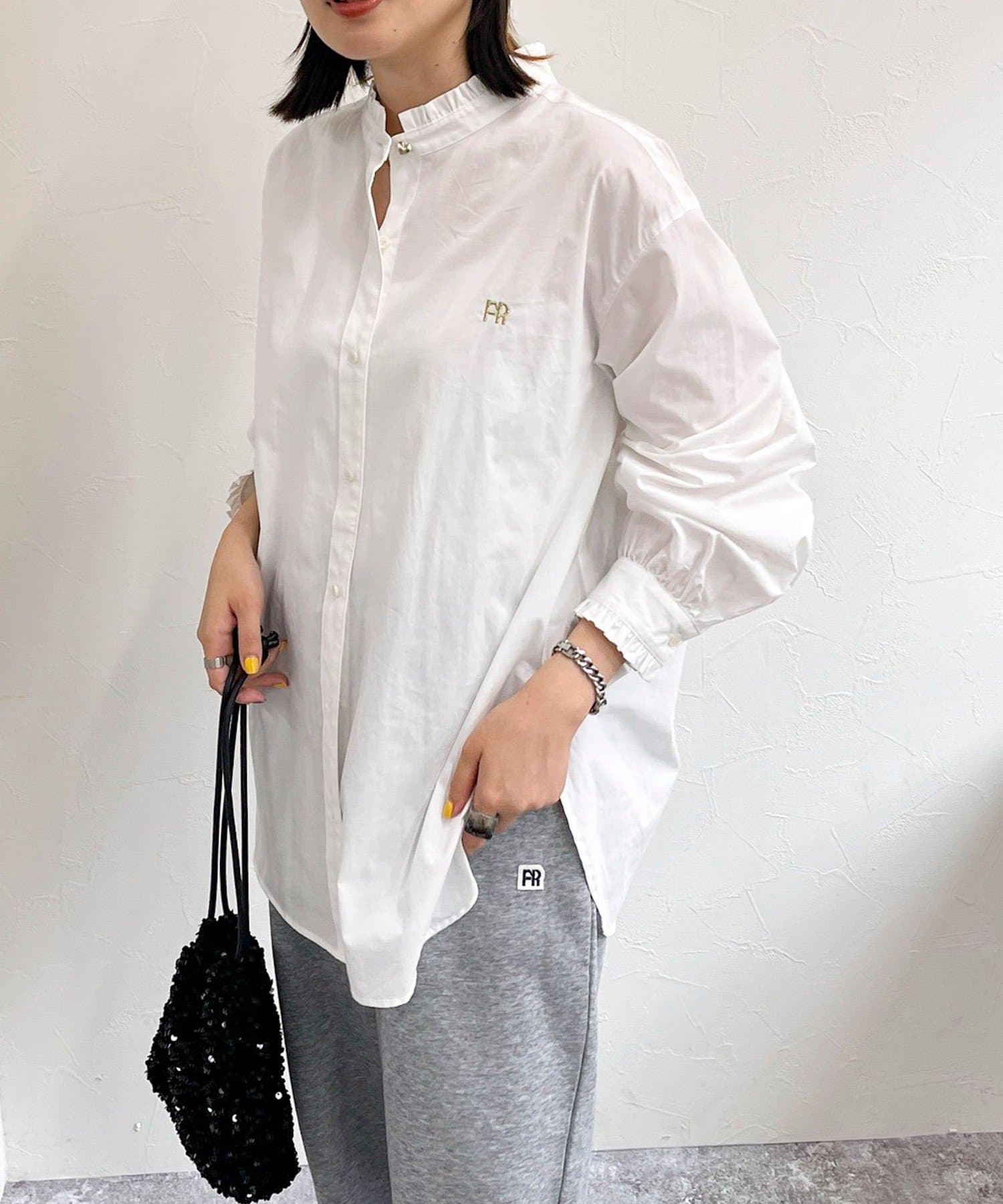 レディライクな1枚で着映えするFR刺繍バンドカラーフリルシャツ