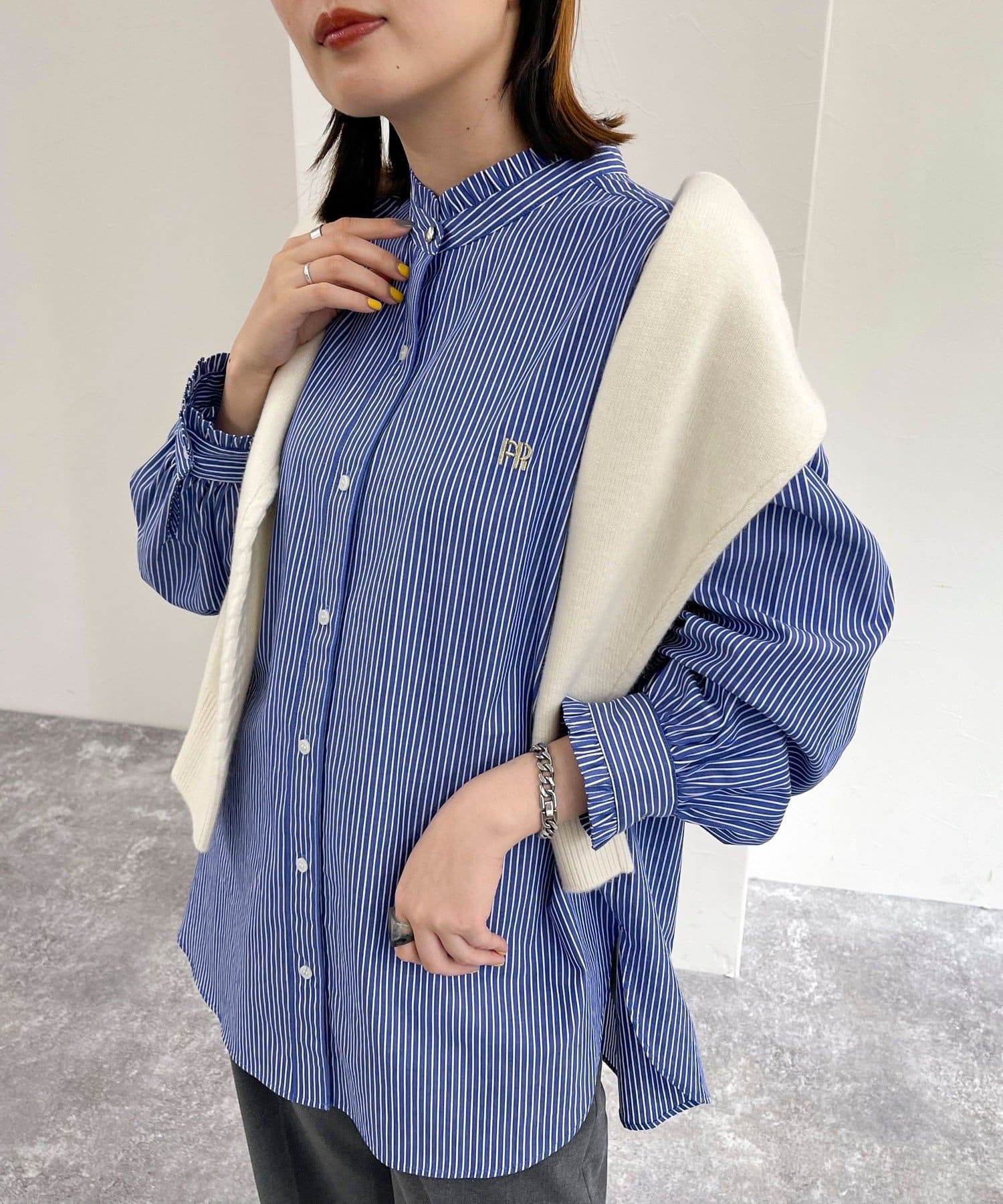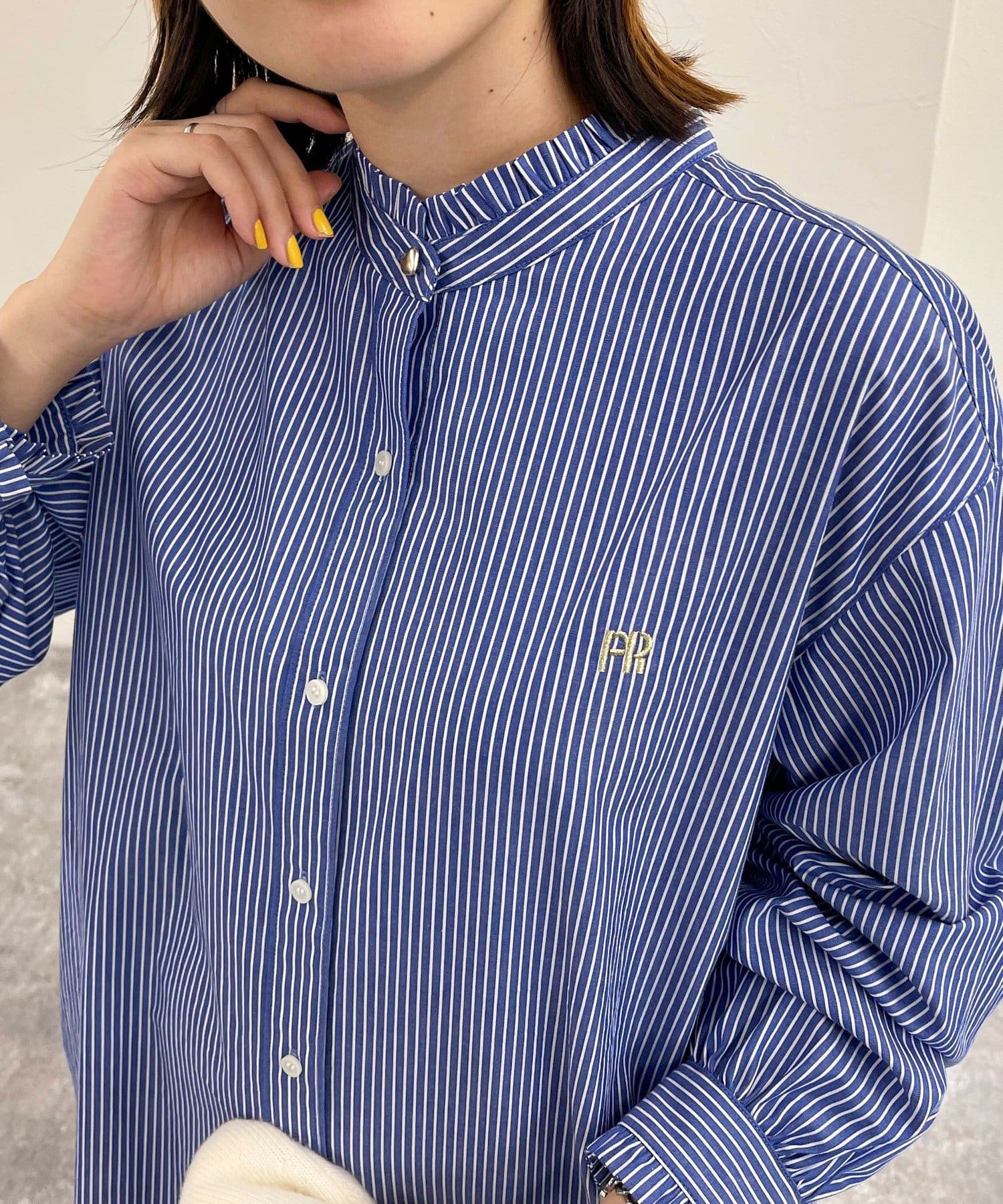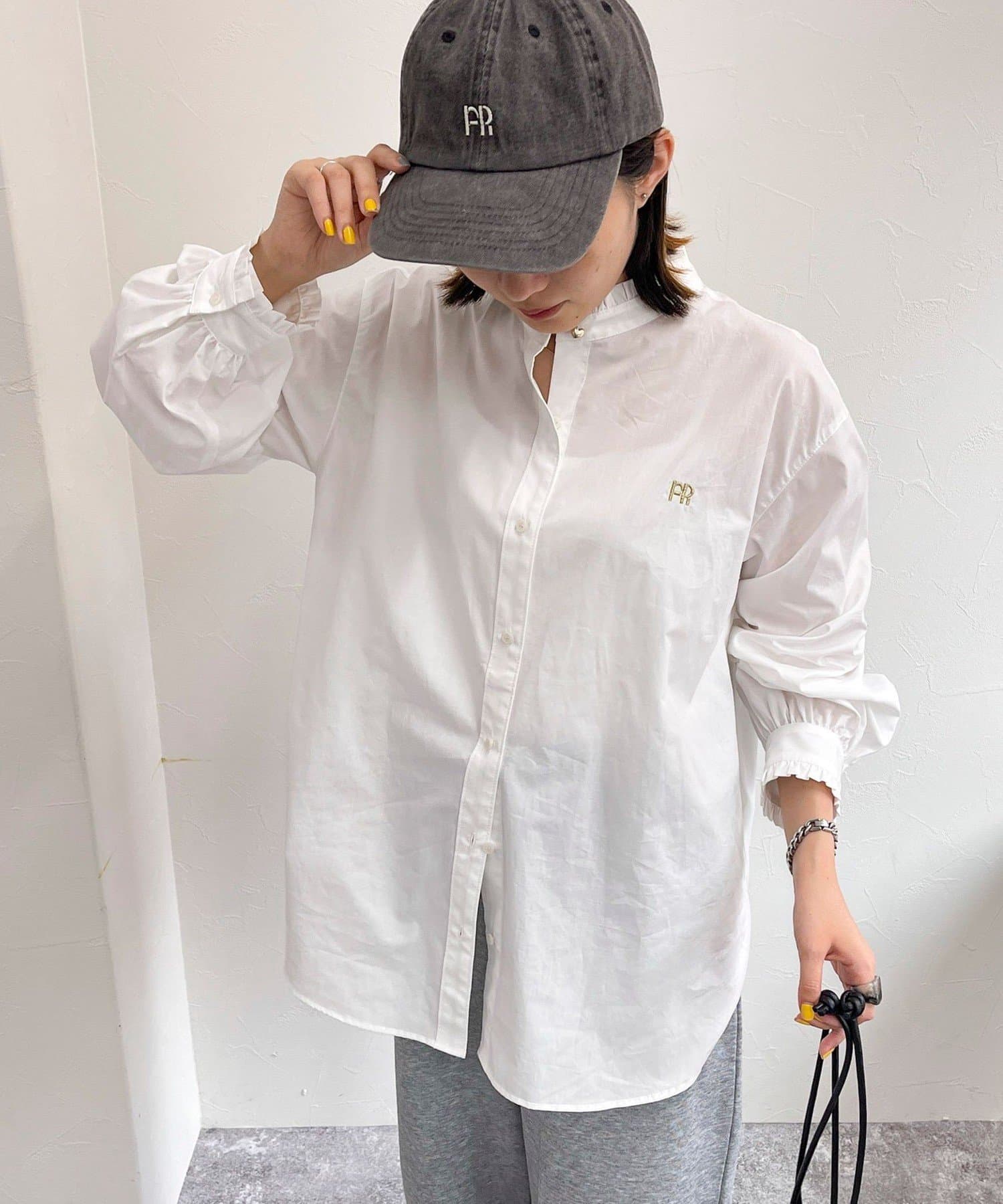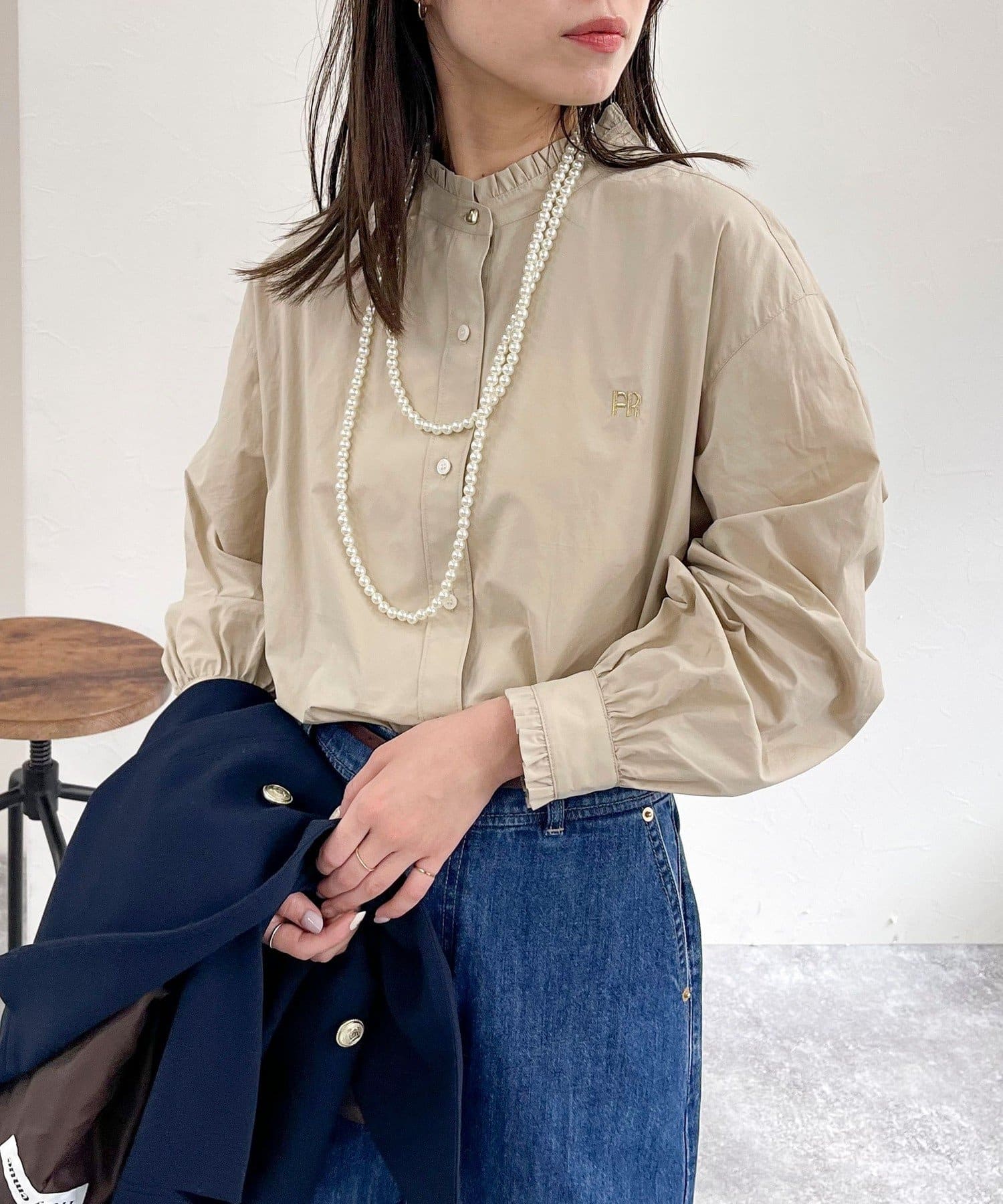 レディライクな1枚で着映えするFR刺繍バンドカラーフリルシャツ
