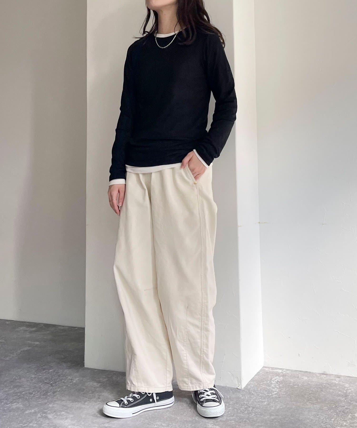 ・ヒップラインや脚のラインなどの気になる部分をカバーしながら、ワイドなのにダボっと見えないオトナなシルエットに仕上げています