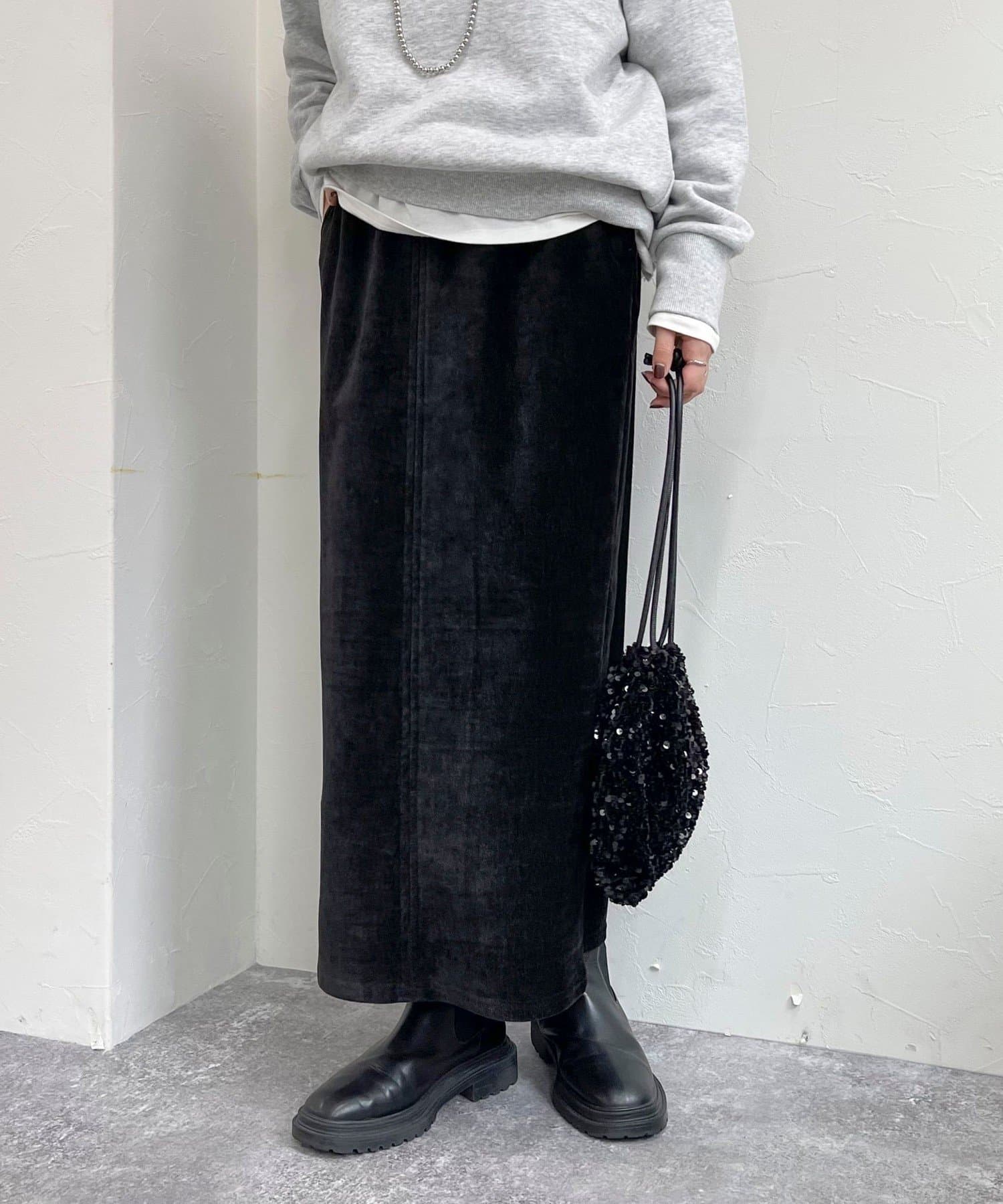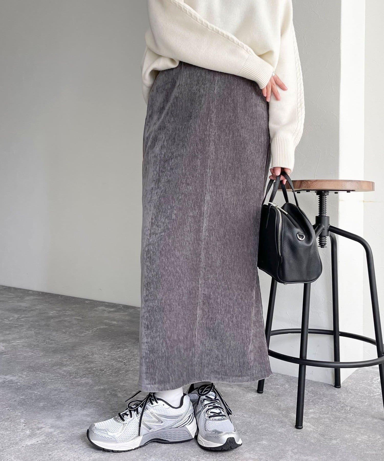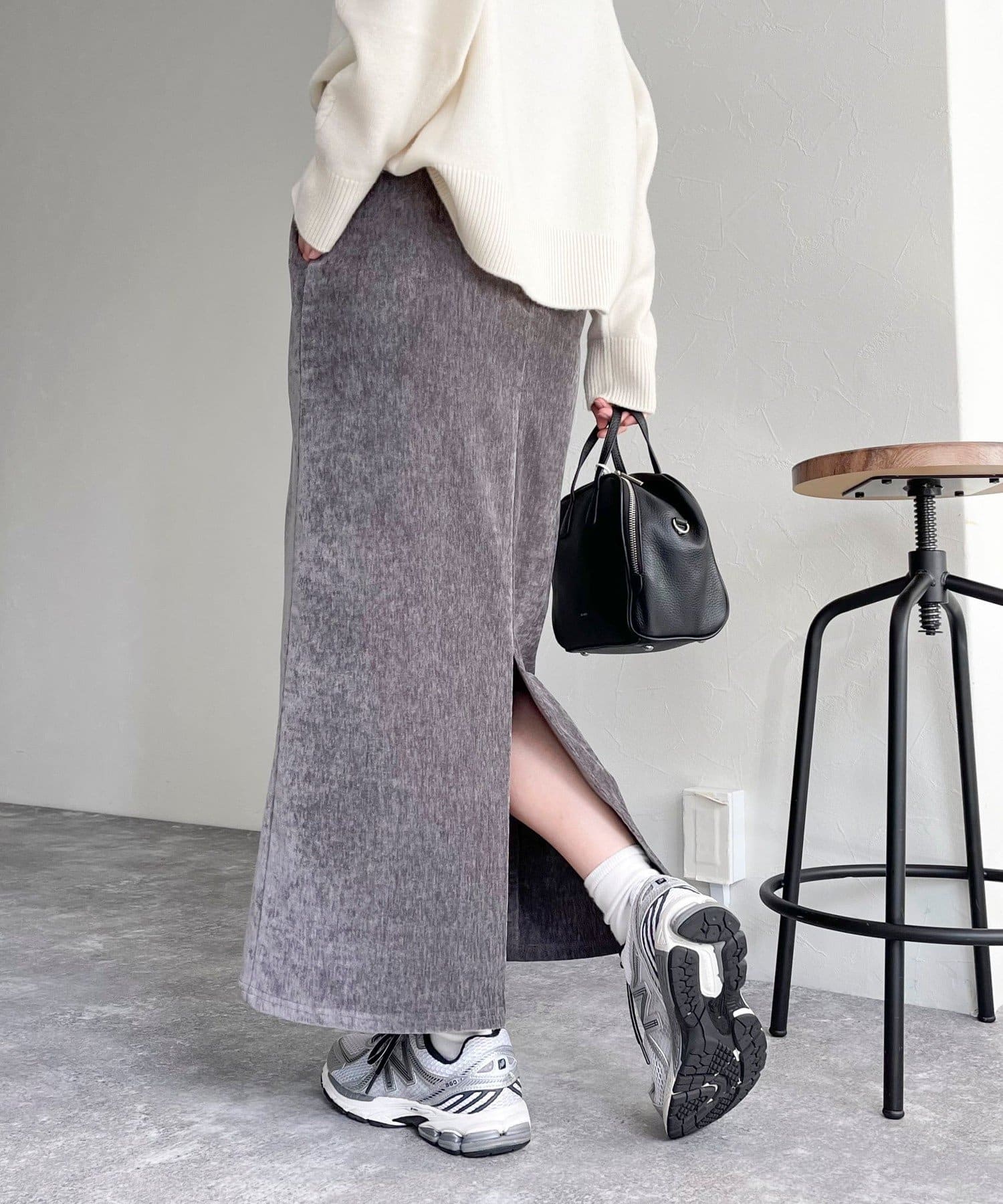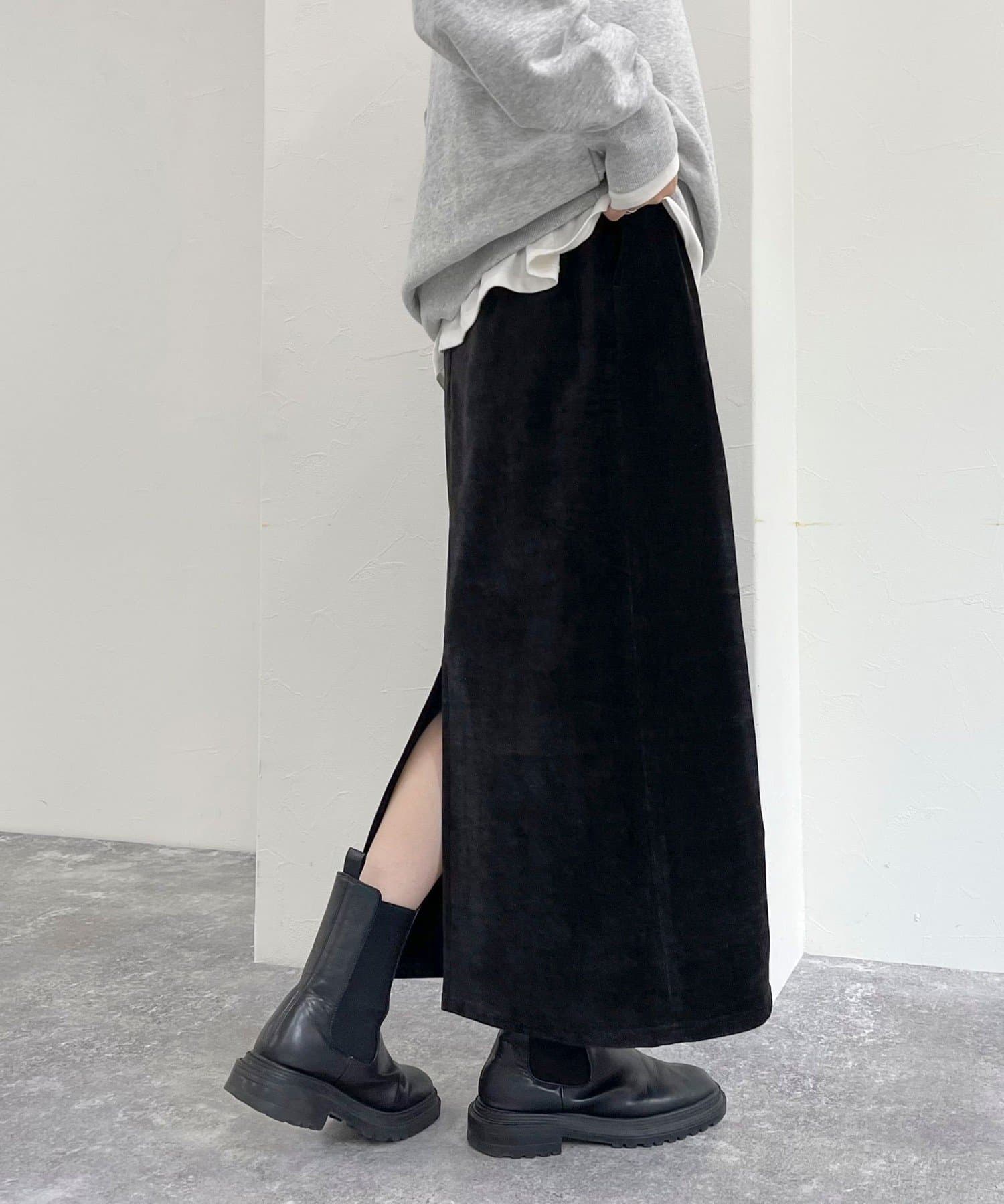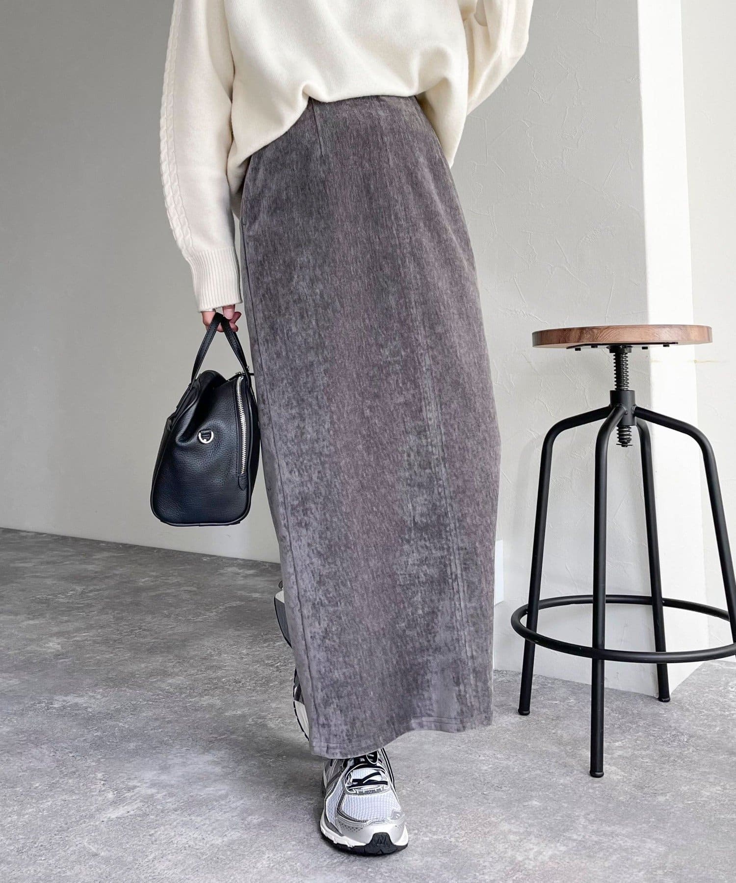 表面感のあるベロア素材がコーデのアクセントになるナロースカート
