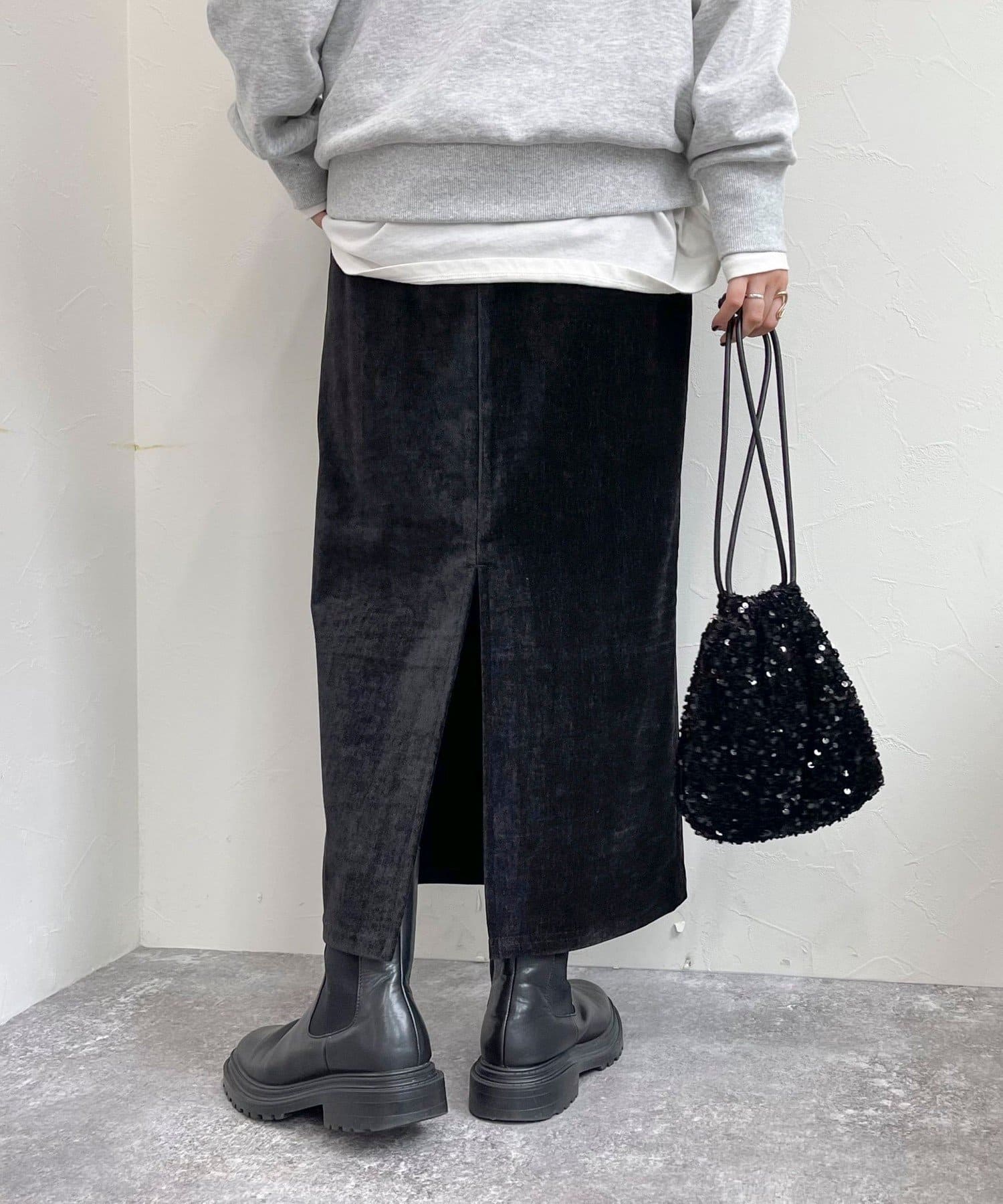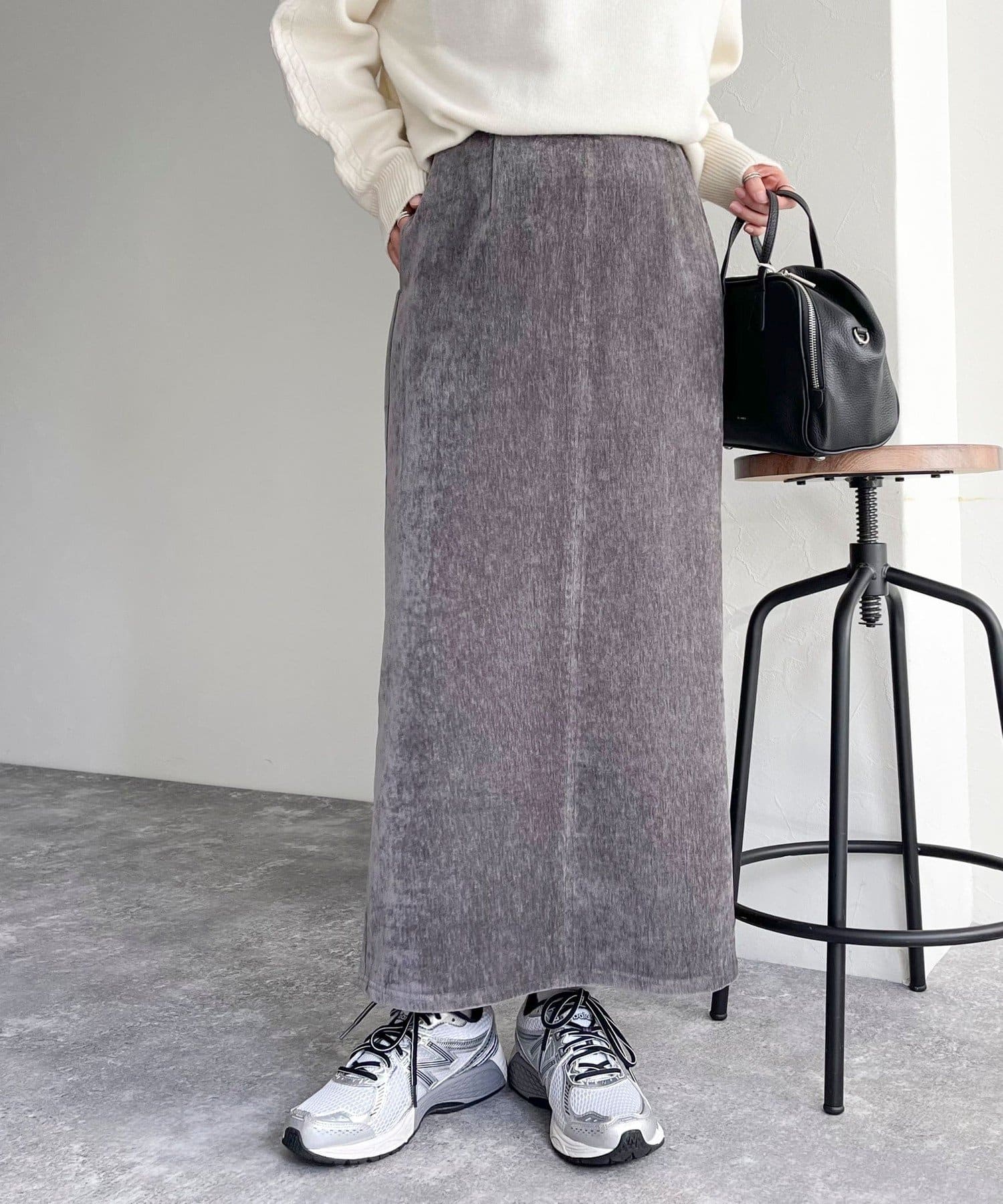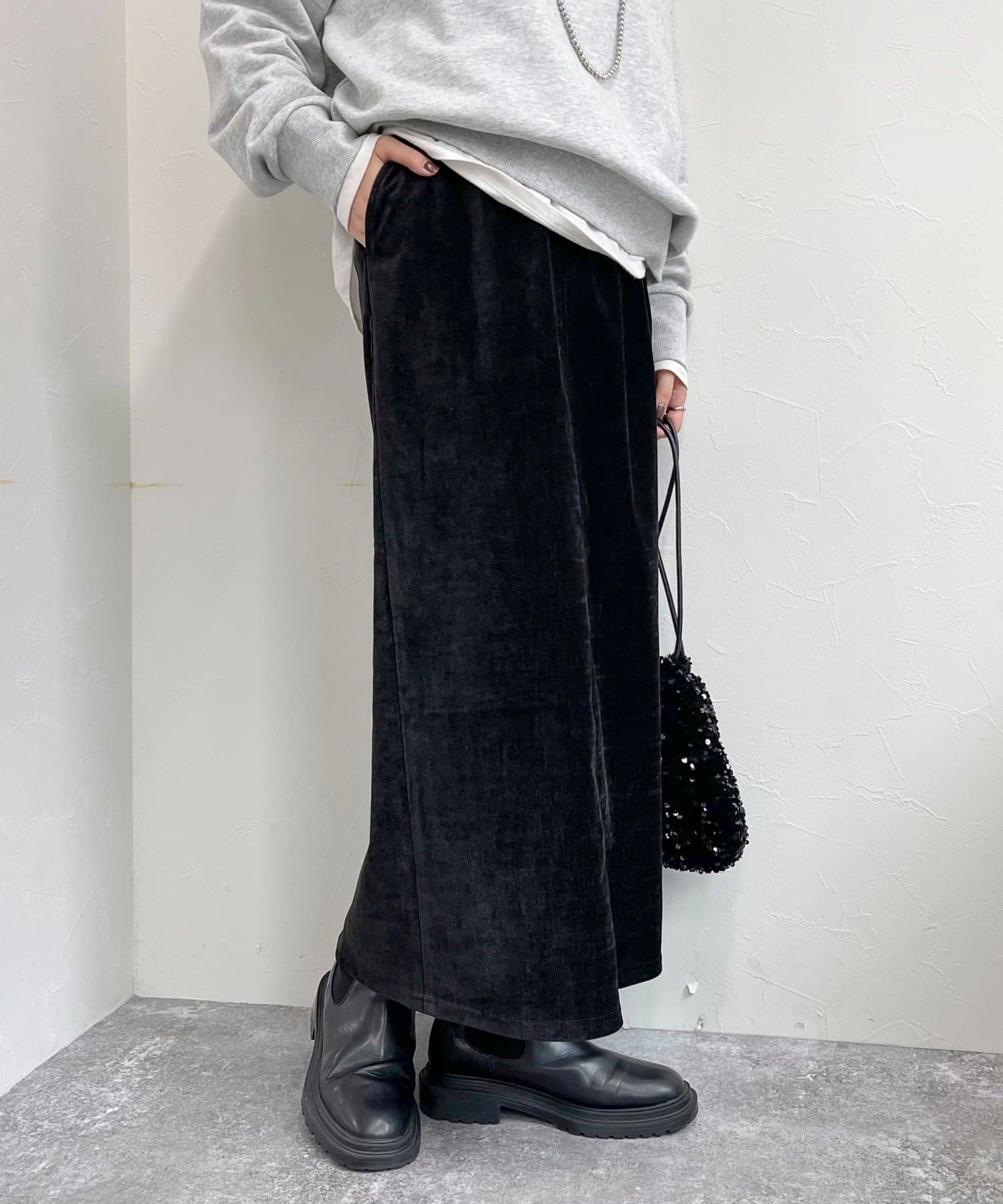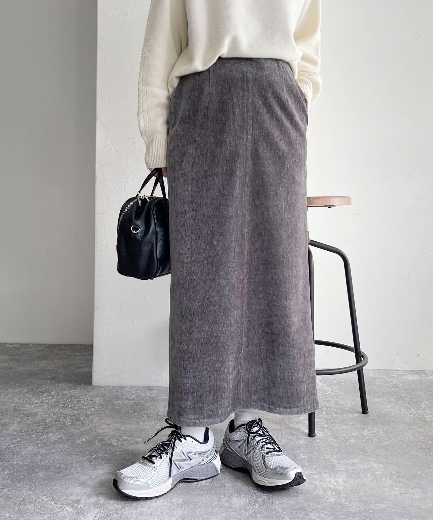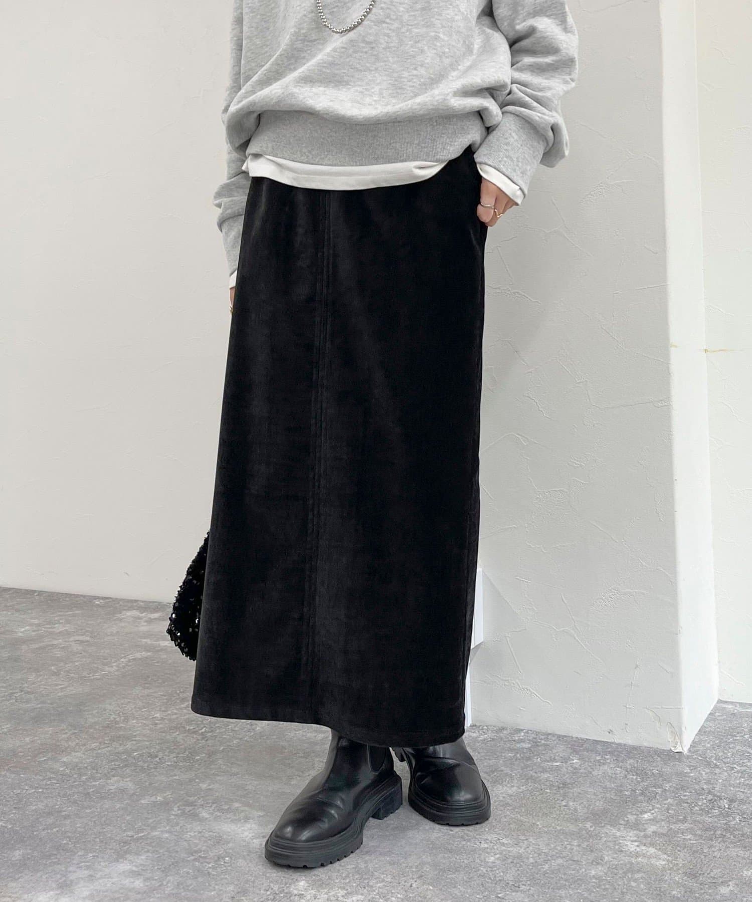 表面感のあるベロア素材がコーデのアクセントになるナロースカート