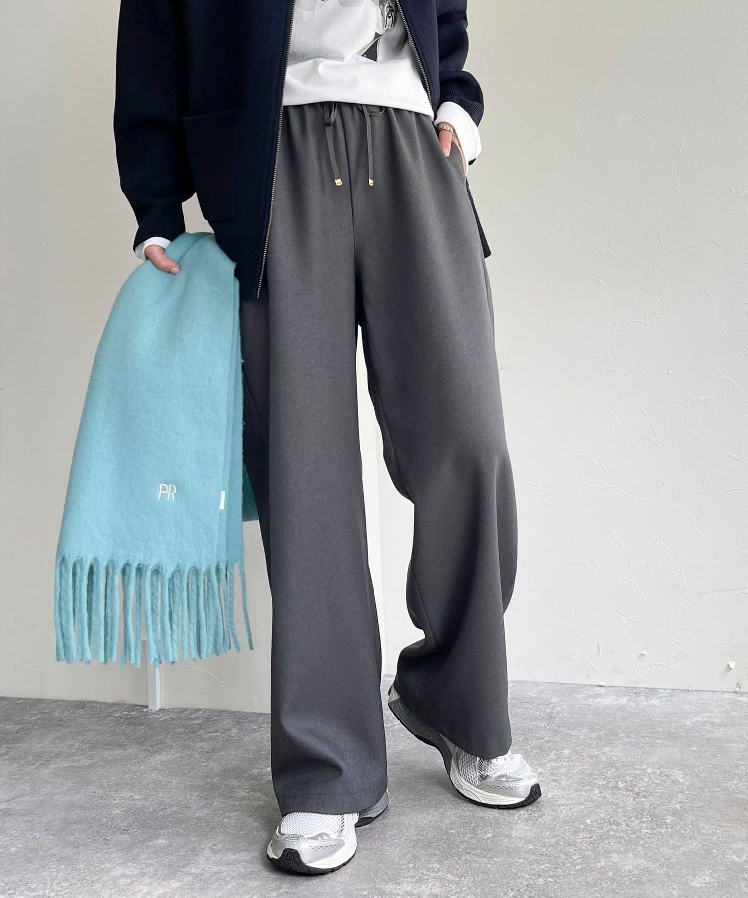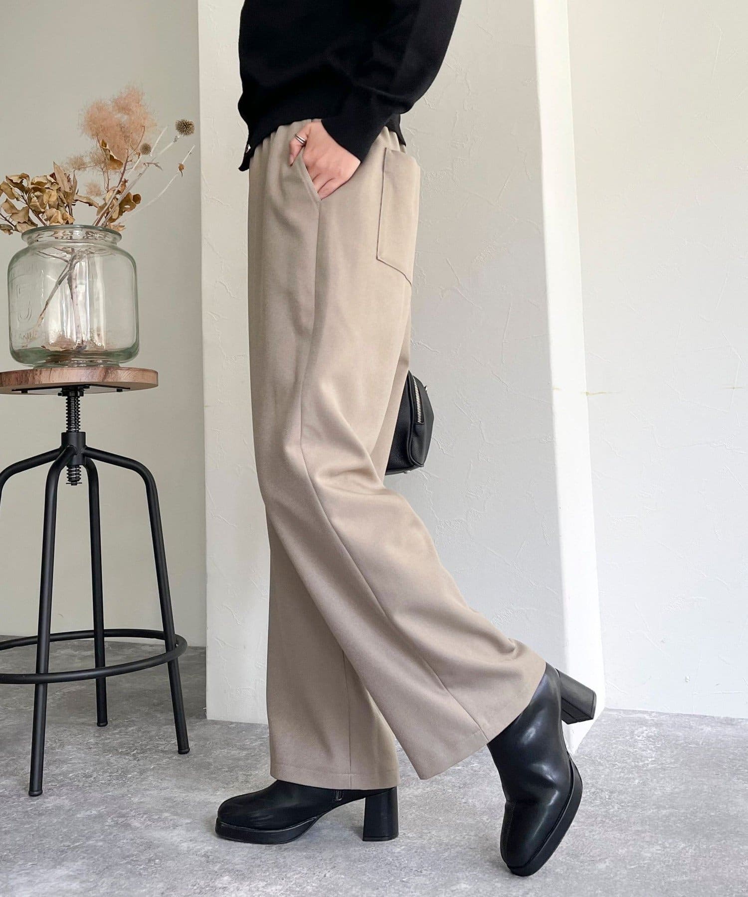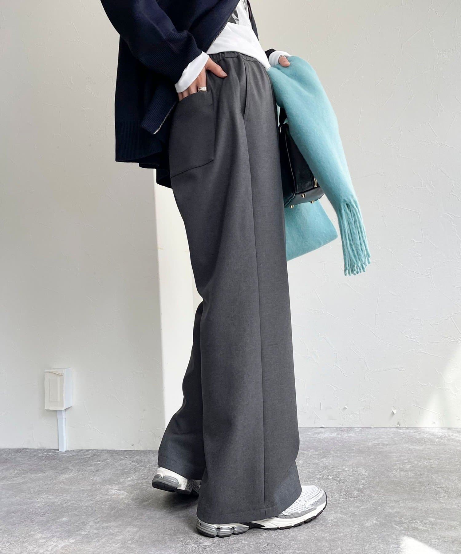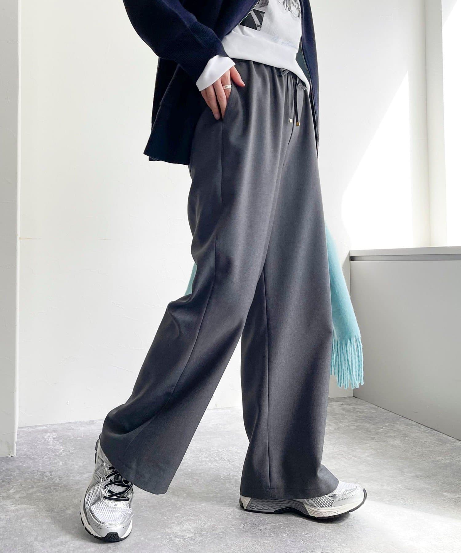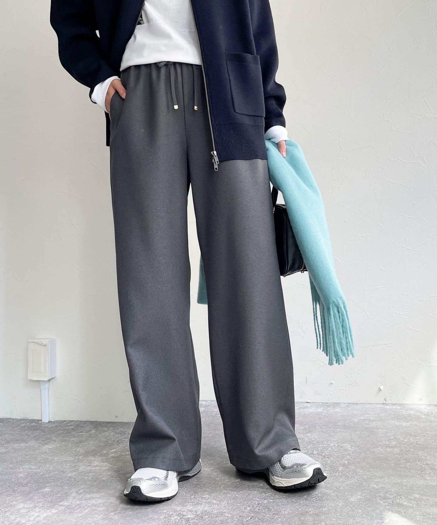 ウエストゴムだけどきれいなストレートラインが出るし、動きやすい。生地がいいからカジュアルすぎずに使えます❕