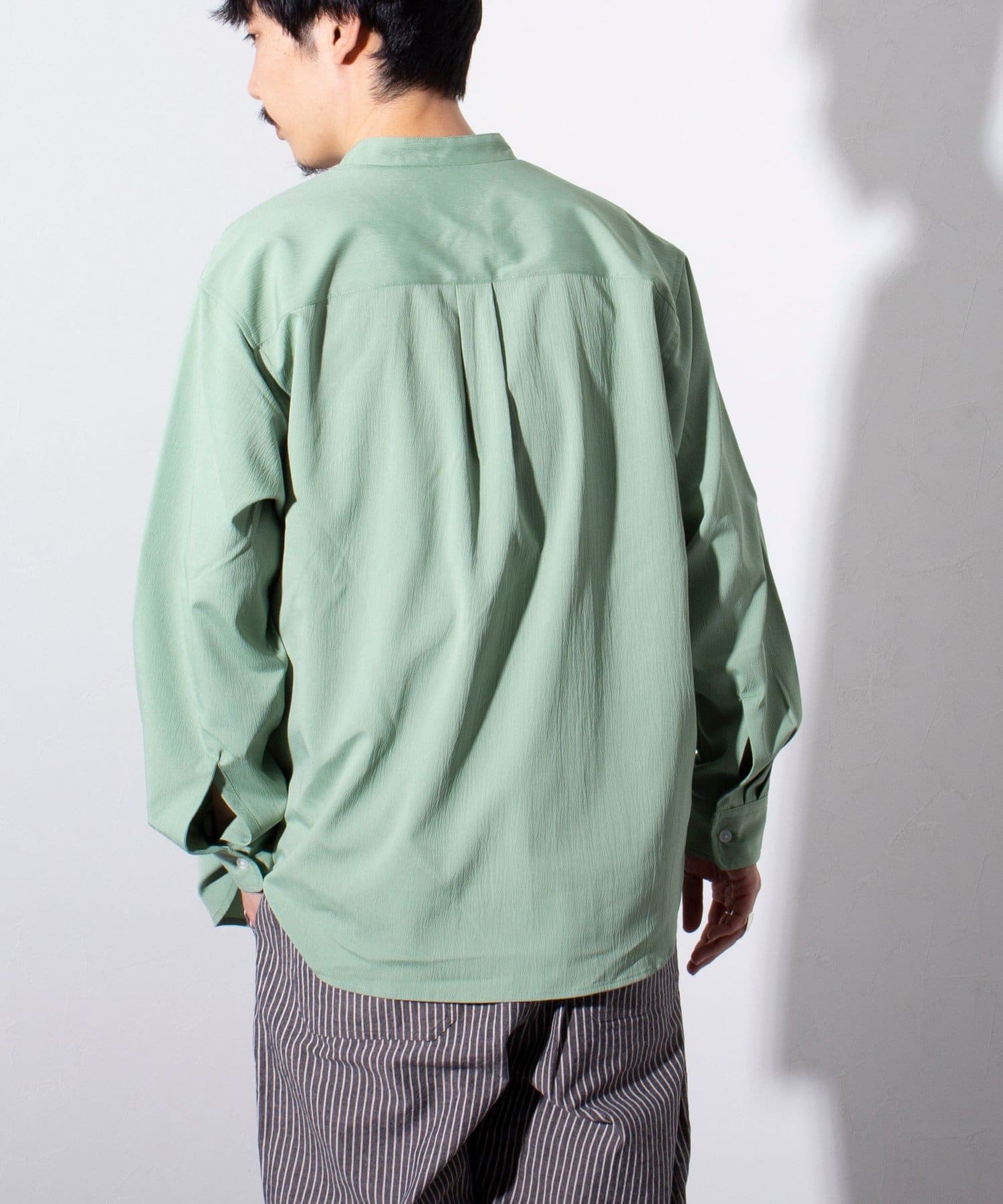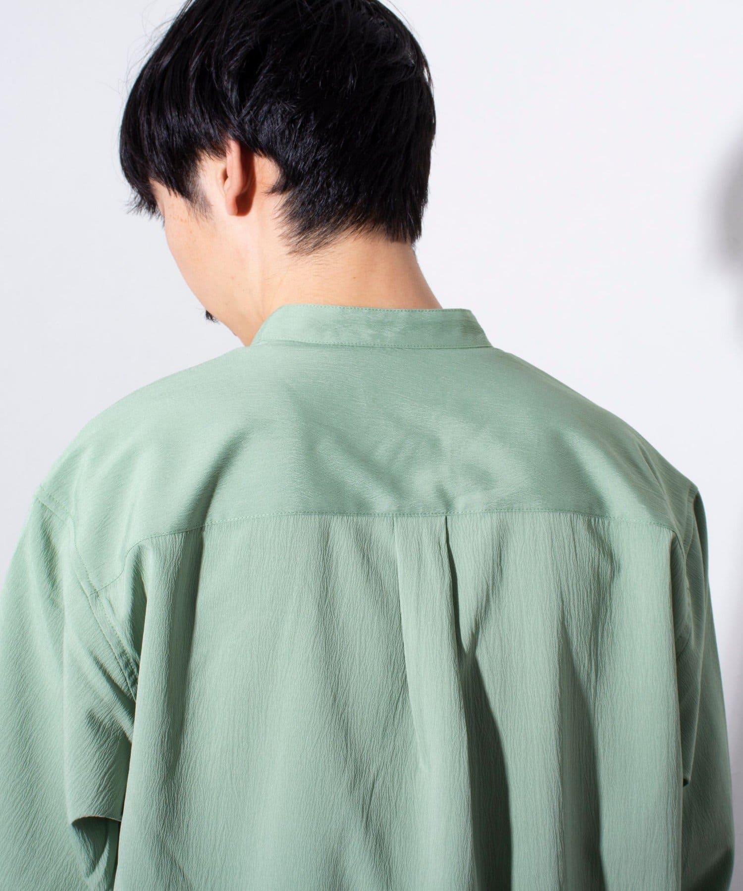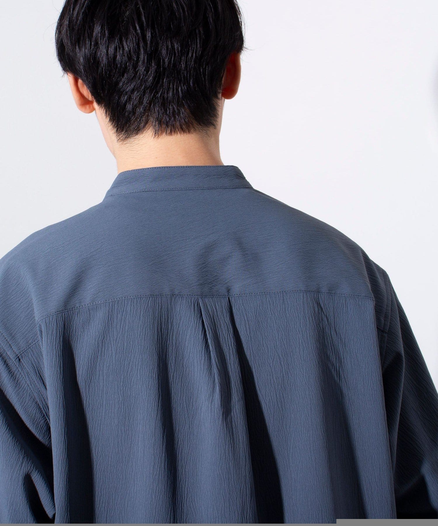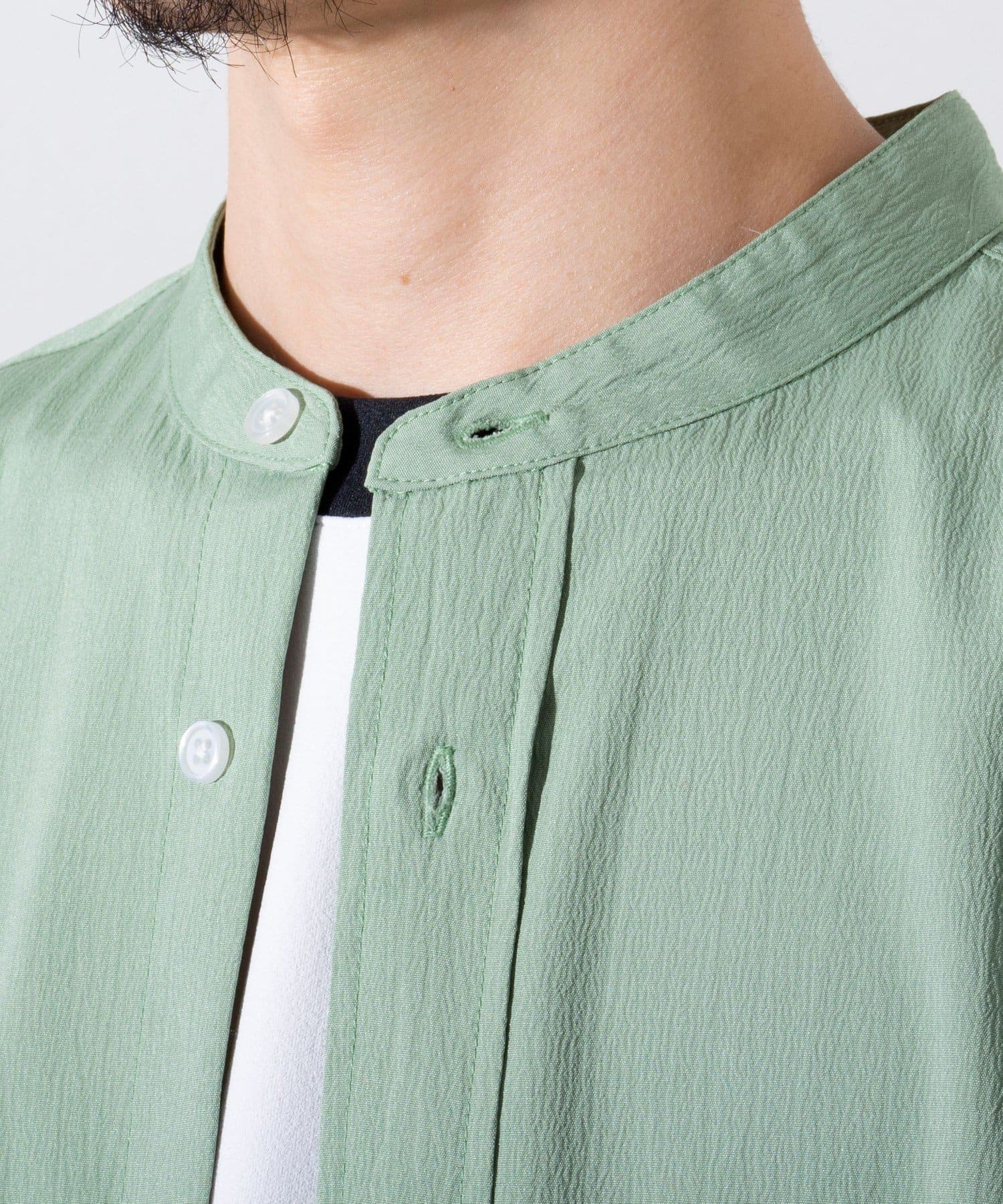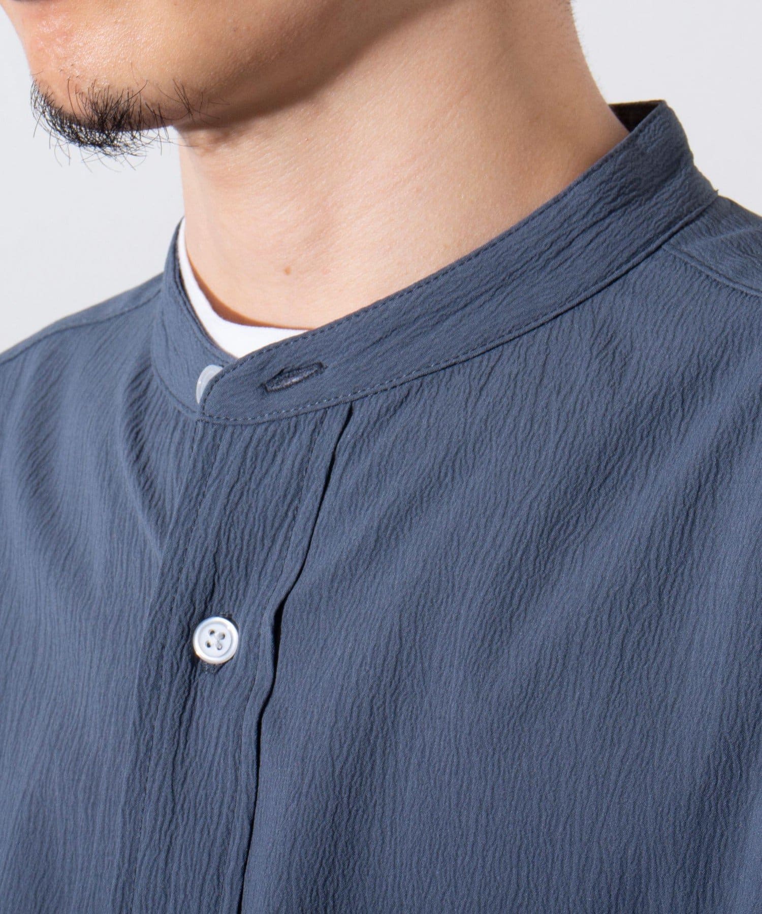 清涼感のある楊柳ワッシャー素材のバンドカラーシャツ。