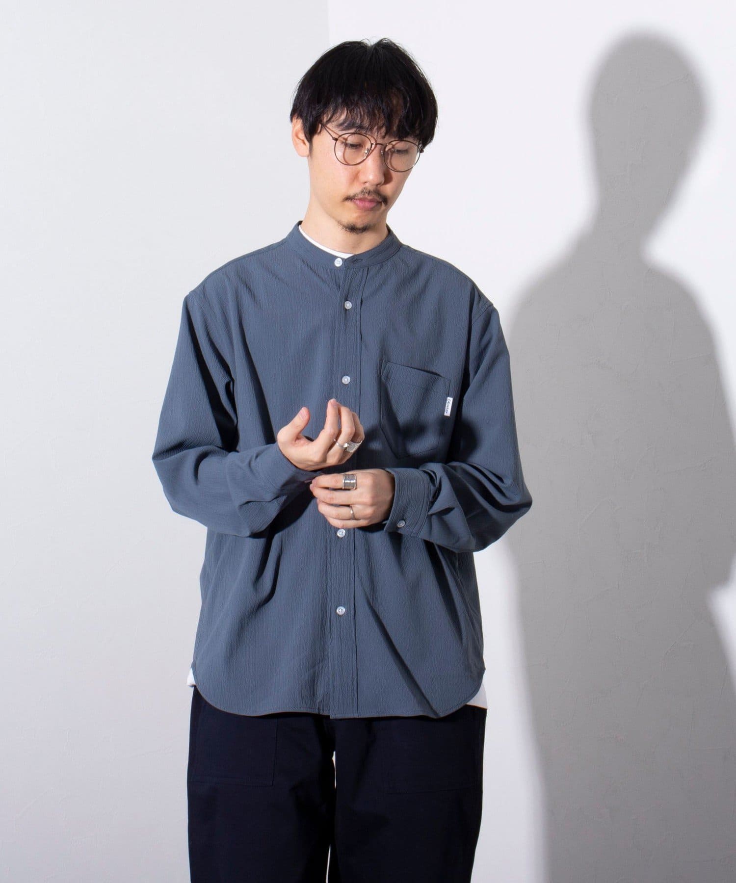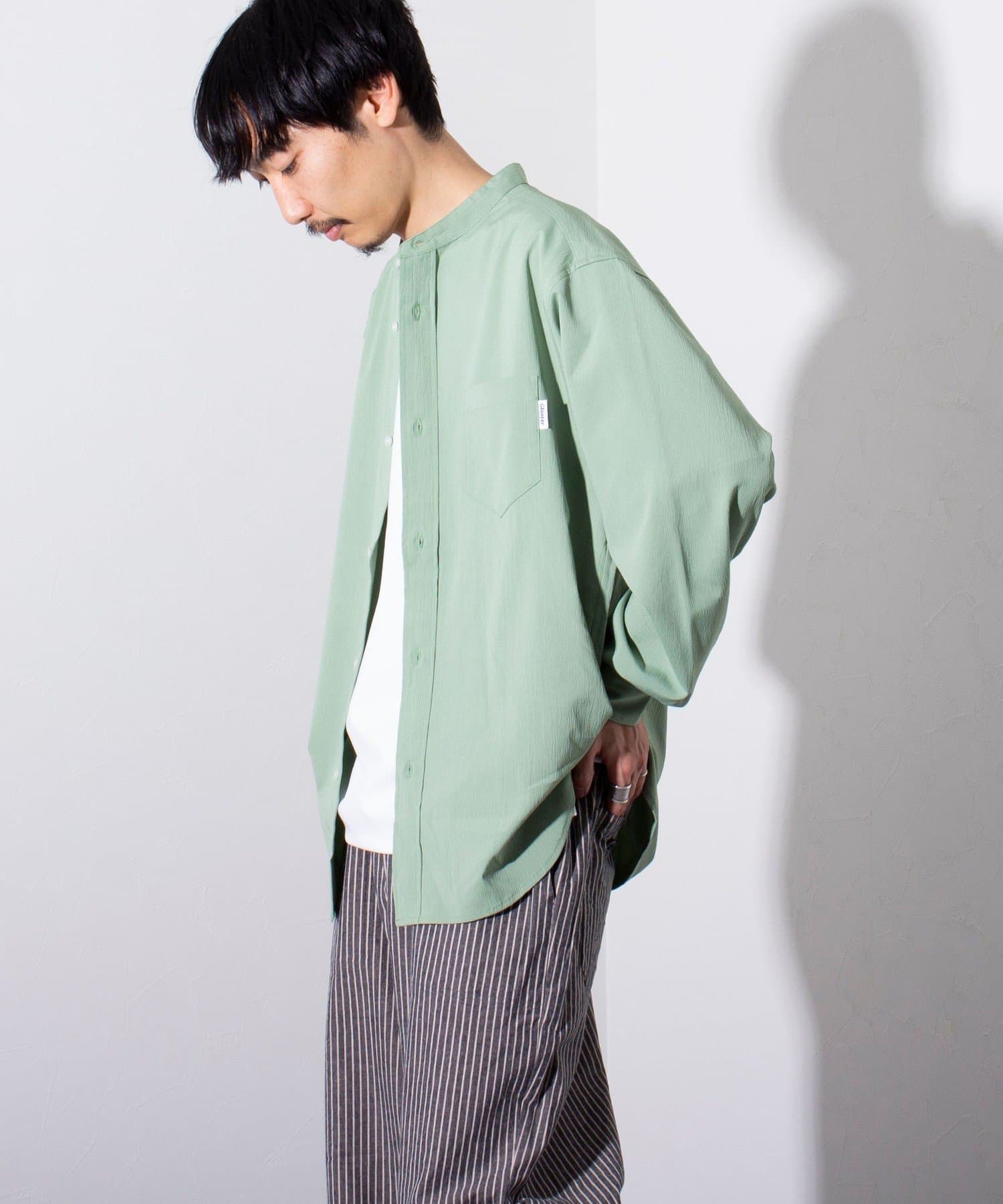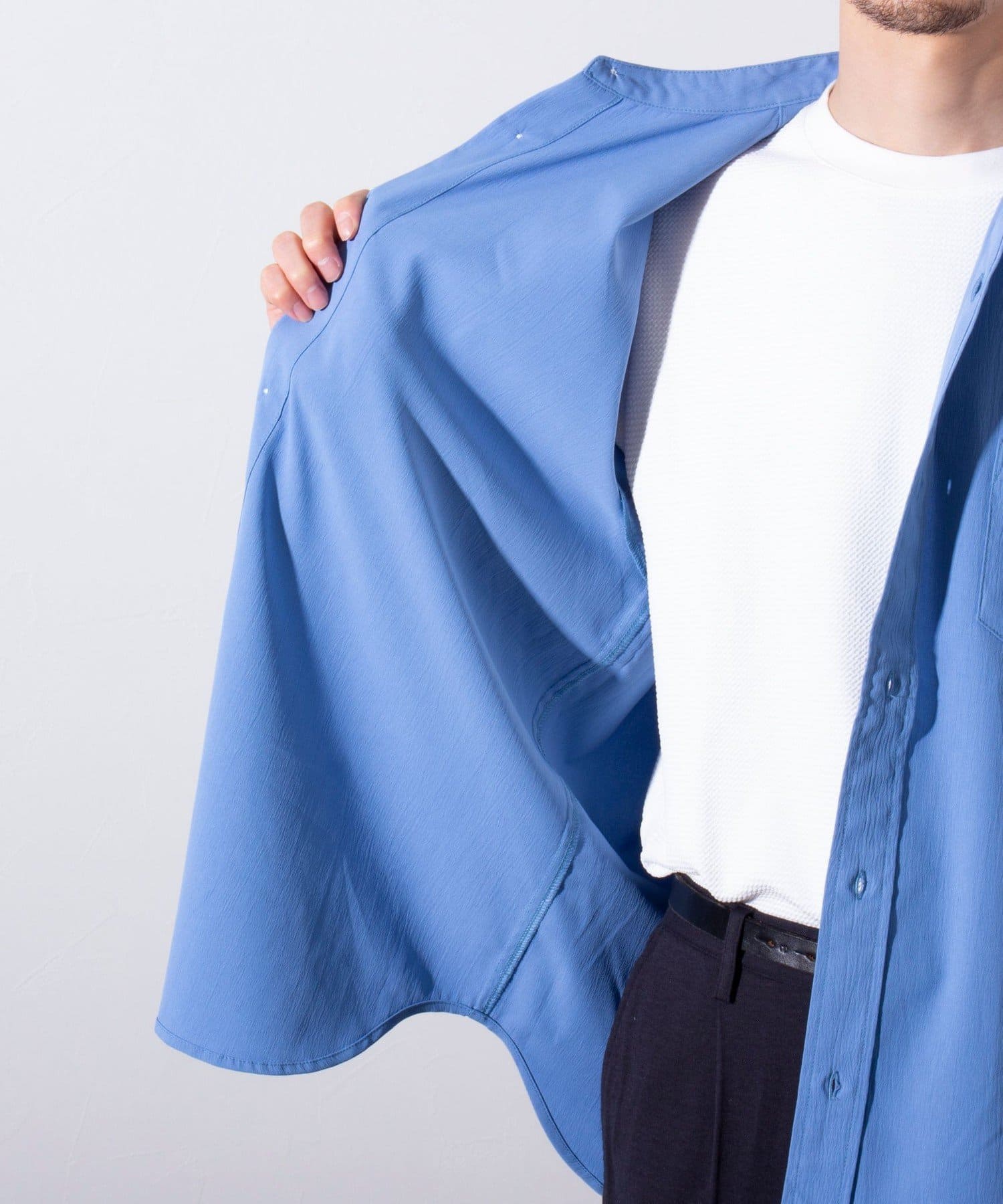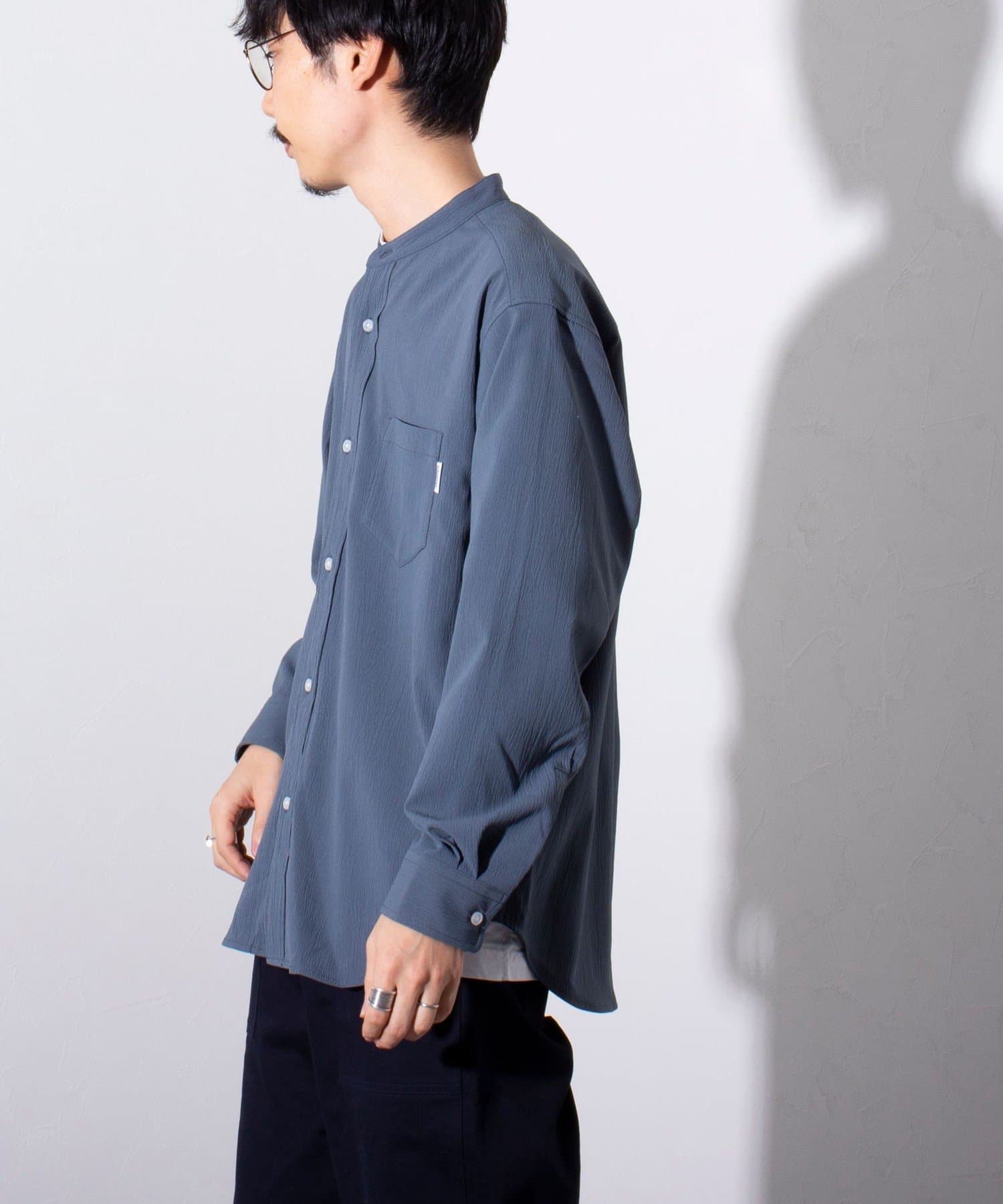 清涼感のある楊柳ワッシャー素材のバンドカラーシャツ。