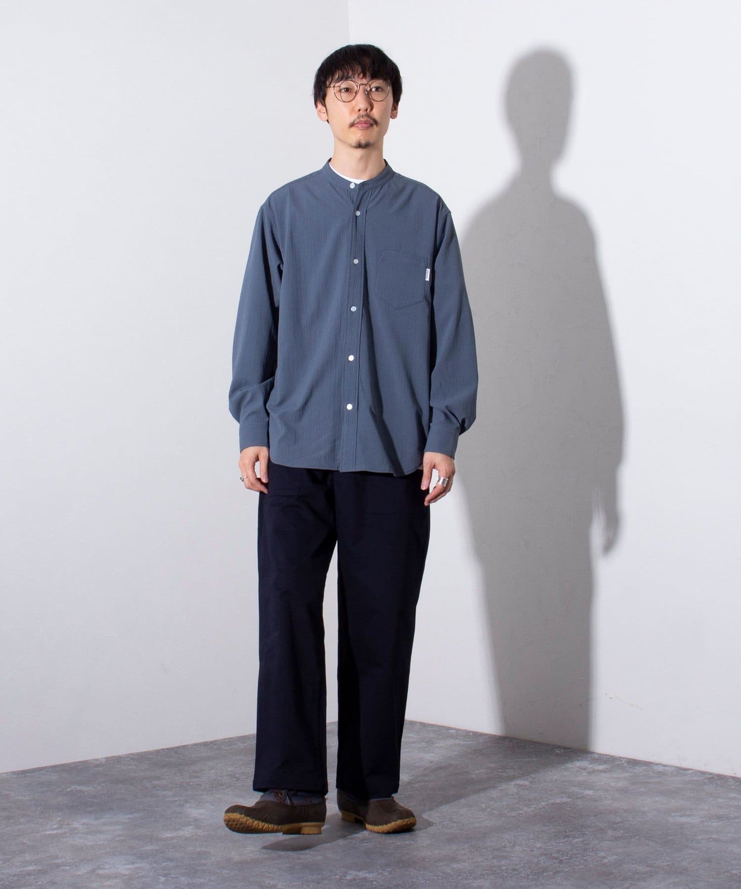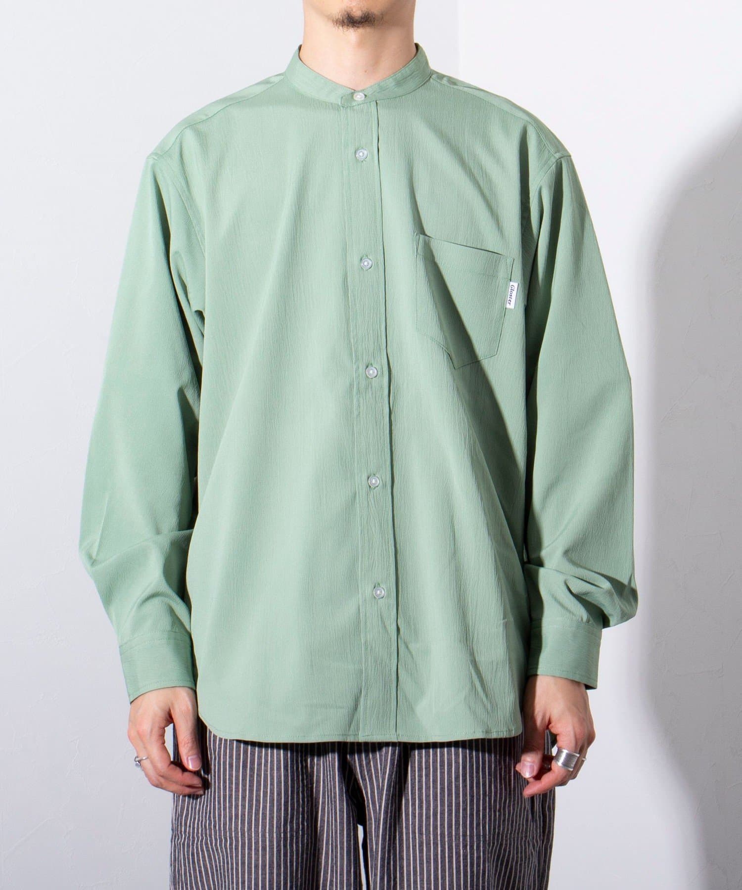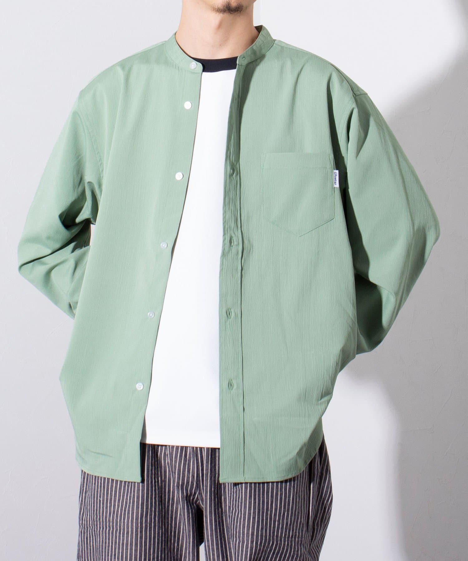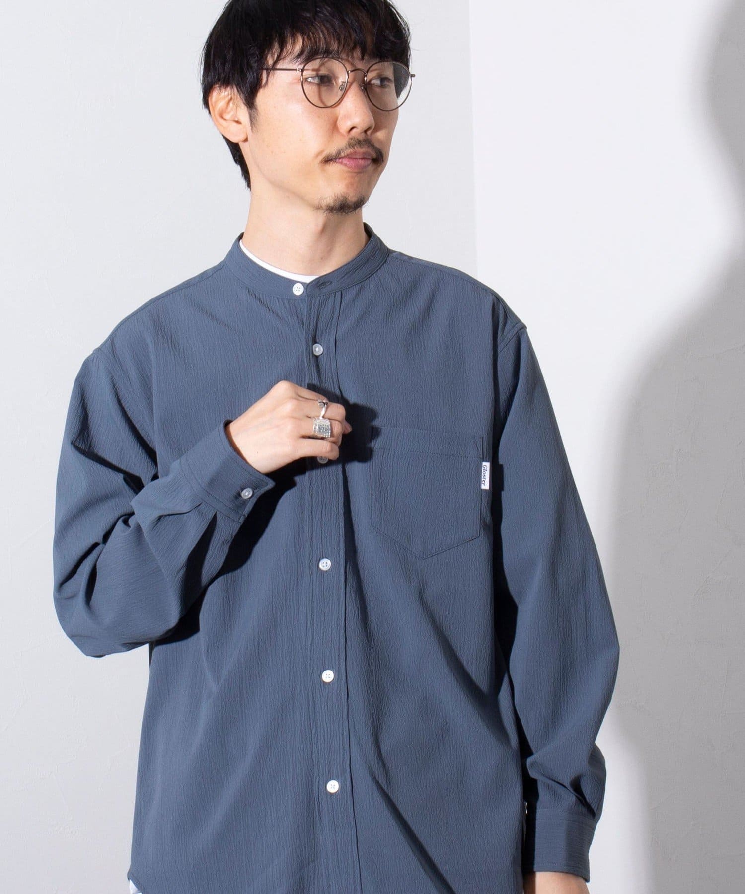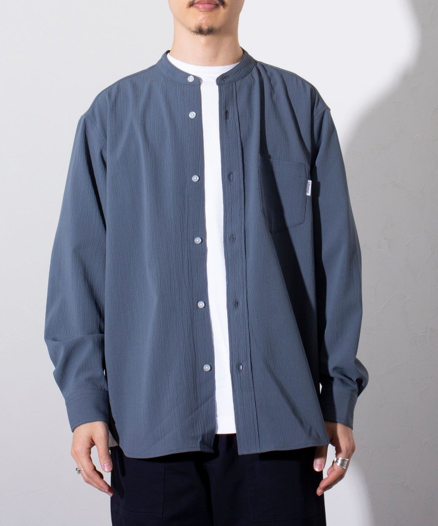 清涼感のある楊柳ワッシャー素材のバンドカラーシャツ。
