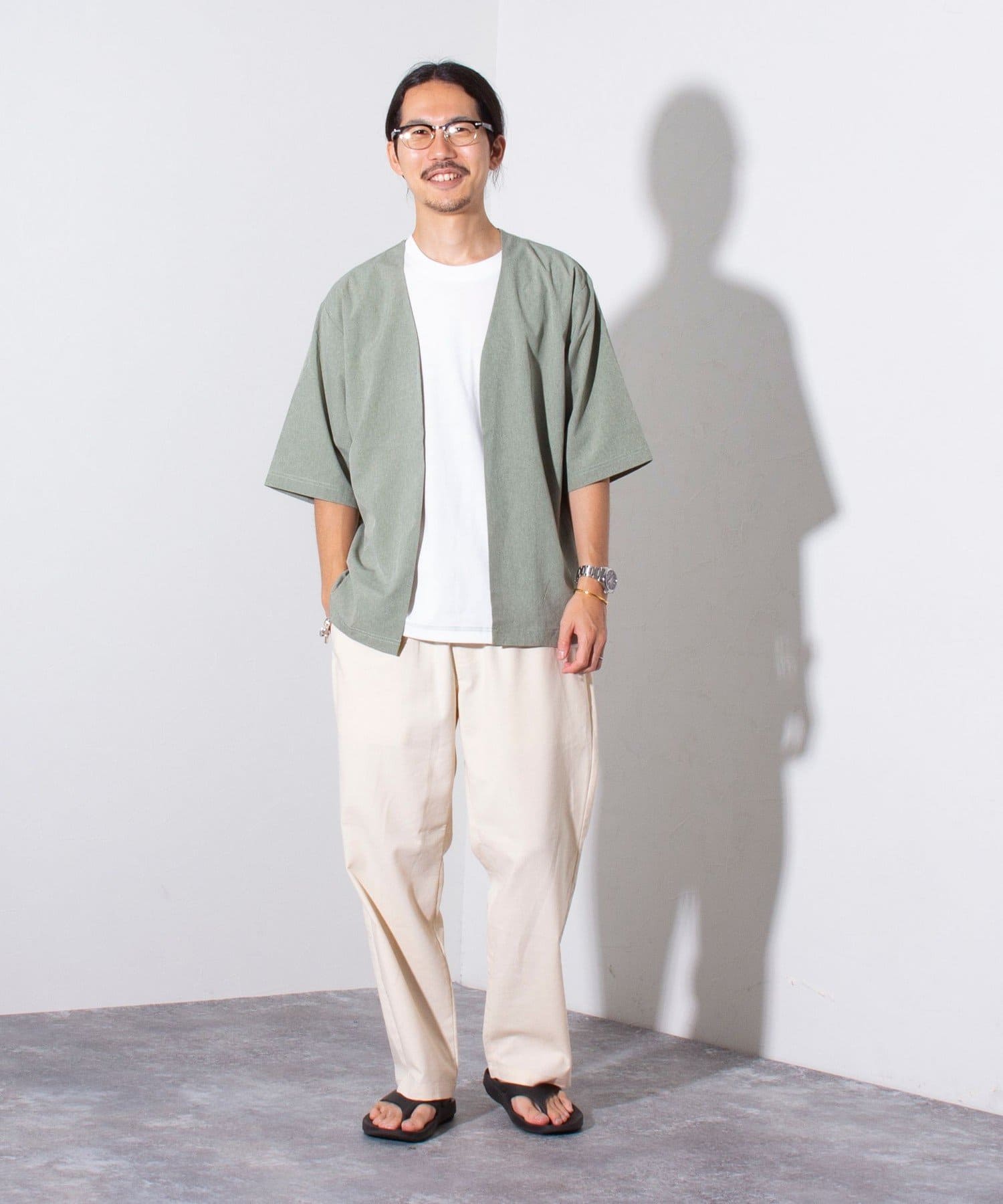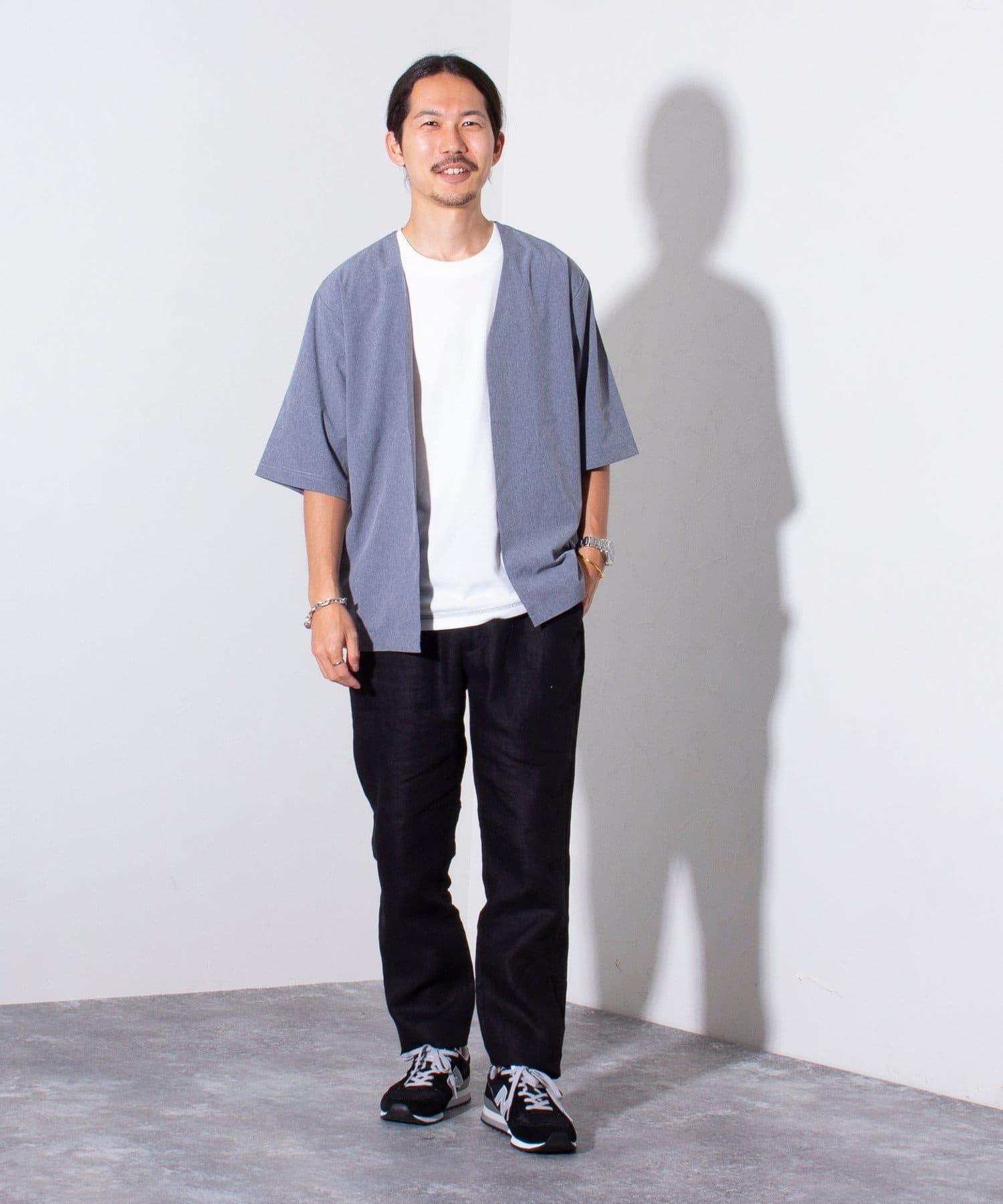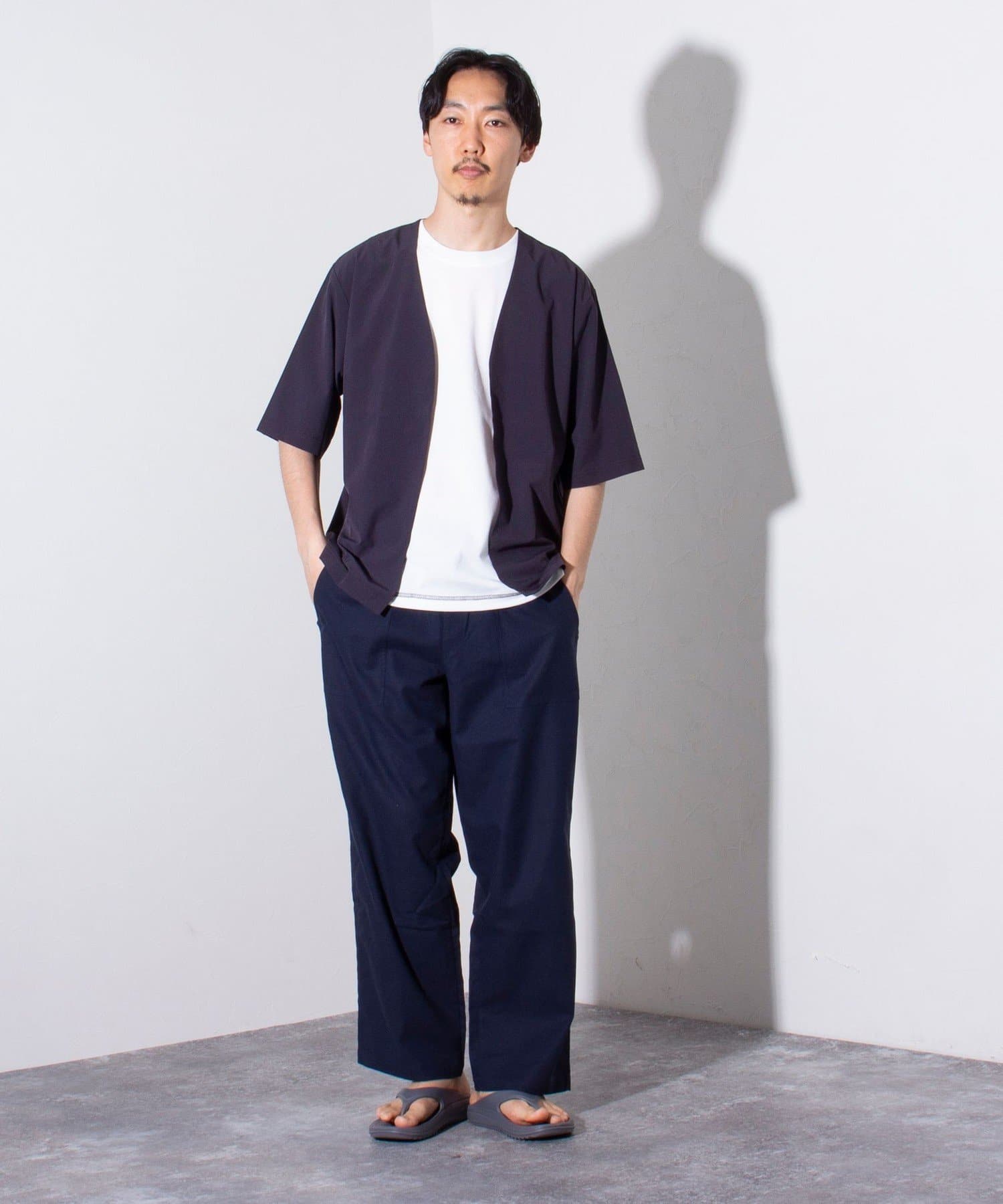 細身のパンツとも合いますが、トレンドのワイドパンツにスニーカーや革靴、リカバリーサンダルの合わせもおすすめです。