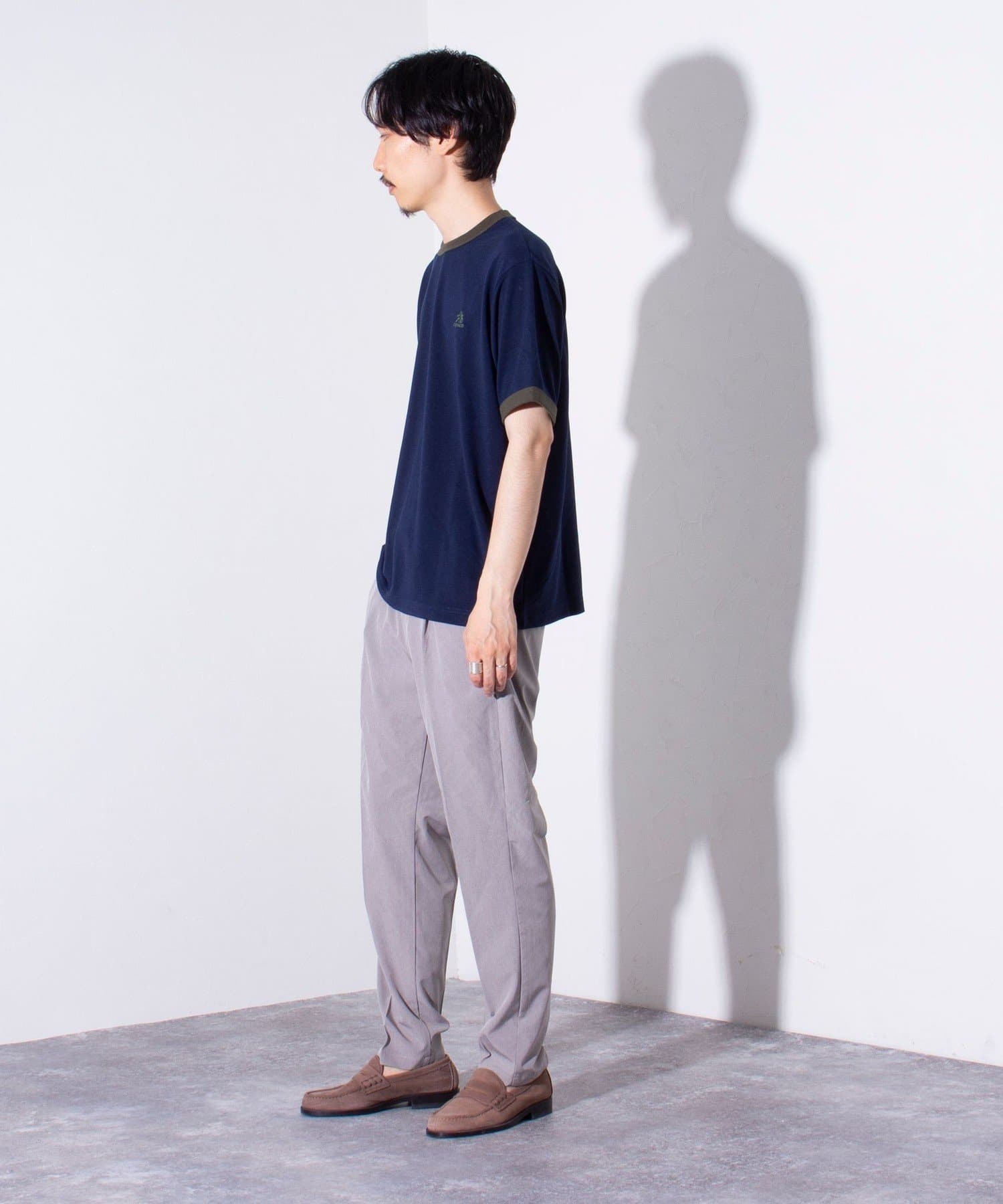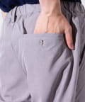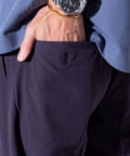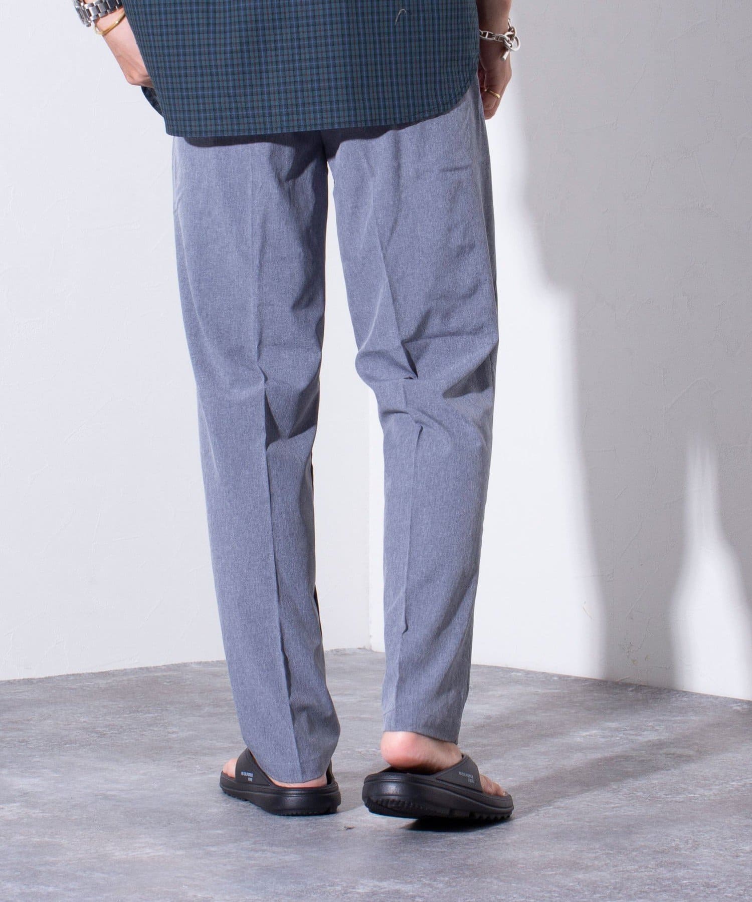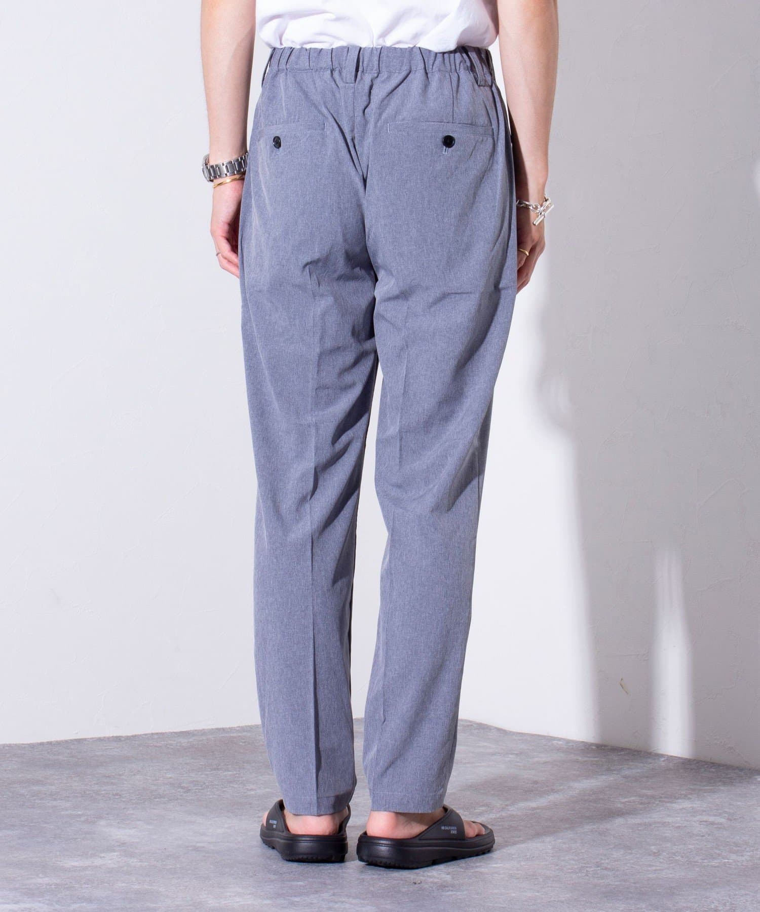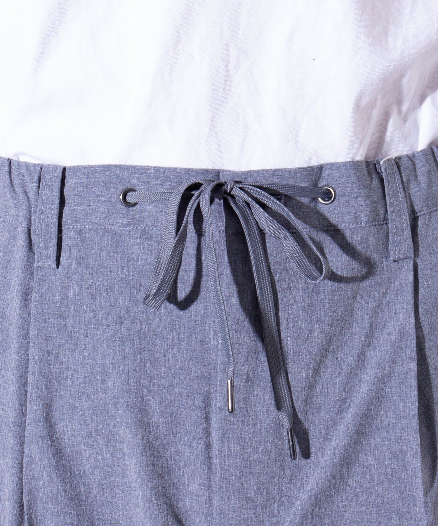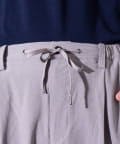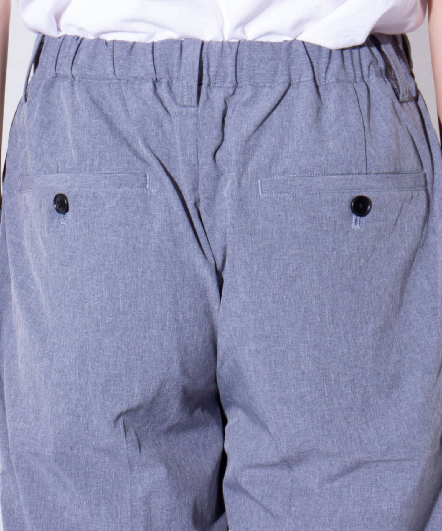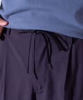 ウエストにはゴム、ベルトループをそれぞれ採用し、イージーパンツの様なリラックスした着用からベルトを使ったトップスインの着こなしまで、幅広く対応可能。