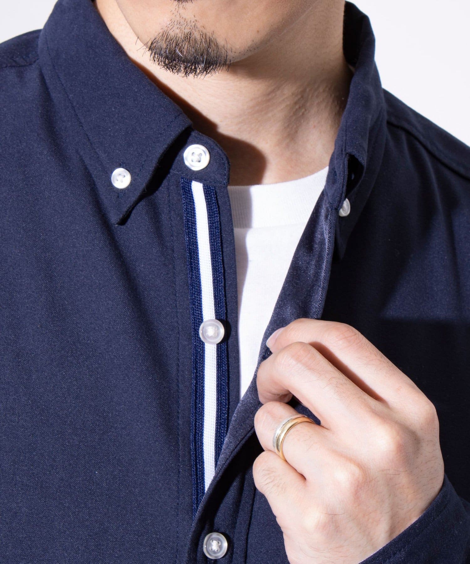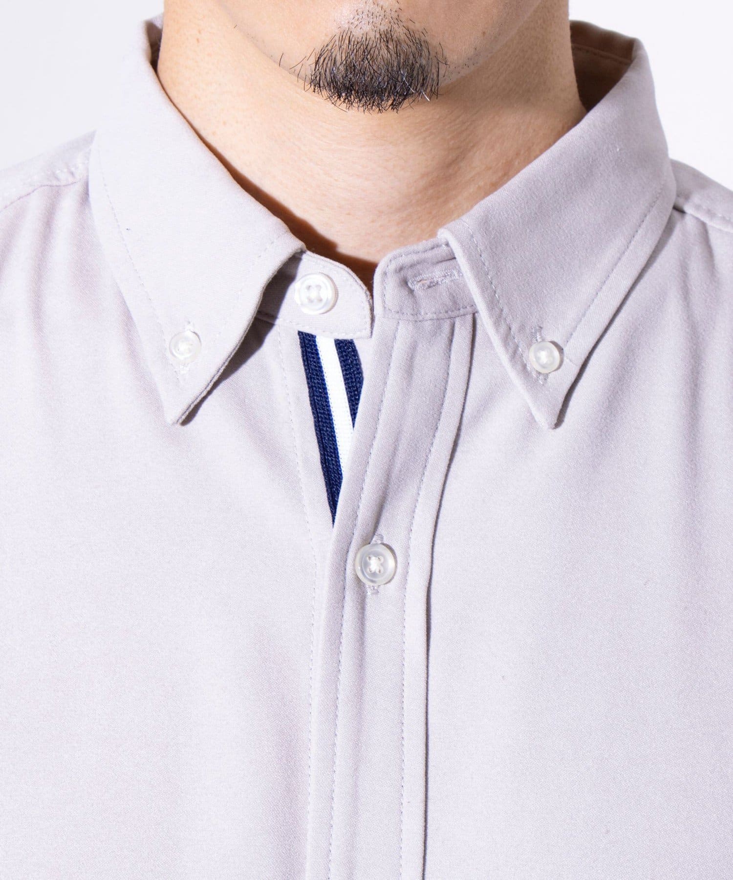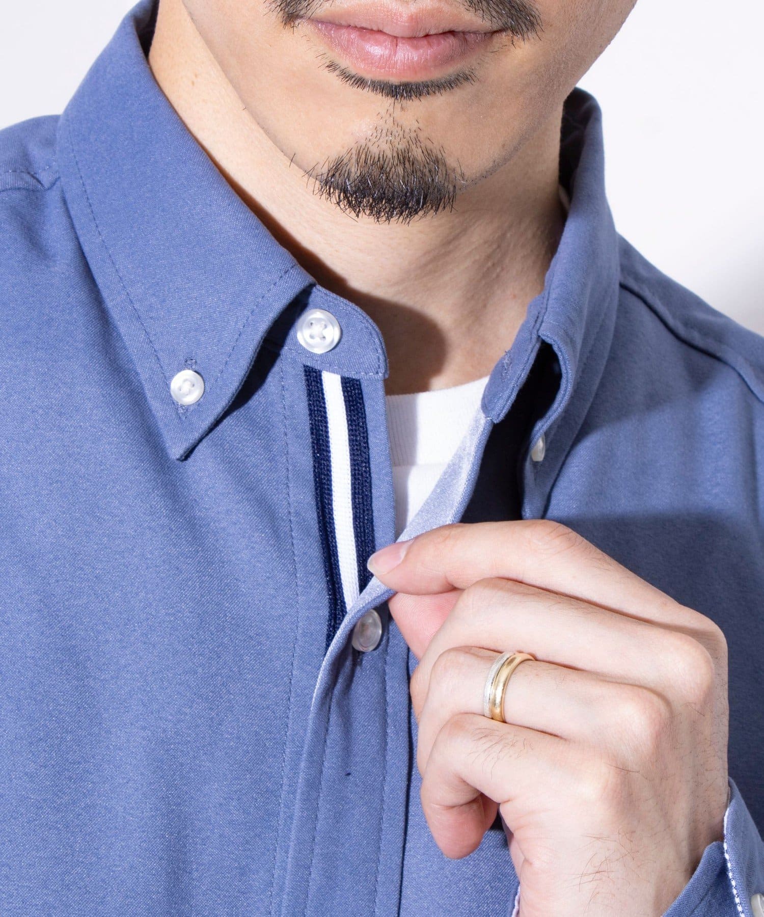 下前立てに施されたトリコカラーのニットテープを見せることでノーネクタイでも様になり、オフィスカジュアルなどにオススメです。