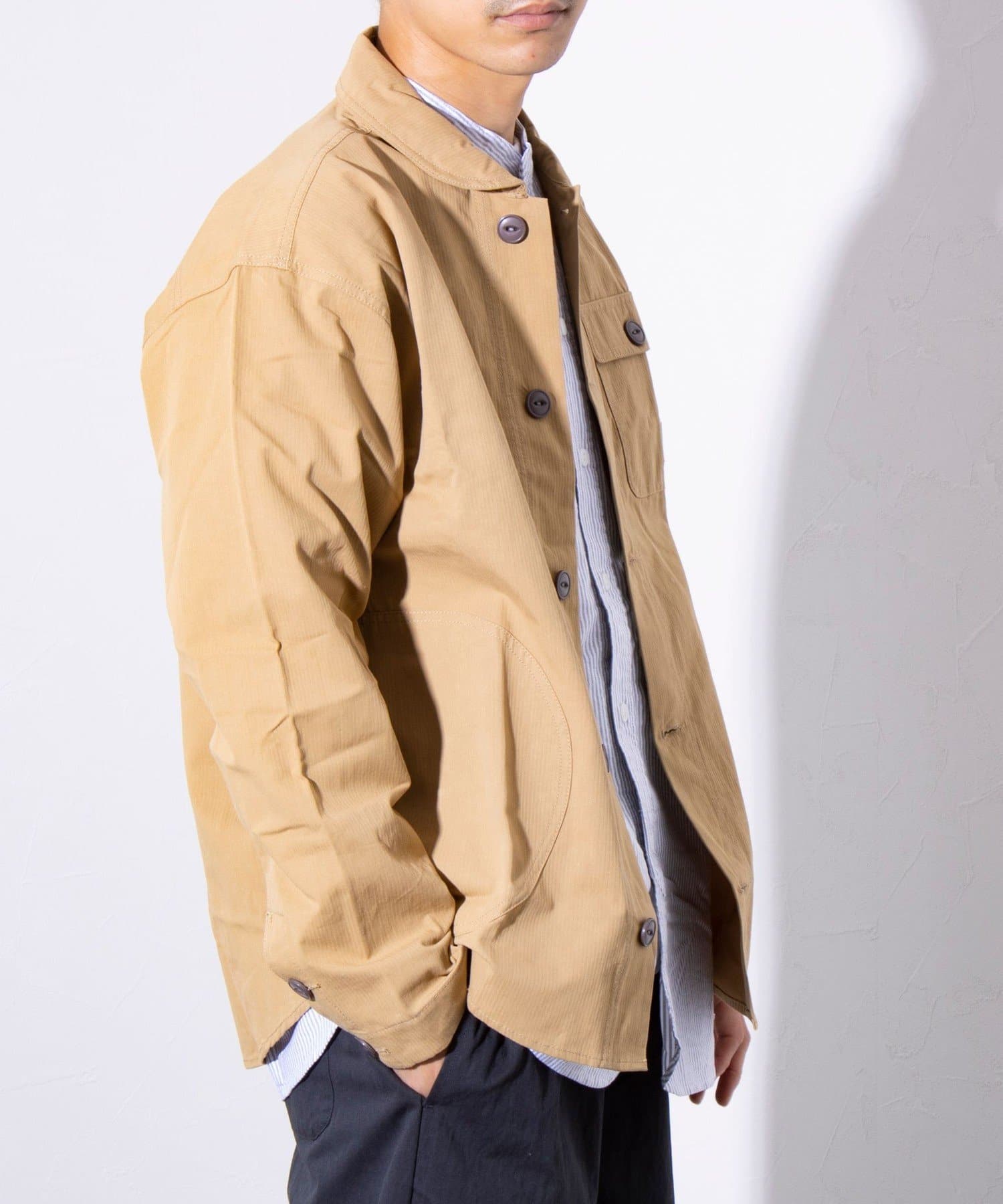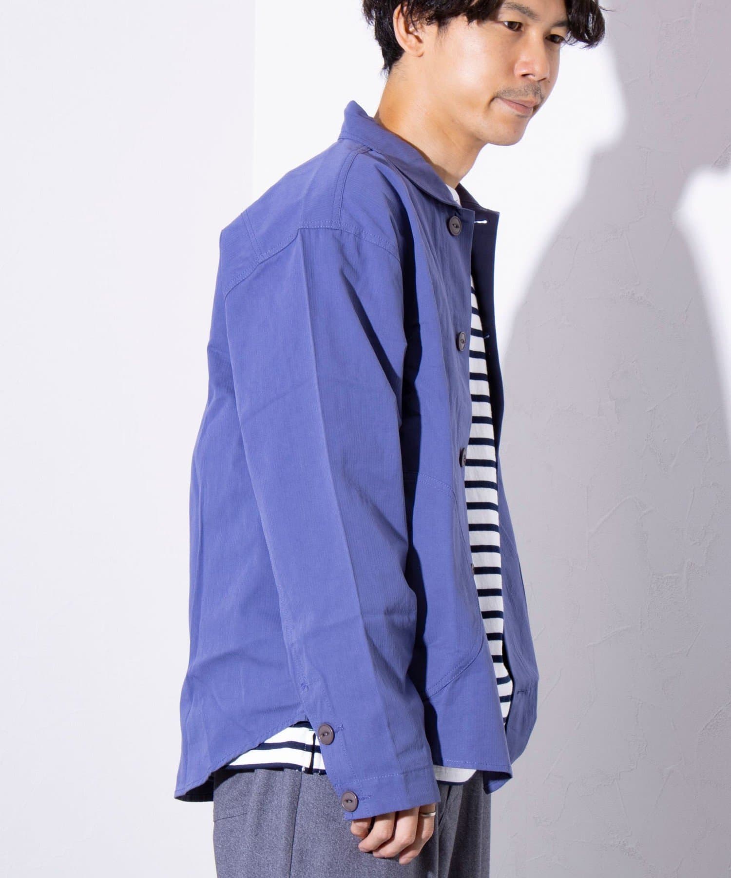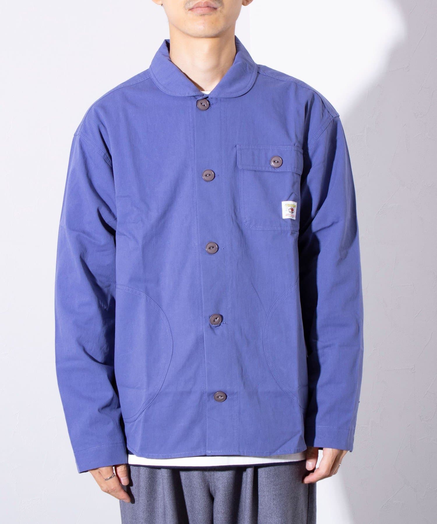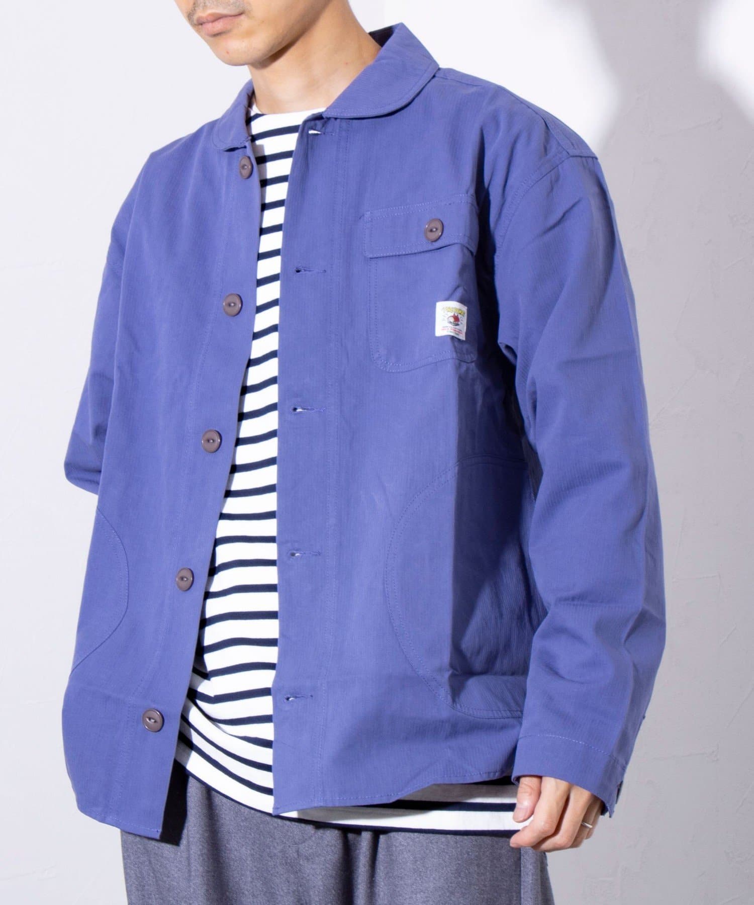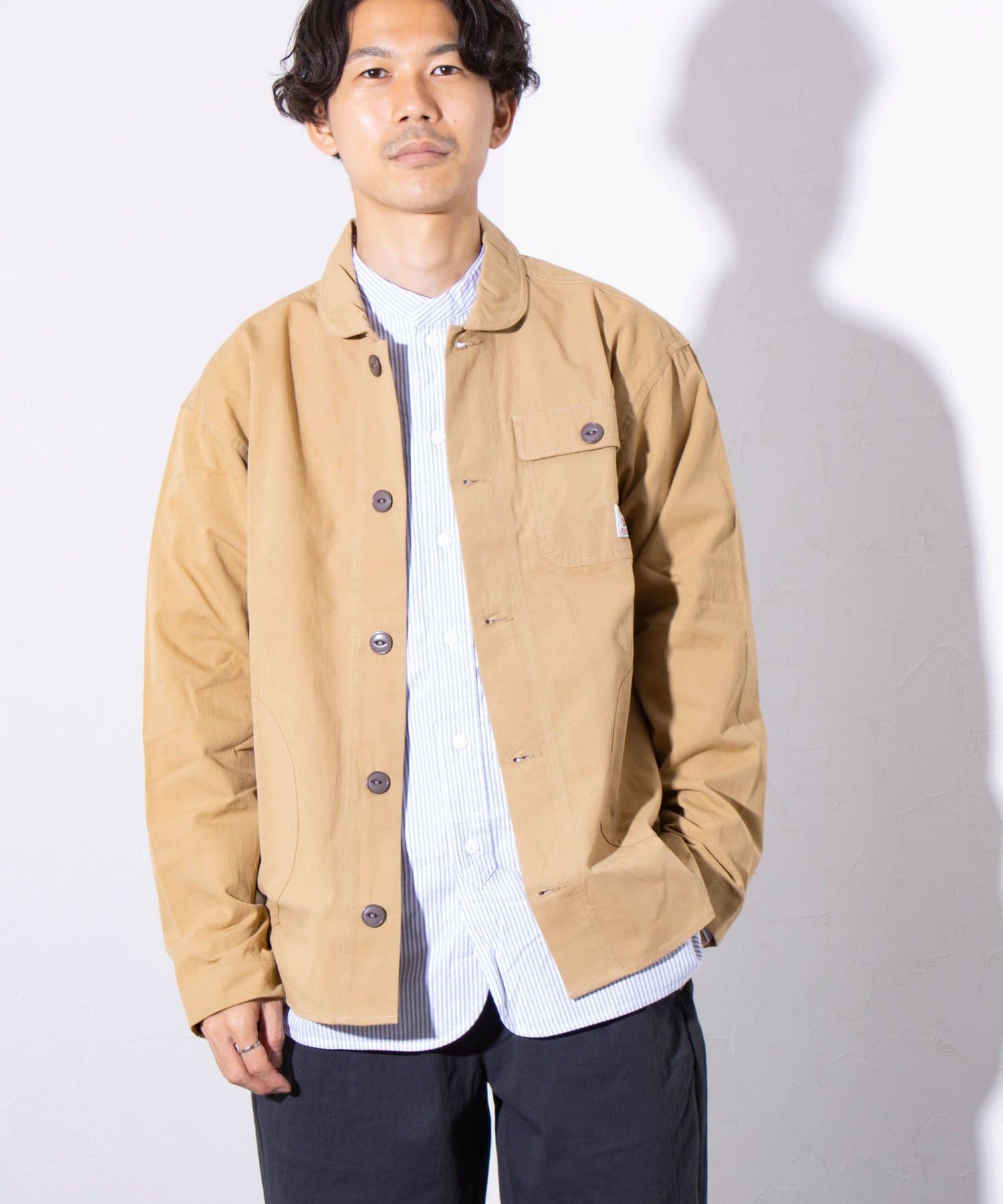 さっと羽織るだけでサマになる秋の羽織りとして丁度良い丸襟カバーオールシャツ。