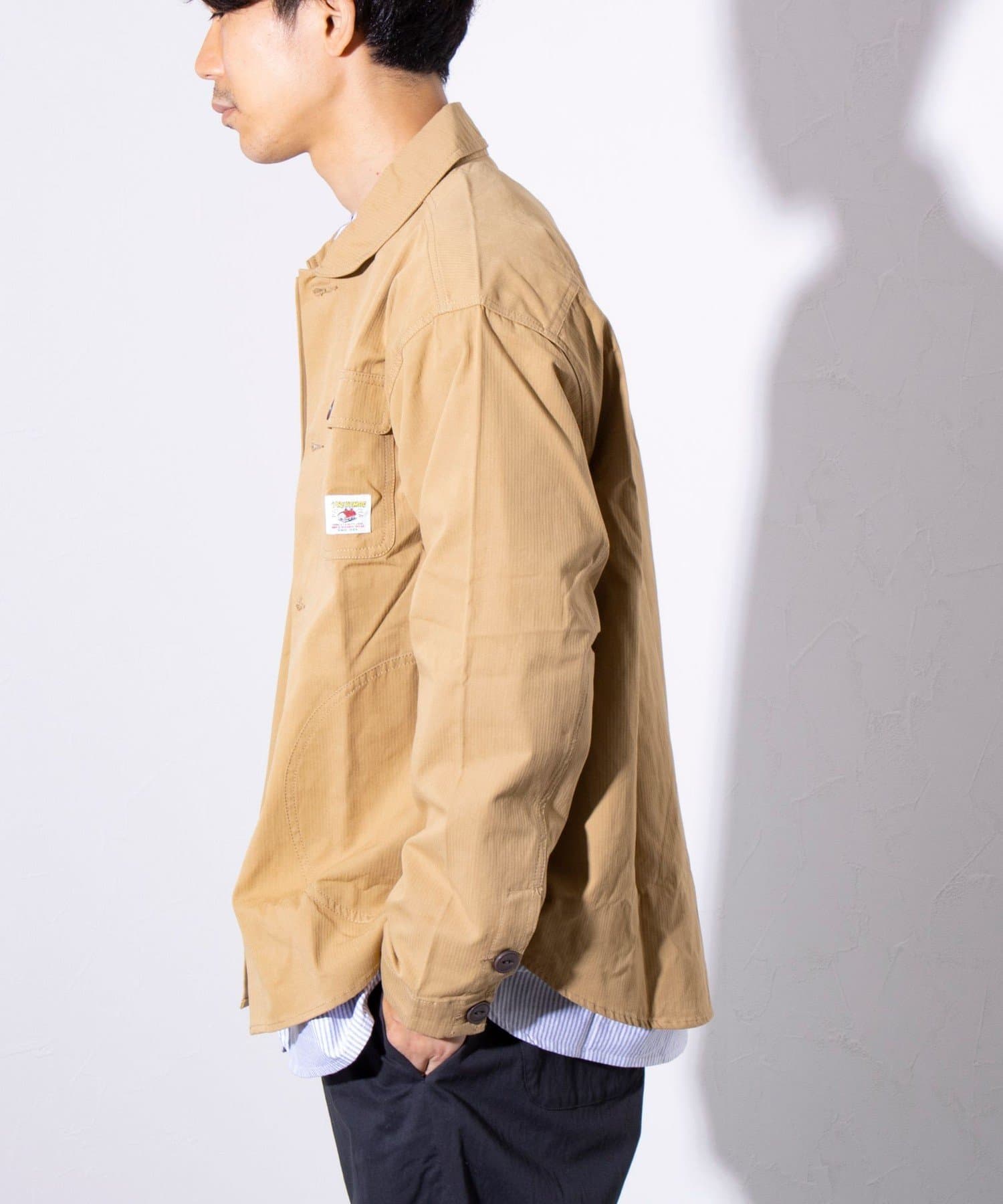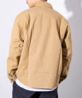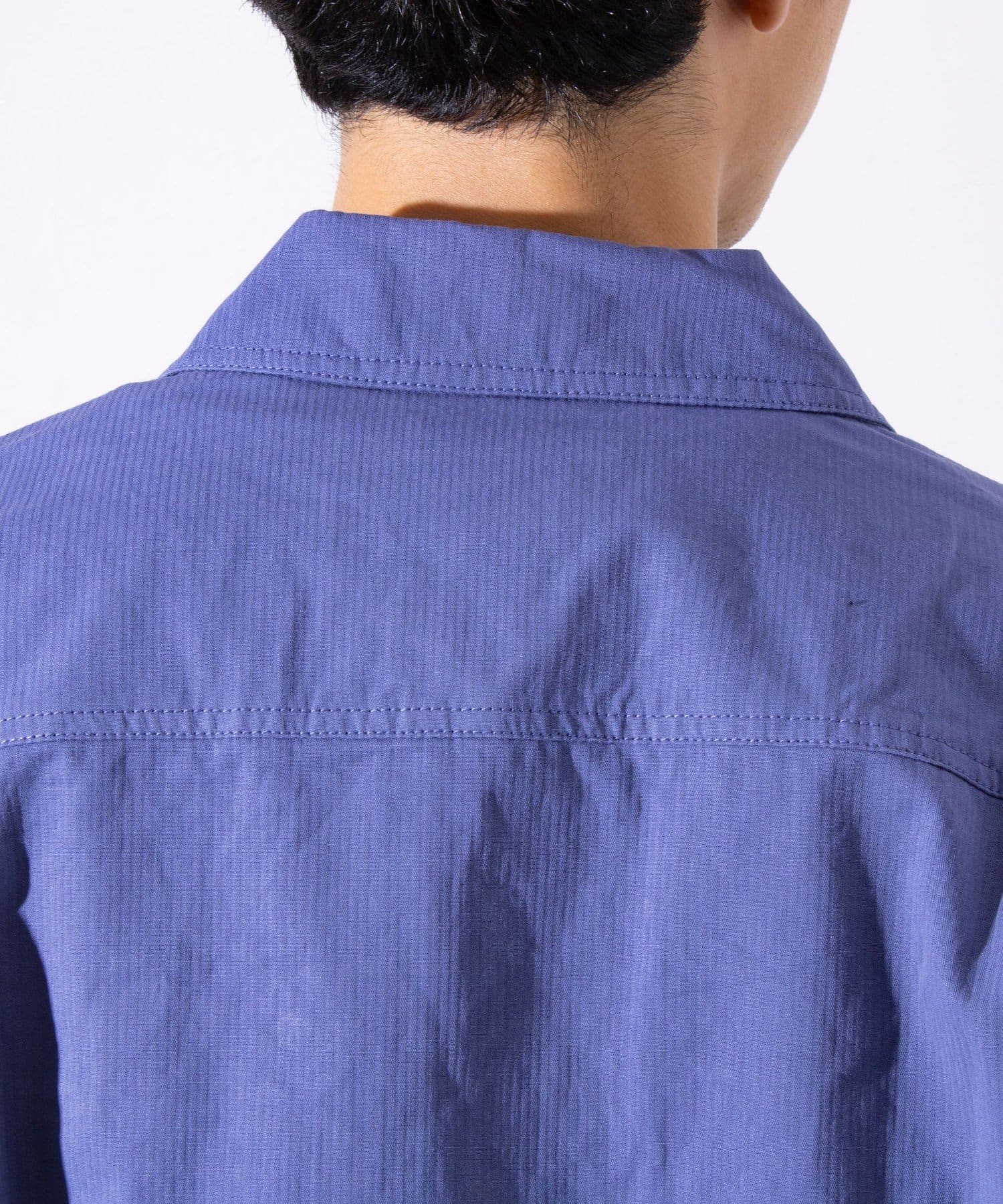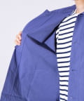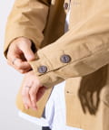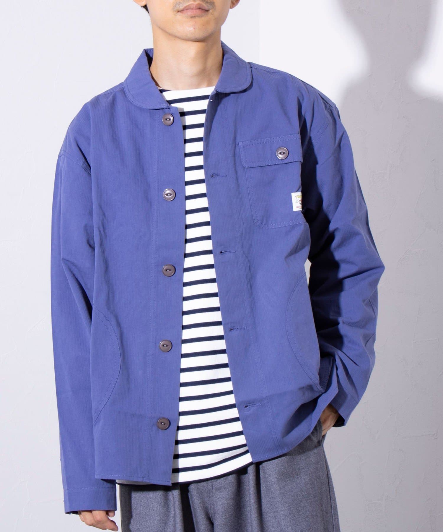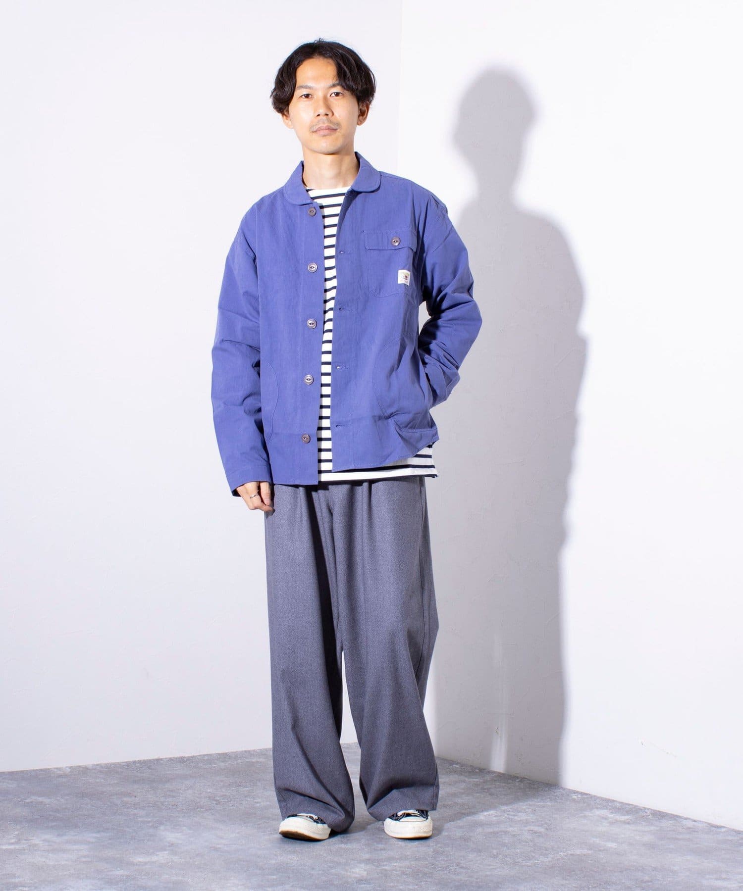さっと羽織るだけでサマになる秋の羽織りとして丁度良い丸襟カバーオールシャツ。