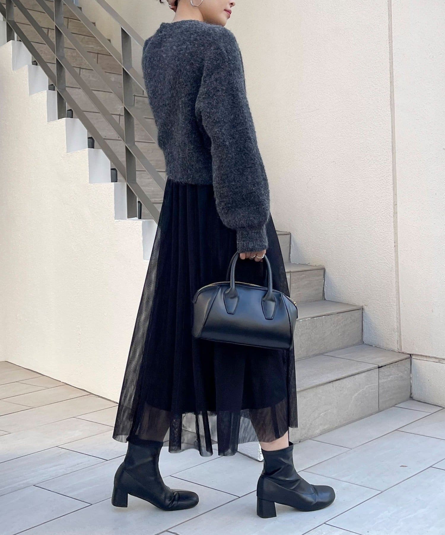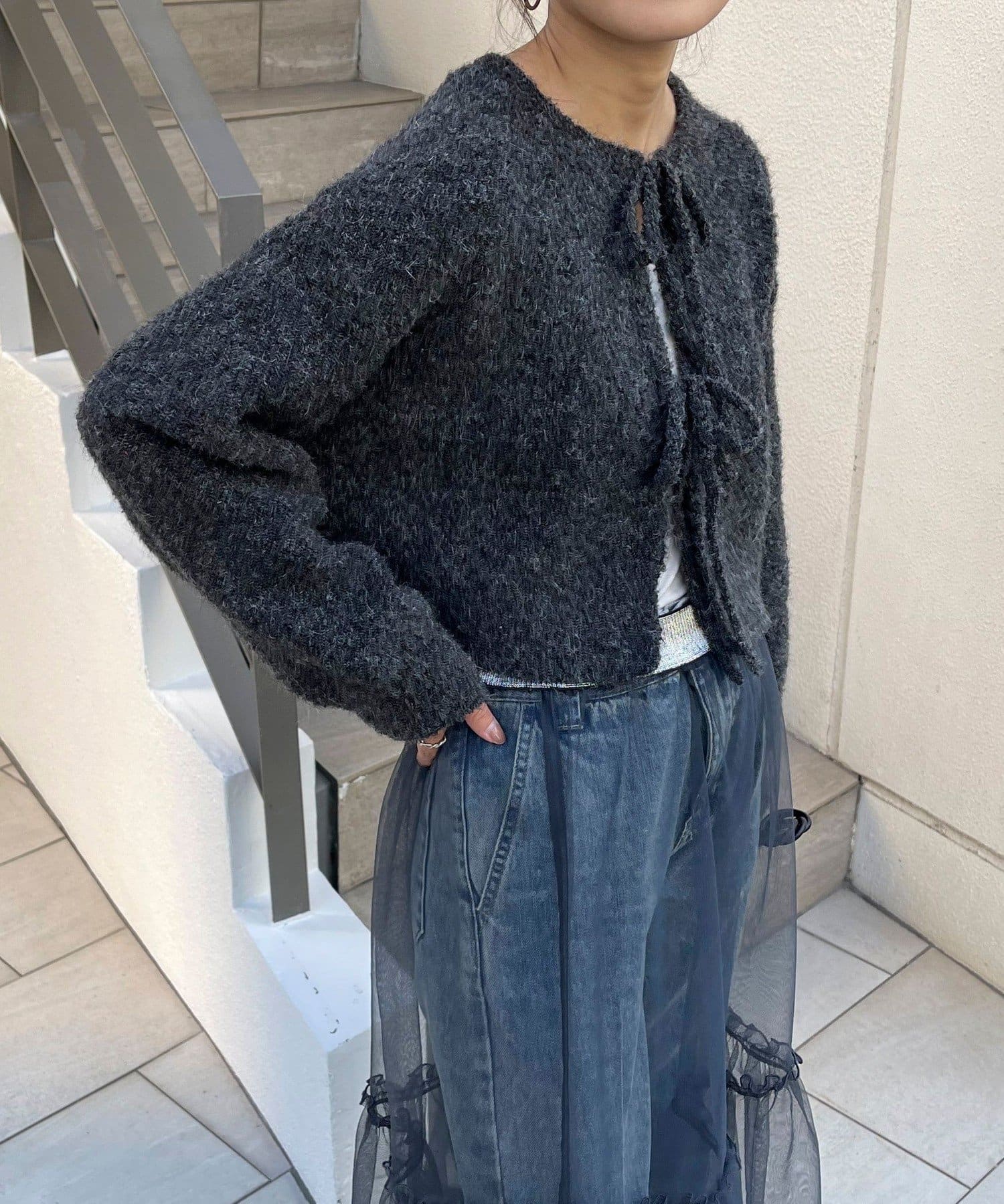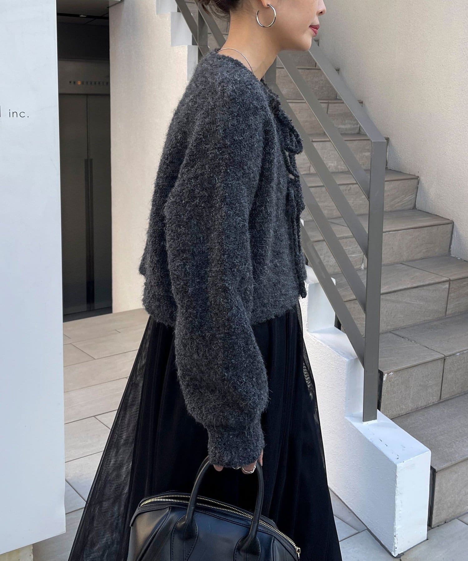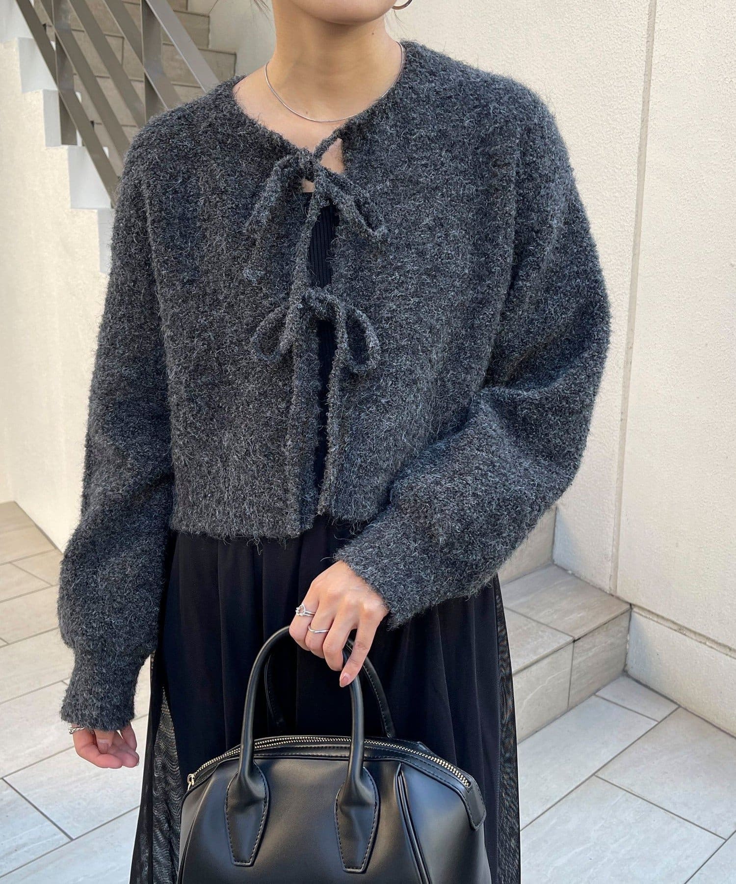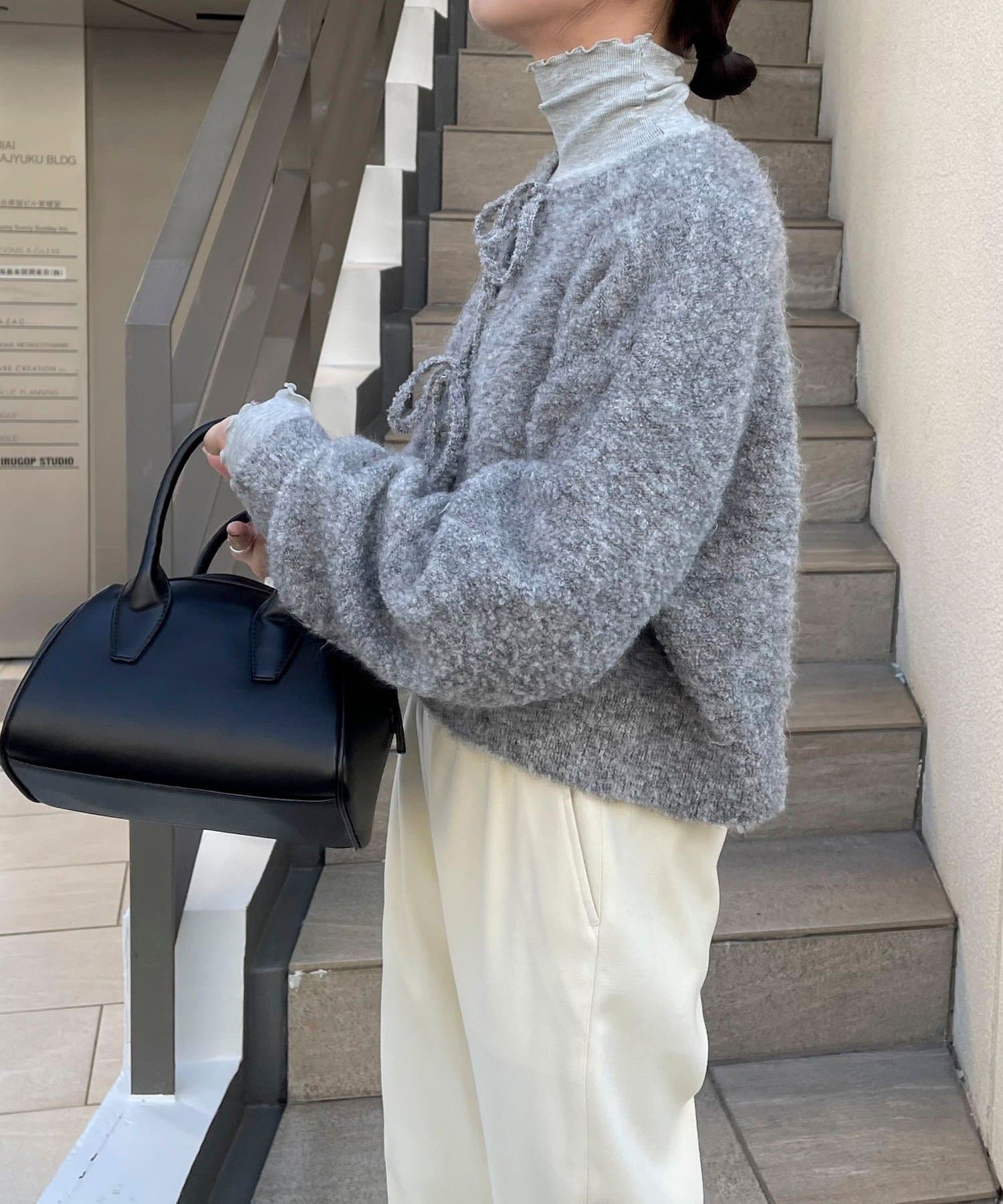 ・ニットはブークレのもこもこ感が可愛いい暖かな素材。コンパクトな丈感がスタイルアップを叶えます