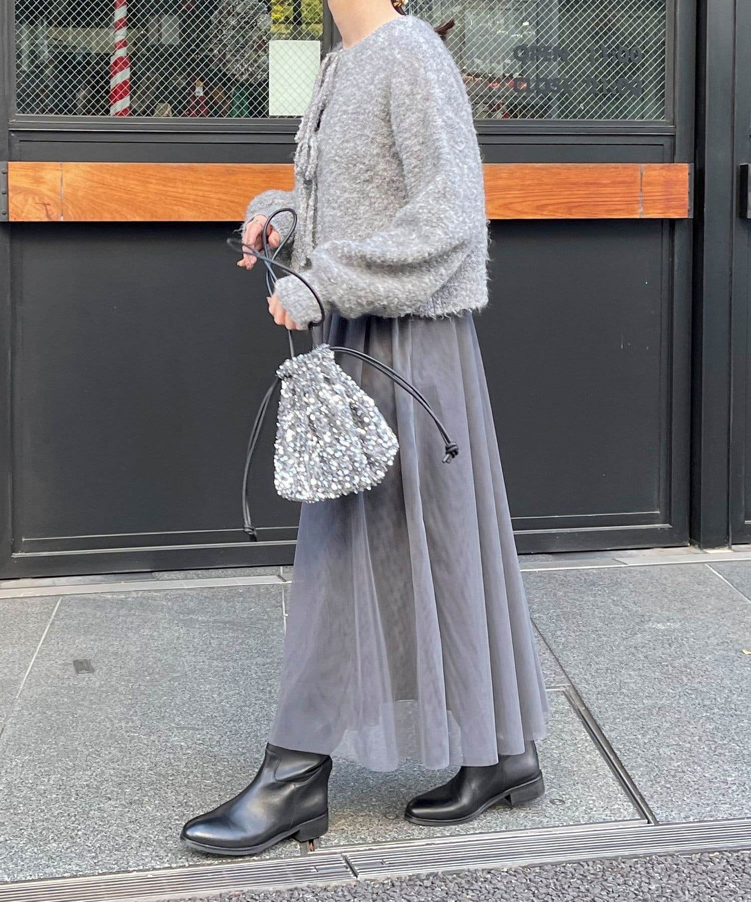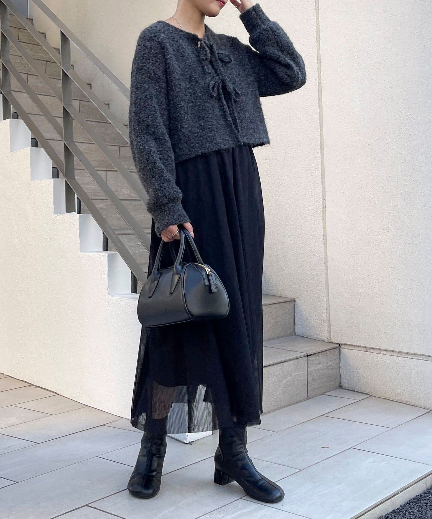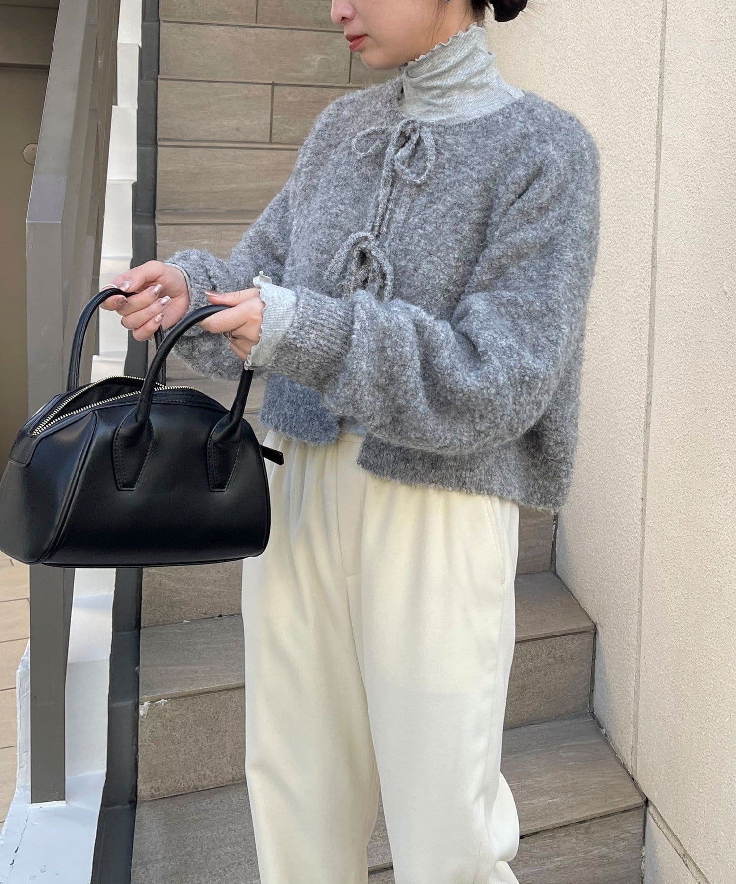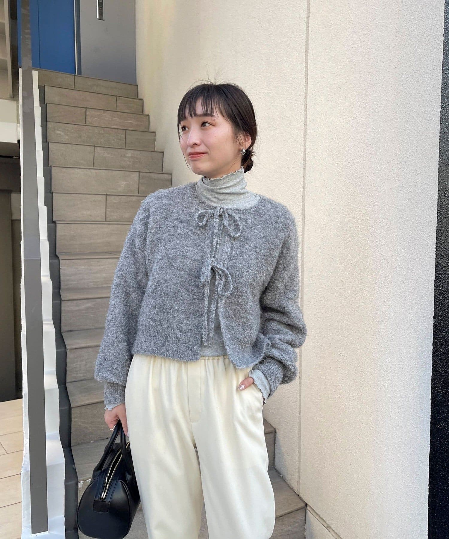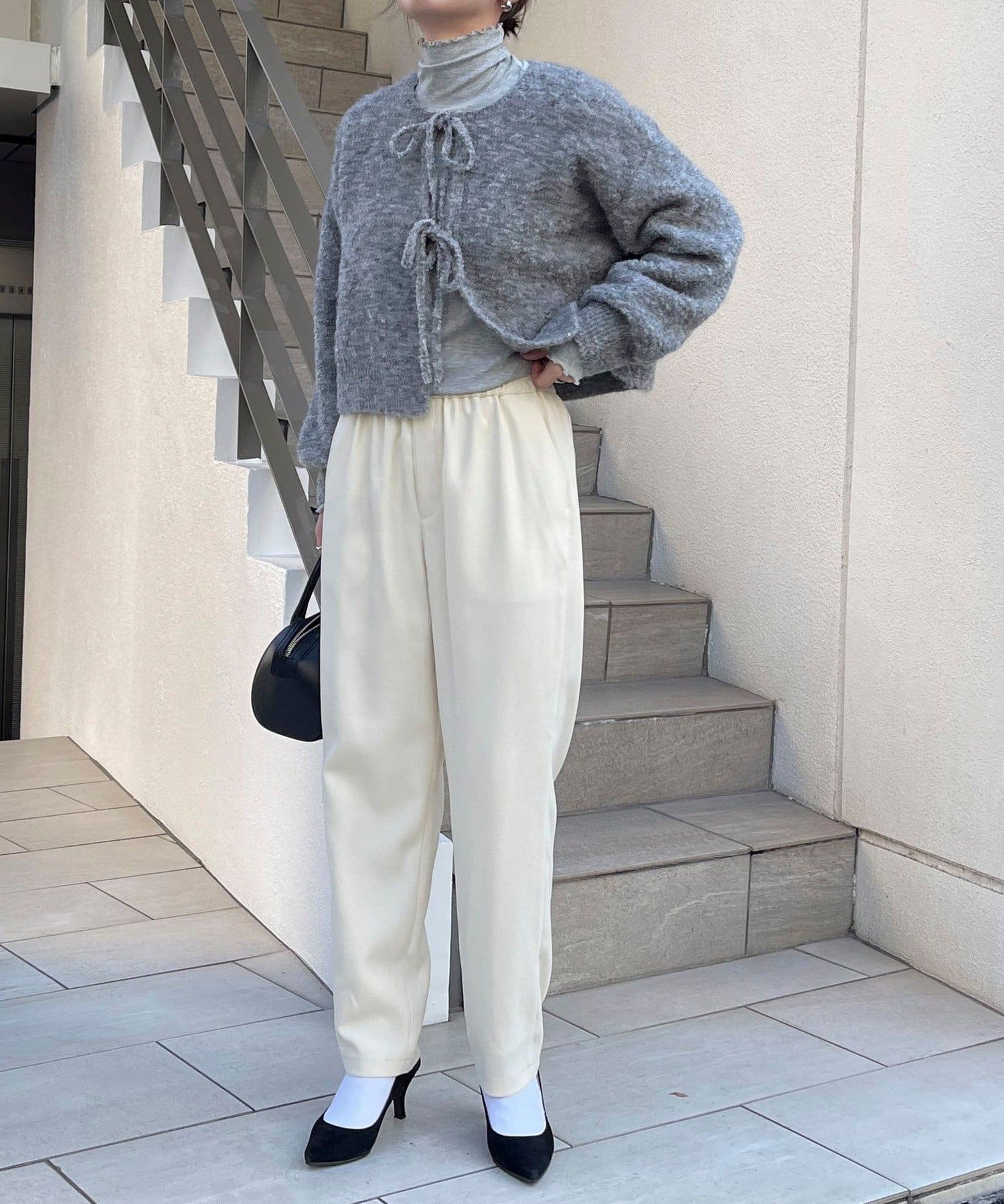 ・ニットはブークレのもこもこ感が可愛いい暖かな素材。コンパクトな丈感がスタイルアップを叶えます