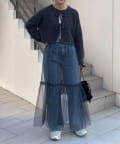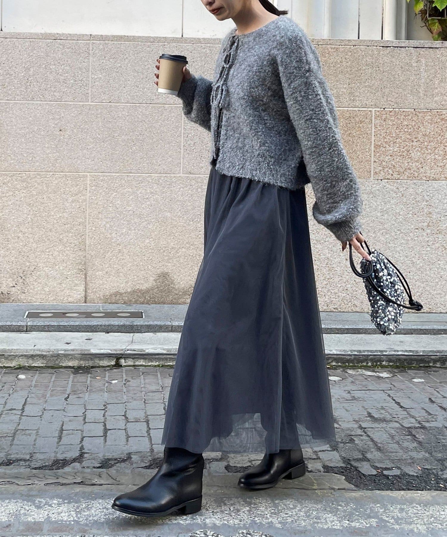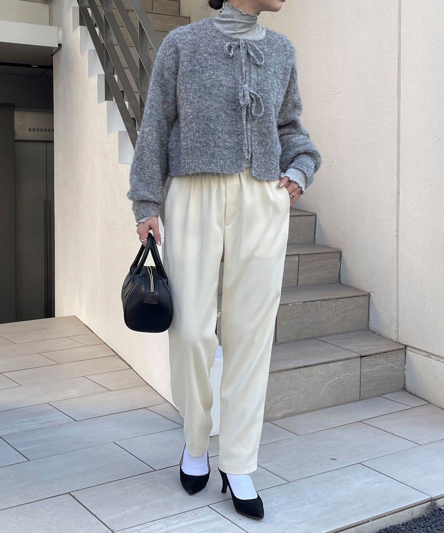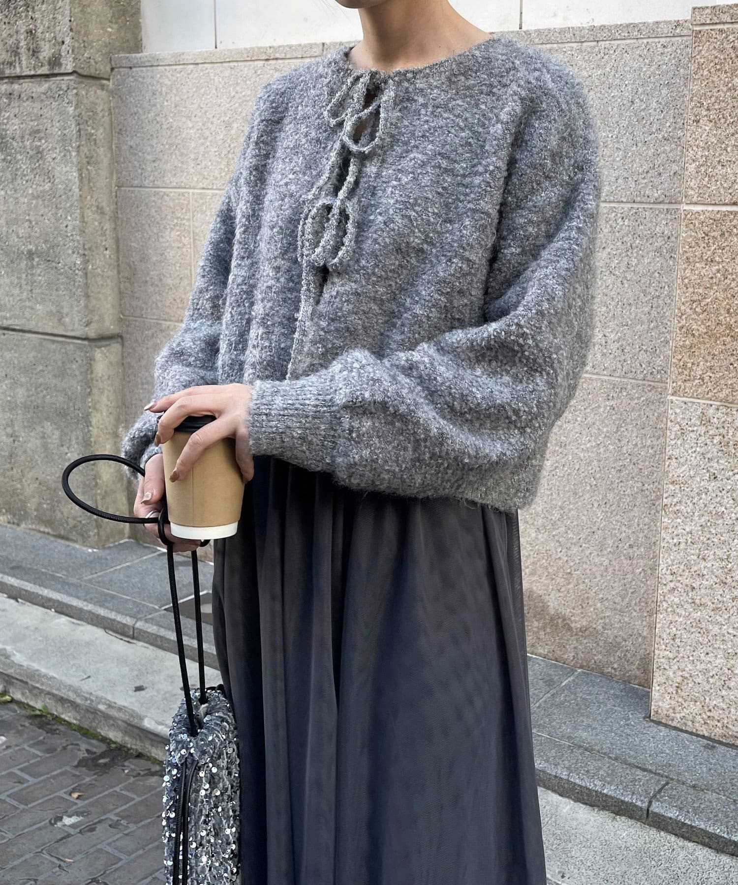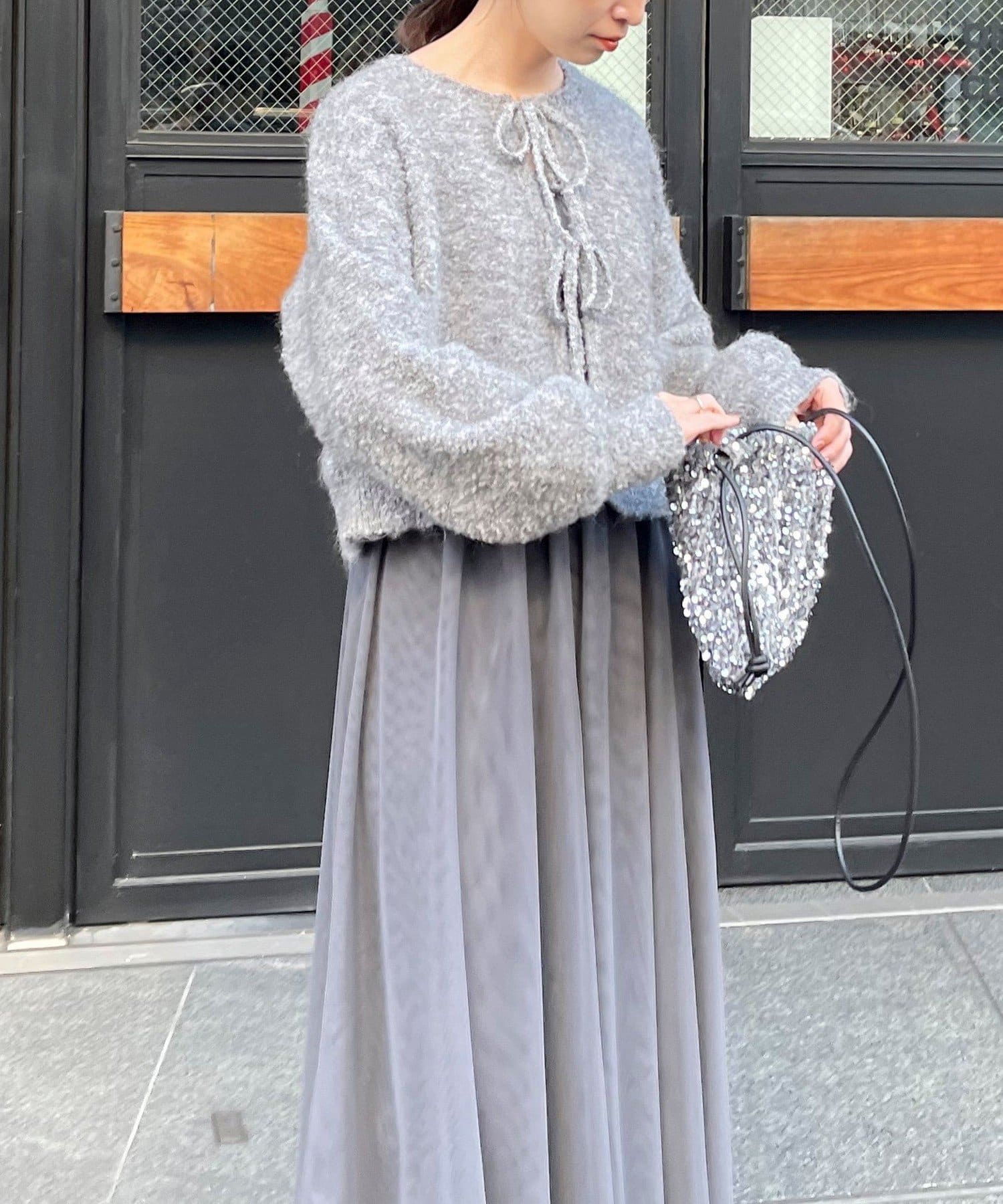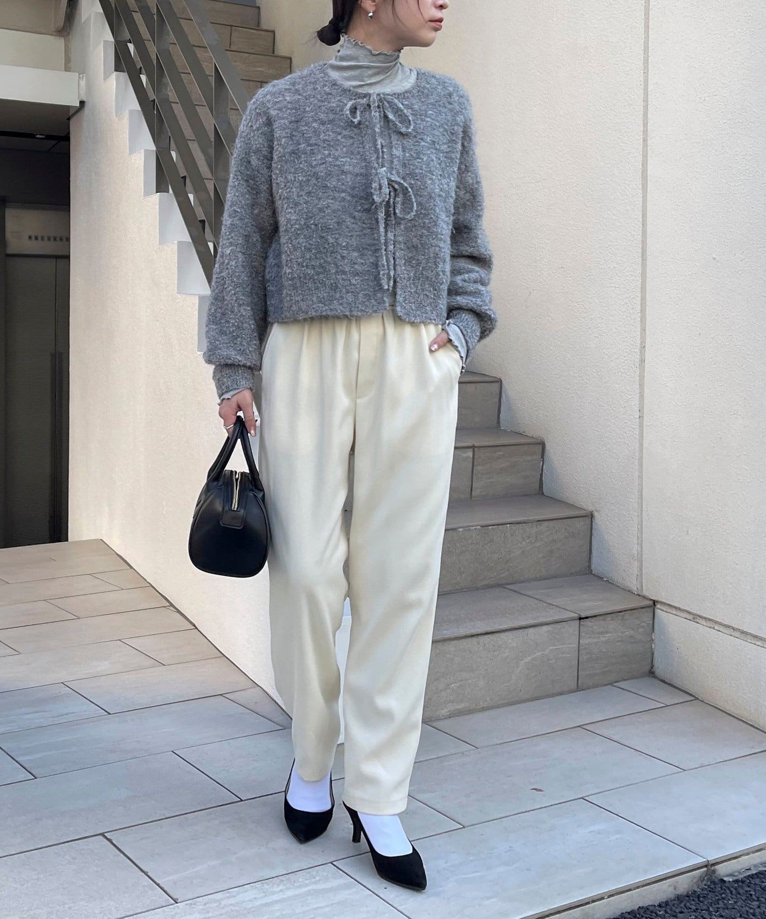 ・ニットはブークレのもこもこ感が可愛いい暖かな素材。コンパクトな丈感がスタイルアップを叶えます