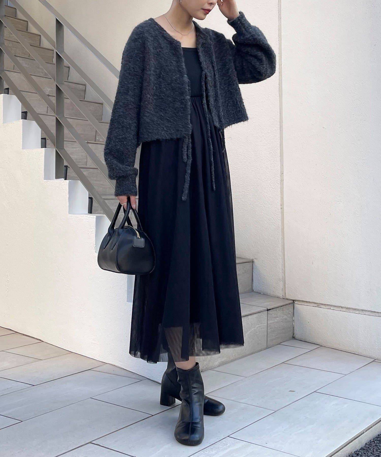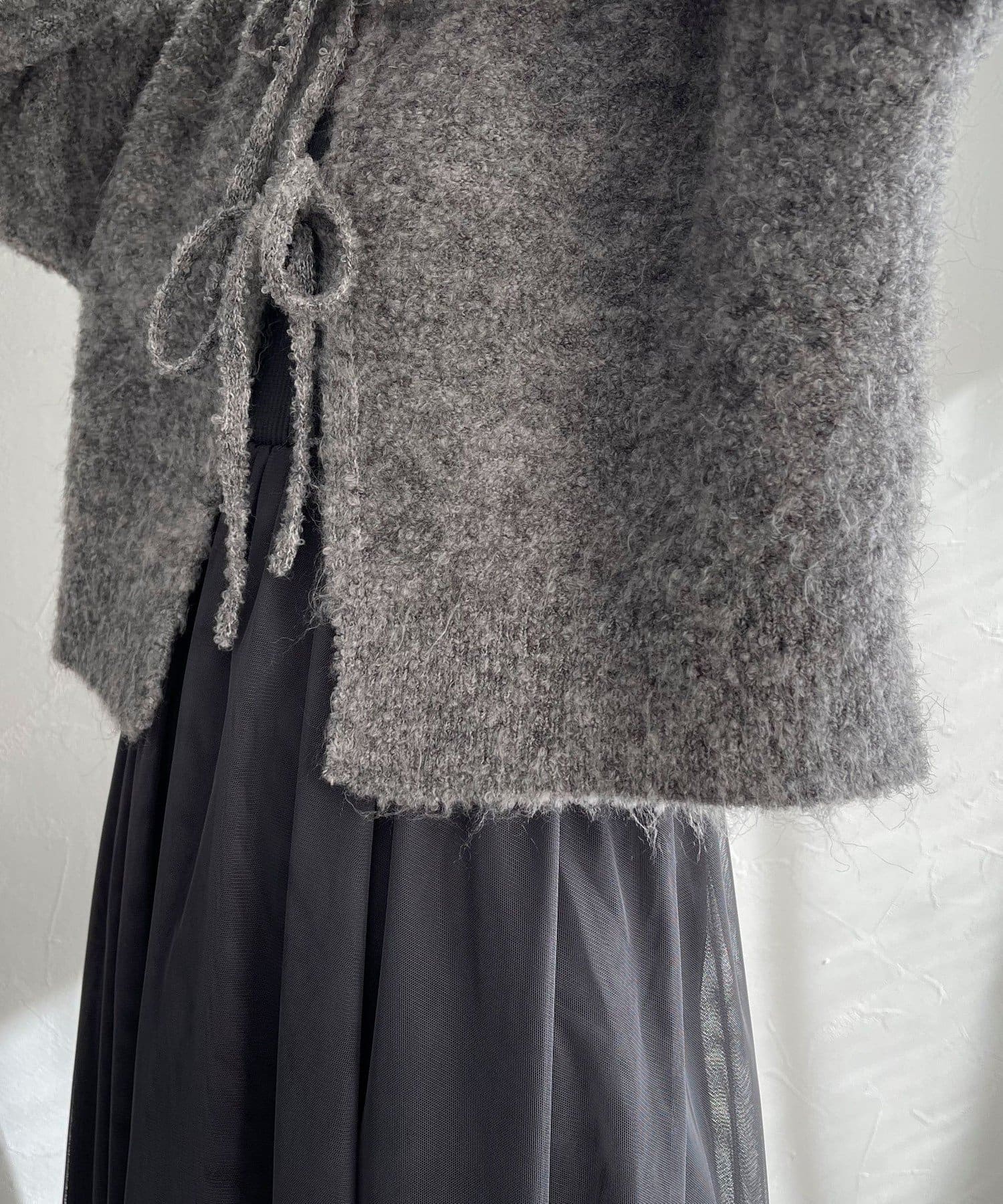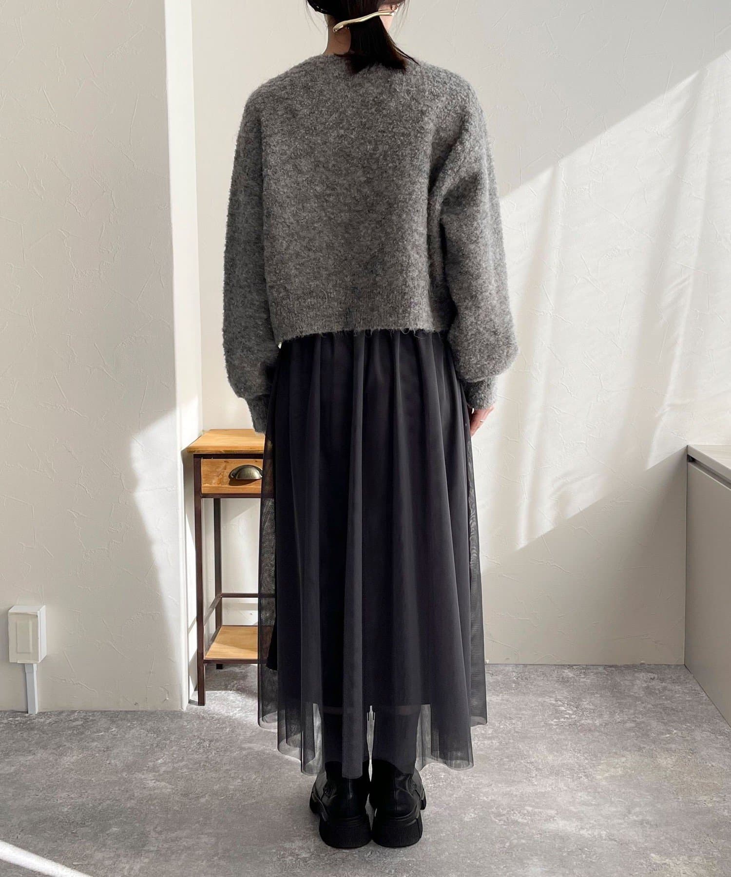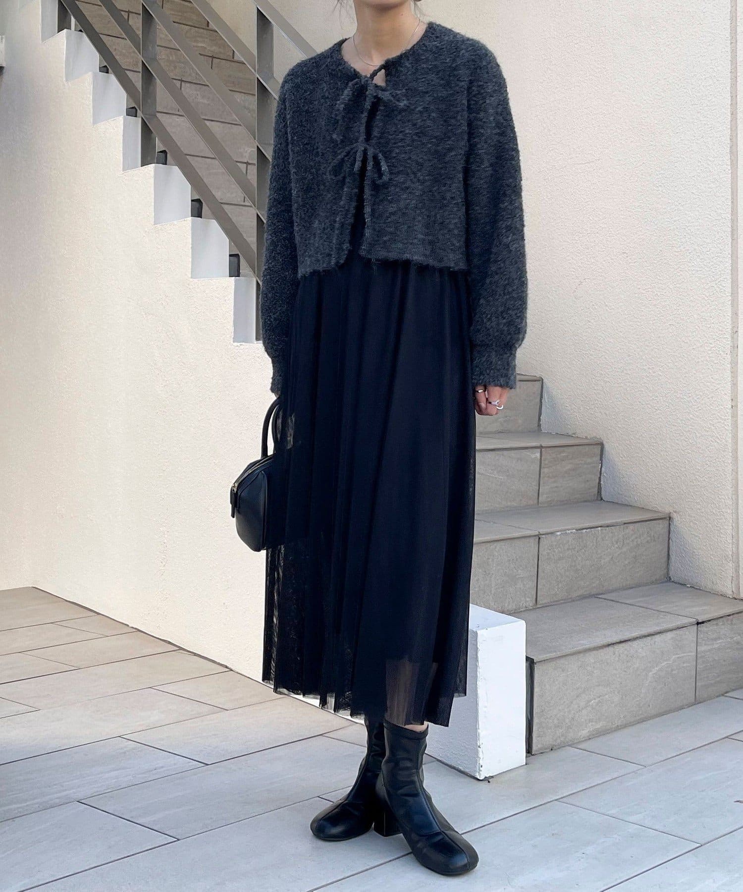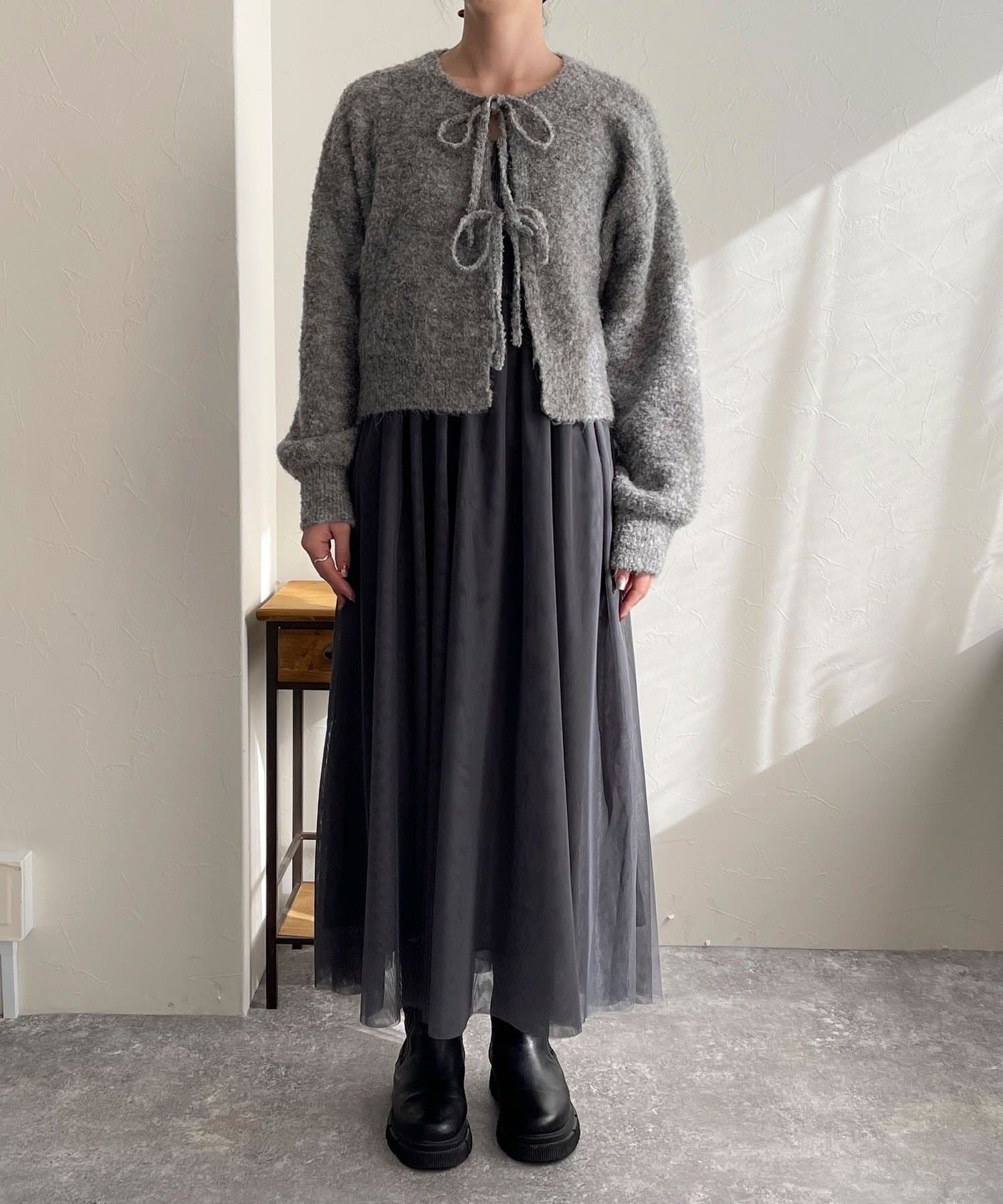 ・チュールドッキングのキャミワンピースとブークレのもこもこカーディガンのセット