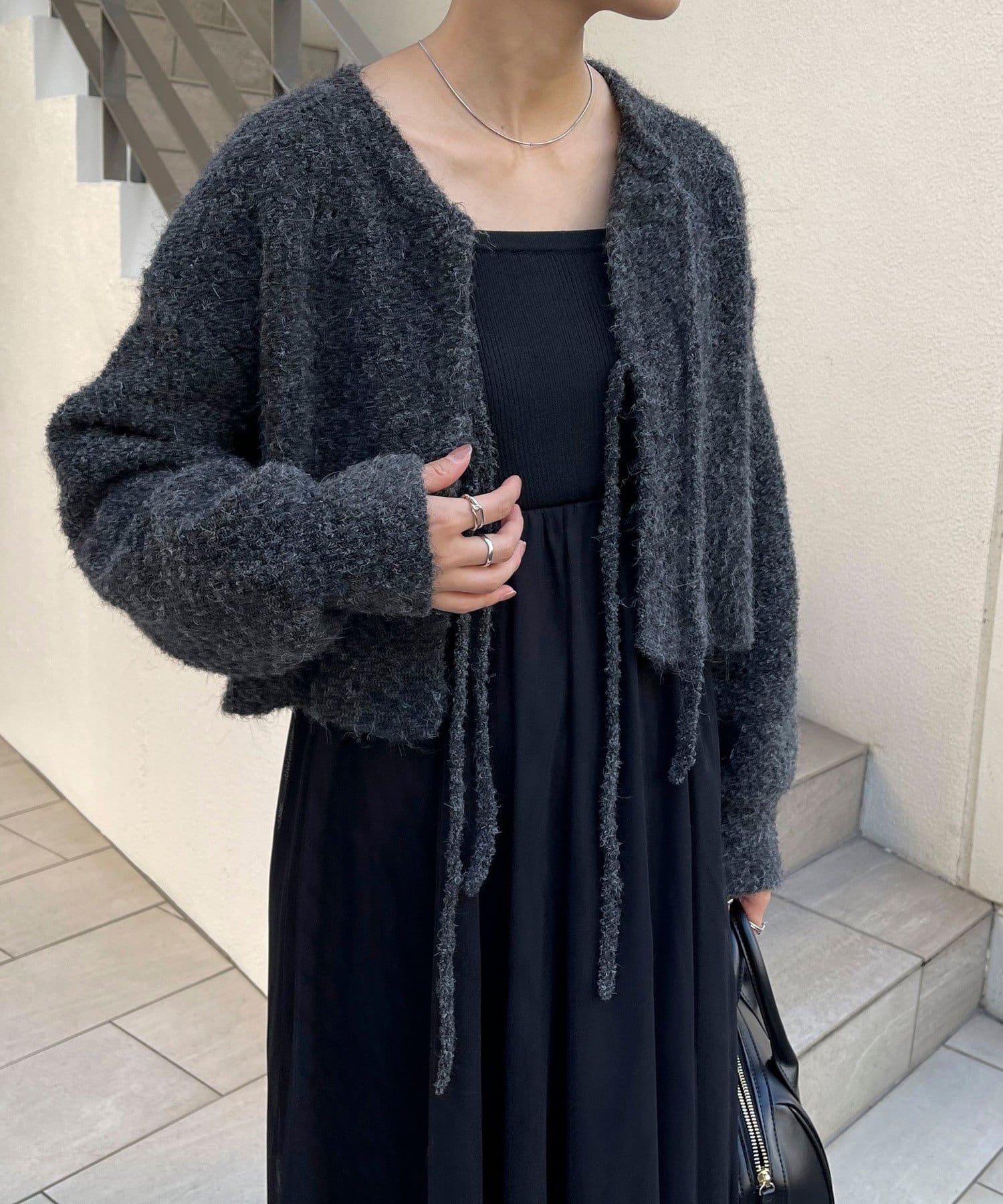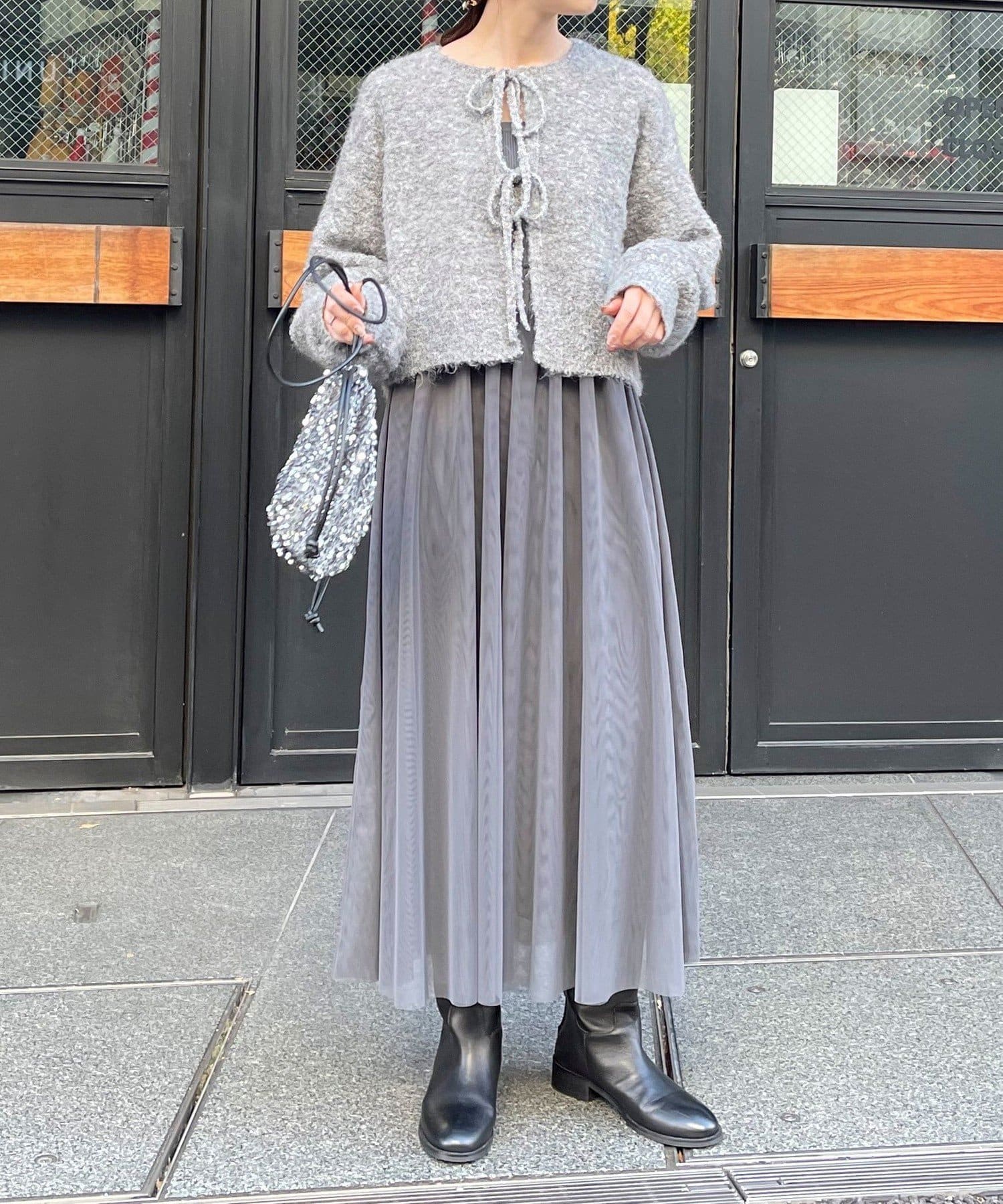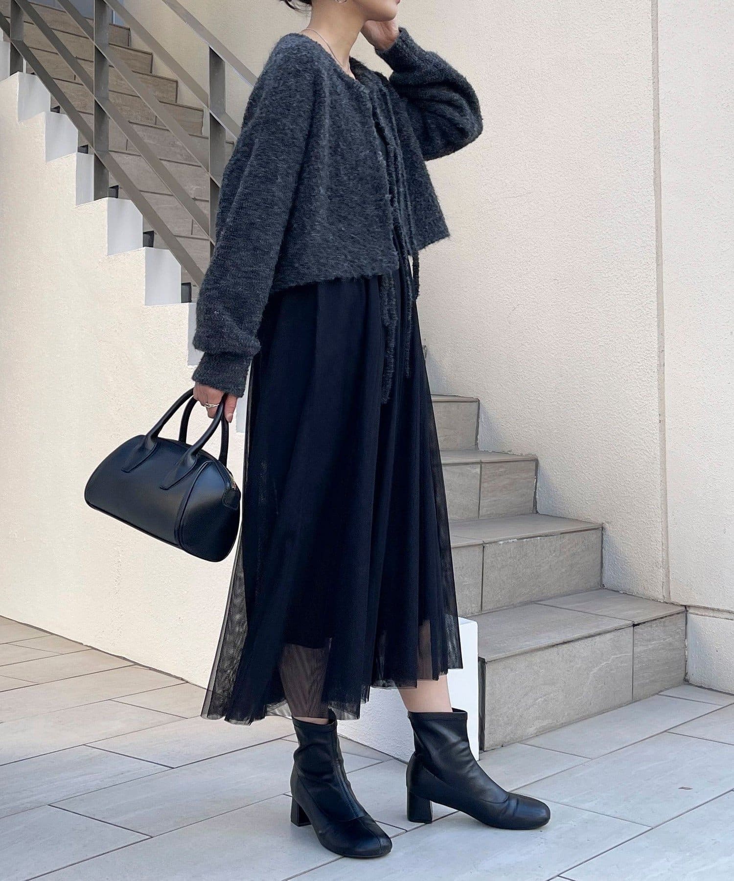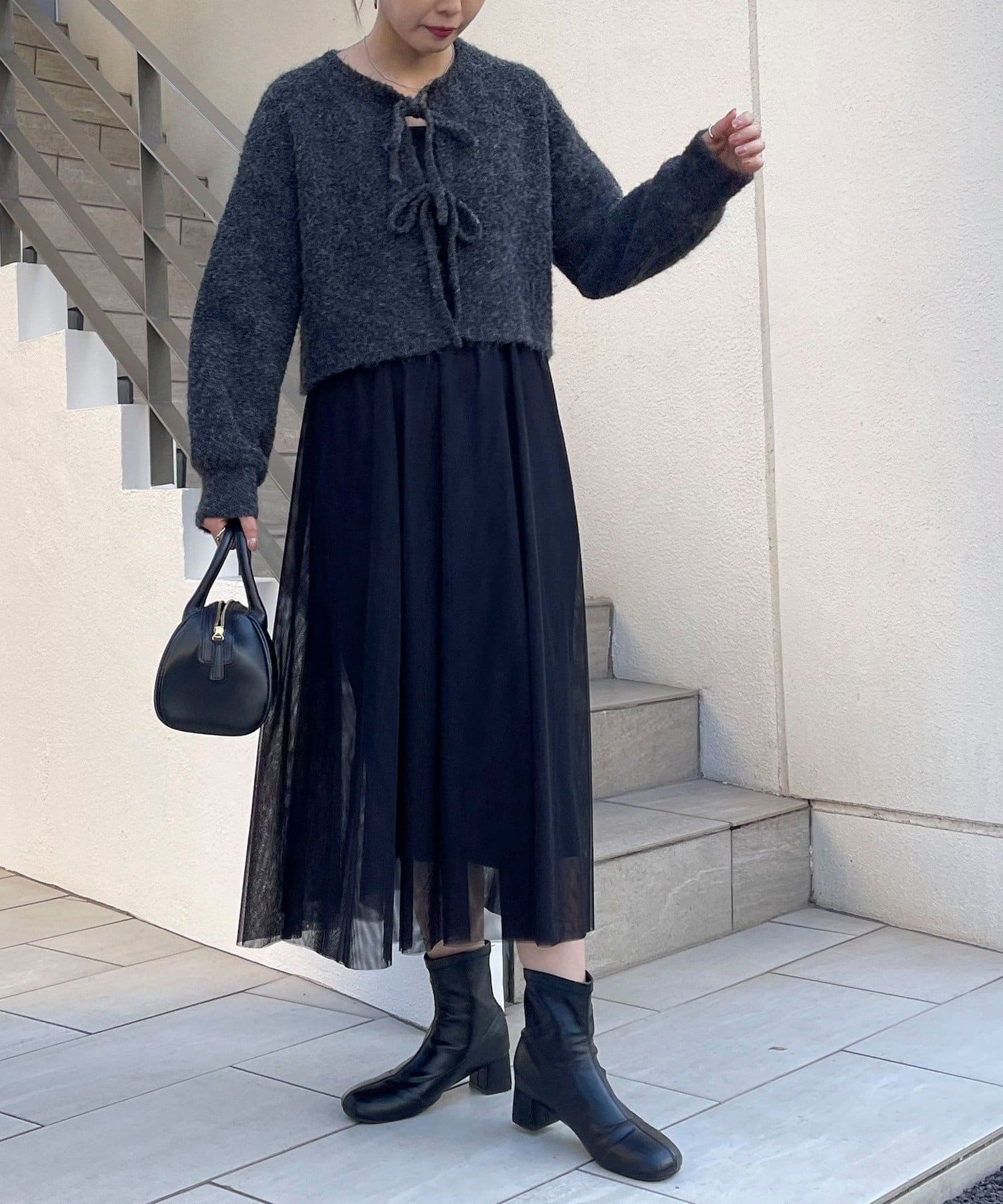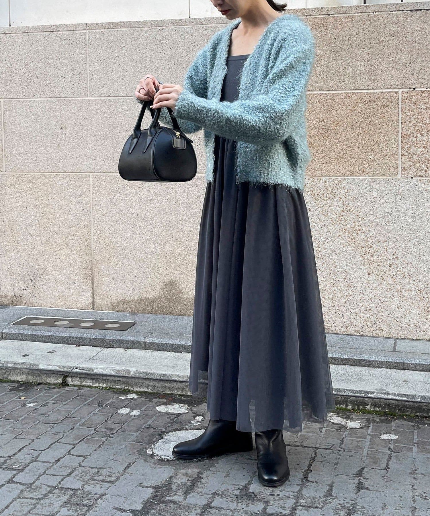 ・チュールドッキングのキャミワンピースとブークレのもこもこカーディガンのセット