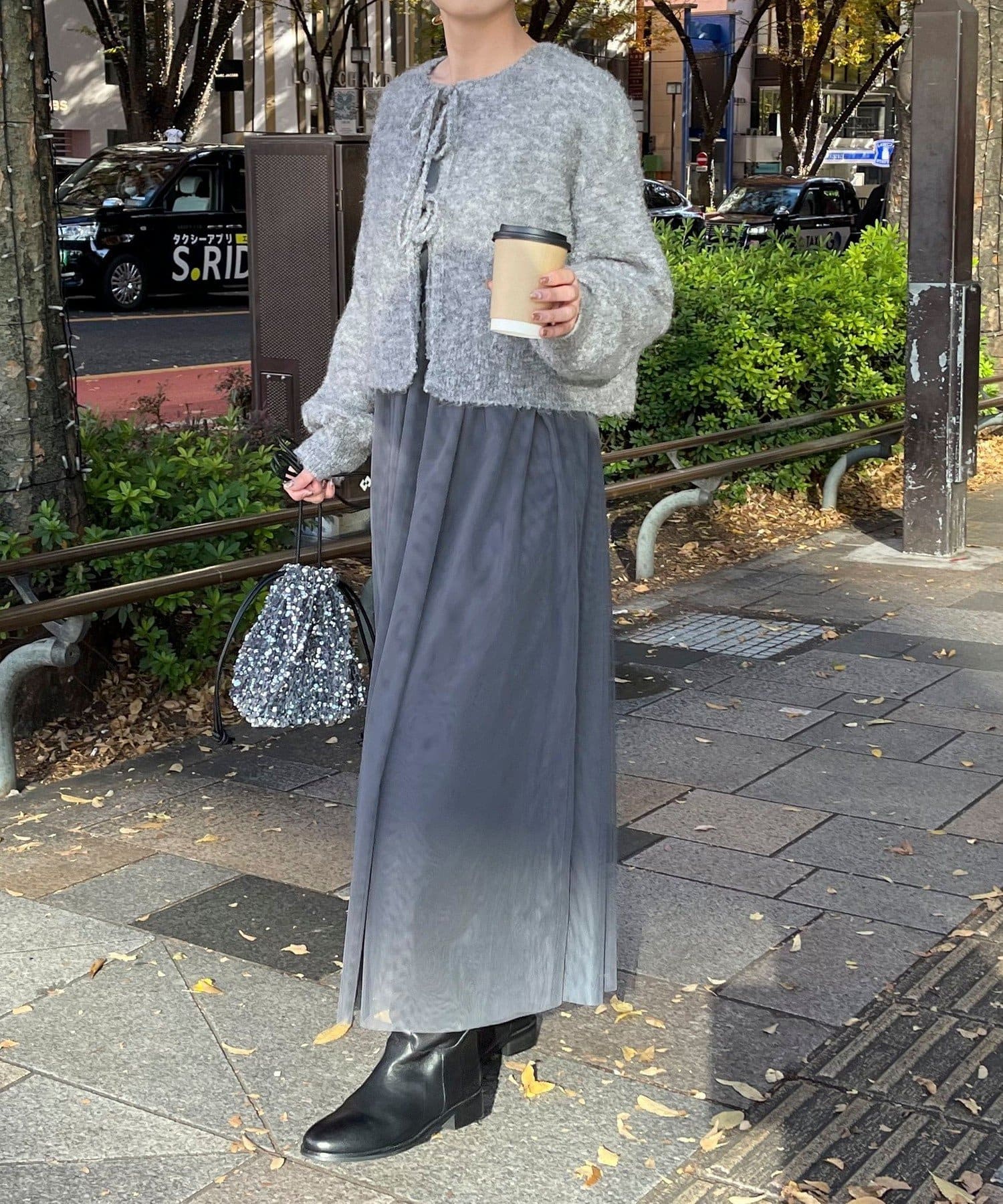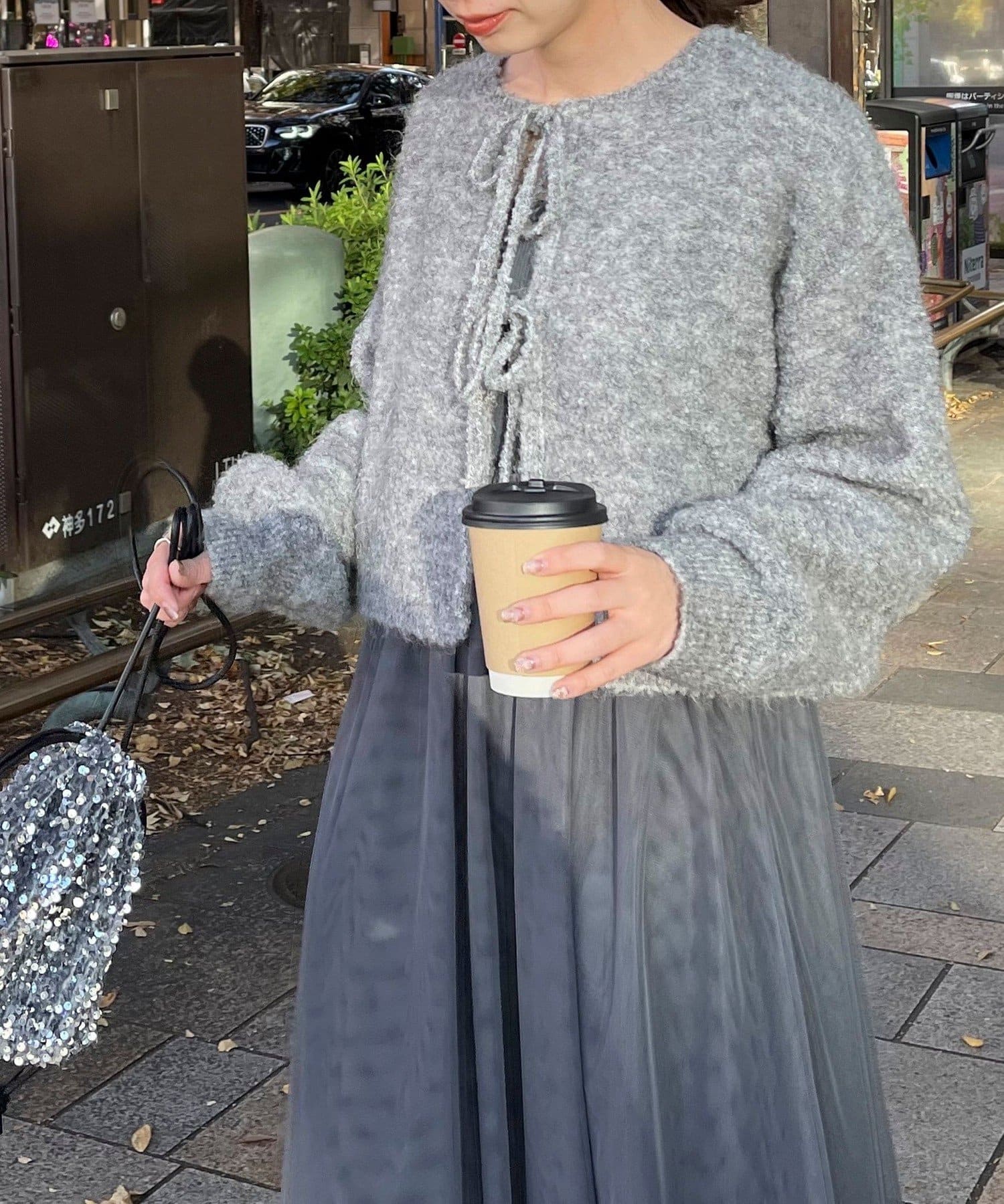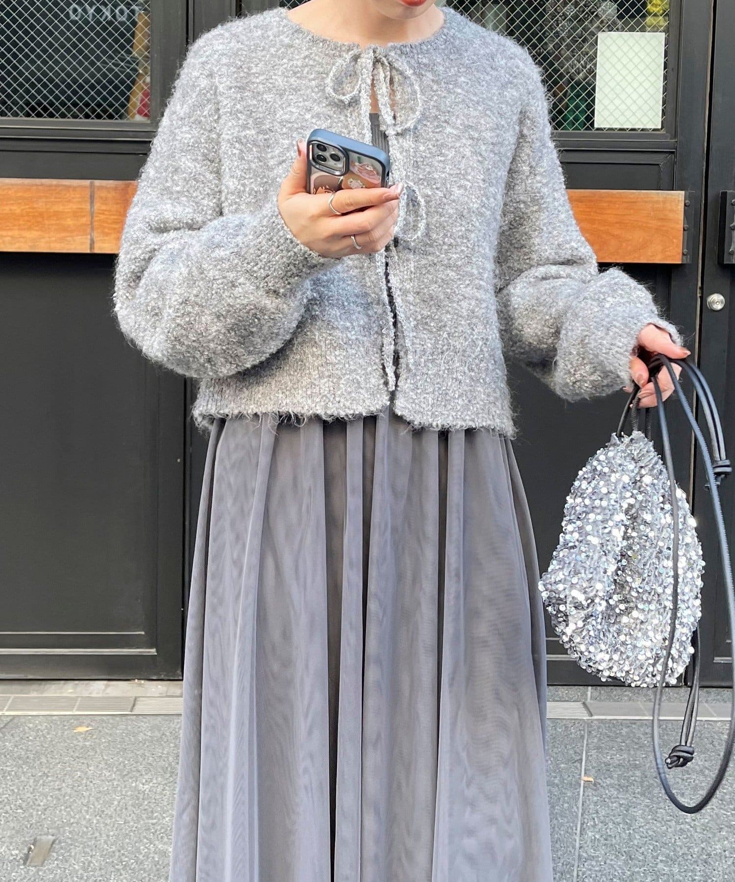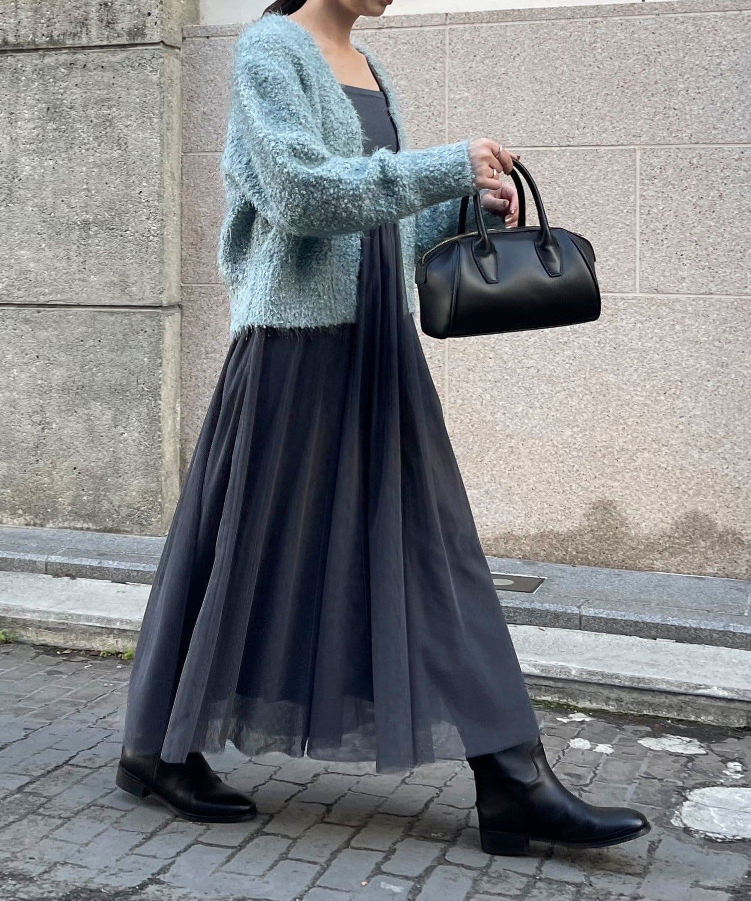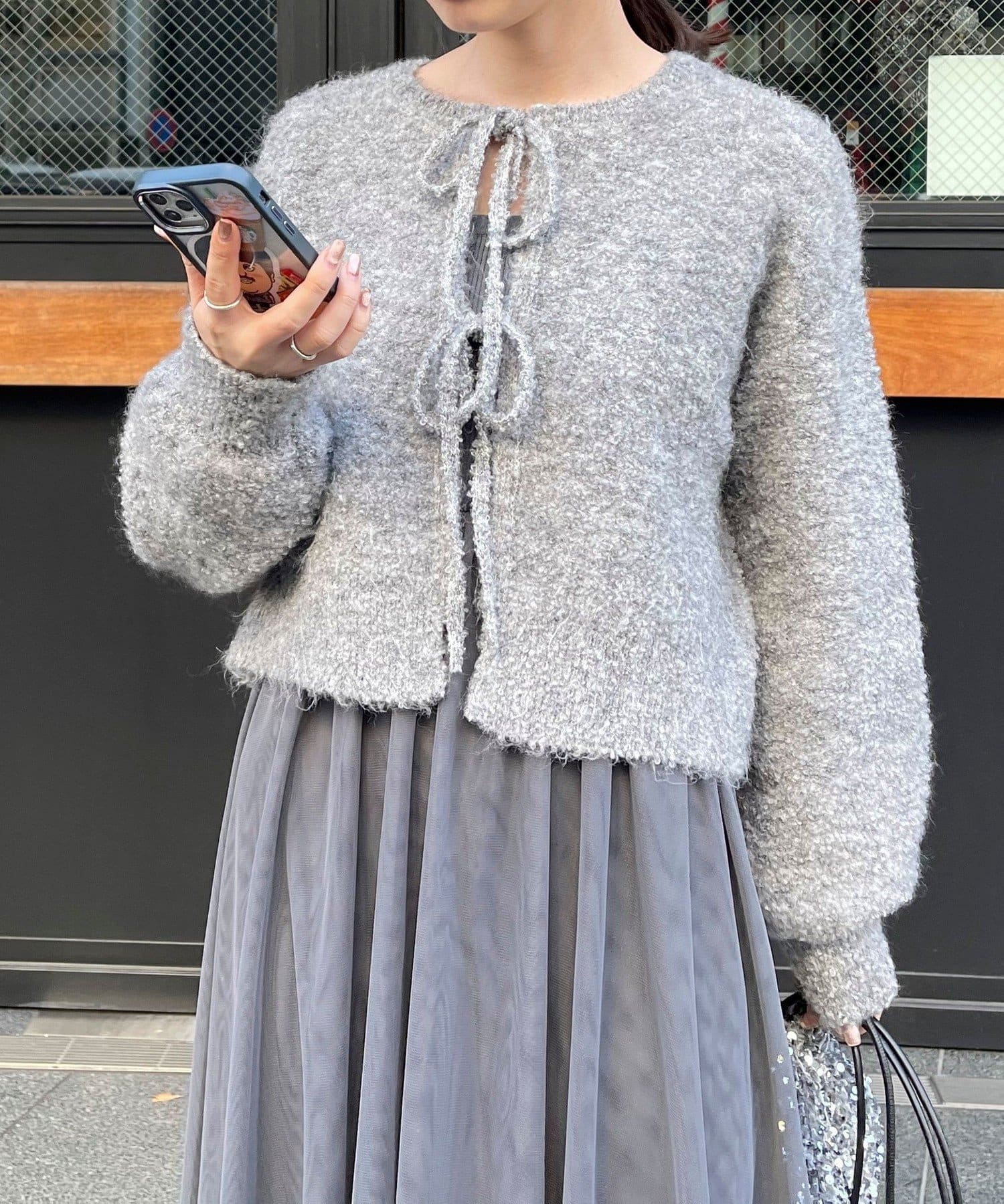 ・チュールドッキングのキャミワンピースとブークレのもこもこカーディガンのセット