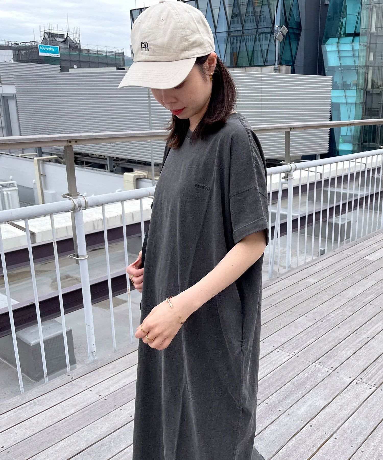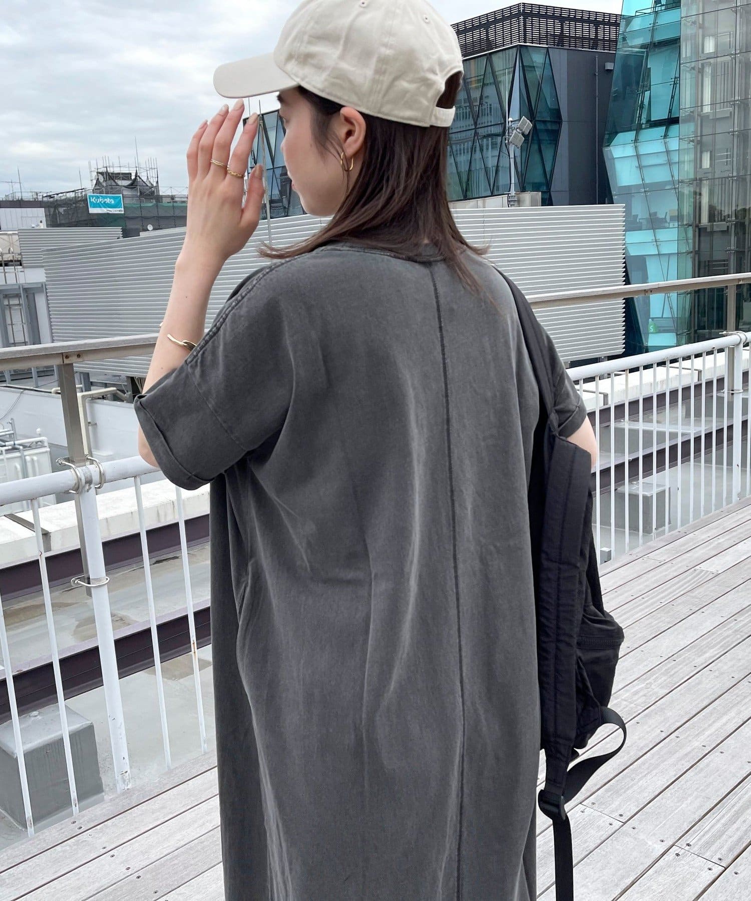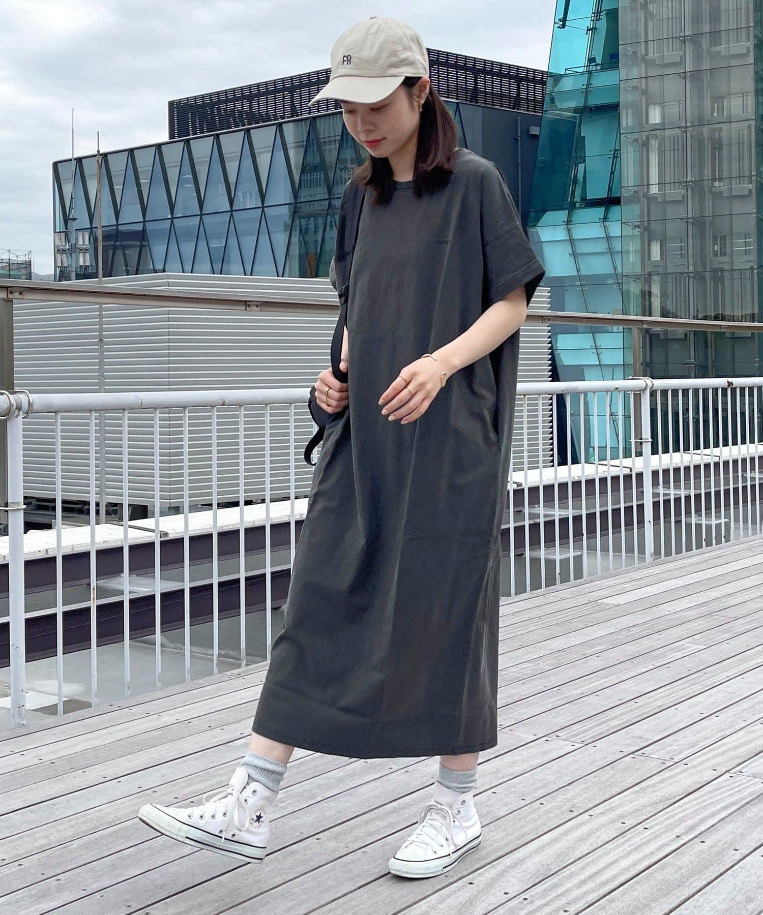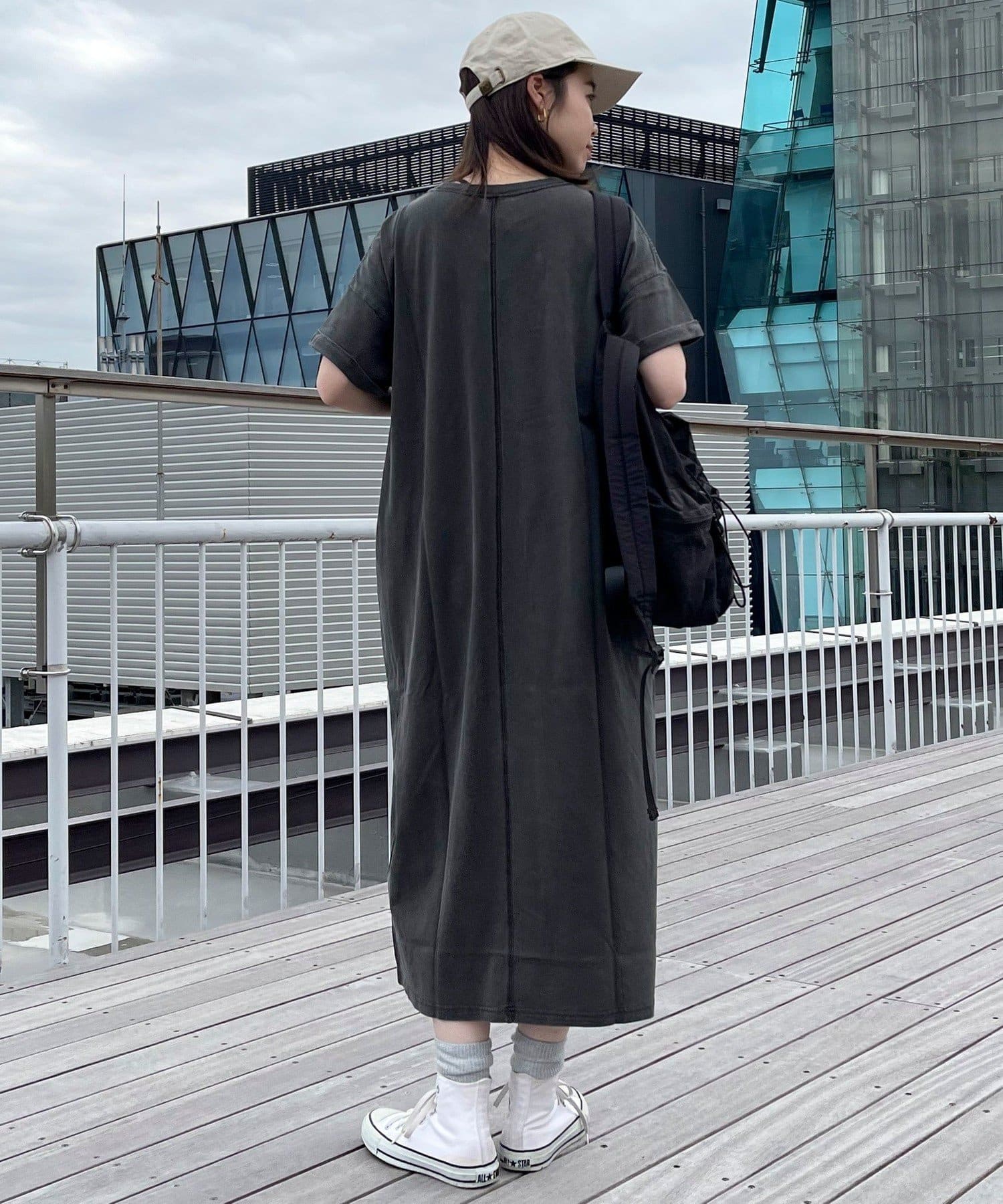 ・シンプルなTシャツワンピースはキャップやバッグなどの小物も合わせやすいアイテムです