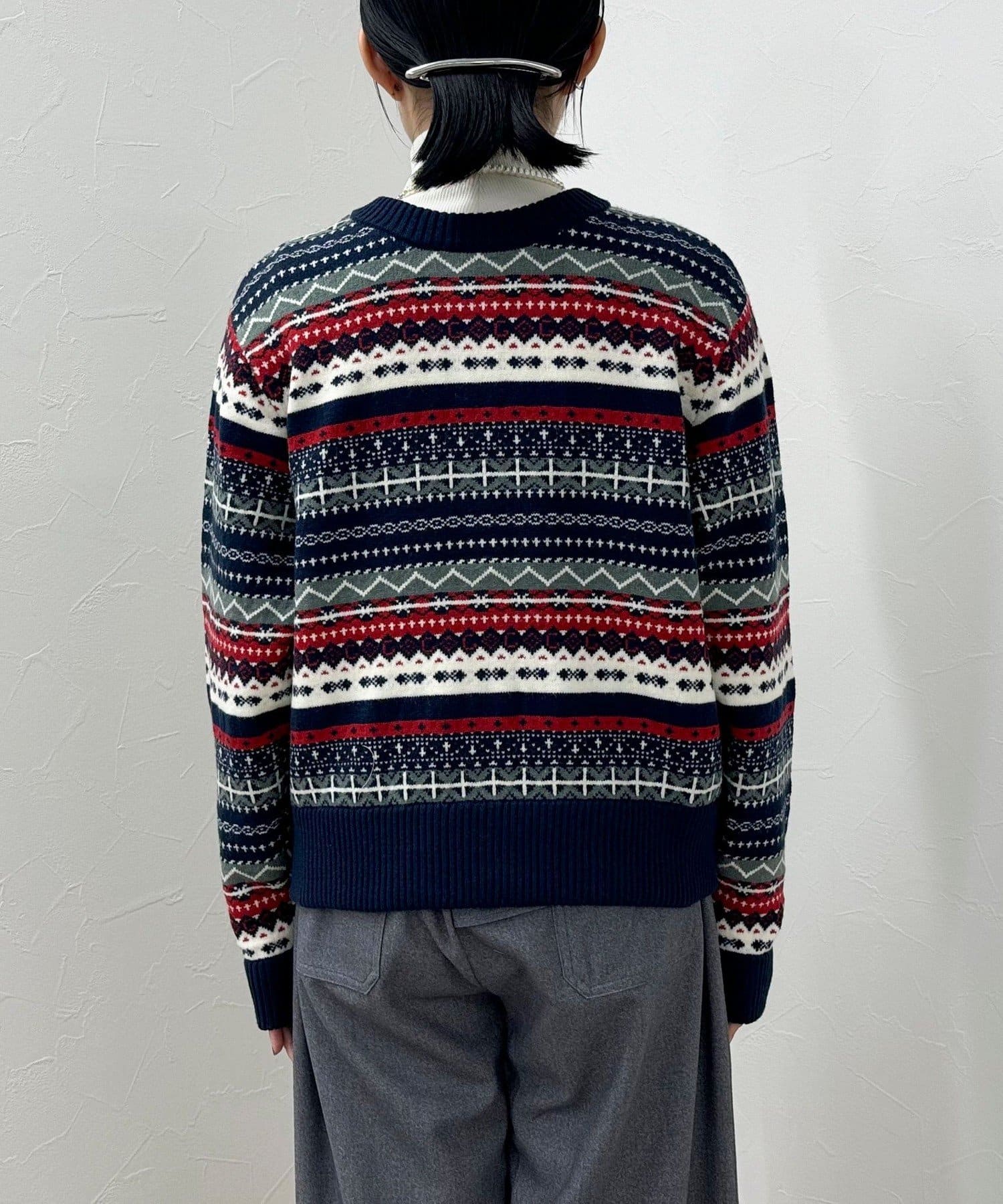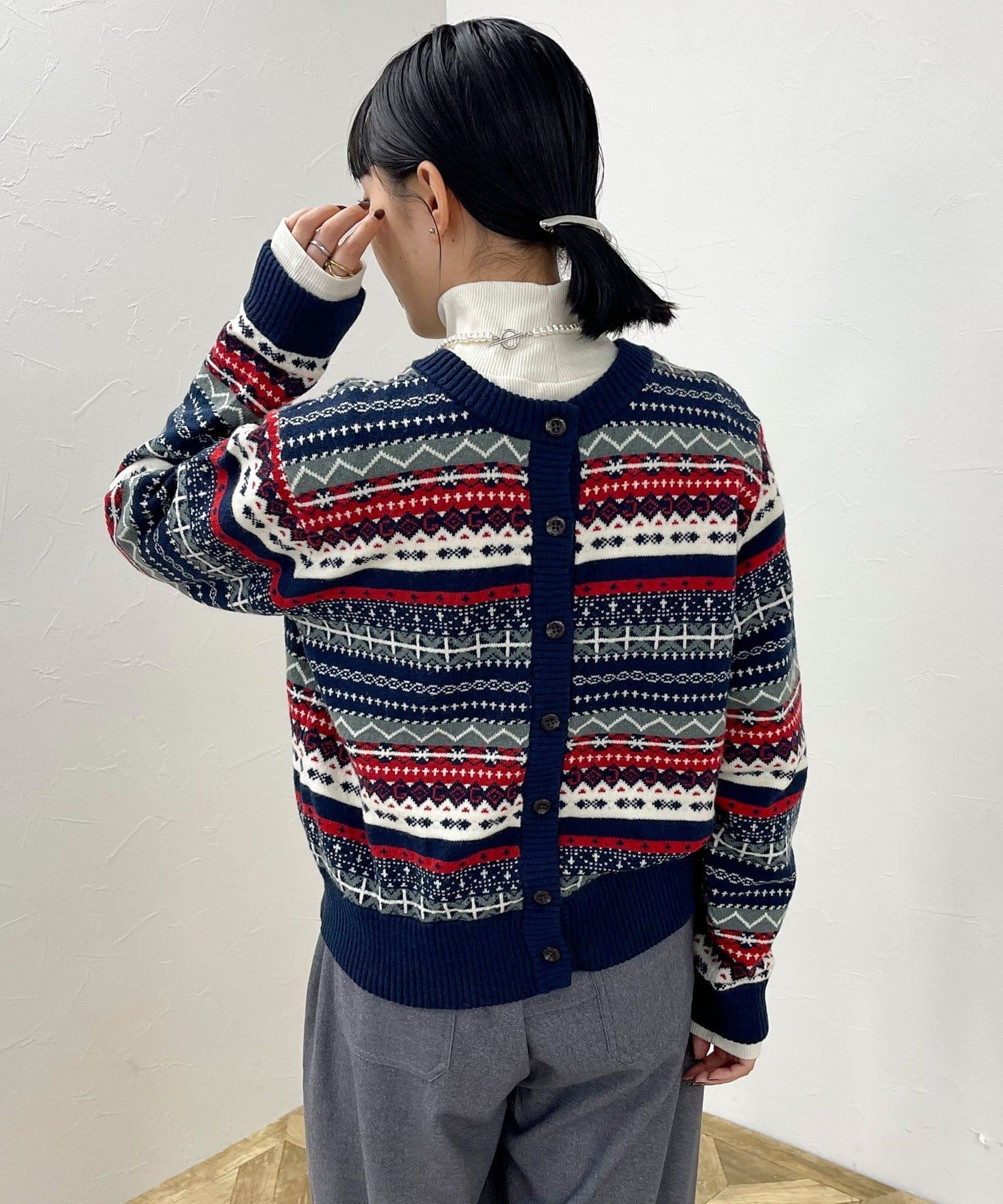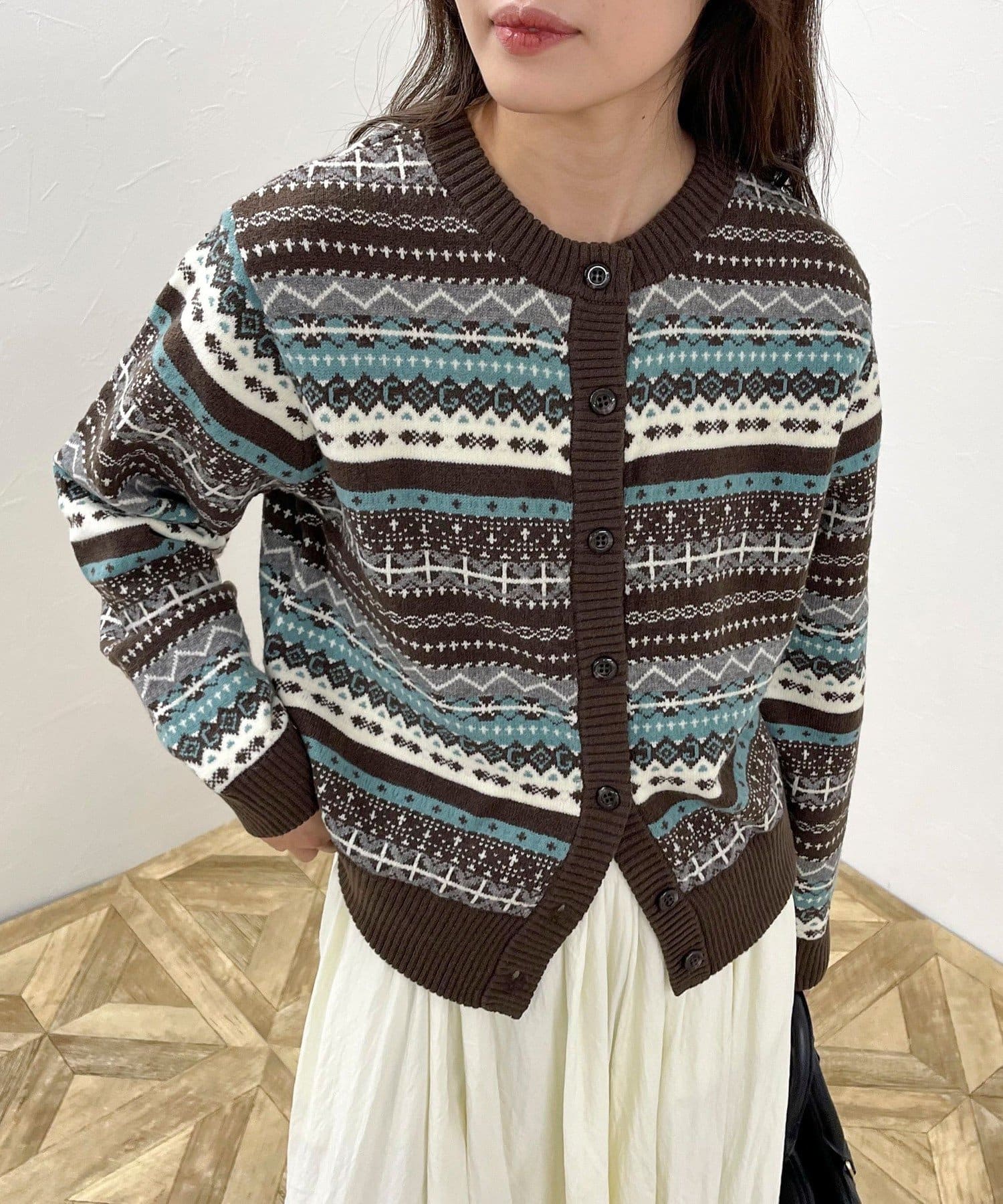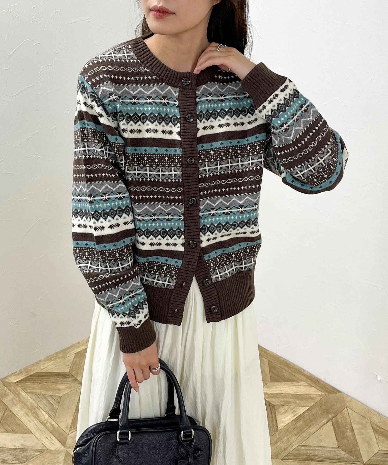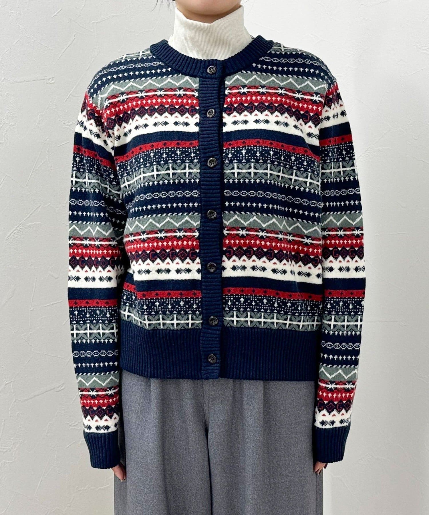・シーズンムード高まるフェアアイル柄がコーデの主役になるカーディガンです
