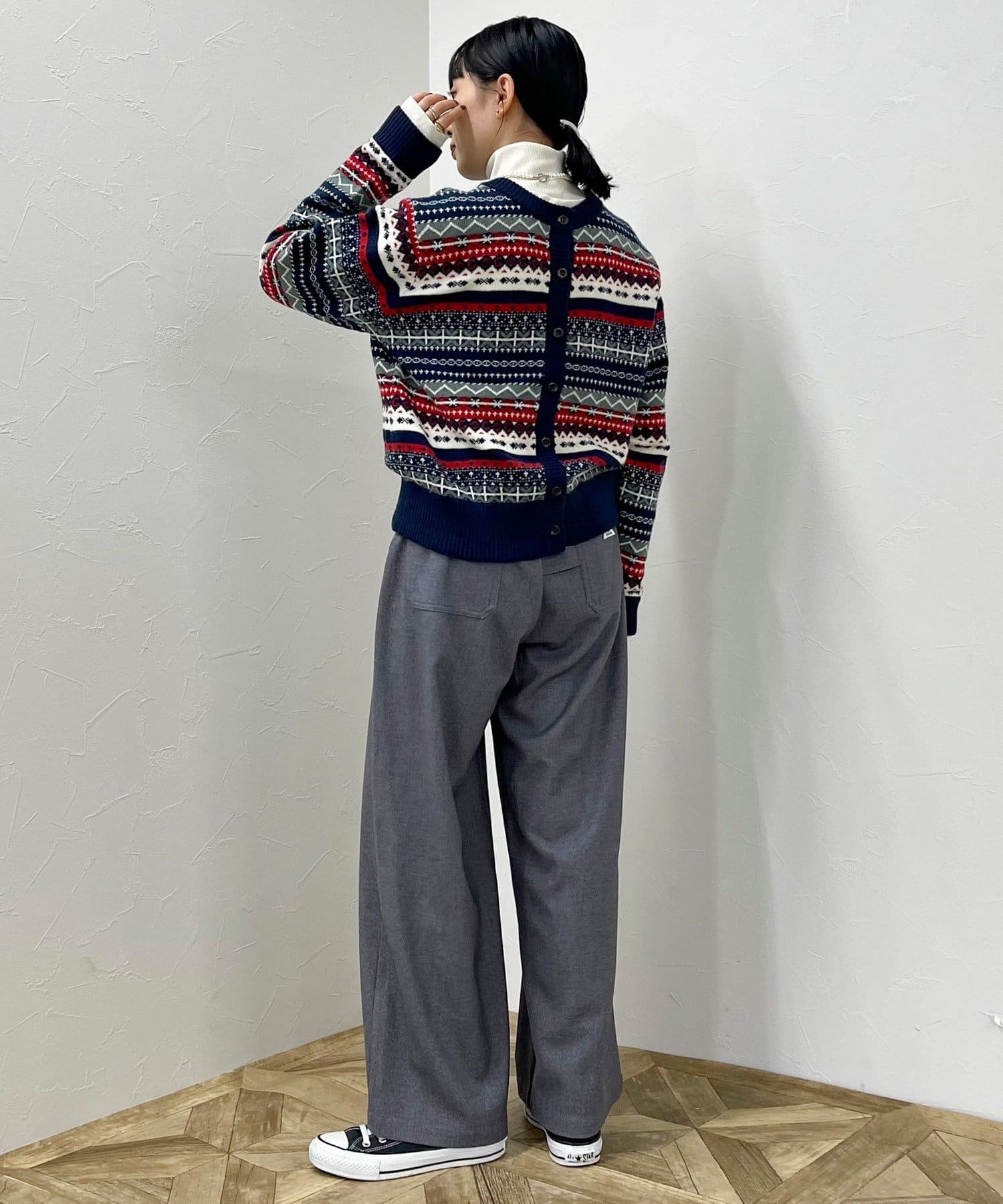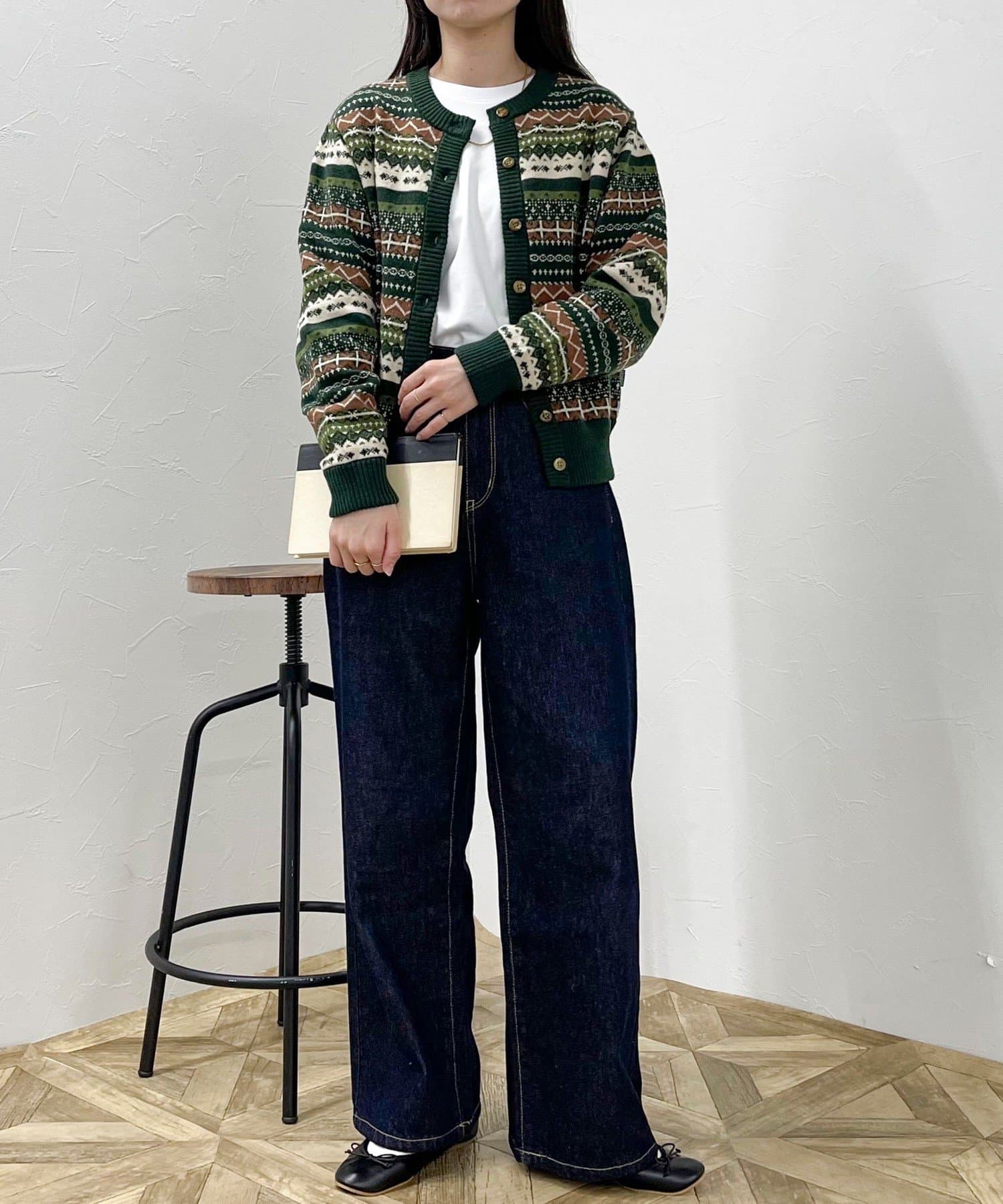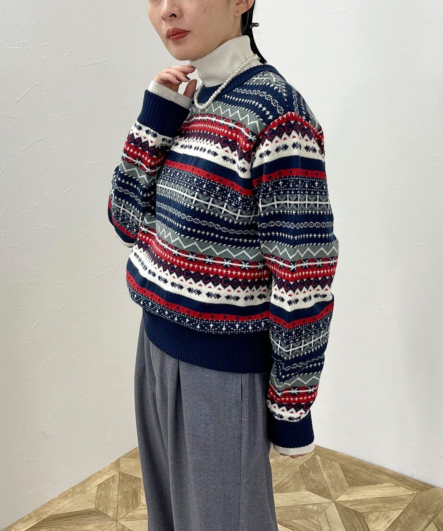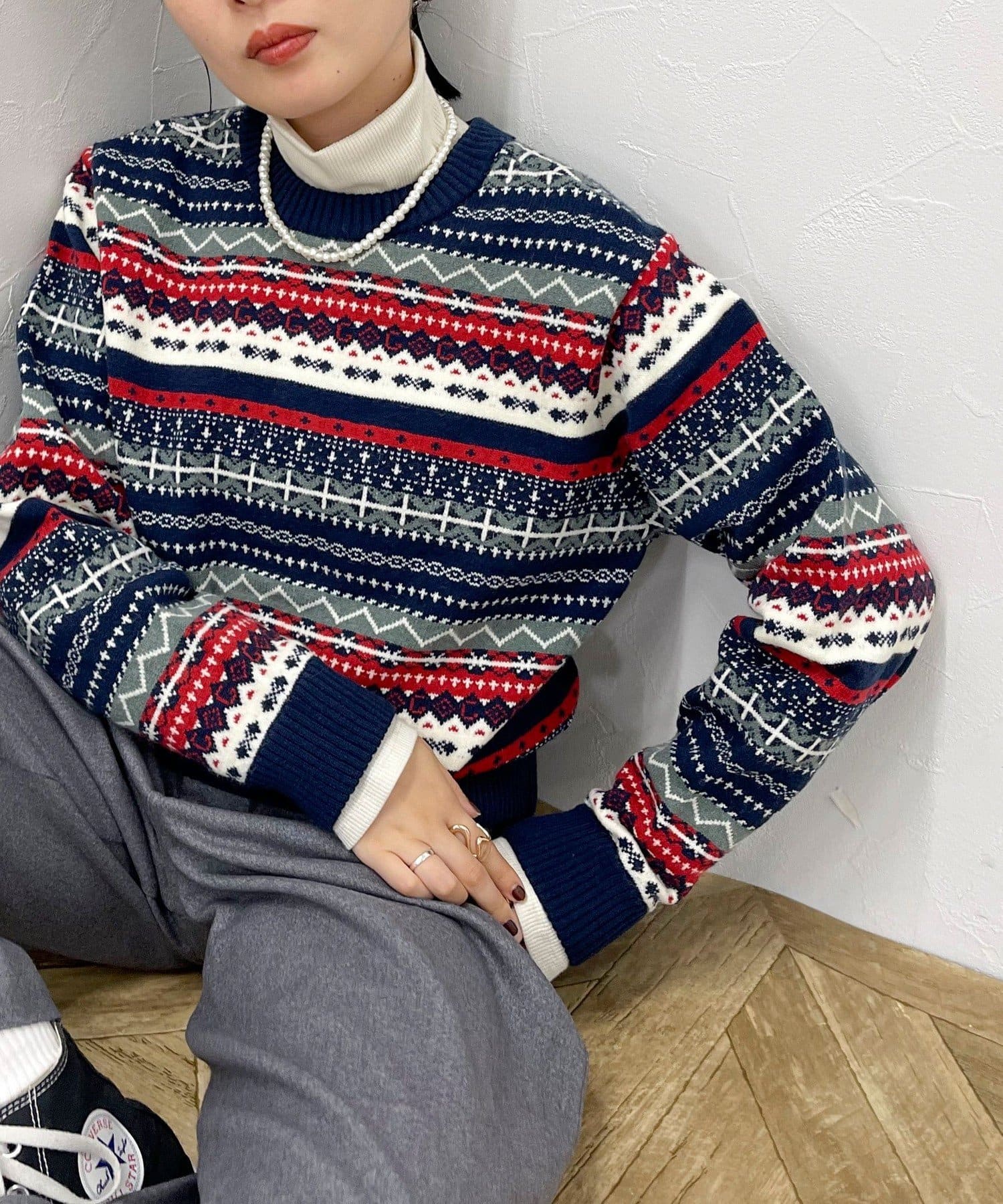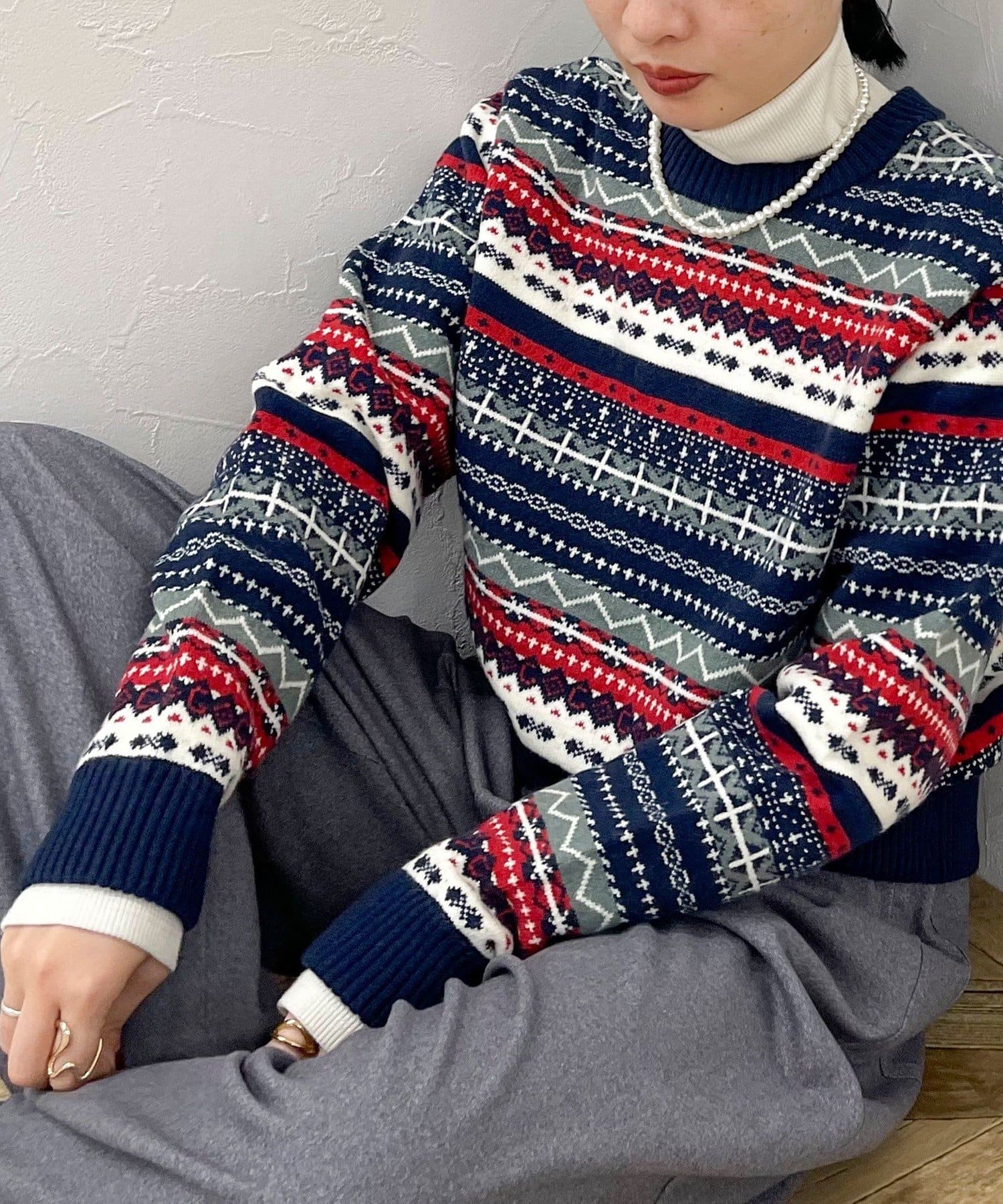 ・シーズンムード高まるフェアアイル柄がコーデの主役になるカーディガンです
