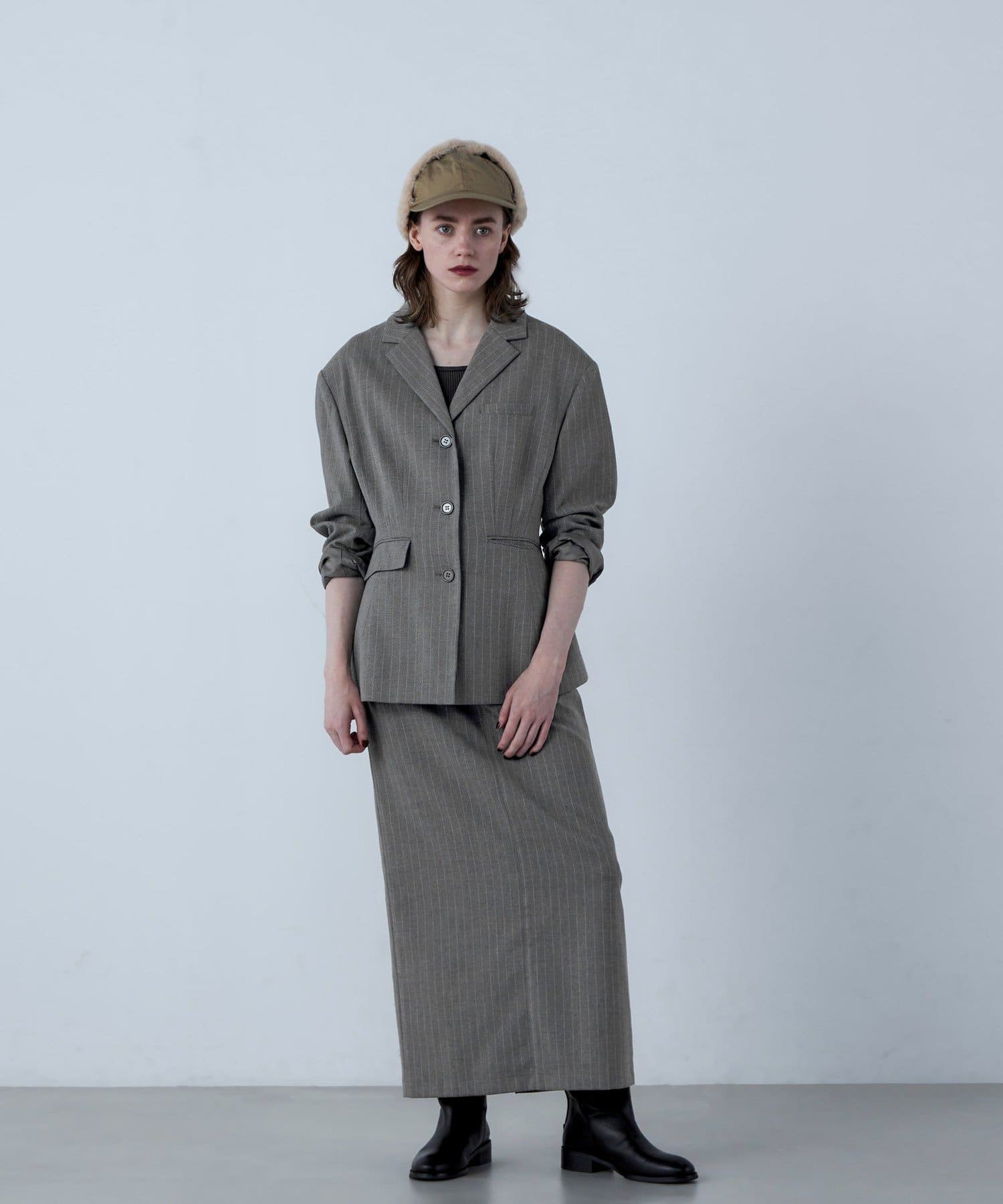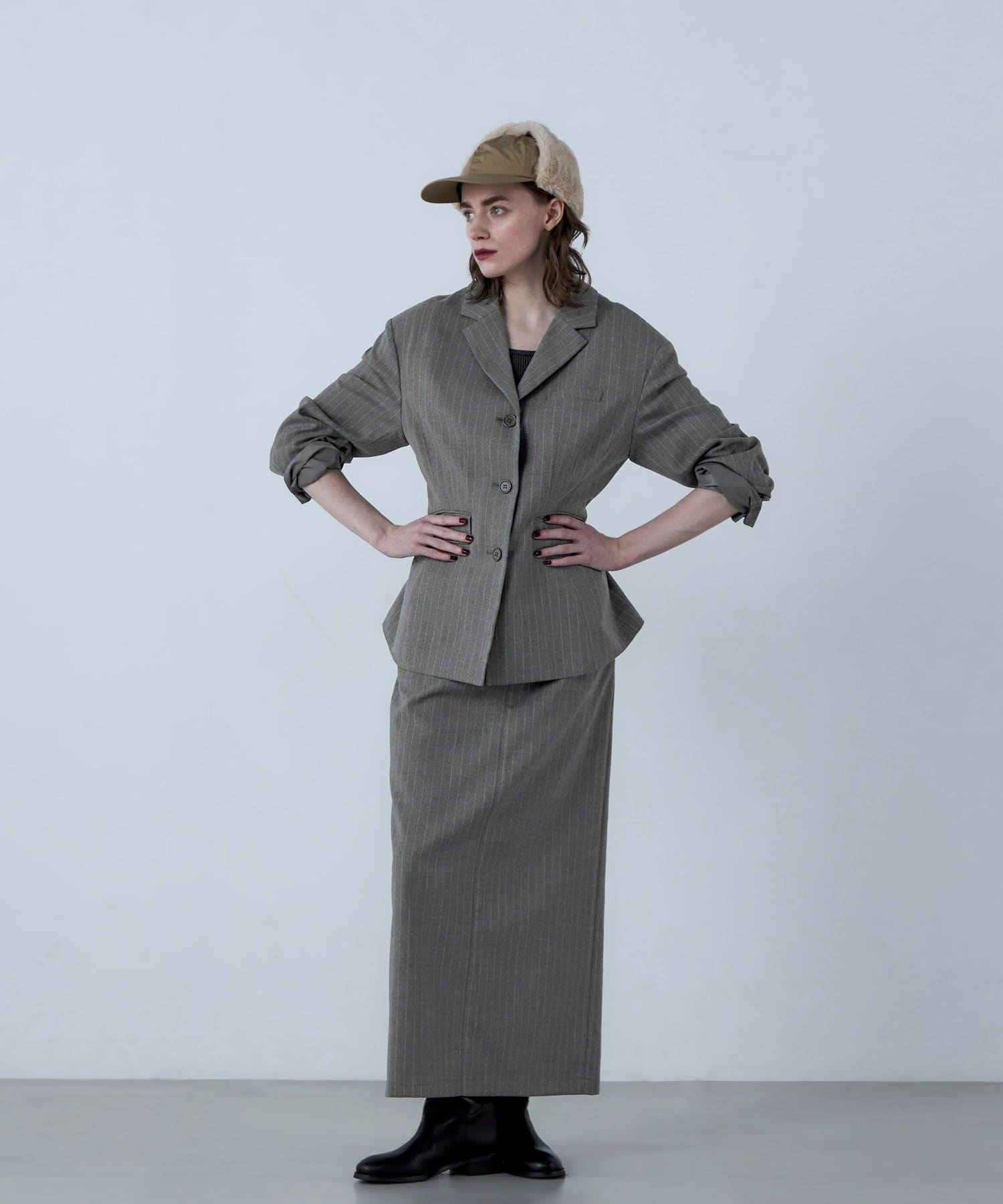 同じ生地を使用したストライプタイトロングスカートとセットアップで