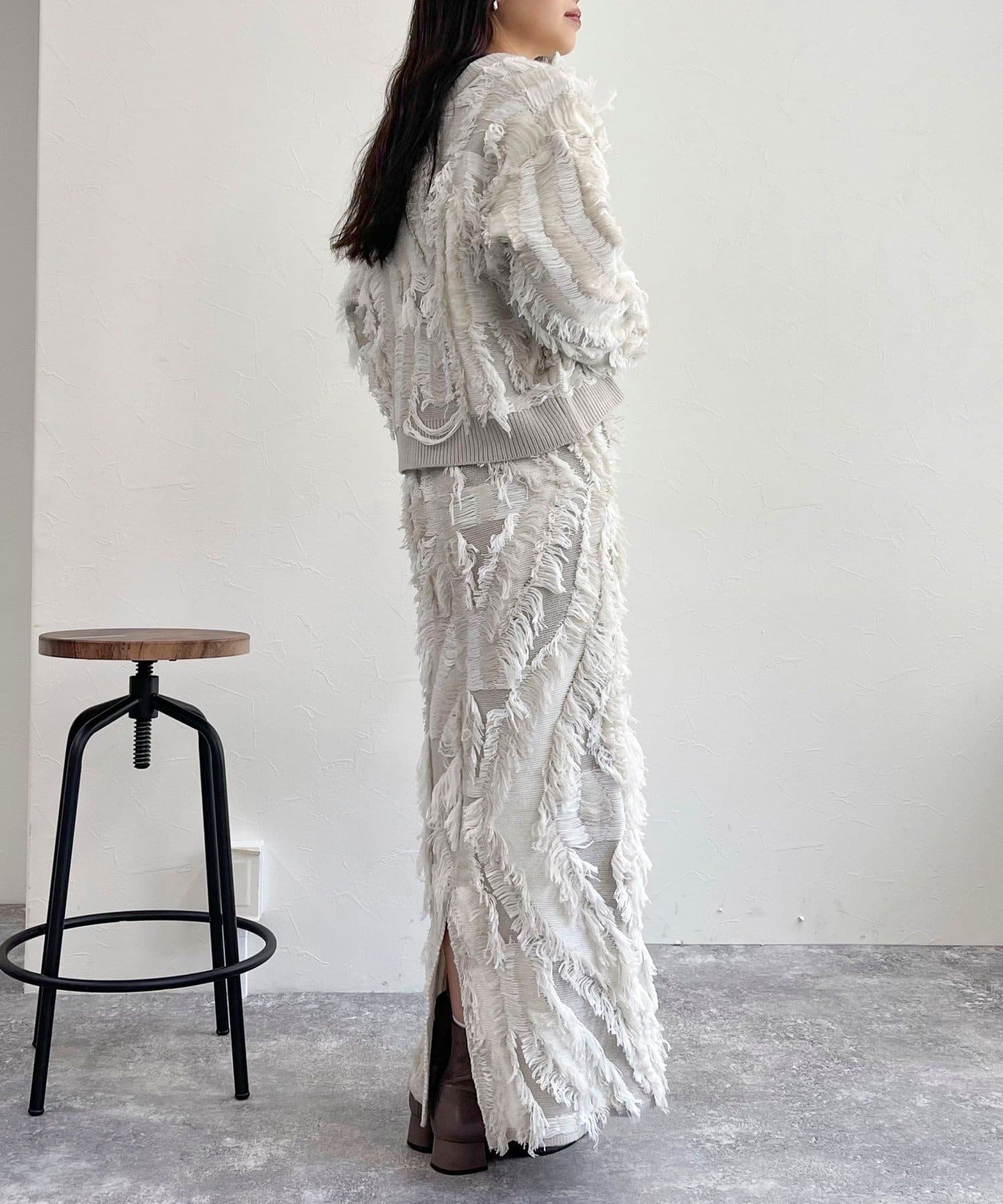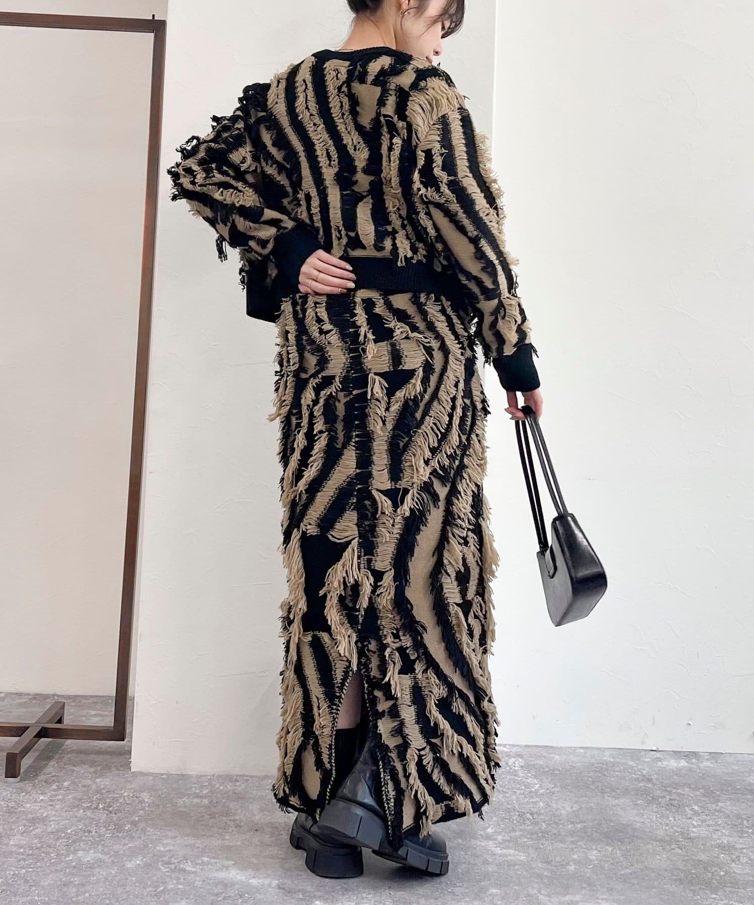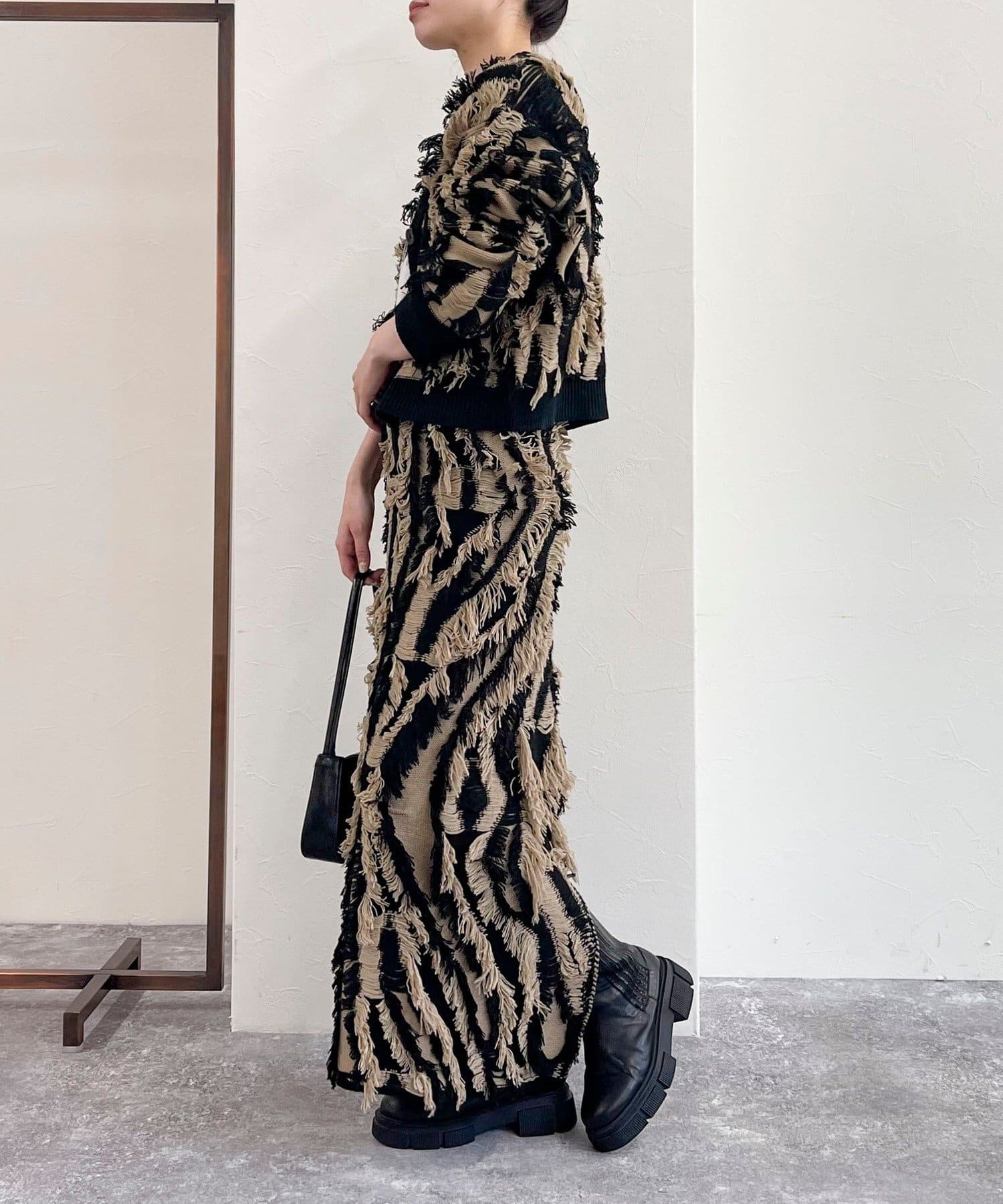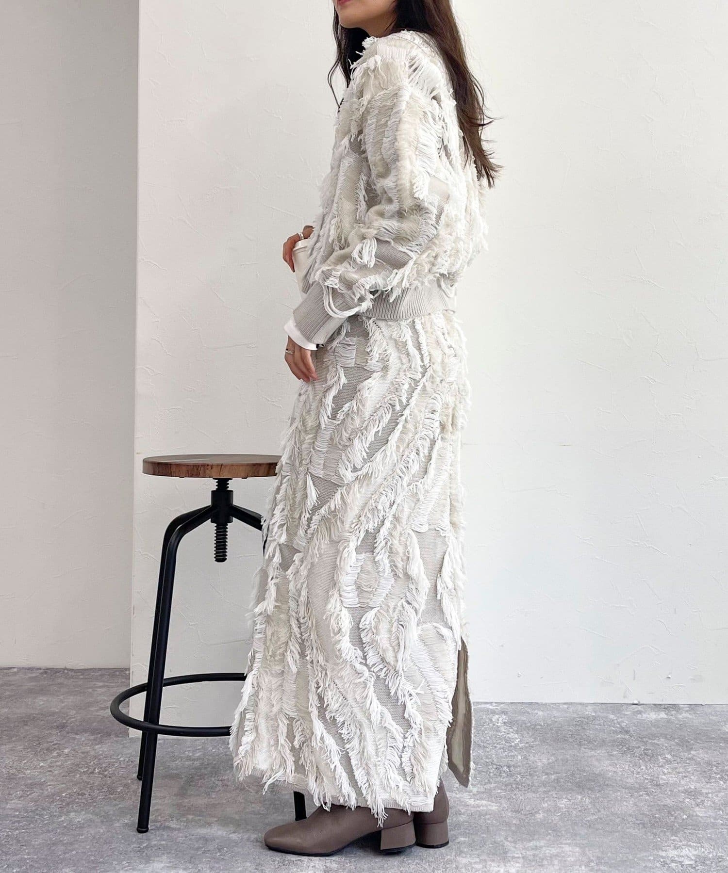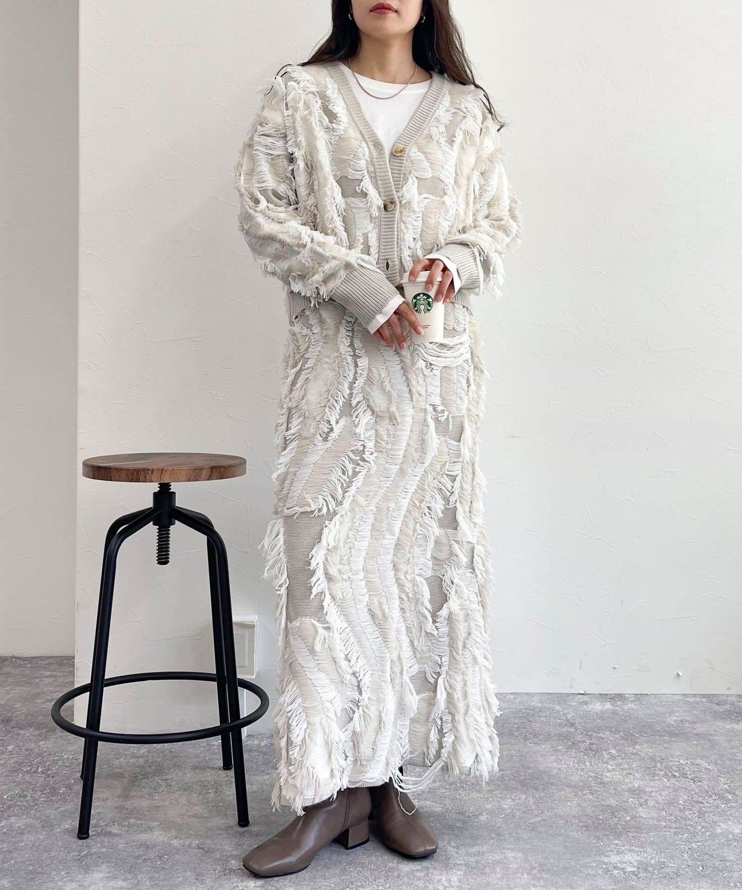 ・動きのあるジャガード地とフリンジが目を惹く華やかな1着!