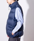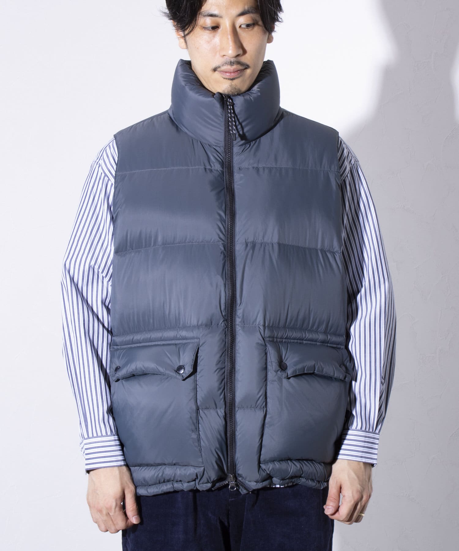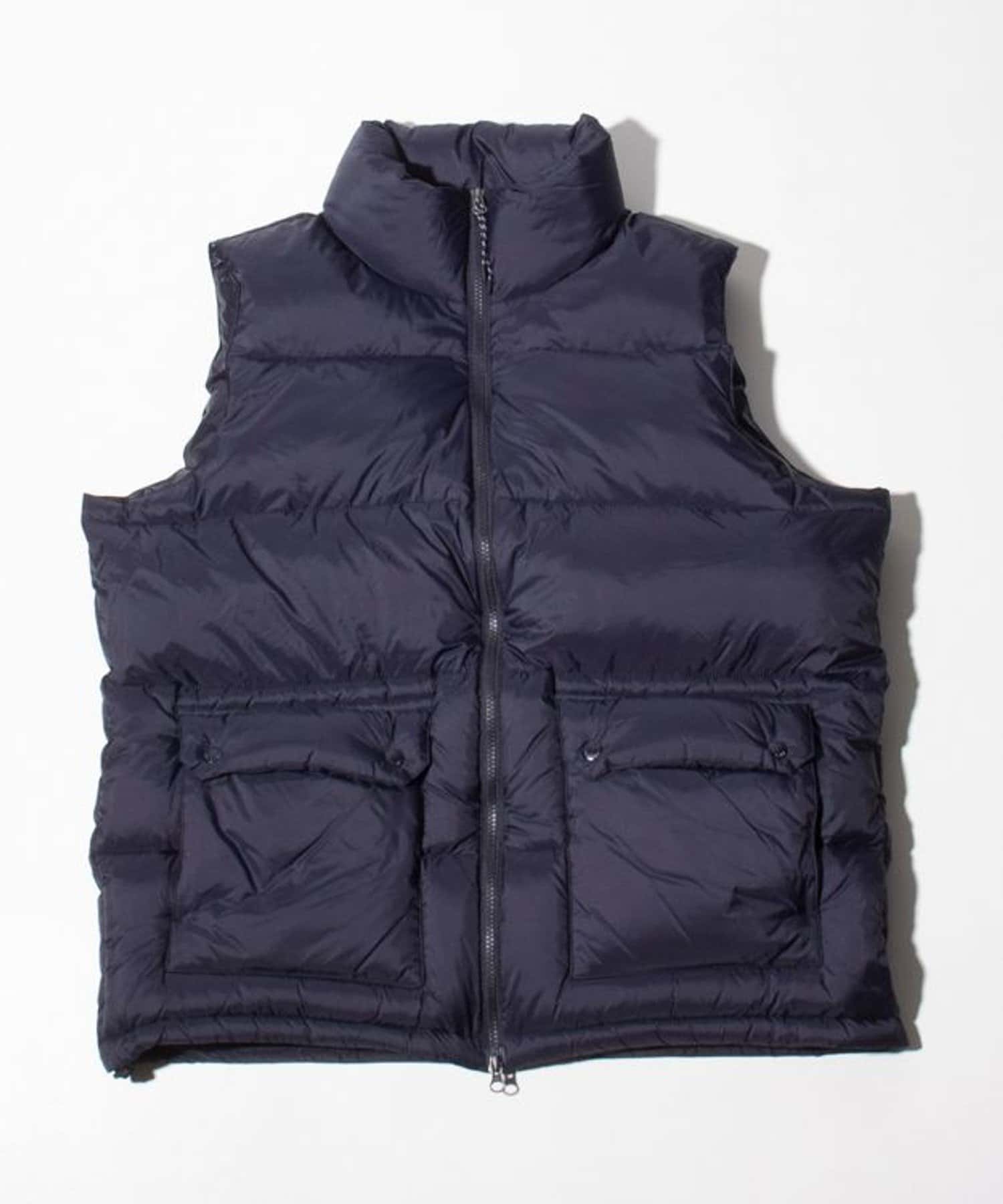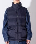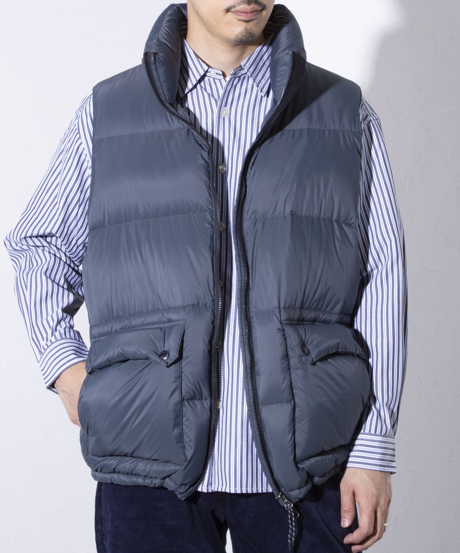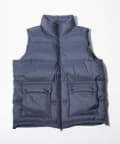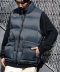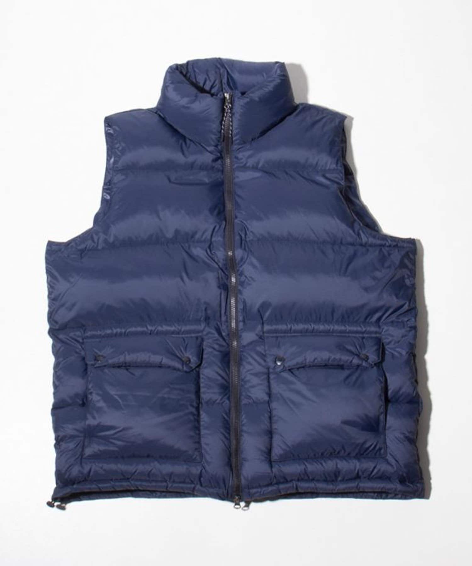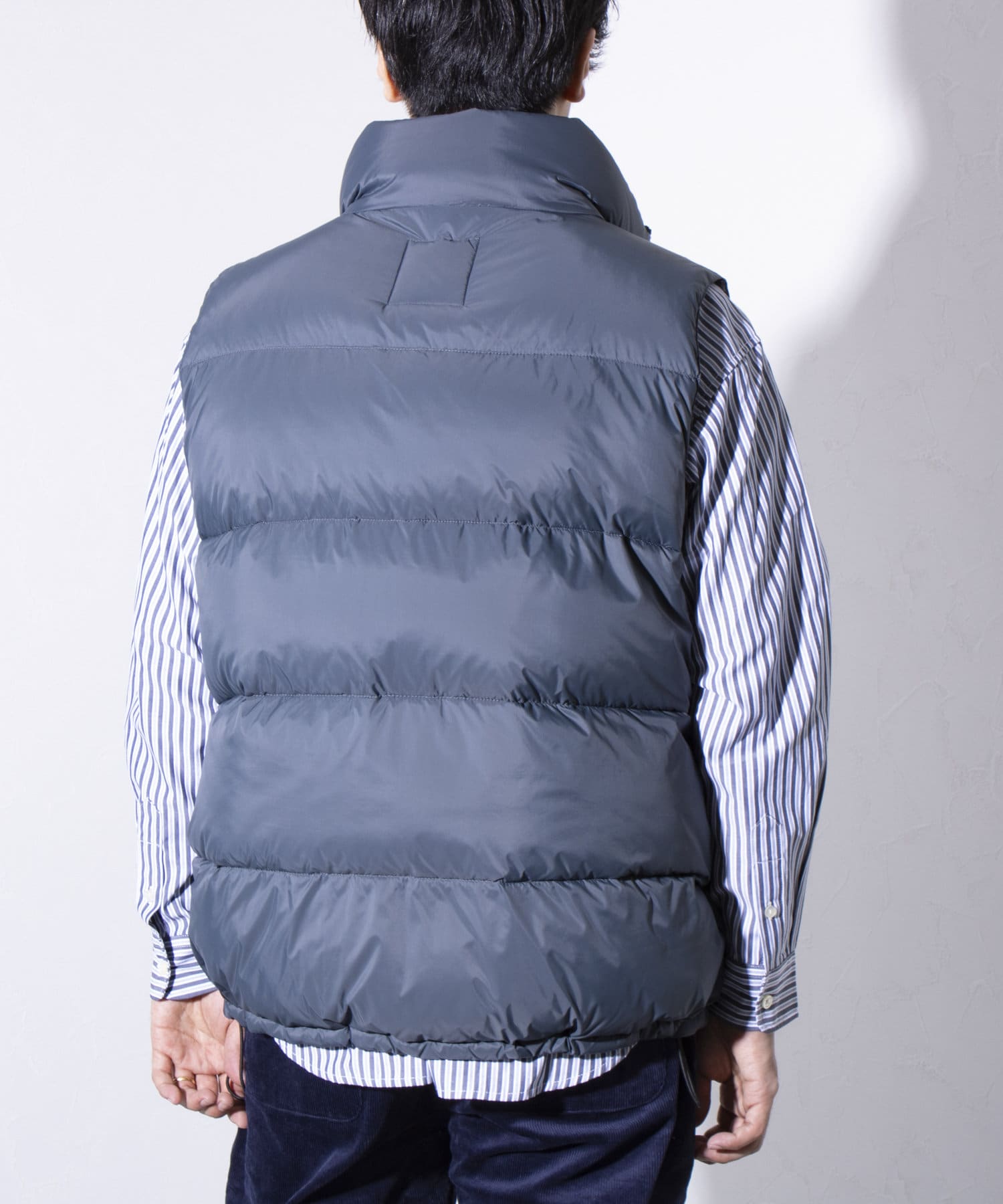 ダウンたっぷりで、ふんわり柔らかな質感と軽量さで楽な着心地の別注ダウンベスト。