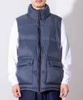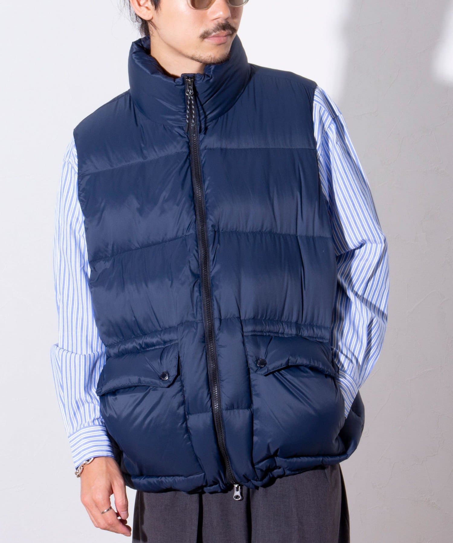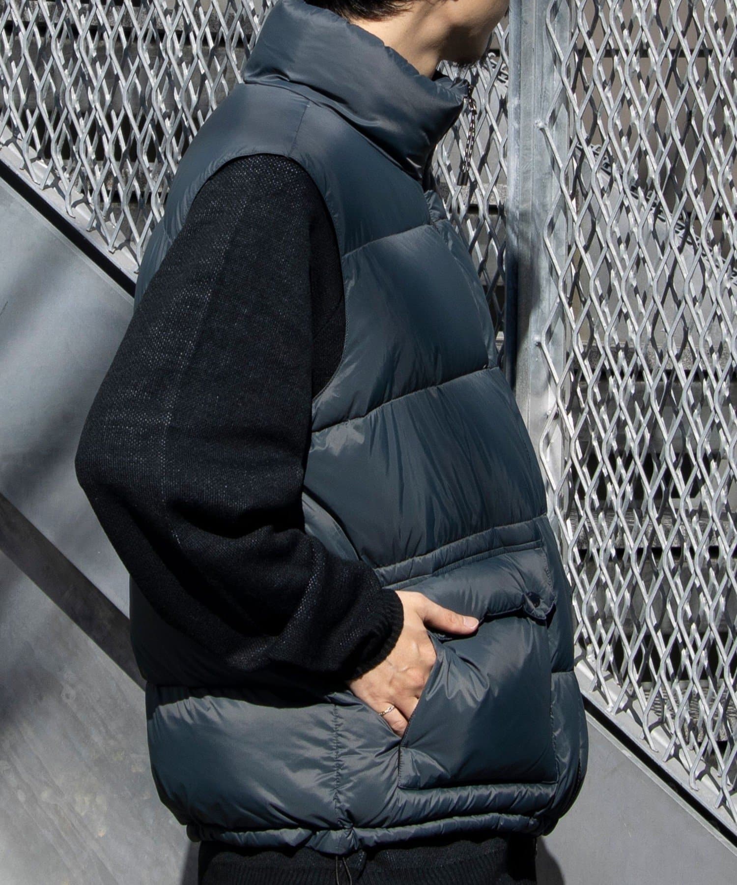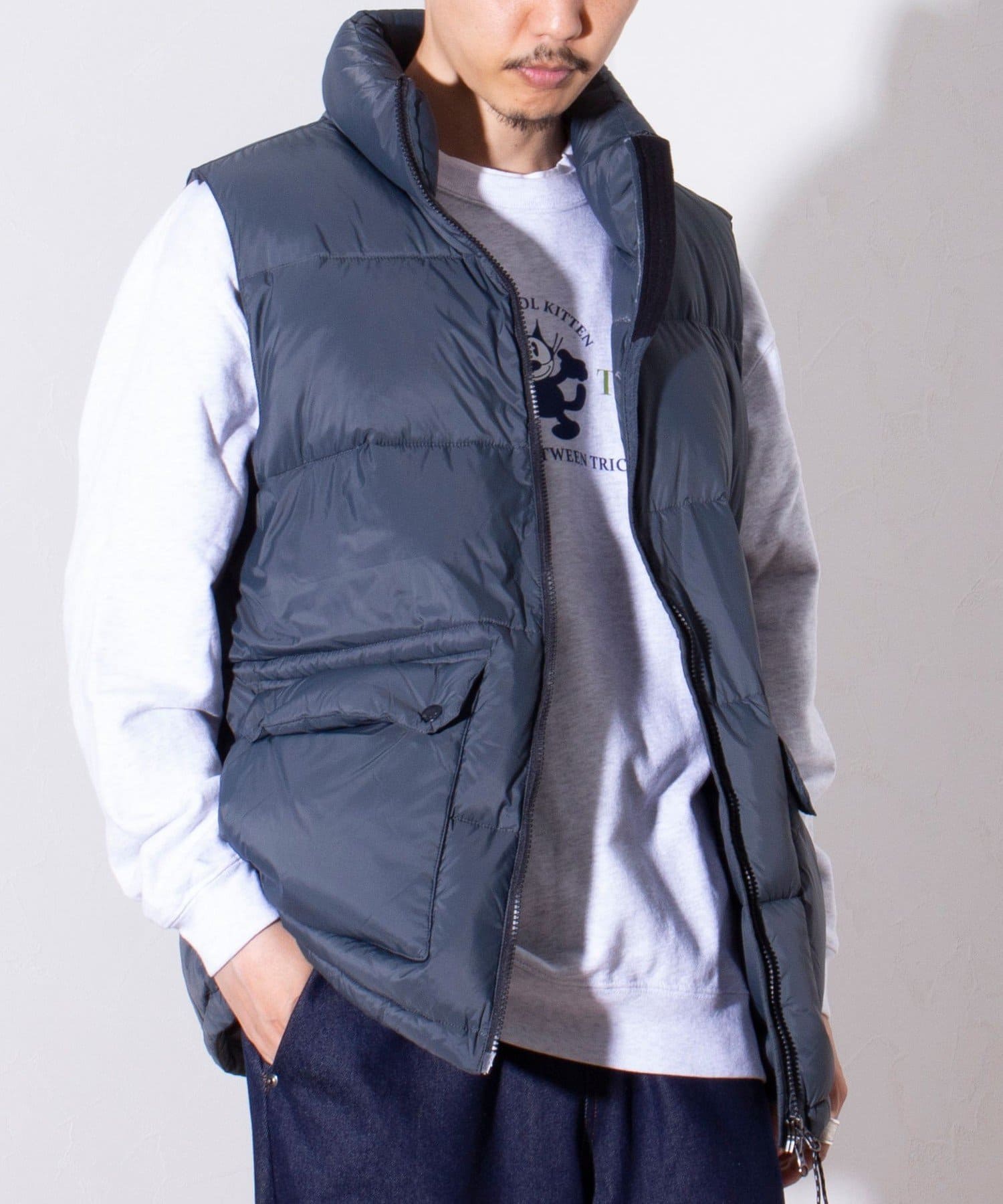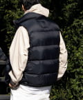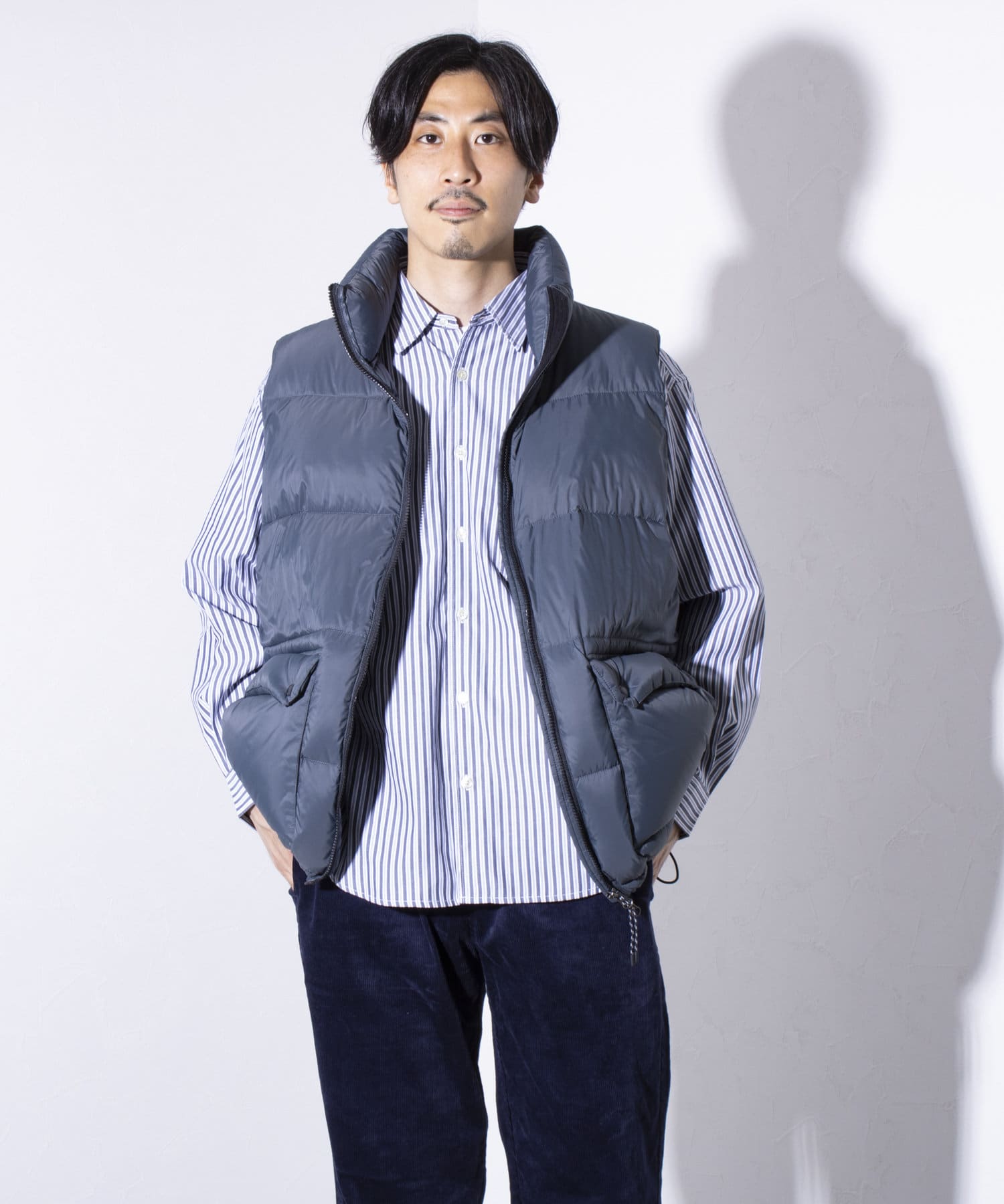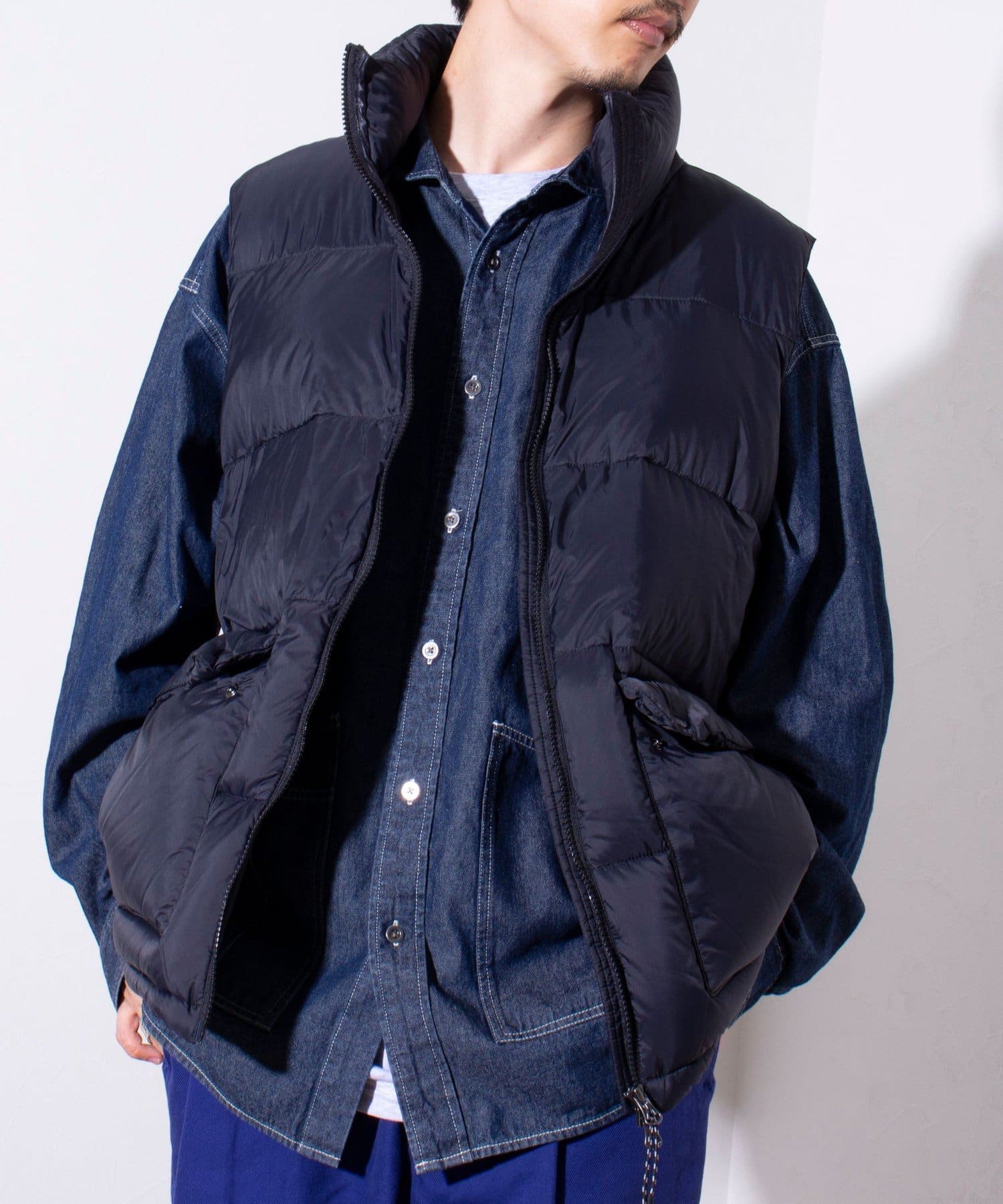 ダウンたっぷりで、ふんわり柔らかな質感と軽量さで楽な着心地の別注ダウンベスト。