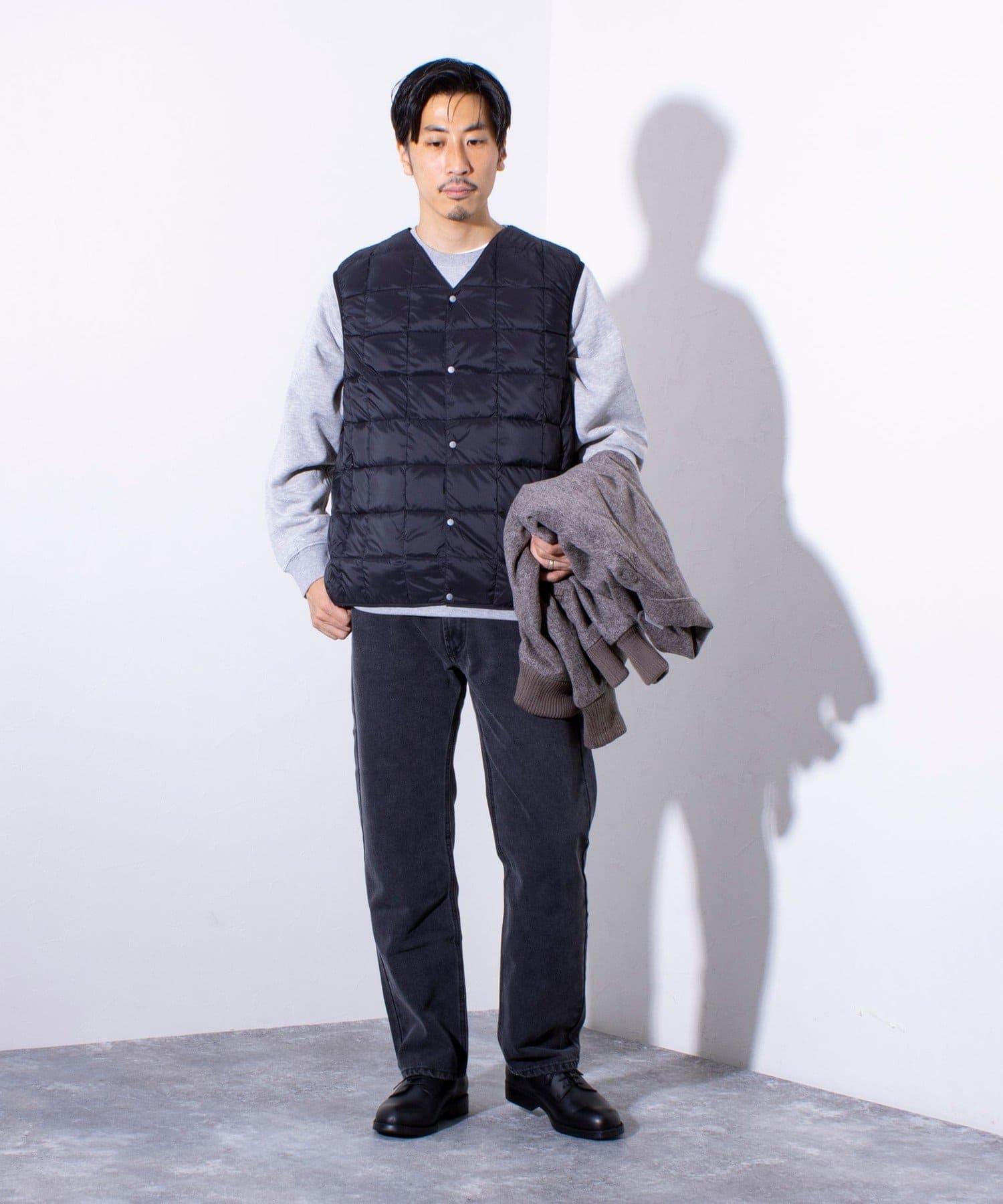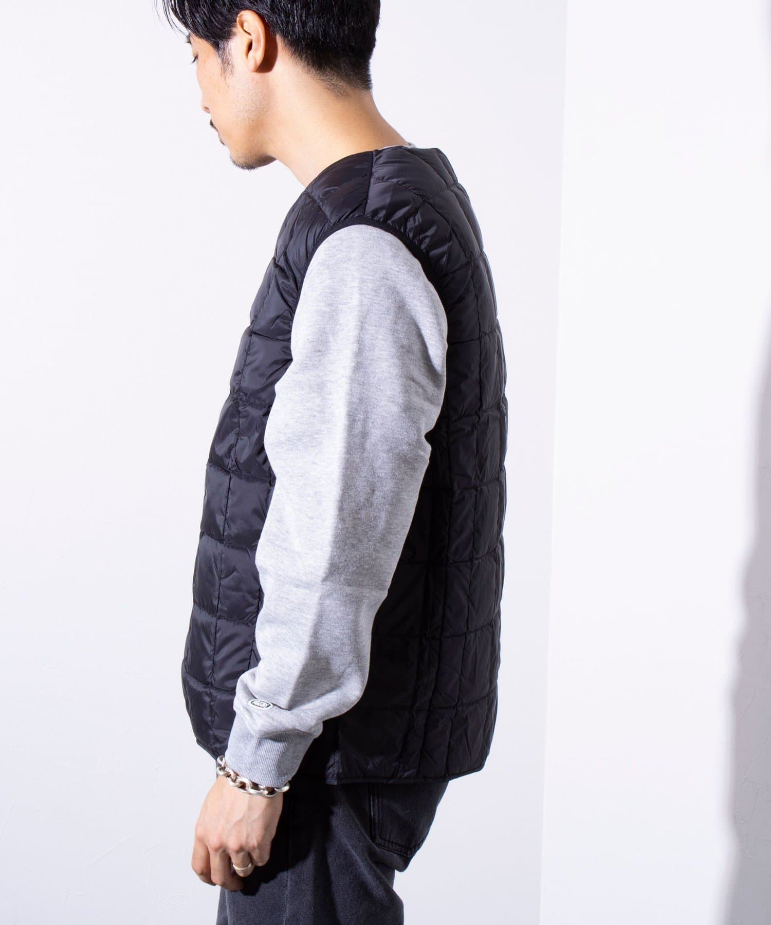 TAIONの定番、ベーシックインナーダウンは、ジャケットやコートの下に着るのはもちろん、Tシャツ・シャツ・パーカーなどの上にも気軽に羽織れる、軽くて暖かく着回しやすいシンプルなデザインが特徴です。