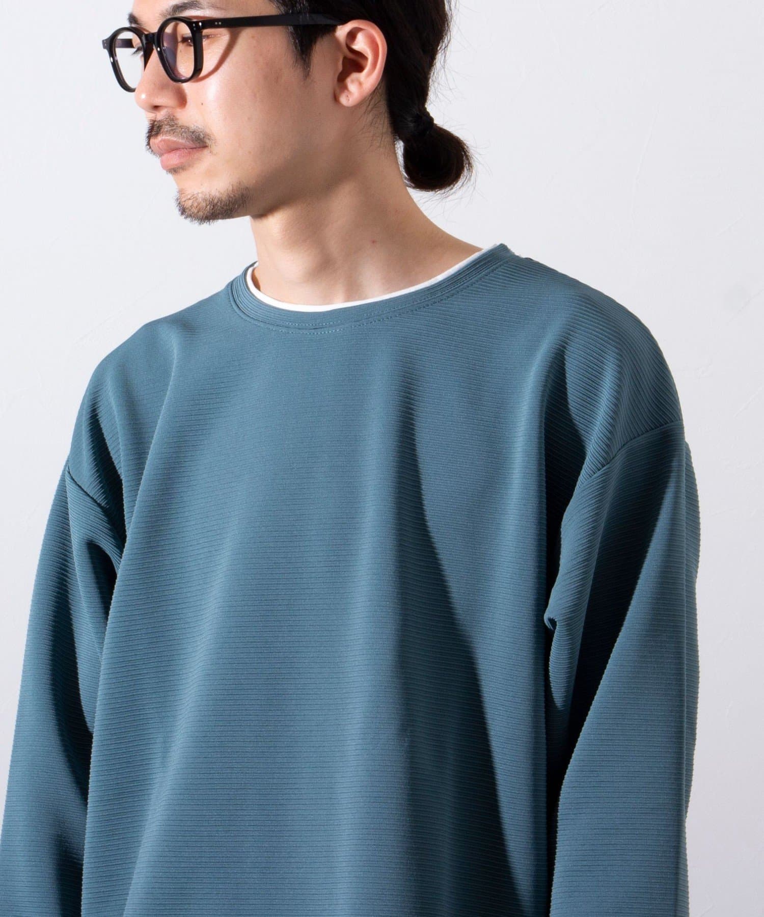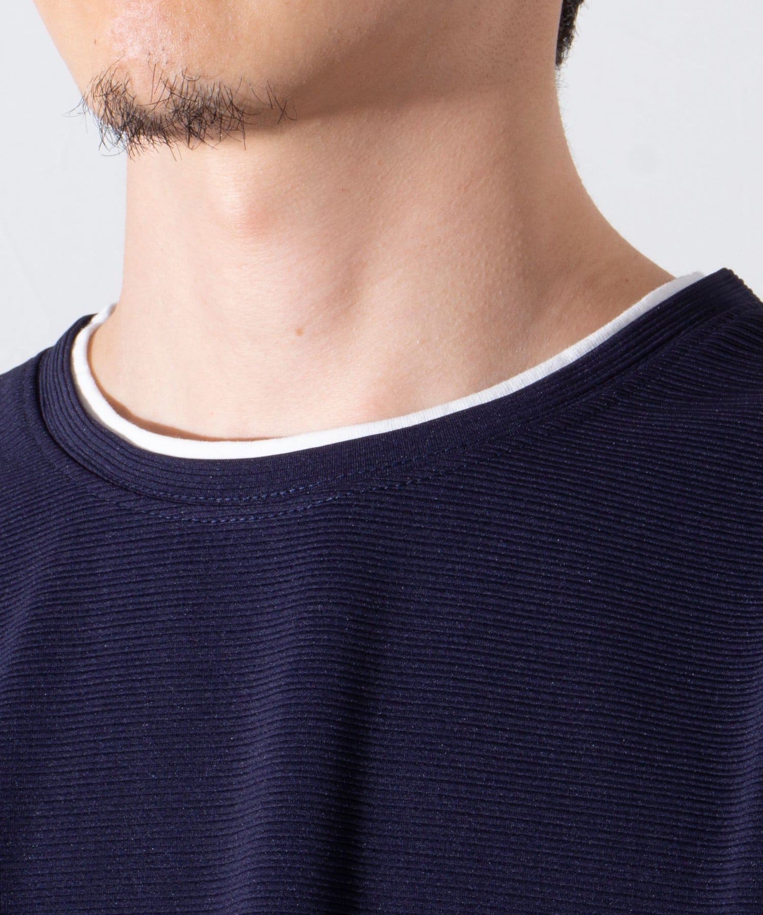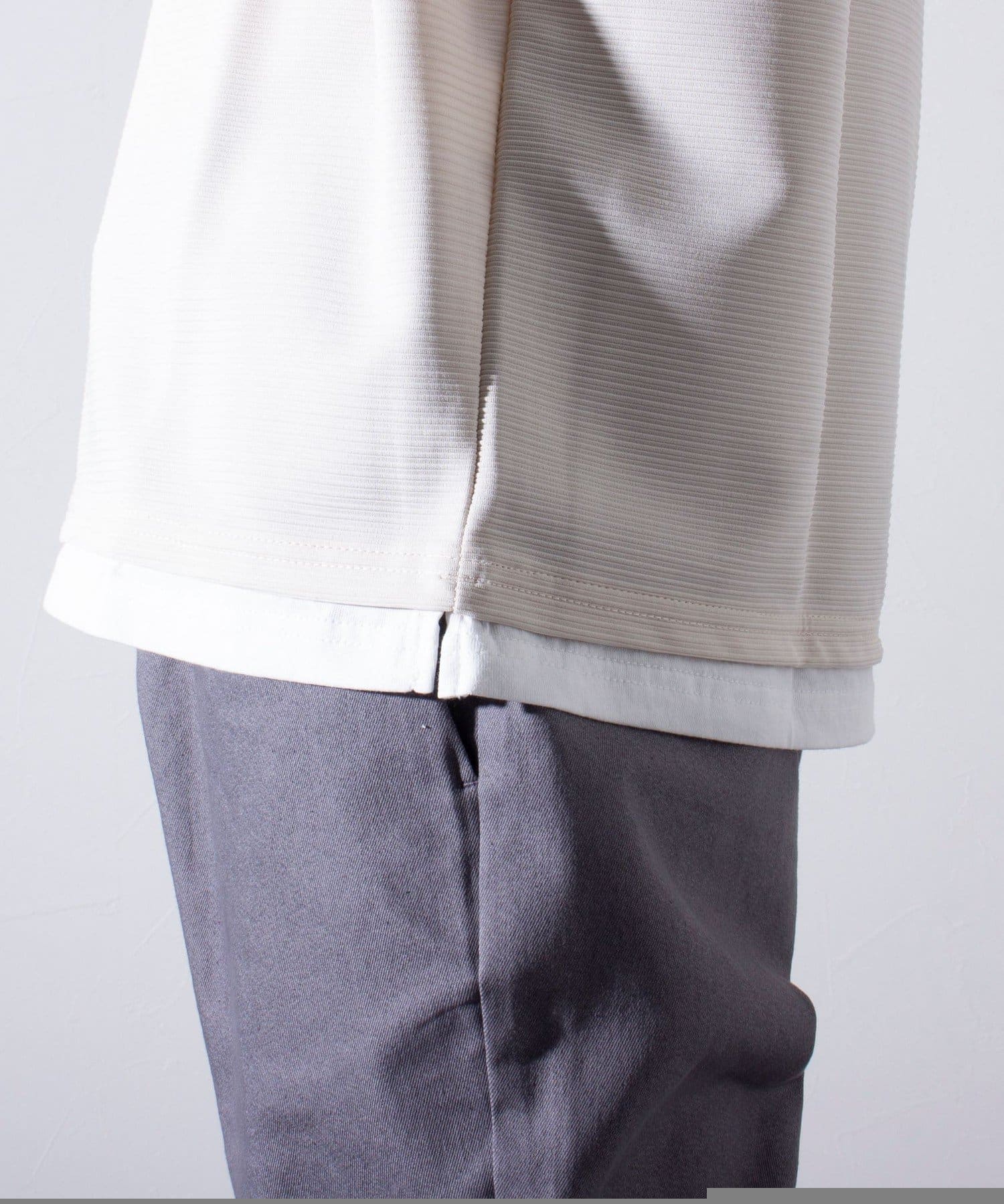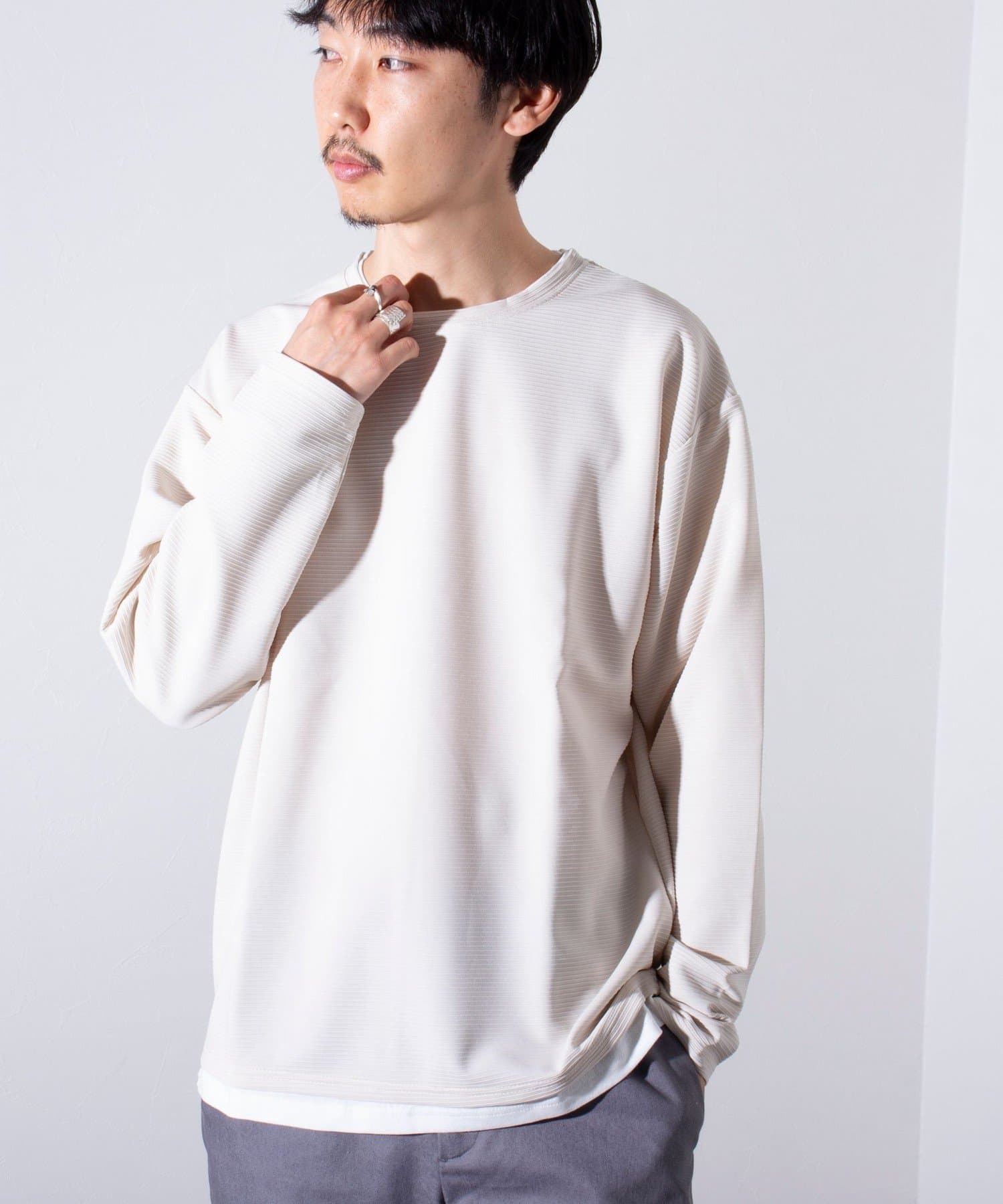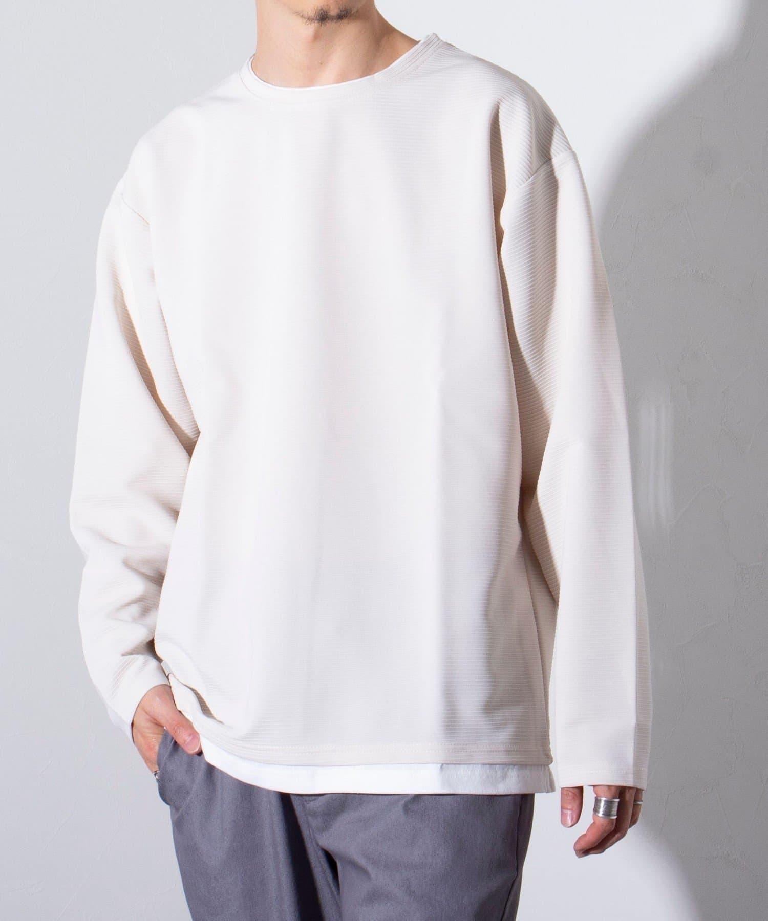 はじめからレイヤードのデザインが完成されているフェイクレイヤードのトップスなので、アウターやジャケットをプラスしたときのシルエットの崩れや着心地の悪さもすっかり解消されます。