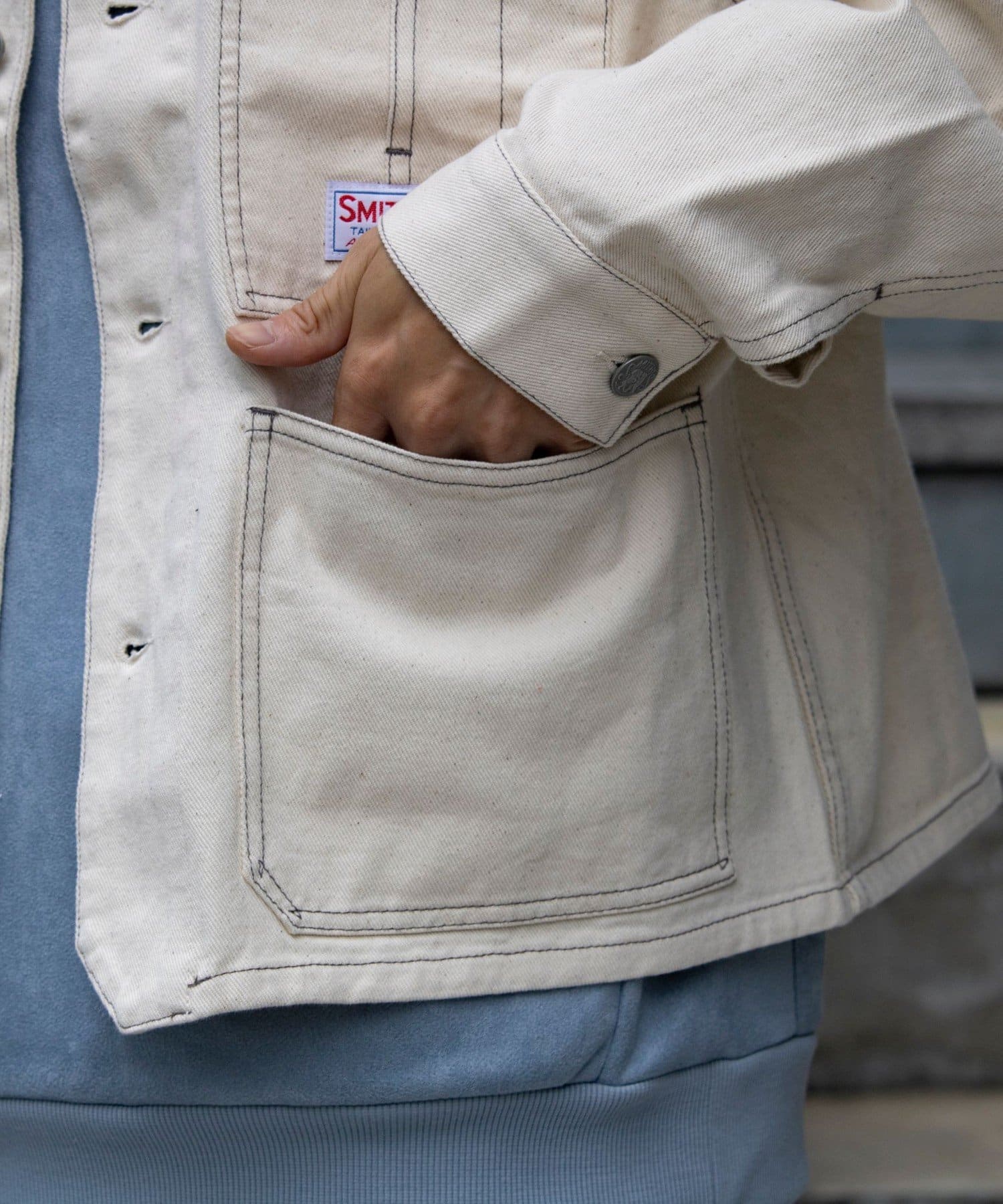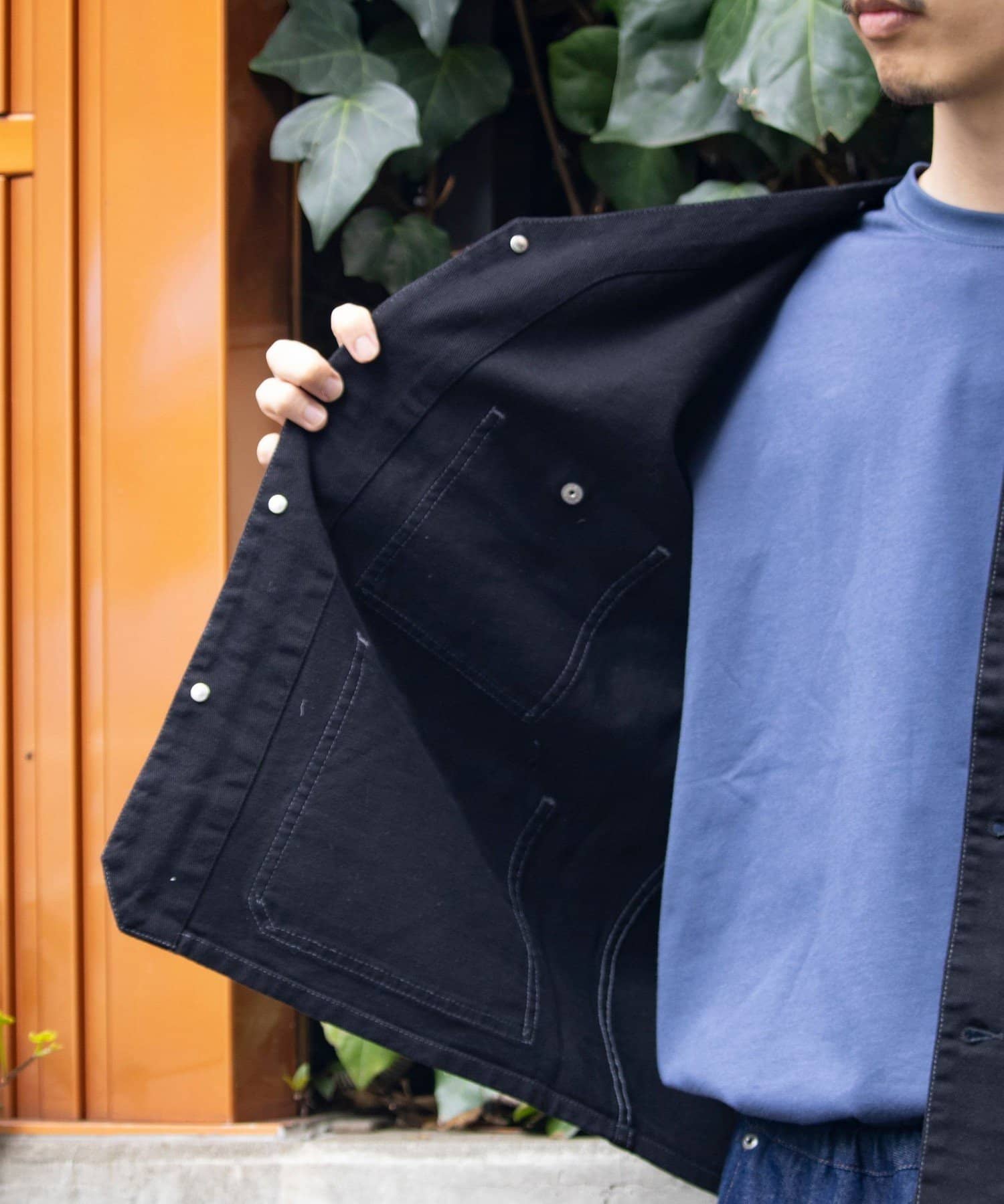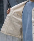 エンジニア・ジャケットは元より屋内で働くエンジニアの為に生まれた作業着で座りながらも作業しやすいように着丈が短く襟がないものが主流です。