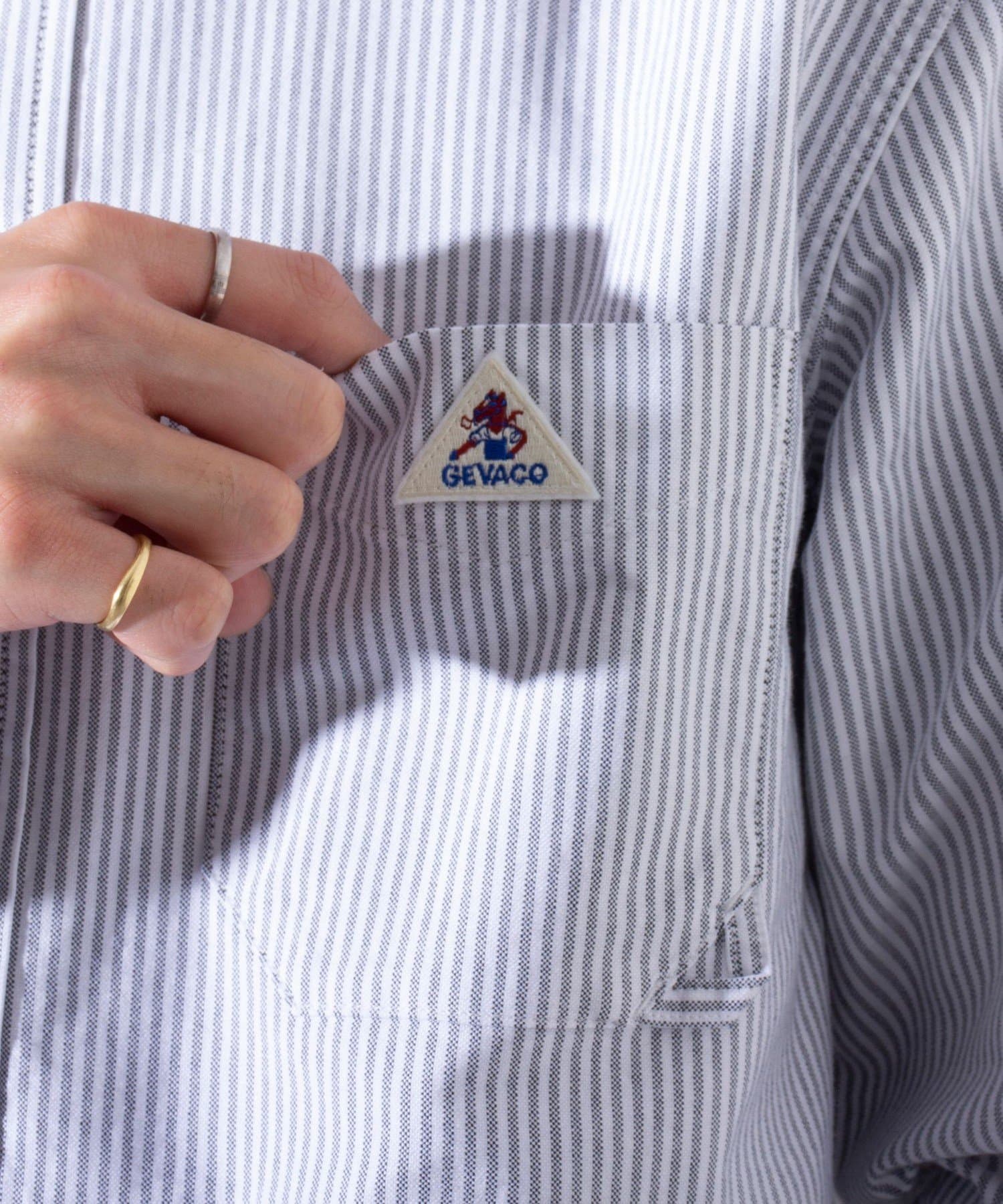 胸ポケットはハンバーループをイメージしたGEVACOオリジナルのディティールを付け、アイコンの三角ワッペンを付けた仕上がり。