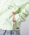 肥大胸に3連ループを付けて、フレンチワークらしい角落としの胸ポケットにアイコンの三角ワッペンを付けたデザイン。